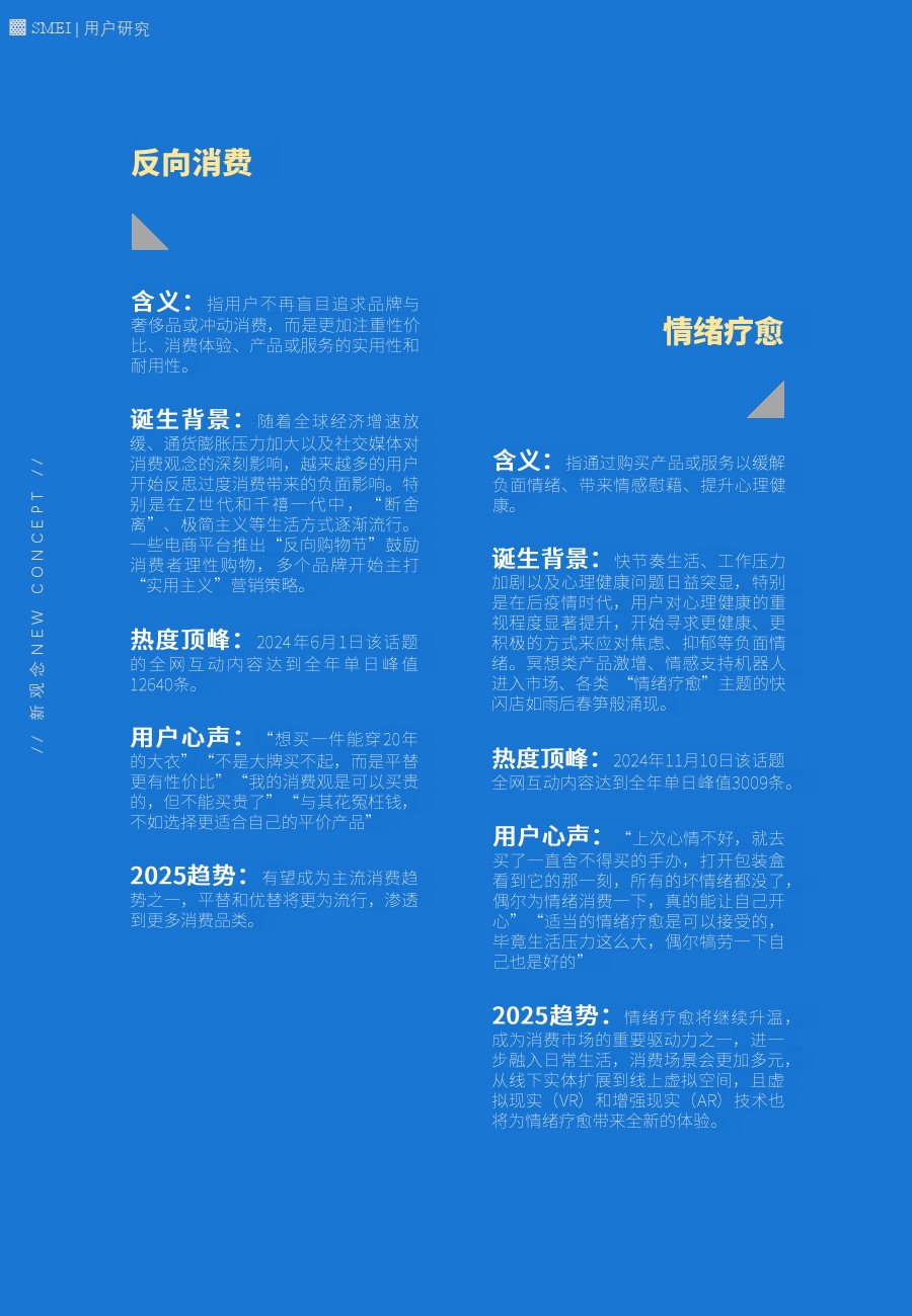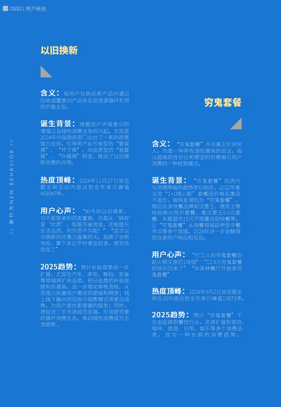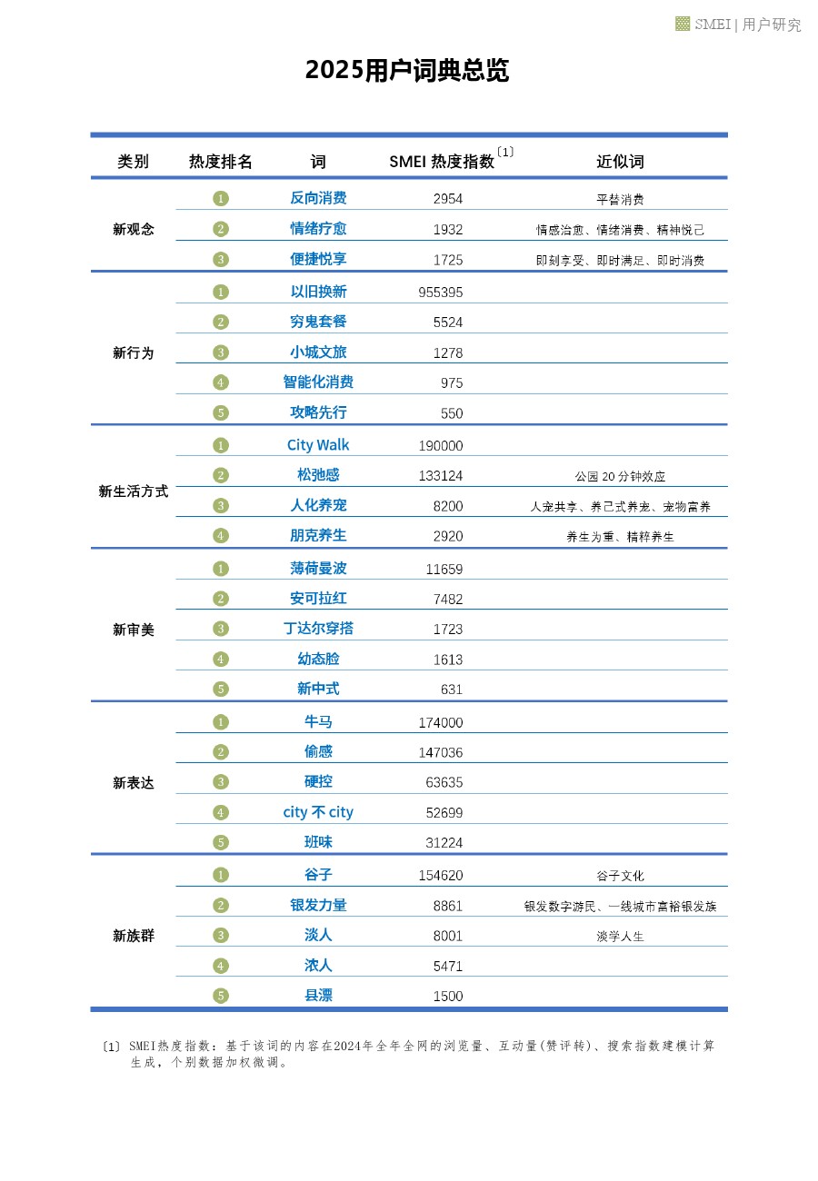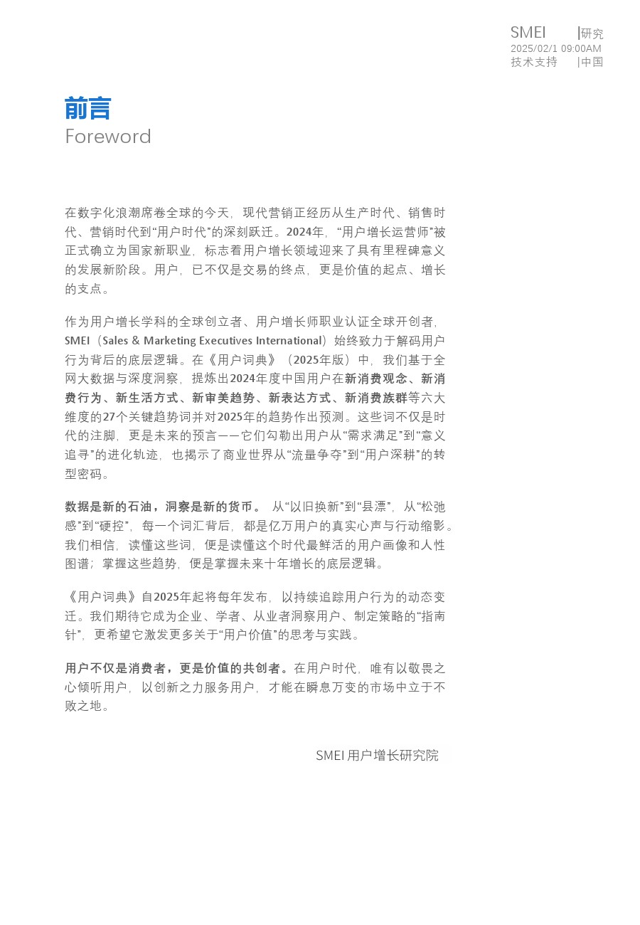 在數(shù)字化浪潮席卷全球的今天,現(xiàn)代營(yíng)銷正經(jīng)歷從生產(chǎn)時(shí)代、銷售時(shí)代、營(yíng)銷時(shí)代到“用戶時(shí)代”的深刻躍遷。 2024年,“用戶增長(zhǎng)運(yùn)營(yíng)師”被正式確立為國(guó)家新職業(yè),標(biāo)志著用戶增長(zhǎng)領(lǐng)域迎來(lái)了具有里程碑意義的發(fā)展新階段。 用戶,已不僅是交易的終點(diǎn),更是價(jià)值的起點(diǎn)、增長(zhǎng)的支點(diǎn)。 作為用戶增長(zhǎng)學(xué)科的全球創(chuàng)立者、用戶增長(zhǎng)師職業(yè)認(rèn)證全球開(kāi)創(chuàng)者,SMEI(Sales & Marketing Executives International)始終致力于解碼用戶行為背后的底層邏輯。 在《用戶詞典》(2025年版)中,我們基于全網(wǎng)大數(shù)據(jù)與深度洞察,提煉出2024年度中國(guó)用戶在新消費(fèi)觀念、新消費(fèi)行為、新生活方式、新審美趨勢(shì)、新表達(dá)方式、新消費(fèi)族群等六大維度的27個(gè)關(guān)鍵趨勢(shì)詞并對(duì)2025年的趨勢(shì)作出預(yù)測(cè)。 這些詞不僅是時(shí)代的注腳,更是未來(lái)的預(yù)言——它們勾勒出用戶從“需求滿足”到“意義追尋”的進(jìn)化軌跡,也揭示了商業(yè)世界從“流量爭(zhēng)奪”到“用戶深耕”的轉(zhuǎn)型密碼。 數(shù)據(jù)是新的石油,洞察是新的貨幣。 從“以舊換新”到“縣漂”,從“松弛感”到“硬控”,每一個(gè)詞匯背后,都是億萬(wàn)用戶的真實(shí)心聲與行動(dòng)縮影。 我們相信,讀懂這些詞,便是讀懂這個(gè)時(shí)代最鮮活的用戶畫(huà)像和人性圖譜;掌握這些趨勢(shì),便是掌握未來(lái)十年增長(zhǎng)的底層邏輯。 |