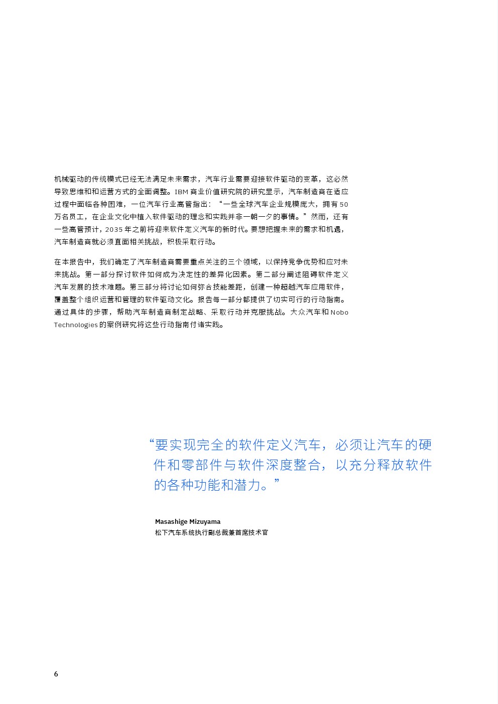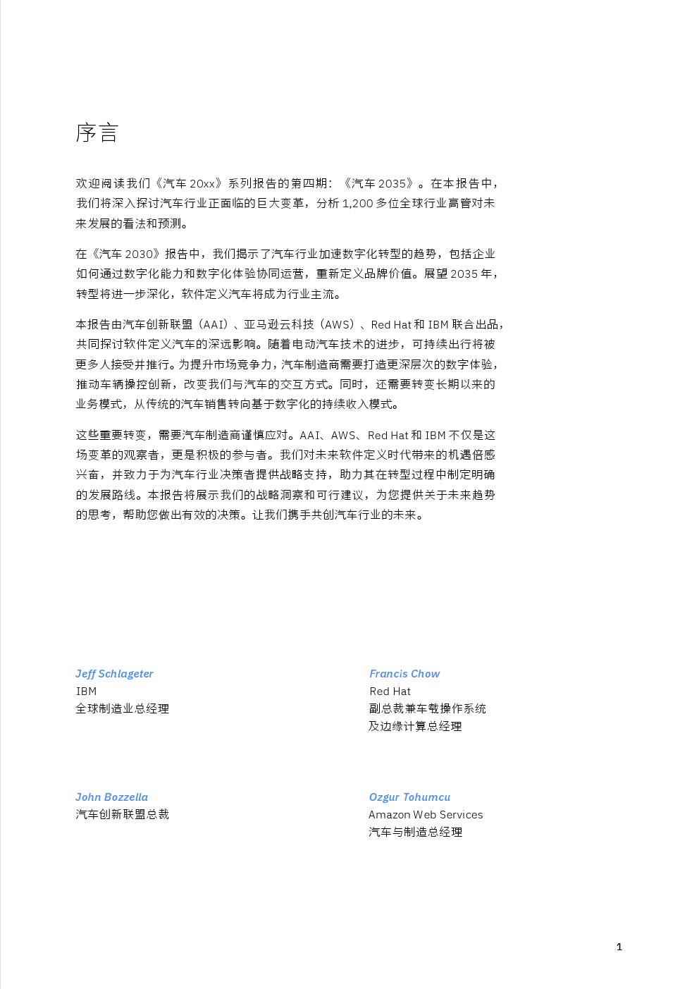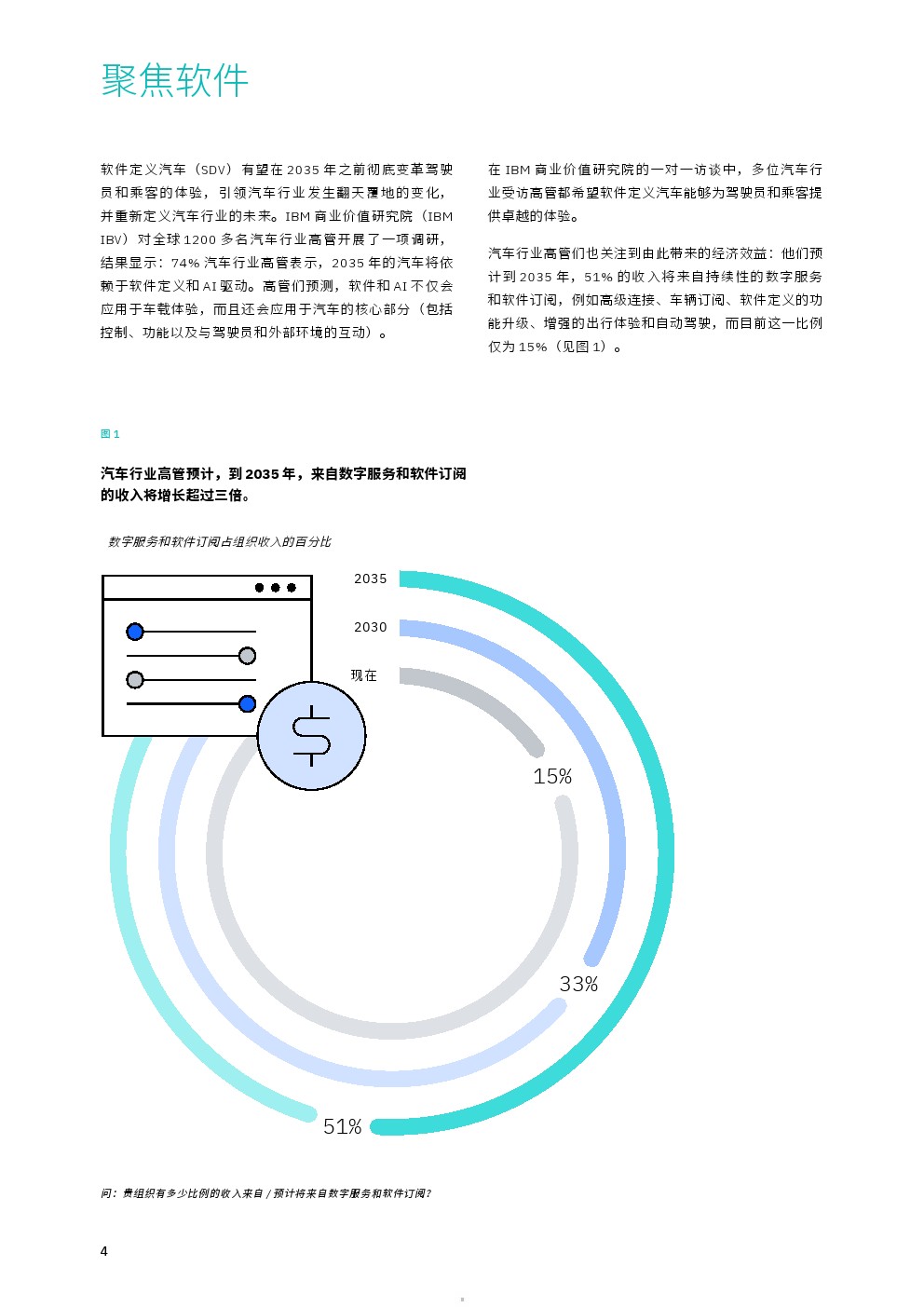 軟件定義汽車(SDV)有望在 2035 年之前徹底變革駕駛員和乘客的體驗(yàn),引領(lǐng)汽車行業(yè)發(fā)生翻天覆地的變化,并重新定義汽車行業(yè)的未來。 IBM 商業(yè)價(jià)值研究院(IBM IBV)對全球 1200 多名汽車行業(yè)高管開展了一項(xiàng)調(diào)研,結(jié)果顯示:74% 汽車行業(yè)高管表示,2035 年的汽車將依賴于軟件定義和 AI 驅(qū)動(dòng)。 高管們預(yù)測,軟件和 AI 不僅會應(yīng)用于車載體驗(yàn),而且還會應(yīng)用于汽車的核心部分(包括控制、功能以及與駕駛員和外部環(huán)境的互動(dòng)) |