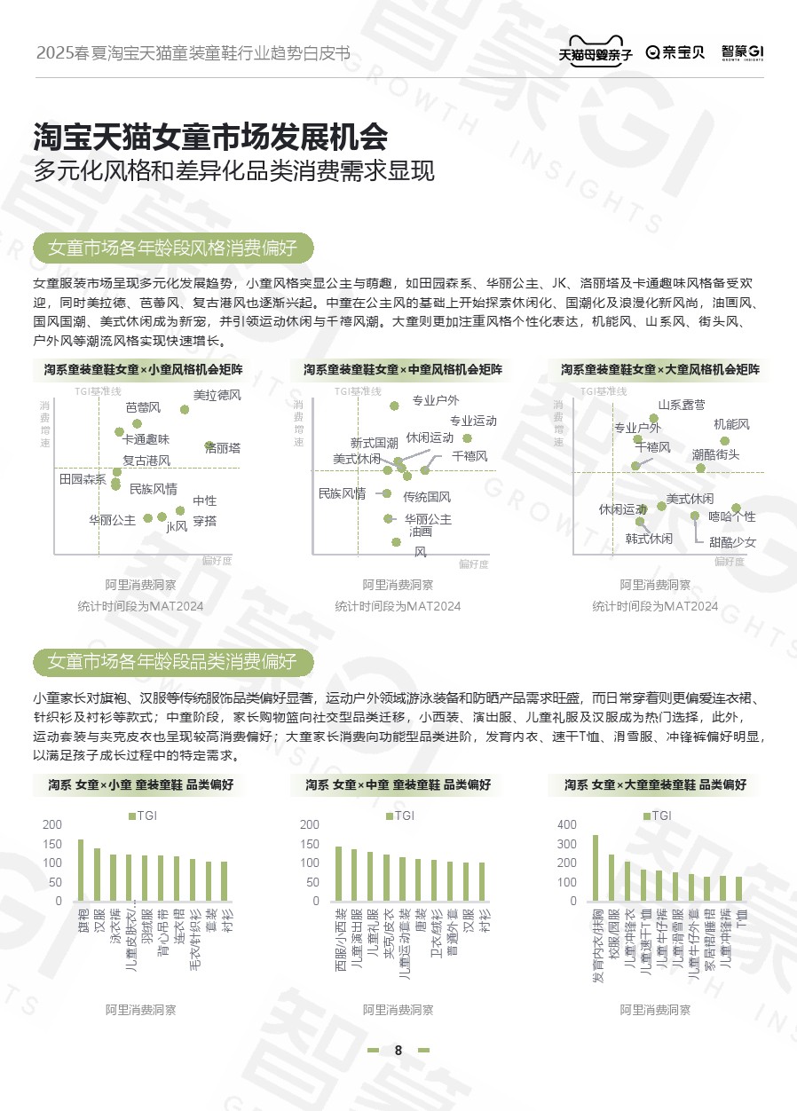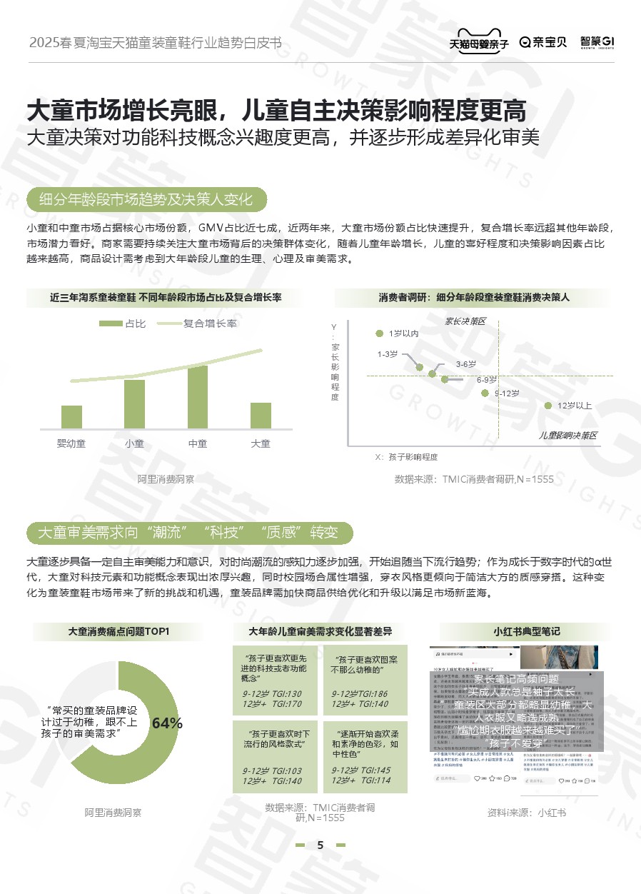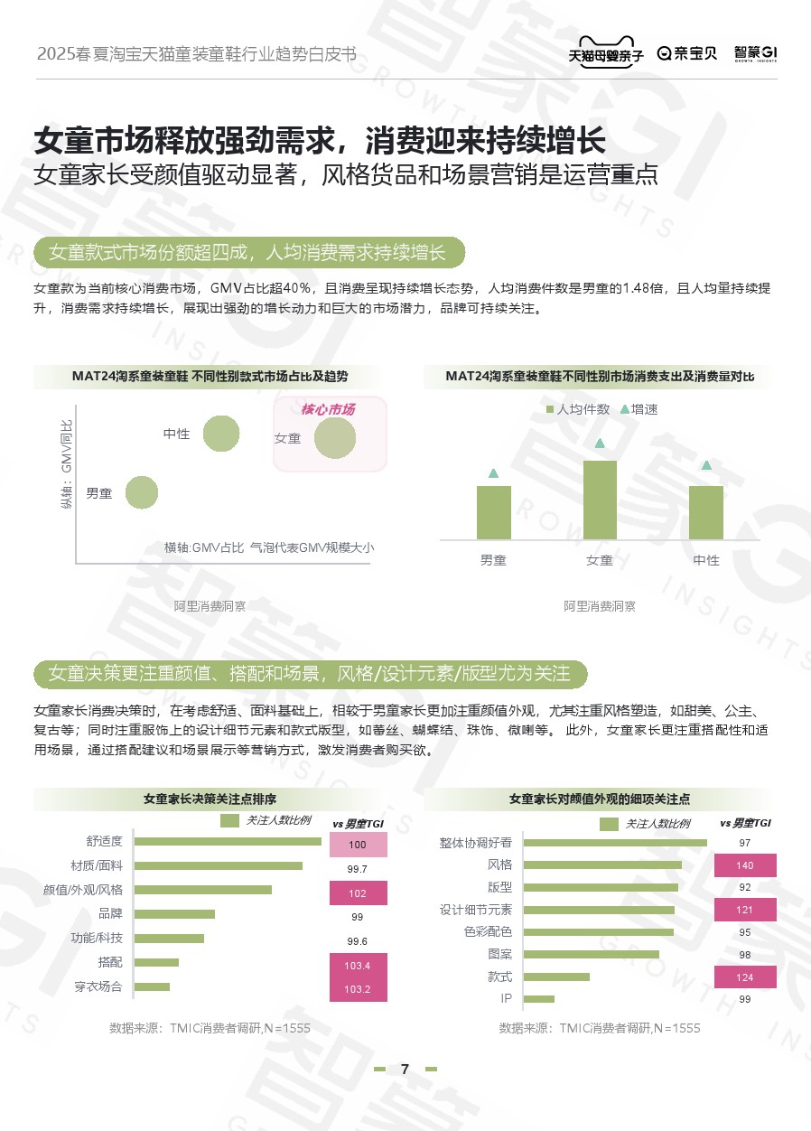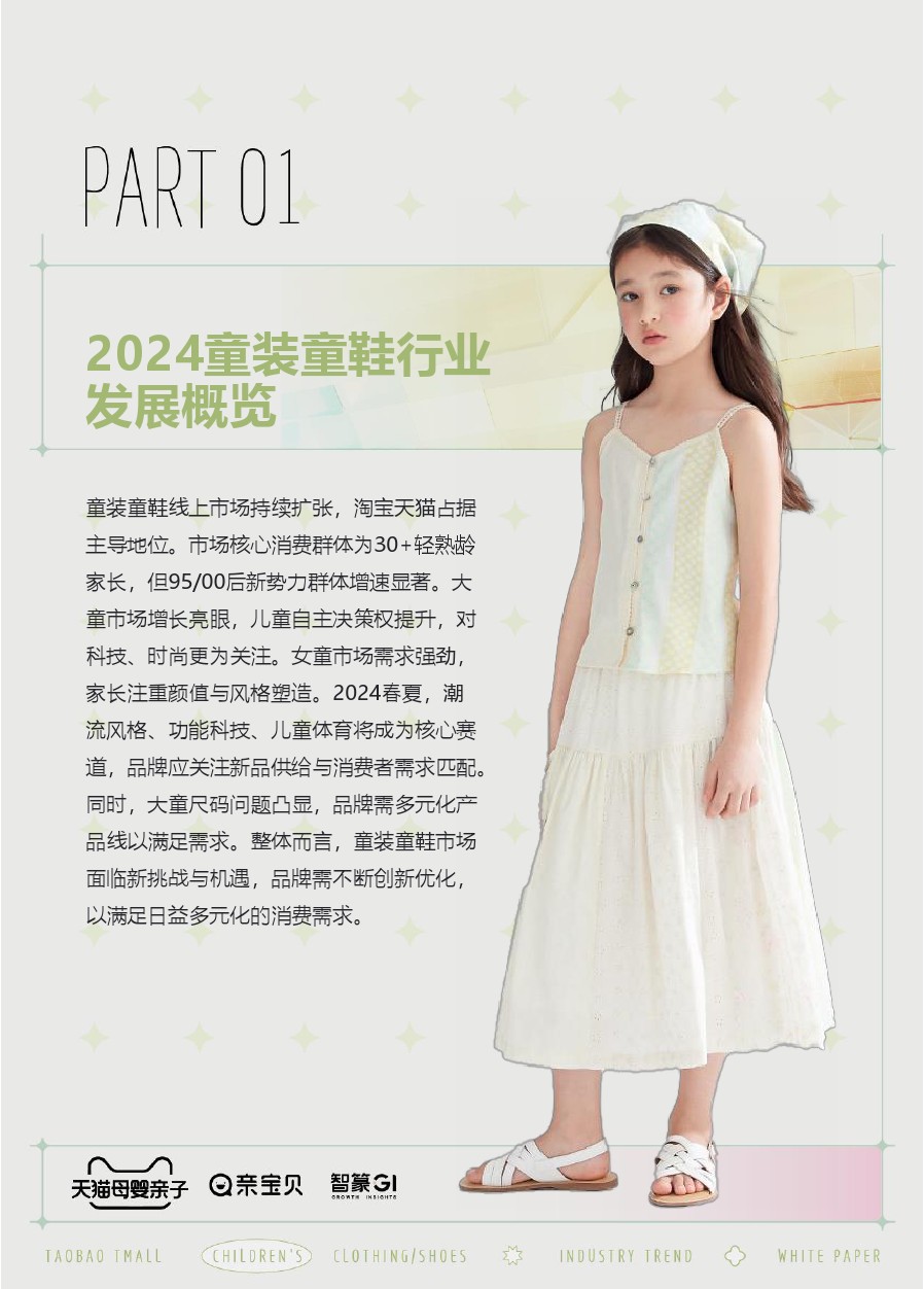 童裝童鞋線上市場持續(xù)擴張,淘寶天貓占據(jù)主導(dǎo)地位。 市場核心消費群體為30+輕熟齡家長,但95/00后新勢力群體增速顯著。 大童市場增長亮眼,兒童自主決策權(quán)提升,對科技、時尚更為關(guān)注。 女童市場需求強勁,家長注重顏值與風(fēng)格塑造。 2024春夏,潮流風(fēng)格、功能科技、兒童體育將成為核心賽道,品牌應(yīng)關(guān)注新品供給與消費者需求匹配。 同時,大童尺碼問題凸顯,品牌需多元化產(chǎn)品線以滿足需求。 整體而言,童裝童鞋市場面臨新挑戰(zhàn)與機遇,品牌需不斷創(chuàng)新優(yōu)化,以滿足日益多元化的消費需求。 |