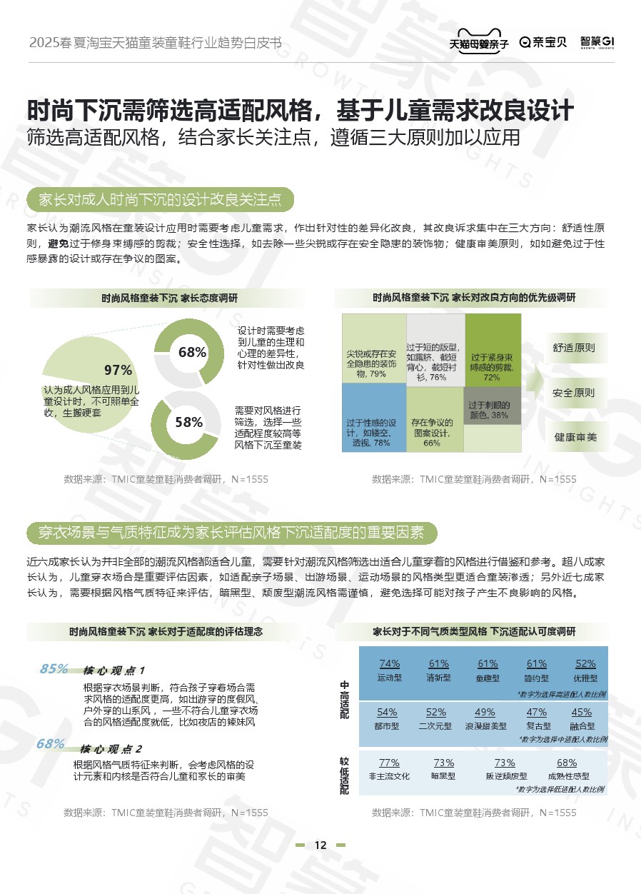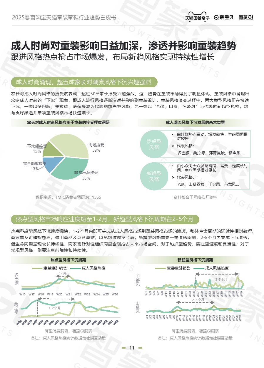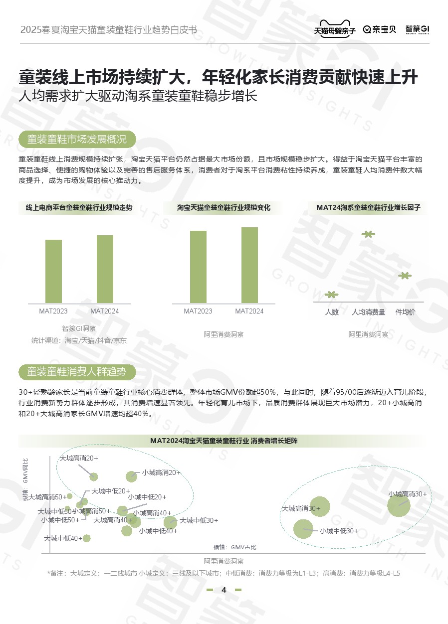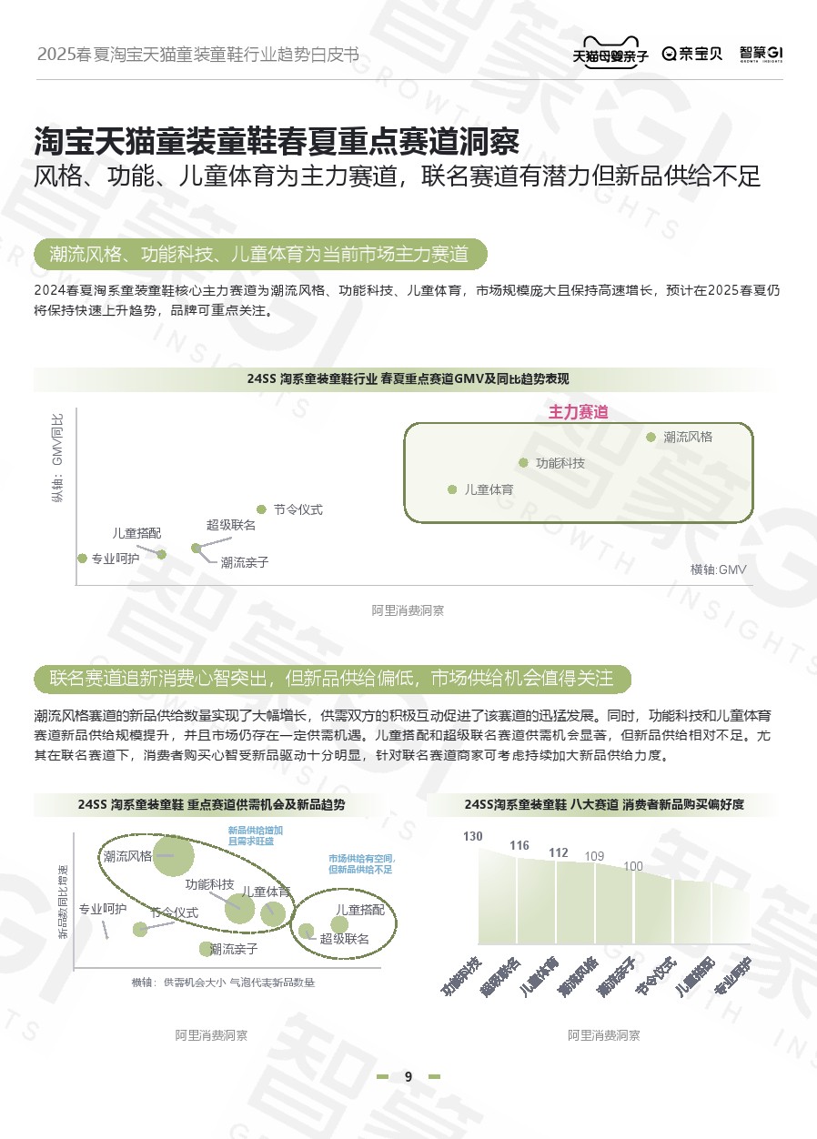 童裝童鞋線上市場持續(xù)擴張,淘寶天貓占據(jù)主導(dǎo)地位。 市場核心消費群體為30+輕熟齡家長,但95/00后新勢力群體增速顯著。 大童市場增長亮眼,兒童自主決策權(quán)提升,對科技、時尚更為關(guān)注。 女童市場需求強勁,家長注重顏值與風(fēng)格塑造。 2024春夏,潮流風(fēng)格、功能科技、兒童體育將成為核心賽道,品牌應(yīng)關(guān)注新品供給與消費者需求匹配。 同時,大童尺碼問題凸顯,品牌需多元化產(chǎn)品線以滿足需求。 整體而言,童裝童鞋市場面臨新挑戰(zhàn)與機遇,品牌需不斷創(chuàng)新優(yōu)化,以滿足日益多元化的消費需求。 |