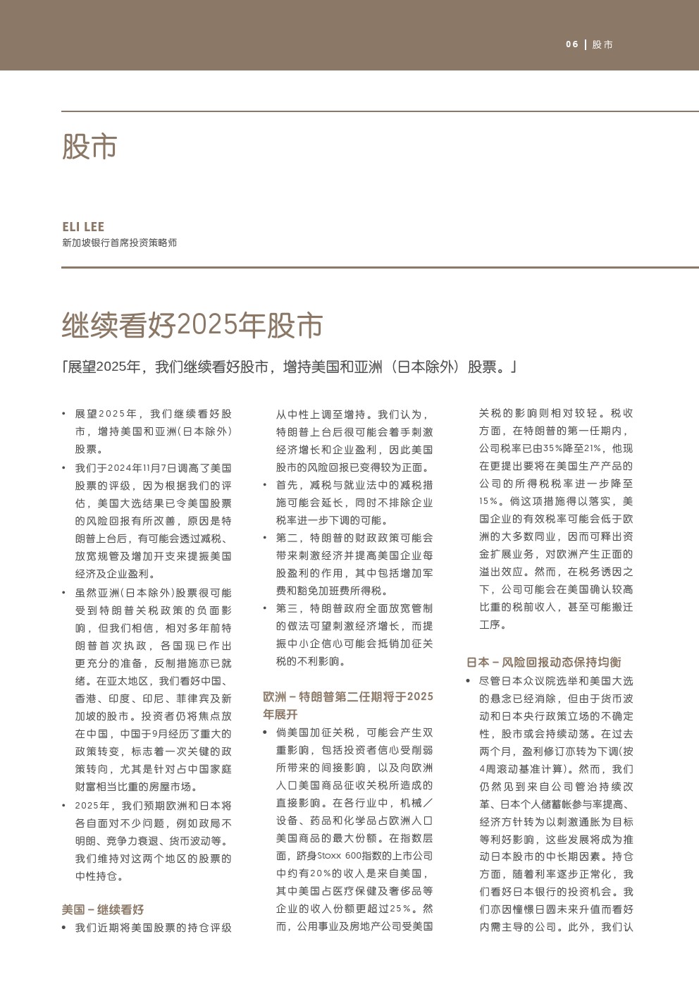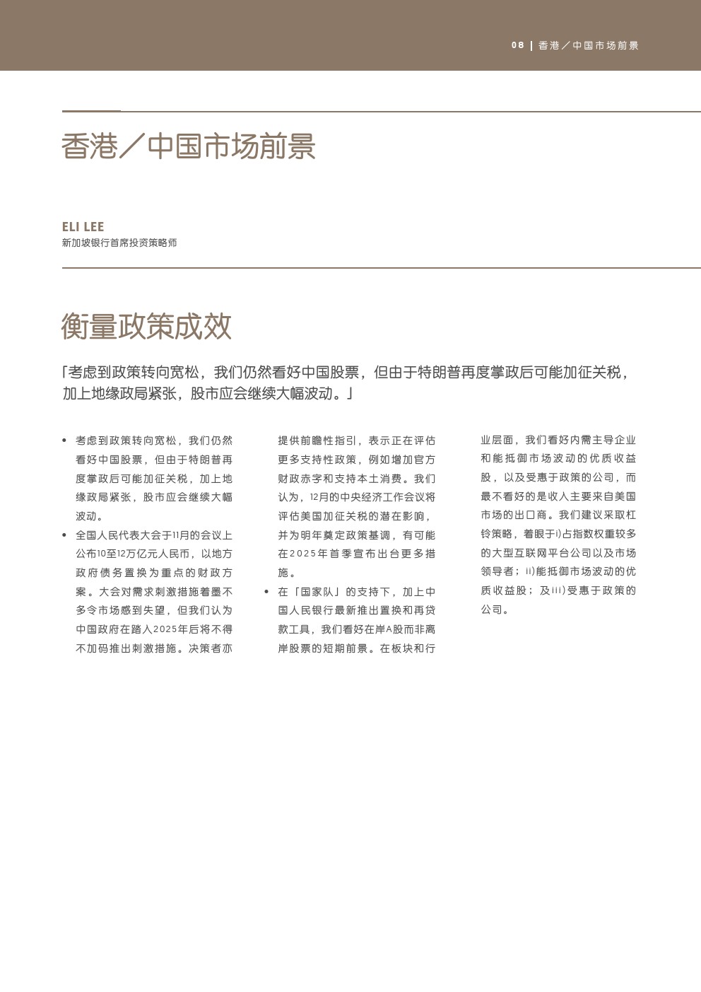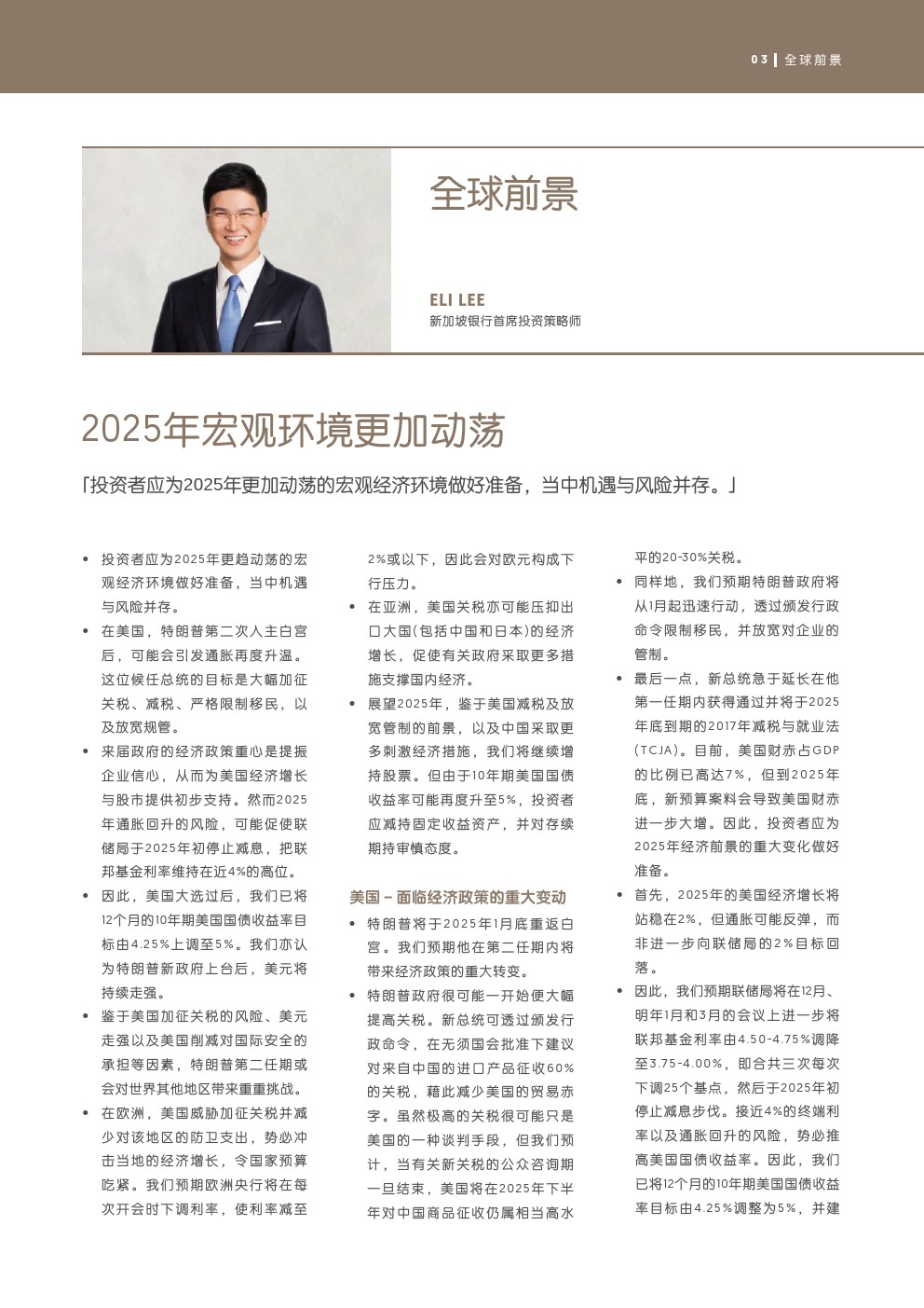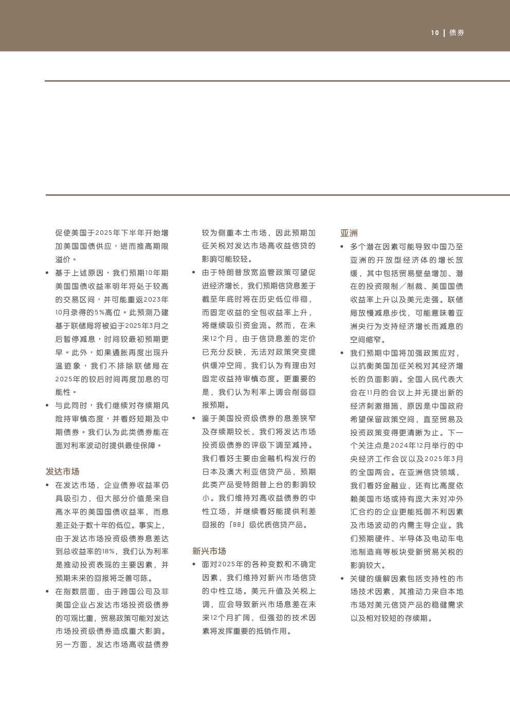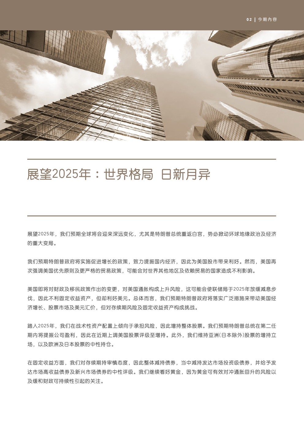 展望2025年,我們預(yù)期全球?qū)?huì)迎來深遠(yuǎn)變化,尤其是特朗普總統(tǒng)重返白宮,勢(shì)必掀動(dòng)環(huán)球地緣政治及經(jīng)濟(jì)的重大變局。 我們預(yù)期特朗普政府將實(shí)施促進(jìn)增長的政策,致力提振國內(nèi)經(jīng)濟(jì),因此為美國股市帶來利好。 然而,美國再次強(qiáng)調(diào)美國優(yōu)先原則及更嚴(yán)格的貿(mào)易政策,可能會(huì)對(duì)世界其他地區(qū)及依賴貿(mào)易的國家造成不利影響。 美國即將對(duì)財(cái)政及移民政策作出的變更,對(duì)美國通脹構(gòu)成上升風(fēng)險(xiǎn),這可能會(huì)使聯(lián)儲(chǔ)局于2025年放緩減息步伐,因此不利固定收益資產(chǎn),但卻利好美元。 總體而言,我們預(yù)期特朗普政府將落實(shí)廣泛措施來帶動(dòng)美國經(jīng)濟(jì)增長、股票市場(chǎng)及美元匯價(jià),但對(duì)存續(xù)期風(fēng)險(xiǎn)及固定收益資產(chǎn)構(gòu)成挑戰(zhàn)。 踏入2025年,我們?cè)趹?zhàn)術(shù)性資產(chǎn)配置上傾向于承擔(dān)風(fēng)險(xiǎn),因此增持整體股票。 我們預(yù)期特朗普總統(tǒng)在第二任期內(nèi)將提振公司盈利,因此在近期上調(diào)美國股票評(píng)級(jí)至增持。 此外,我們維持亞洲(日本除外)股票的增持立場(chǎng),以及歐洲及日本股票的中性持倉。 在固定收益方面,我們對(duì)存續(xù)期持審慎態(tài)度,因此整體減持債券,當(dāng)中減持發(fā)達(dá)市場(chǎng)投資級(jí)債券,并給予發(fā)達(dá)市場(chǎng)高收益?zhèn)靶屡d市場(chǎng)債券的中性評(píng)級(jí)。 我們繼續(xù)看好黃金,因?yàn)辄S金可有效對(duì)沖通脹回升的風(fēng)險(xiǎn)以及緩和財(cái)政可持續(xù)性引起的關(guān)注。 |