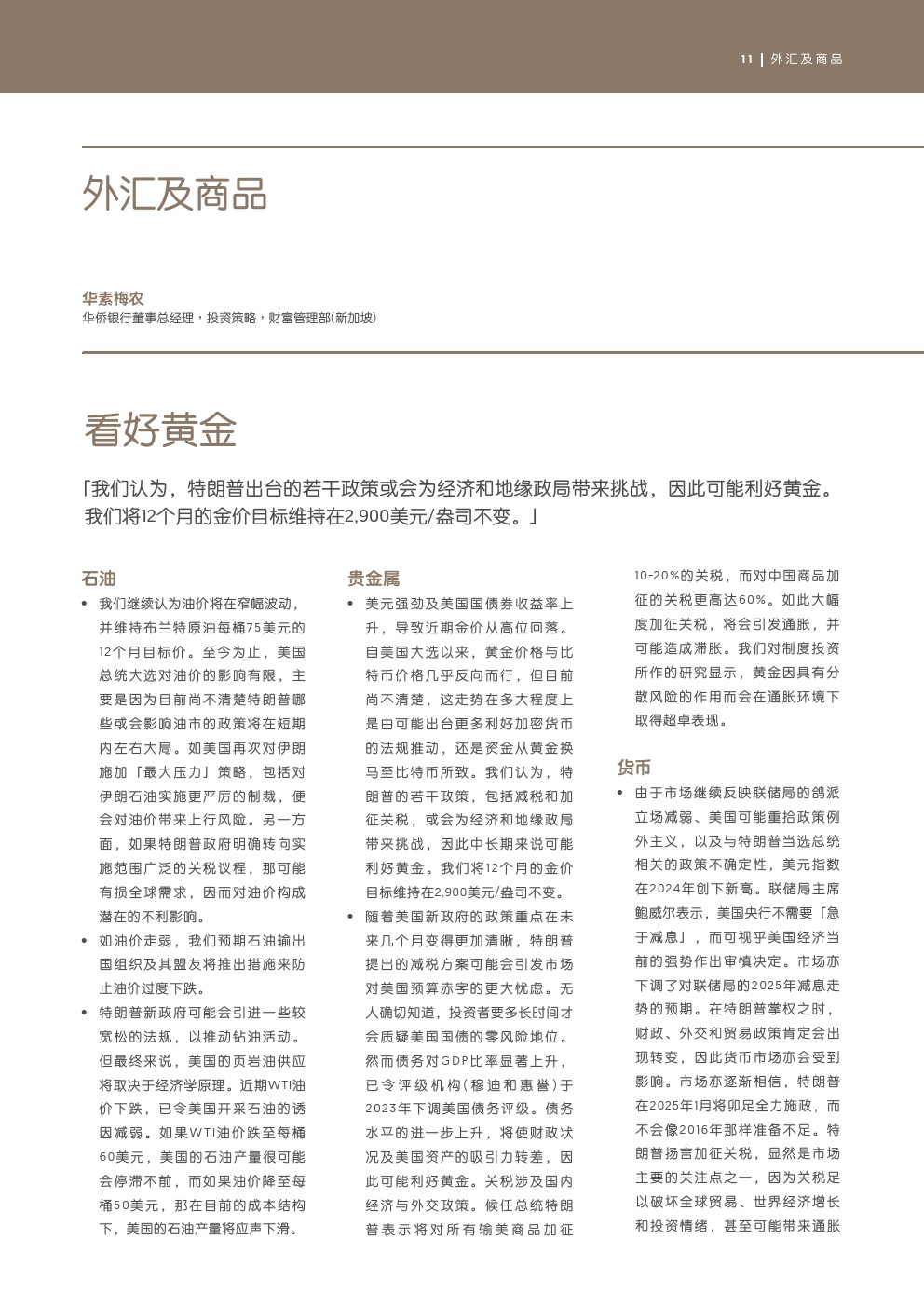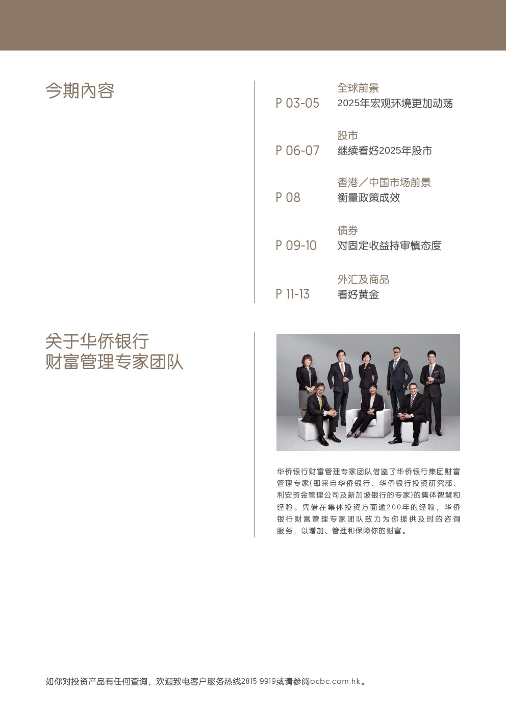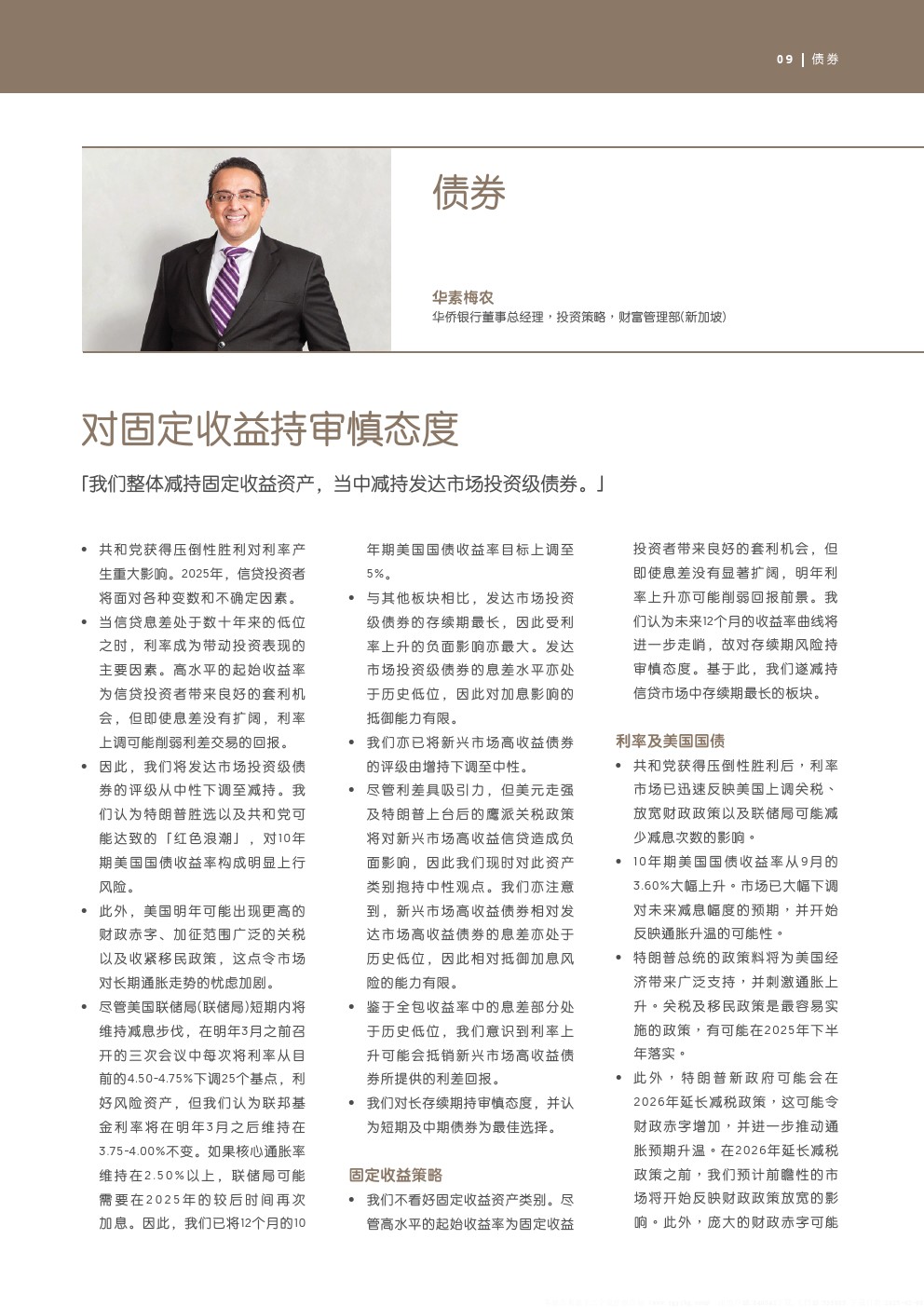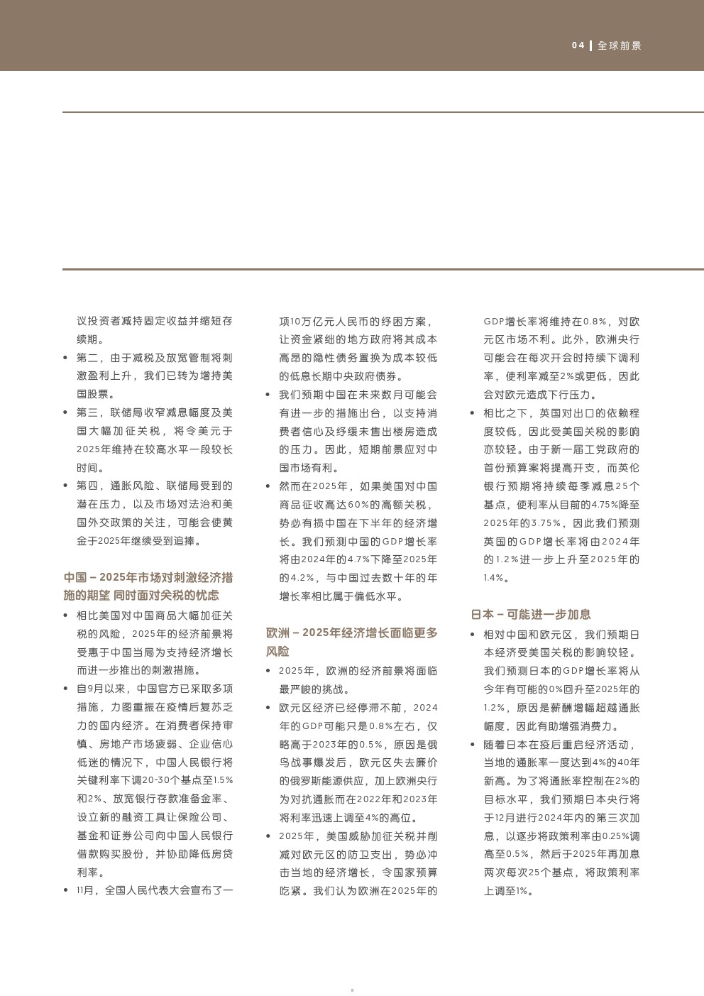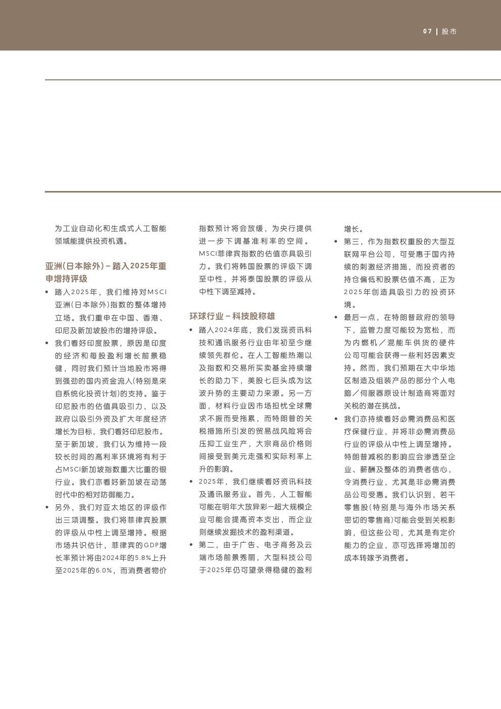 展望2025年,我們預(yù)期全球?qū)?huì)迎來深遠(yuǎn)變化,尤其是特朗普總統(tǒng)重返白宮,勢(shì)必掀動(dòng)環(huán)球地緣政治及經(jīng)濟(jì)的重大變局。 我們預(yù)期特朗普政府將實(shí)施促進(jìn)增長的政策,致力提振國內(nèi)經(jīng)濟(jì),因此為美國股市帶來利好。 然而,美國再次強(qiáng)調(diào)美國優(yōu)先原則及更嚴(yán)格的貿(mào)易政策,可能會(huì)對(duì)世界其他地區(qū)及依賴貿(mào)易的國家造成不利影響。 美國即將對(duì)財(cái)政及移民政策作出的變更,對(duì)美國通脹構(gòu)成上升風(fēng)險(xiǎn),這可能會(huì)使聯(lián)儲(chǔ)局于2025年放緩減息步伐,因此不利固定收益資產(chǎn),但卻利好美元。 總體而言,我們預(yù)期特朗普政府將落實(shí)廣泛措施來帶動(dòng)美國經(jīng)濟(jì)增長、股票市場(chǎng)及美元匯價(jià),但對(duì)存續(xù)期風(fēng)險(xiǎn)及固定收益資產(chǎn)構(gòu)成挑戰(zhàn)。 踏入2025年,我們?cè)趹?zhàn)術(shù)性資產(chǎn)配置上傾向于承擔(dān)風(fēng)險(xiǎn),因此增持整體股票。 我們預(yù)期特朗普總統(tǒng)在第二任期內(nèi)將提振公司盈利,因此在近期上調(diào)美國股票評(píng)級(jí)至增持。 此外,我們維持亞洲(日本除外)股票的增持立場(chǎng),以及歐洲及日本股票的中性持倉。 在固定收益方面,我們對(duì)存續(xù)期持審慎態(tài)度,因此整體減持債券,當(dāng)中減持發(fā)達(dá)市場(chǎng)投資級(jí)債券,并給予發(fā)達(dá)市場(chǎng)高收益?zhèn)靶屡d市場(chǎng)債券的中性評(píng)級(jí)。 我們繼續(xù)看好黃金,因?yàn)辄S金可有效對(duì)沖通脹回升的風(fēng)險(xiǎn)以及緩和財(cái)政可持續(xù)性引起的關(guān)注。 |