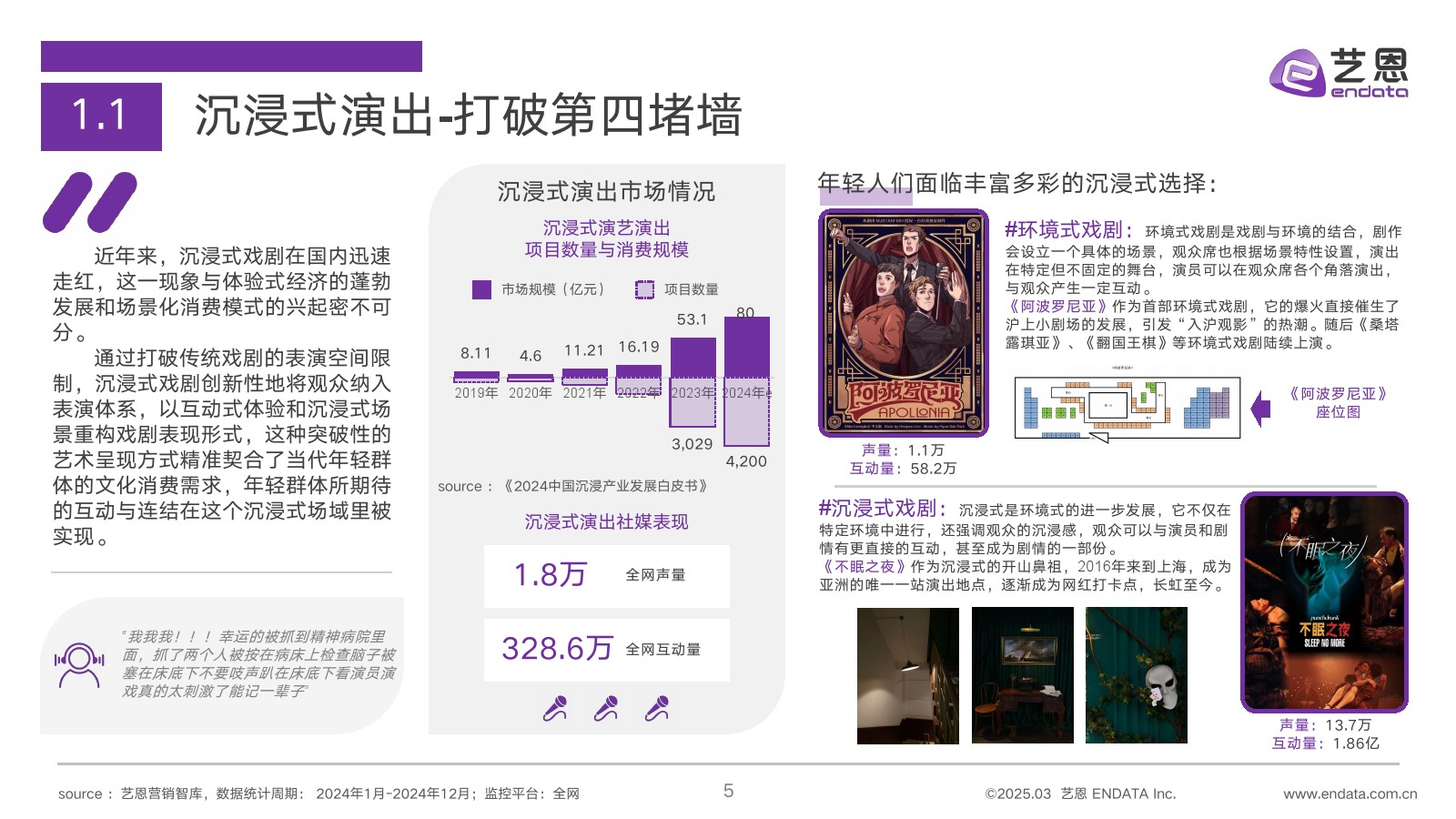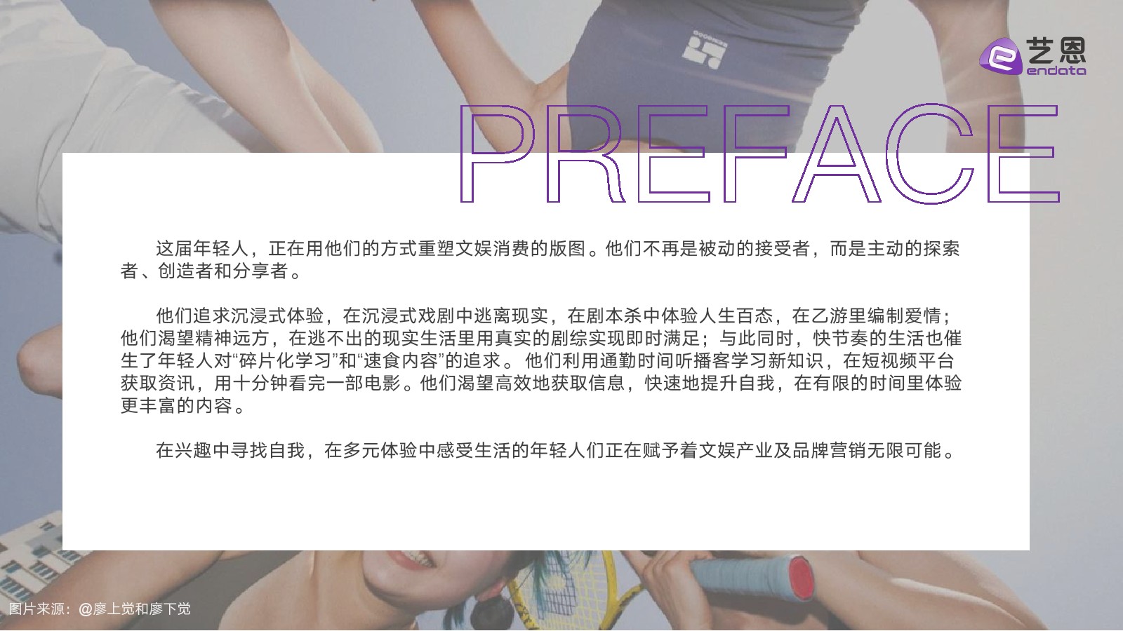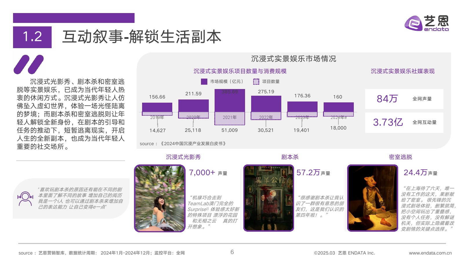 這屆年輕人,正在用他們的方式重塑文娛消費的版圖。 他們不再是被動的接受者,而是主動的探索者、創(chuàng)造者和分享者。 他們追求沉浸式體驗,在沉浸式戲劇中逃離現(xiàn)實,在劇本殺中體驗人生百態(tài),在乙游里編制愛情;他們渴望精神遠(yuǎn)方,在逃不出的現(xiàn)實生活里用真實的劇綜實現(xiàn)即時滿足;與此同時,快節(jié)奏的生活也催生了年輕人對“碎片化學(xué)習(xí)”和“速食內(nèi)容”的追求。 他們利用通勤時間聽播客學(xué)習(xí)新知識,在短視頻平臺獲取資訊,用十分鐘看完一部電影。 他們渴望高效地獲取信息,快速地提升自我,在有限的時間里體驗更豐富的內(nèi)容。 在興趣中尋找自我,在多元體驗中感受生活的年輕人們正在賦予著文娛產(chǎn)業(yè)及品牌營銷無限可能。 |