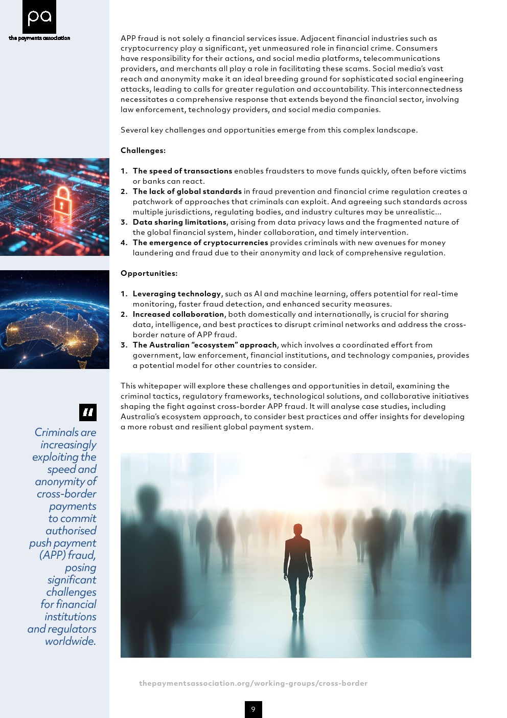 跨境支付的全球格局正在迅速發(fā)展擴張,由幾個關(guān)鍵因素驅(qū)動。 其中包括全球化貿(mào)易、電子商務(wù)的興起以及由此帶來的數(shù)字化轉(zhuǎn)型金融科技創(chuàng)新。 中小企業(yè)(SMEs)現(xiàn)在更多地從事國際貿(mào)易無縫連接,而消費者越來越多地從全球零售商那里購物。 數(shù)字錢包和支付平臺正在簡化交易,匯款的增加是由于全球移民和國際就業(yè)進一步推動了跨國公司的激增邊境交易。 此外,加密貨幣和區(qū)塊鏈的采用越來越多技術(shù)以及中央銀行數(shù)字貨幣(CBDC)的發(fā)展通過提供更快、更便宜的服務(wù),為跨境支付格局做出貢獻傳統(tǒng)貨幣兌換的替代品。 然而,跨境支付的增長,特別是80多個國家提供實時支付方案,可以在以下時間之間發(fā)起、清算和結(jié)算付款銀行賬戶在幾秒鐘內(nèi)就會出現(xiàn)欺詐行為,尤其是授權(quán)推送支付(APP)欺詐。 APP欺詐,個人和企業(yè)被欺騙在國際交易中,向欺詐者付款的行為越來越普遍由于其復(fù)雜性、缺乏標準化以及涉及多個中介機構(gòu)。 欺詐者利用全球通信差距、監(jiān)管差異和網(wǎng)絡(luò)安全容易欺騙受害者,同時難以撤銷付款和追回跨司法管轄區(qū)的資金進一步放大了威脅。 為了應(yīng)對這些挑戰(zhàn),必須超越技術(shù)解決方案,學(xué)習從受害者的個人經(jīng)歷和專家的見解中,獲得更深層次的理解了解犯罪分子如何在跨境支付生態(tài)系統(tǒng)中運作。 欺詐預(yù)防策略必須結(jié)合這些知識來識別模式、預(yù)測欺詐策略,并教育利益相關(guān)者了解不斷變化的風險。 隨著跨境支付的繼續(xù)為了增長,需要強大的安全性措施、監(jiān)管框架和對犯罪的深入理解方法論變得越來越關(guān)鍵。 |