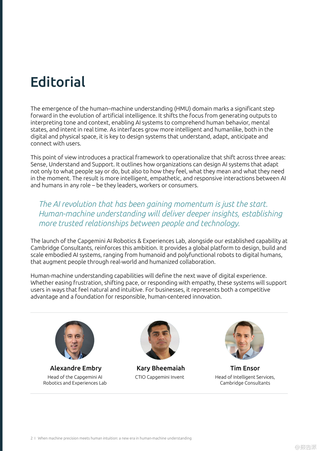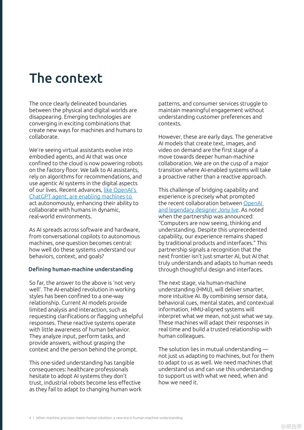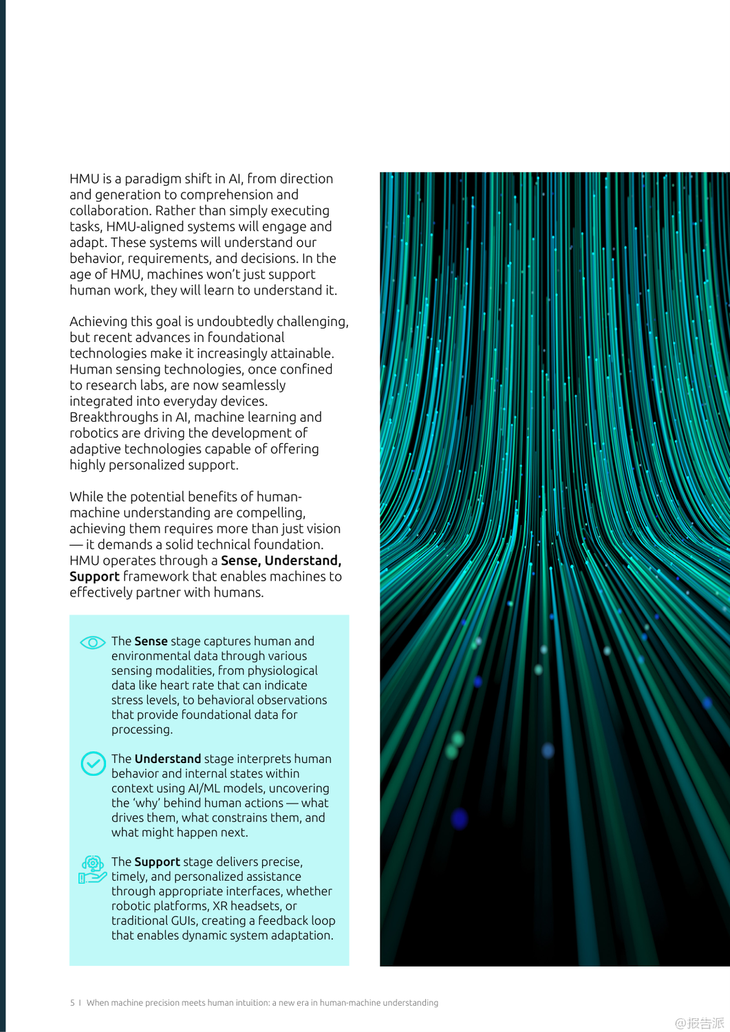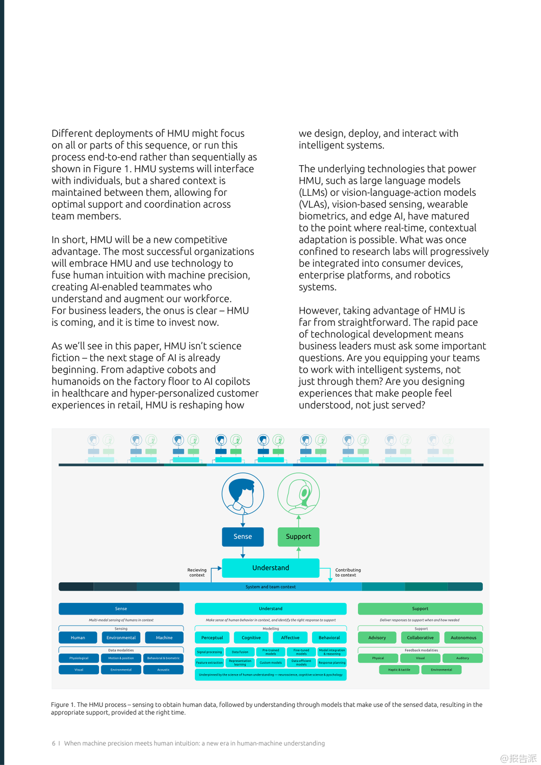 本文提出人機(jī)理解(HMU)新范式,強(qiáng)調(diào)AI從執(zhí)行任務(wù)轉(zhuǎn)向理解人類行為、情緒與意圖。通過“感知-理解-支持”框架,AI將實現(xiàn)情感識別、情境判斷與實時響應(yīng),成為真正的工作伙伴。醫(yī)療、工業(yè)、消費領(lǐng)域已現(xiàn)雛形,如AI醫(yī)生助手、協(xié)作機(jī)器人、情緒感知零售系統(tǒng)。但數(shù)據(jù)安全、倫理風(fēng)險仍需警惕。未來勝負(fù)手在于:誰能讓機(jī)器既聰明又懂你。 出品方:凱捷 發(fā)布時間:2025年 文檔頁數(shù):20頁 |
