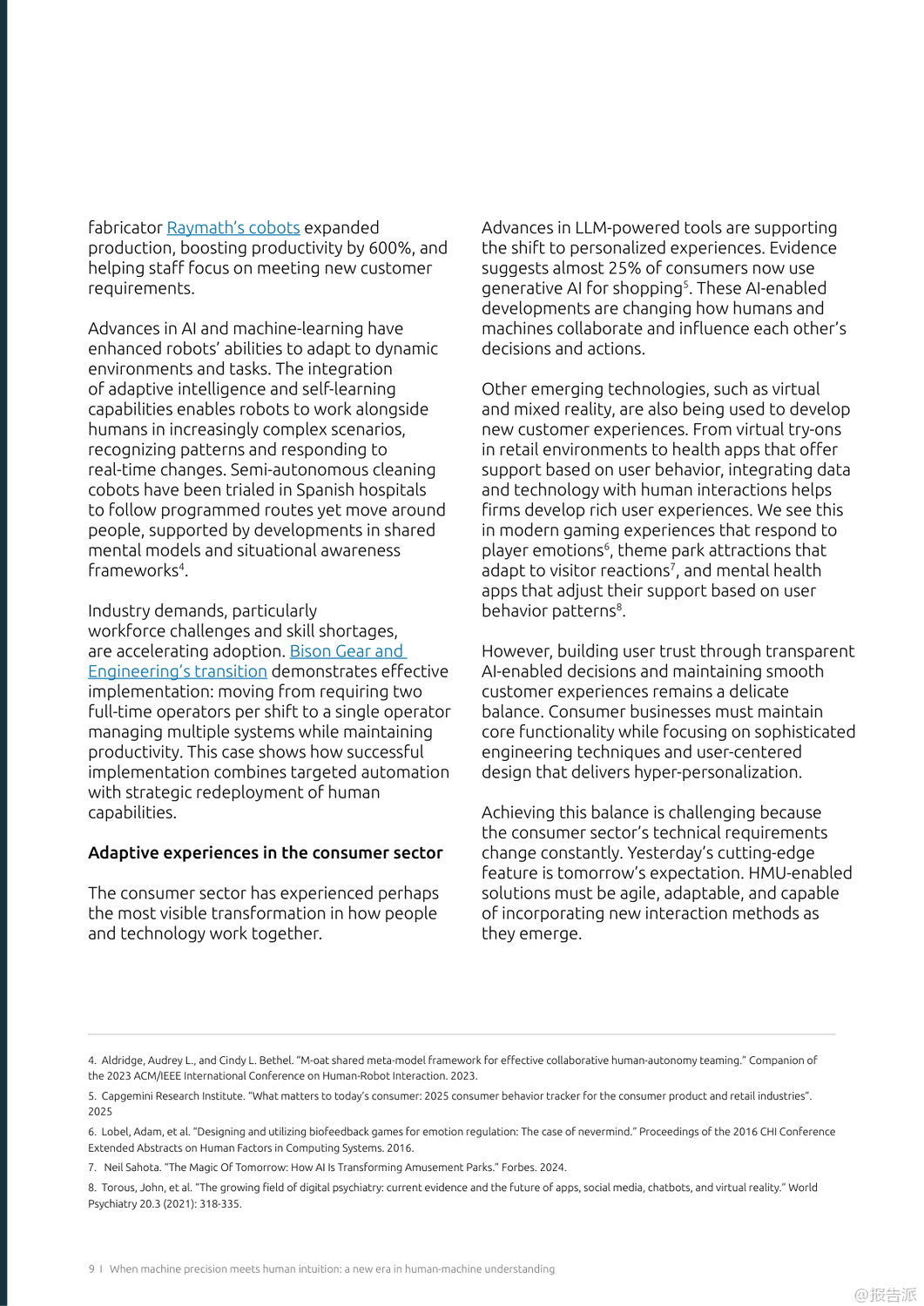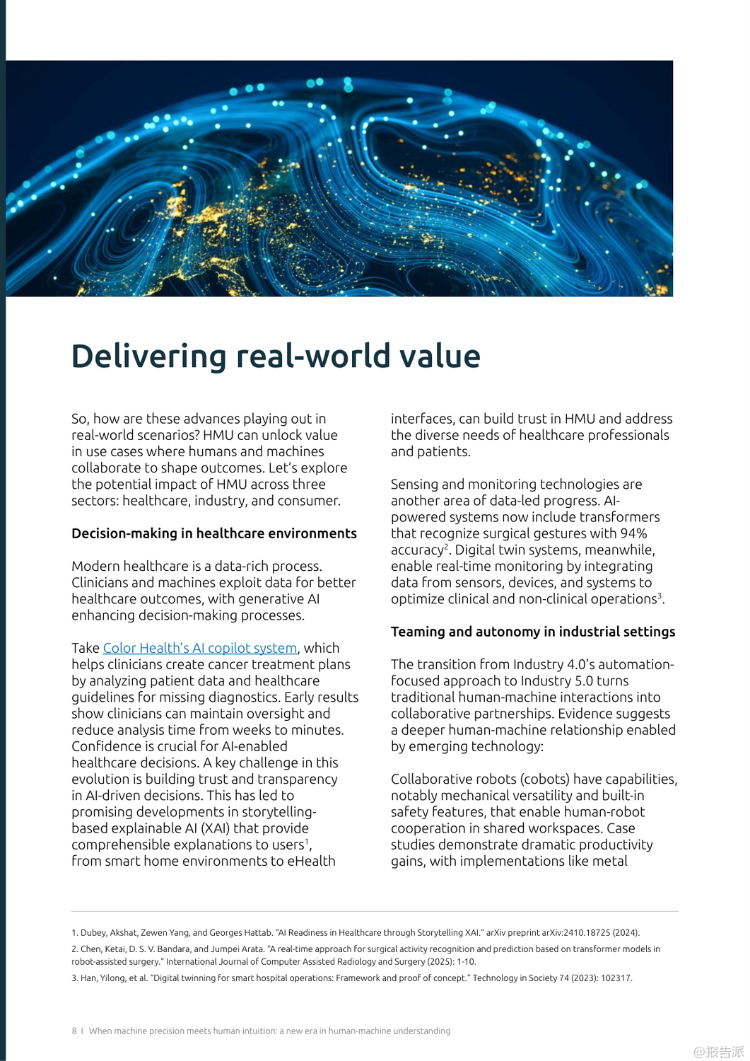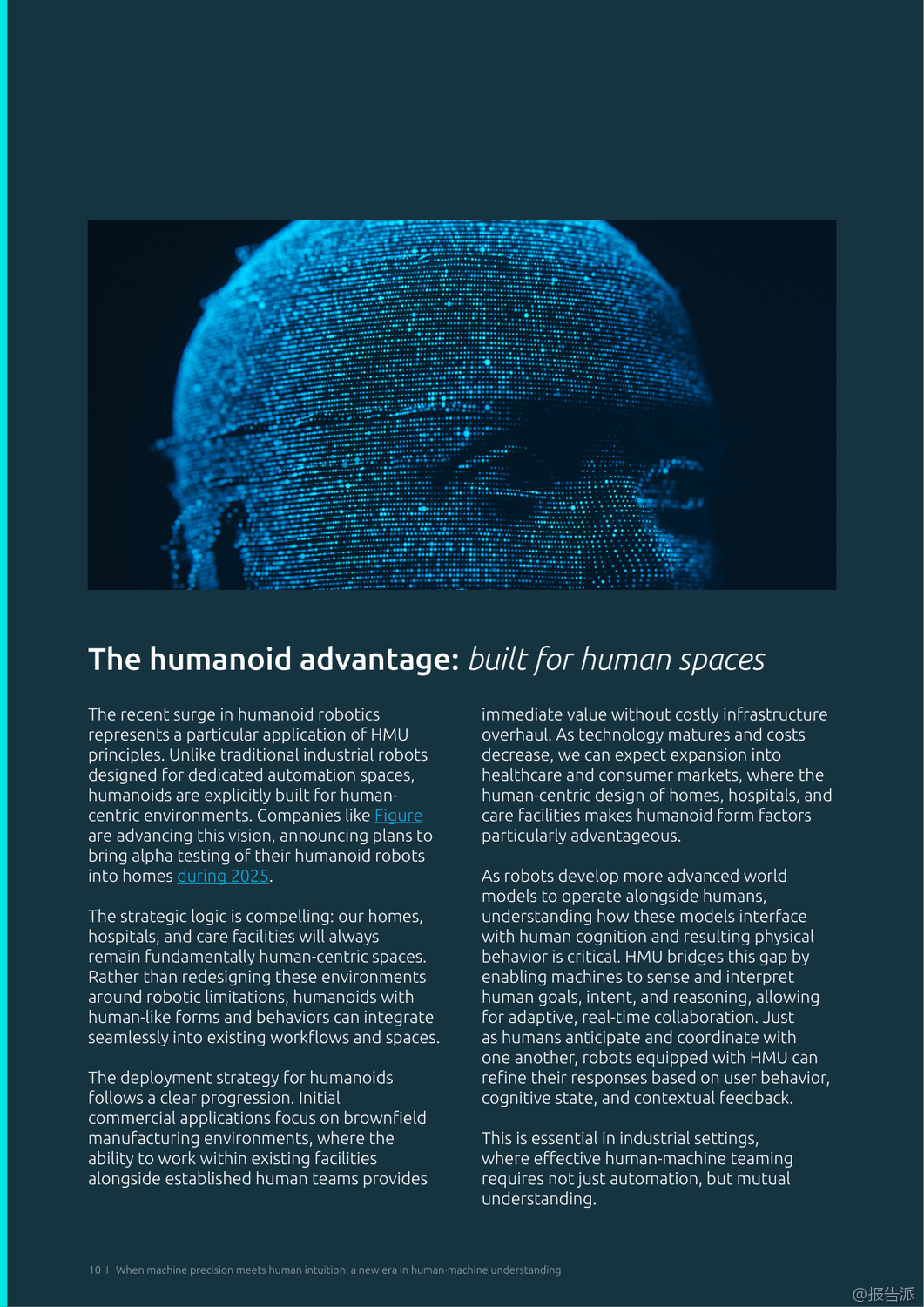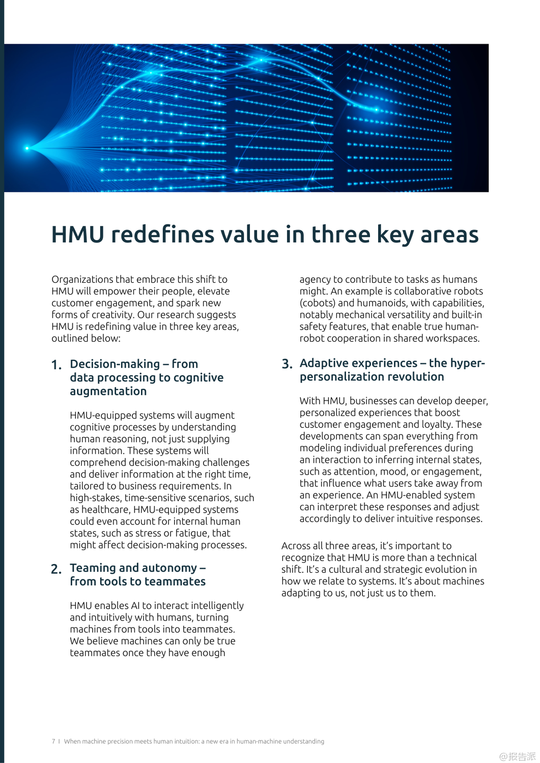 本文提出人機(jī)理解(HMU)新范式,強(qiáng)調(diào)AI從執(zhí)行任務(wù)轉(zhuǎn)向理解人類行為、情緒與意圖。通過“感知-理解-支持”框架,AI將實現(xiàn)情感識別、情境判斷與實時響應(yīng),成為真正的工作伙伴。醫(yī)療、工業(yè)、消費領(lǐng)域已現(xiàn)雛形,如AI醫(yī)生助手、協(xié)作機(jī)器人、情緒感知零售系統(tǒng)。但數(shù)據(jù)安全、倫理風(fēng)險仍需警惕。未來勝負(fù)手在于:誰能讓機(jī)器既聰明又懂你。 出品方:凱捷 發(fā)布時間:2025年 文檔頁數(shù):20頁 |