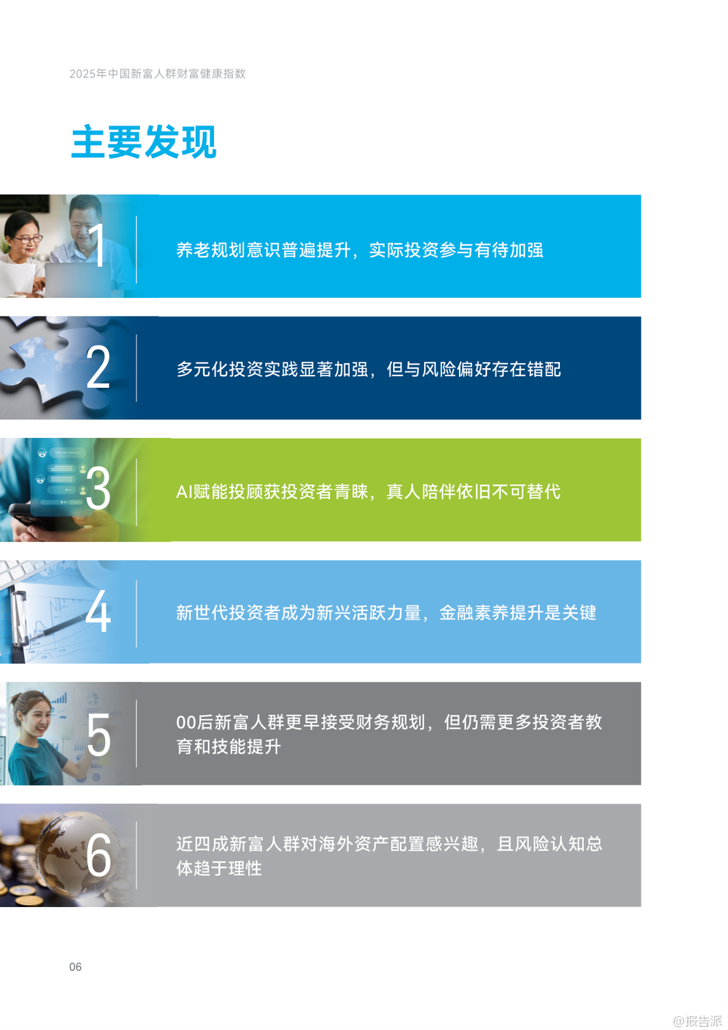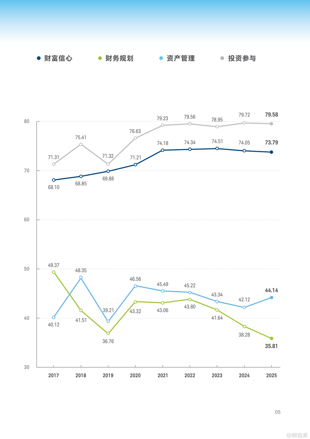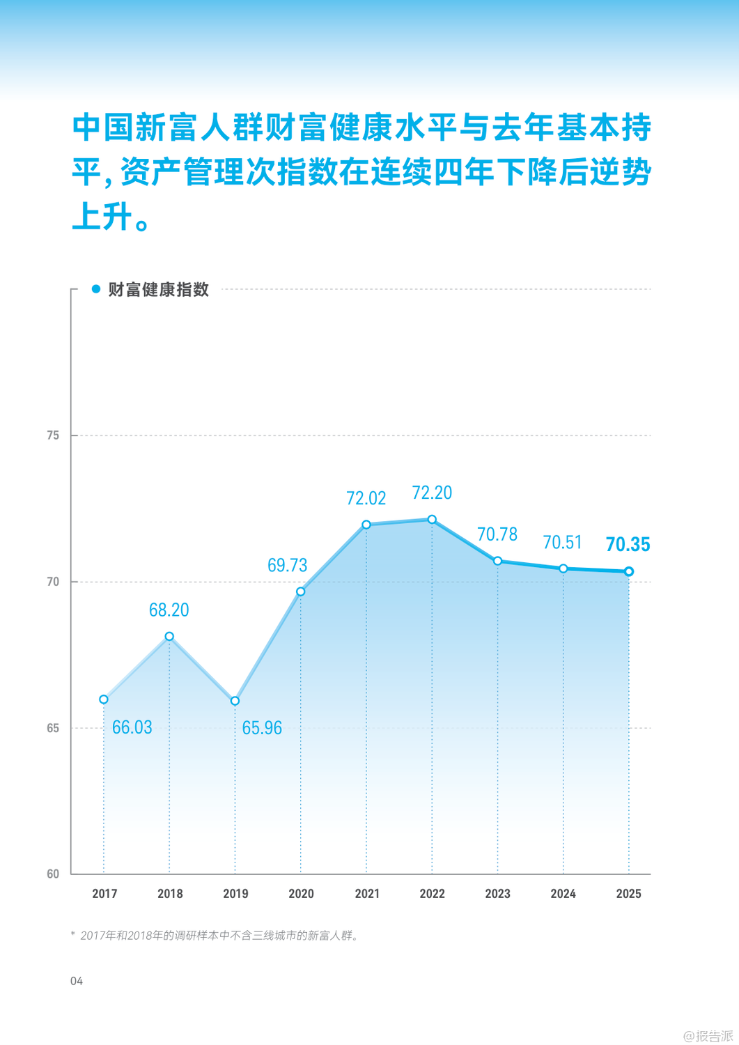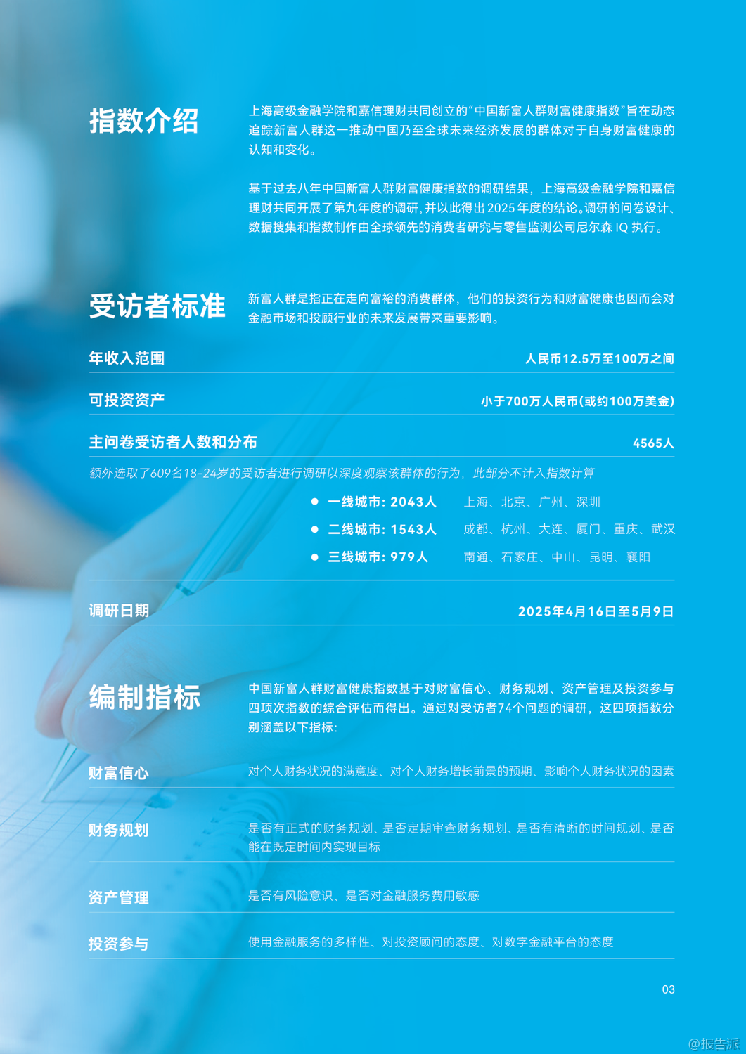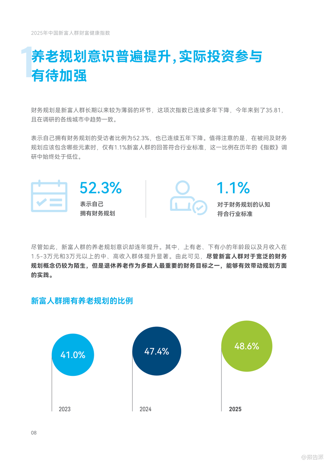 2025年中國(guó)新富人群財(cái)富健康指數(shù)顯示,整體水平與去年持平,為70.35。養(yǎng)老規(guī)劃意識(shí)顯著提升,但實(shí)際投資參與不足。多元化投資趨勢(shì)加強(qiáng),基金配置比例大幅上升,AI投顧信任度高,但人工服務(wù)仍不可替代。新世代投資者涌入市場(chǎng),金融素養(yǎng)亟待提升,00后雖早規(guī)劃卻易追漲殺跌。海外投資興趣濃厚但行動(dòng)滯后,行業(yè)需加強(qiáng)投教與產(chǎn)品創(chuàng)新。 出品方:嘉信理財(cái) 發(fā)布時(shí)間:2025年 文檔頁(yè)數(shù):75頁(yè) |