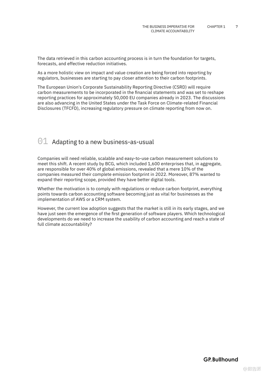 為實(shí)現(xiàn)2050年凈零排放目標(biāo),企業(yè)需精確核算碳足跡。當(dāng)前僅有10%公司完成全范圍排放測(cè)量,主因數(shù)據(jù)收集復(fù)雜、標(biāo)準(zhǔn)缺失。碳核算軟件正從手動(dòng)轉(zhuǎn)向自動(dòng)化,AI、API集成與供應(yīng)鏈數(shù)字化成關(guān)鍵驅(qū)動(dòng)力。市場(chǎng)預(yù)計(jì)從120億美元增長至2030年的650億美元,垂直化、自動(dòng)化與標(biāo)準(zhǔn)化是未來趨勢(shì)。 出品方:GP Bullhound 發(fā)布時(shí)間:2024年 文檔頁數(shù):25頁 |