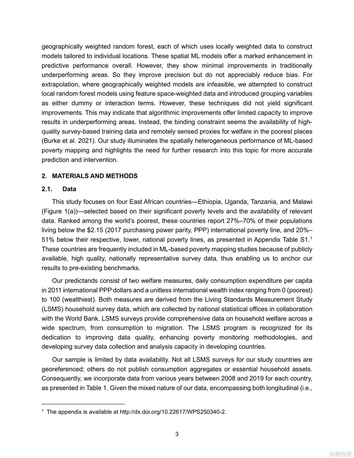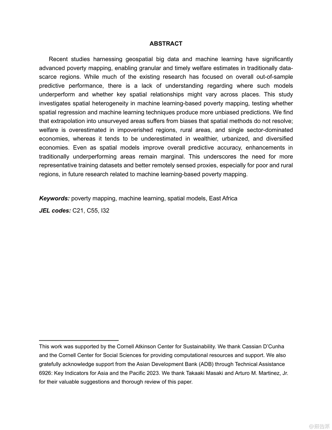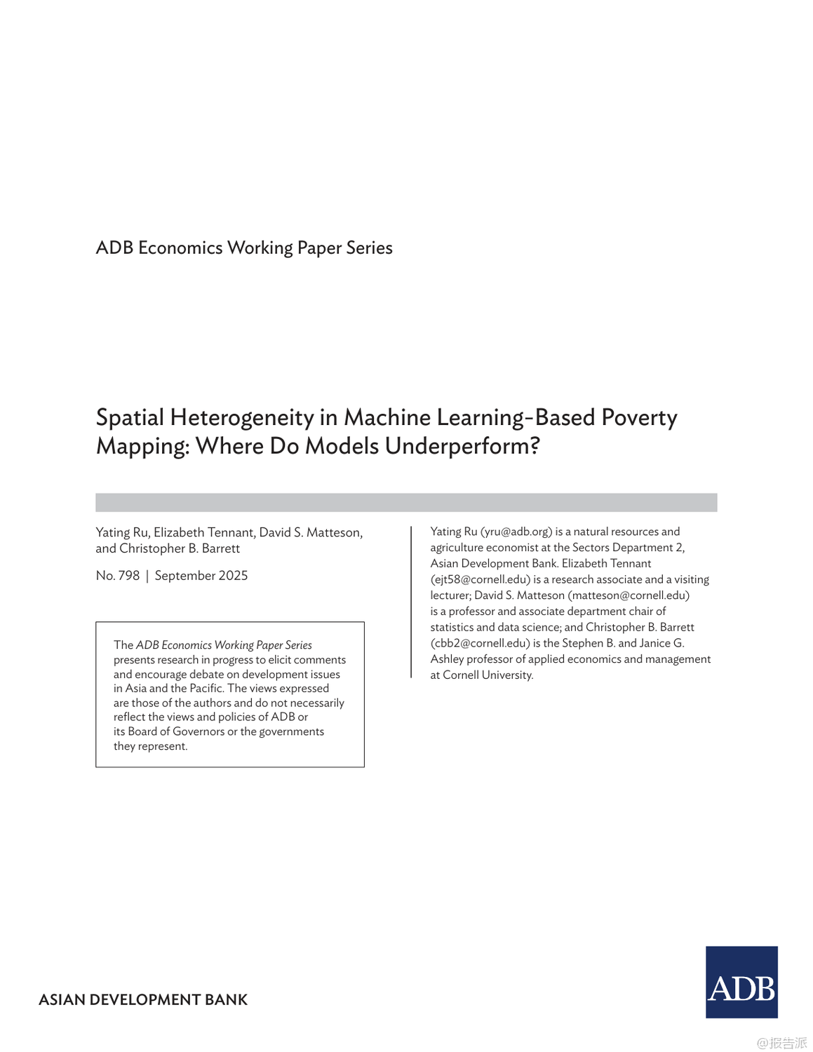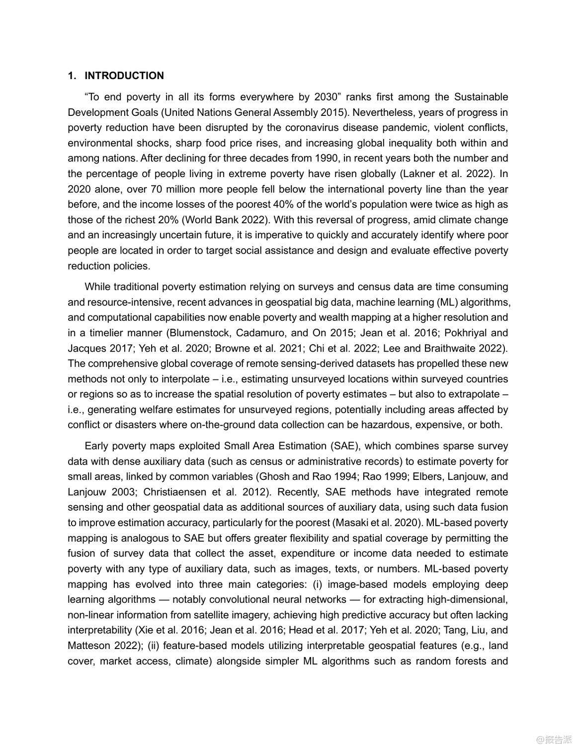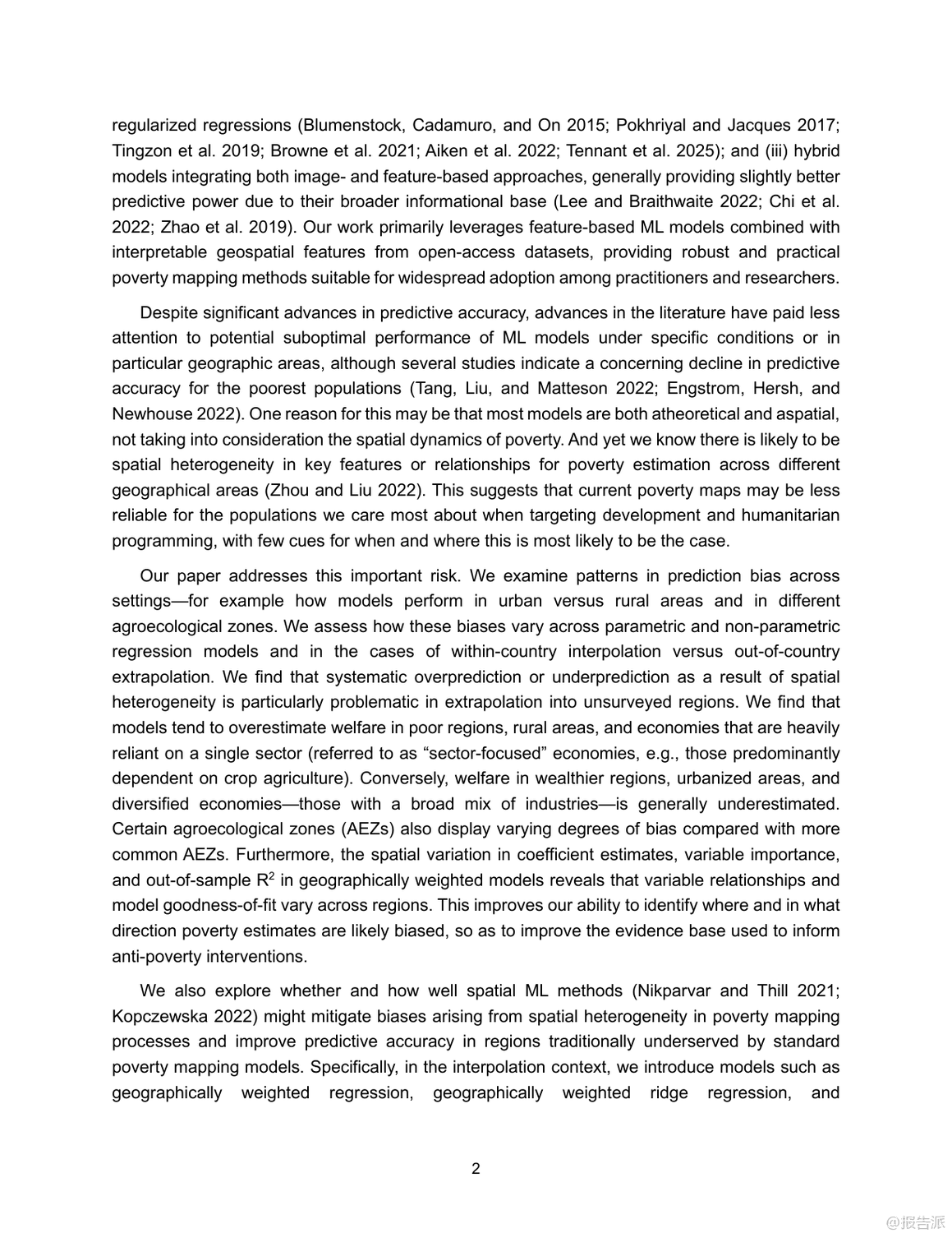 這篇由亞洲開發(fā)銀行發(fā)布的2025年工作論文指出,當(dāng)前基于機(jī)器學(xué)習(xí)和衛(wèi)星數(shù)據(jù)的貧困地圖雖技術(shù)先進(jìn),但在實(shí)際應(yīng)用中存在嚴(yán)重偏差。模型普遍高估貧困地區(qū)、農(nóng)村及單一產(chǎn)業(yè)經(jīng)濟(jì)區(qū)的真實(shí)貧困程度,反而低估了富裕、城市化和經(jīng)濟(jì)多元地區(qū)的福利水平。尤其在缺乏實(shí)地調(diào)查數(shù)據(jù)的外推場景下,這種系統(tǒng)性誤判更加明顯。盡管引入地理加權(quán)模型能提升整體精度,但對最需要關(guān)注的弱勢地區(qū)改善有限。研究強(qiáng)調(diào),問題根源不在于算法本身,而在于訓(xùn)練數(shù)據(jù)不足和遙感代理指標(biāo)缺失,呼吁未來需加強(qiáng)貧困區(qū)域的數(shù)據(jù)覆蓋與精準(zhǔn)建模。 出品方:亞開行 發(fā)布時(shí)間:2025年 文檔頁數(shù):33頁 |