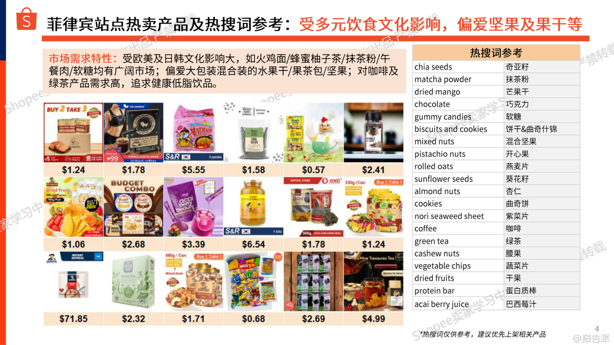 本報(bào)告深入分析了2025年下半年Shopee菲律賓站點(diǎn)食品飲料品類的市場(chǎng)趨勢(shì)。數(shù)據(jù)顯示,飲料、零食和烹飪調(diào)味品為銷售額前三品類,消費(fèi)者偏好堅(jiān)果、果干、抹茶粉、咖啡等健康及進(jìn)口風(fēng)味產(chǎn)品。熱搜詞顯示對(duì)混合堅(jiān)果、巧克力、奇亞籽等需求旺盛??蛦蝺r(jià)方面,零食類集中在6-10美元,沖飲類如咖啡可達(dá)12-15美元。報(bào)告指出,受歐美日韓飲食文化影響顯著,健康低脂、大包裝混合裝產(chǎn)品更受歡迎,建議賣家重點(diǎn)關(guān)注高增長(zhǎng)細(xì)分品類。 出品方:Shopee 發(fā)布時(shí)間:2025年 |
