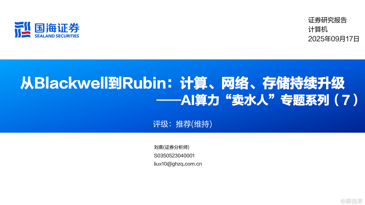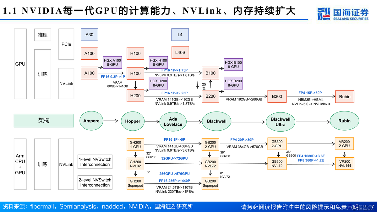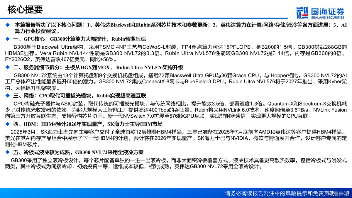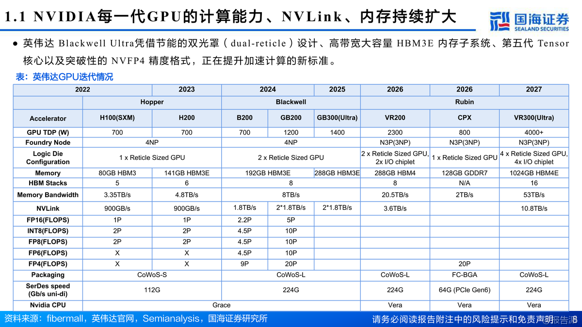 英偉達Blackwell架構(gòu)GPU性能大幅提升,GB300浮點算力達15PFLOPS,HBM3E顯存增至288GB。Rubin架構(gòu)2026年推出,性能較GB300提升3.3倍,液冷、CPO光模塊、NVLink 6.0等新技術(shù)全面升級。HBM4預(yù)計2026量產(chǎn),SK海力士主導(dǎo)市場。AI算力產(chǎn)業(yè)鏈從芯片到IDC多環(huán)節(jié)受益,行業(yè)維持推薦評級。 出品方:國海證券 發(fā)布時間:2025年 文檔頁數(shù):53頁 |