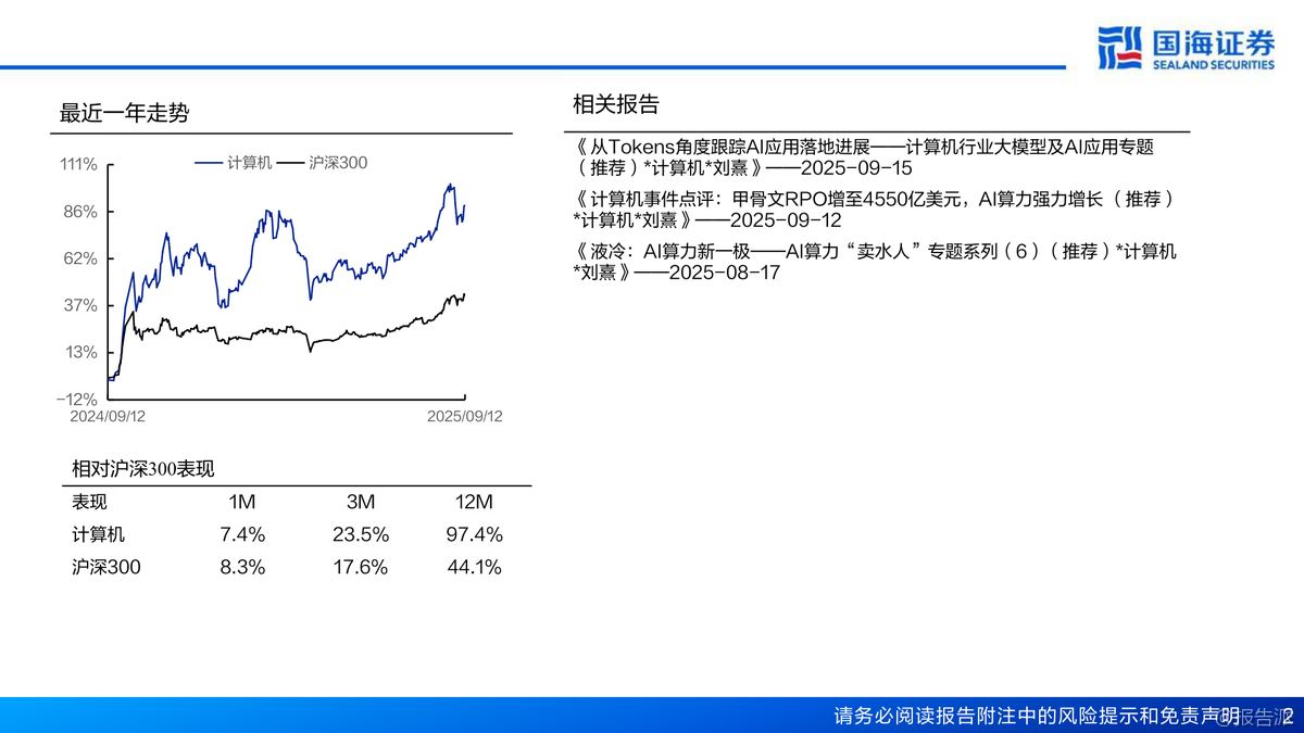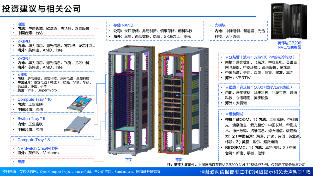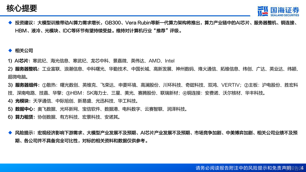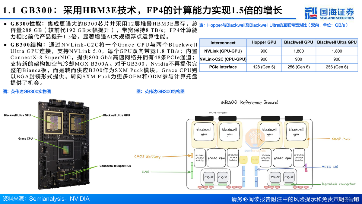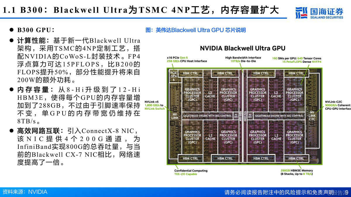 英偉達Blackwell架構(gòu)GPU性能大幅提升,GB300浮點算力達15PFLOPS,HBM3E顯存增至288GB。Rubin架構(gòu)2026年推出,性能較GB300提升3.3倍,液冷、CPO光模塊、NVLink 6.0等新技術(shù)全面升級。HBM4預(yù)計2026量產(chǎn),SK海力士主導(dǎo)市場。AI算力產(chǎn)業(yè)鏈從芯片到IDC多環(huán)節(jié)受益,行業(yè)維持推薦評級。 出品方:國海證券 發(fā)布時間:2025年 文檔頁數(shù):53頁 |
