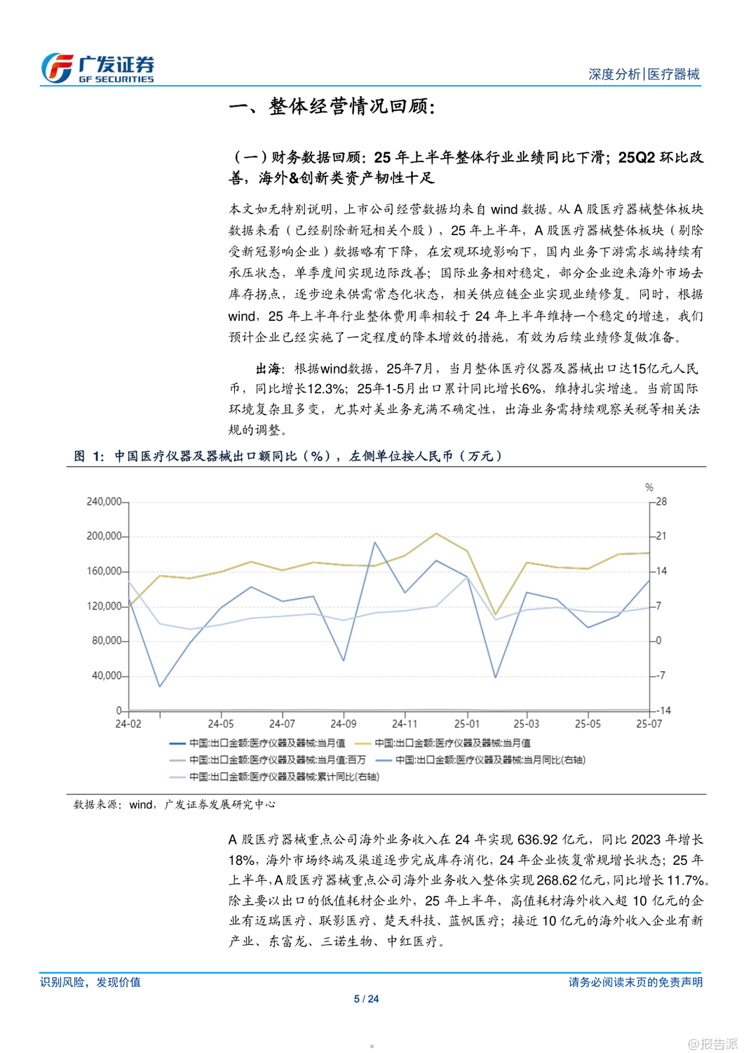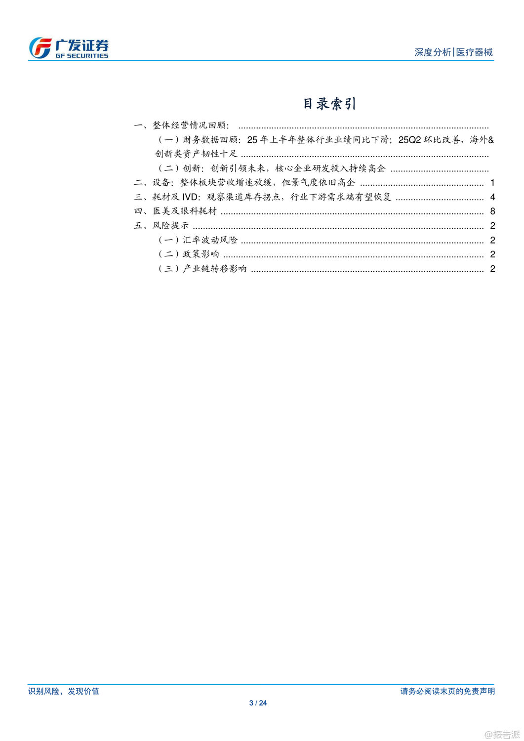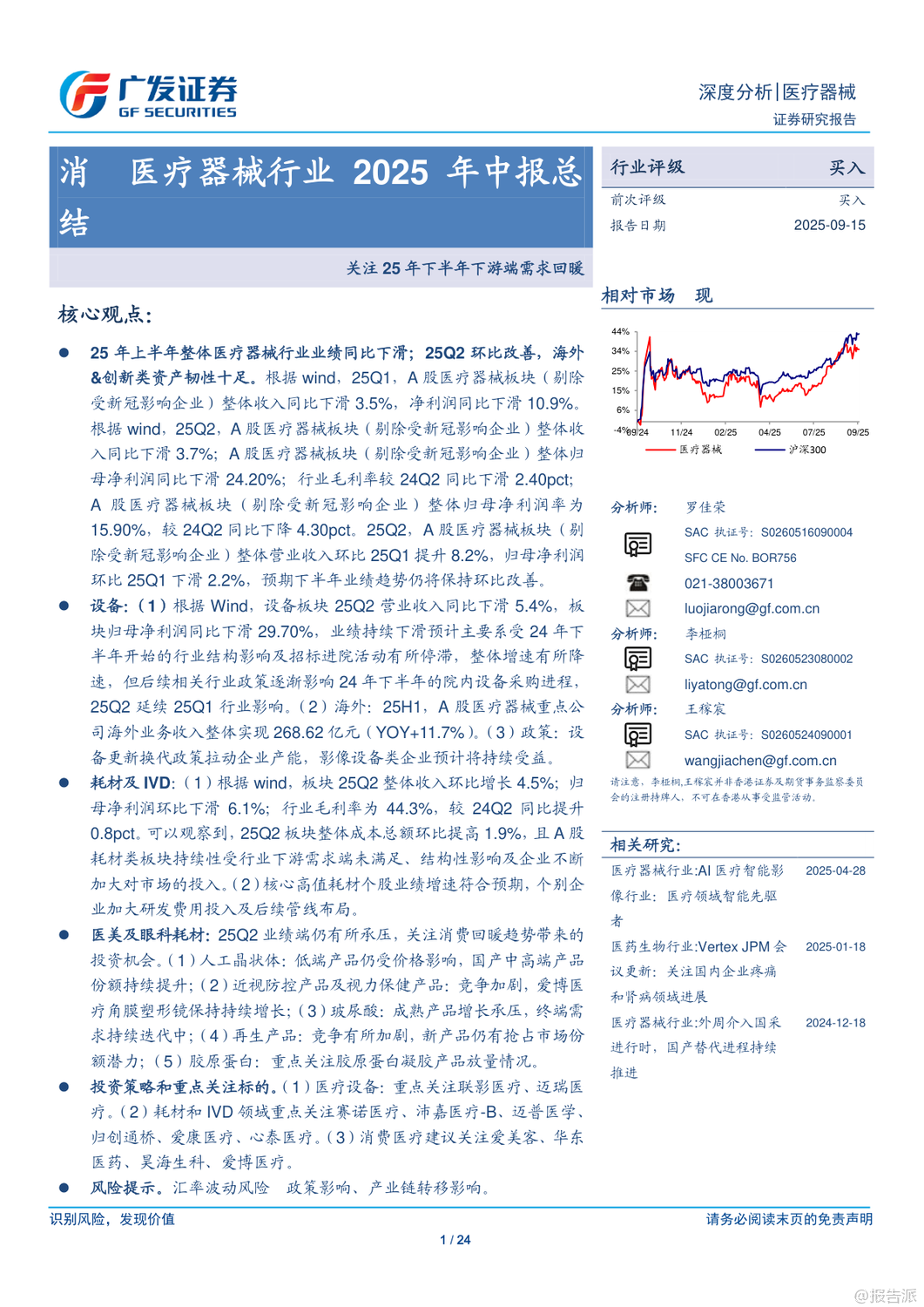 2025年上半年,消費(fèi)醫(yī)療器械行業(yè)整體業(yè)績同比下滑,但Q2環(huán)比改善,海外與創(chuàng)新類資產(chǎn)表現(xiàn)韌性十足。設(shè)備板塊受招標(biāo)放緩影響,營收下滑;耗材及IVD板塊毛利率提升,需求逐步回暖。醫(yī)美與眼科耗材承壓,玻尿酸、再生類產(chǎn)品增長乏力,膠原蛋白成為新亮點。投資建議關(guān)注邁瑞醫(yī)療、聯(lián)影醫(yī)療、愛美客等龍頭公司。行業(yè)面臨匯率波動、政策調(diào)整及產(chǎn)業(yè)鏈轉(zhuǎn)移風(fēng)險。 出品方:廣發(fā)證券 發(fā)布時間:2025年 文檔頁數(shù):24頁 |