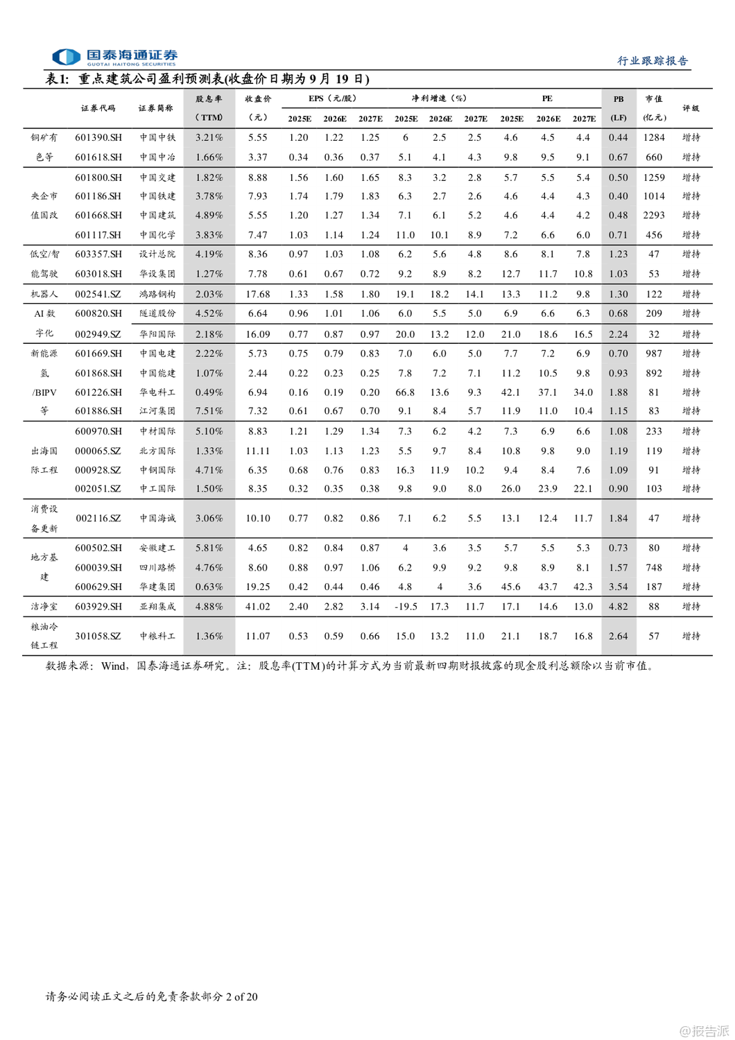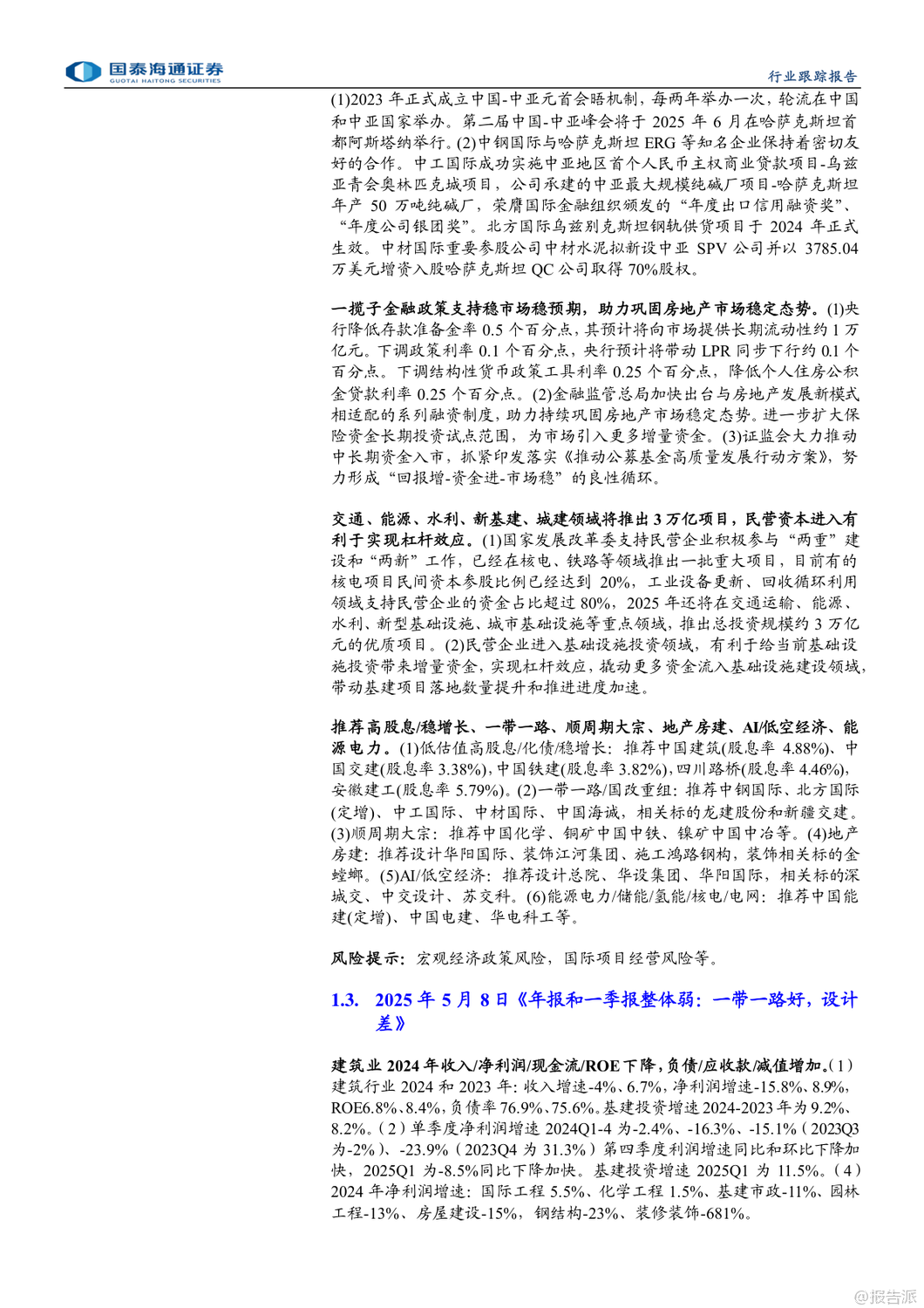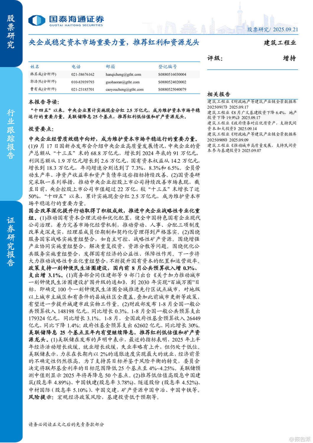 2025年,央企成了資本市場(chǎng)的壓艙石。 這可不是吹的——國(guó)新辦發(fā)布會(huì)上公布的數(shù)據(jù)實(shí)打?qū)崳褐醒肫髽I(yè)資產(chǎn)總額從“十三五”末的68.8萬(wàn)億漲到了2024年底的91萬(wàn)億,利潤(rùn)總額也從1.9萬(wàn)億干到了2.6萬(wàn)億。 國(guó)有資本權(quán)益更是突破18萬(wàn)億大關(guān)。 更狠的是,“十四五”以來(lái),央企累計(jì)現(xiàn)金分紅高達(dá)2.5萬(wàn)億元,妥妥的“國(guó)家隊(duì)發(fā)紅包”。 這種穩(wěn)扎穩(wěn)打的經(jīng)營(yíng)質(zhì)量,讓央企控股上市公司市值突破22萬(wàn)億,比“十三五”末漲了快50%。 你說(shuō)這是不是定海神針?尤其是在美聯(lián)儲(chǔ)都開(kāi)始降息25個(gè)基點(diǎn)的大背景下,全球資本都在找安全又有穩(wěn)定回報(bào)的地方。 這時(shí)候,低估值、高股息的央企龍頭,比如中國(guó)建筑(股息率接近5%)、中國(guó)鐵建、中材國(guó)際這些,簡(jiǎn)直就是香餑餑。 而且,政策也在發(fā)力。 商務(wù)部等9部門(mén)聯(lián)手推動(dòng)“一刻鐘便民生活圈”,目標(biāo)2030年實(shí)現(xiàn)“百城萬(wàn)圈”,這背后是巨大的城建和市政工程需求。 今年前8個(gè)月,全國(guó)財(cái)政支出同比增長(zhǎng)3.1%,政府性基金支出更是猛增30%,說(shuō)明錢(qián)確實(shí)開(kāi)始動(dòng)起來(lái)了。 發(fā)改委還說(shuō)要在交通、能源、水利等領(lǐng)域推出約3萬(wàn)億的優(yōu)質(zhì)項(xiàng)目,歡迎民間資本一起玩,搞不好又能撬動(dòng)一大波投資。 另一邊,國(guó)際舞臺(tái)也沒(méi)閑著。 中國(guó)-中亞合作持續(xù)推進(jìn),中鋼國(guó)際、中工國(guó)際這些企業(yè)在海外接項(xiàng)目接到手軟,像哈薩克斯坦的純堿廠(chǎng)、烏茲別克斯坦的鋼軌供貨,都是實(shí)打?qū)嵉挠唵巍?br> 一帶一路的業(yè)績(jī)明顯比國(guó)內(nèi)同行好看,成了行業(yè)里的“優(yōu)等生”。 當(dāng)然,挑戰(zhàn)也有。 去年整個(gè)建筑行業(yè)凈利潤(rùn)下滑,八家建筑央企2024年凈利潤(rùn)平均增速是-11.7%,今年一季度也還在負(fù)增長(zhǎng)。 但有意思的是,市場(chǎng)更看重的是未來(lái)現(xiàn)金流和分紅能力。 所以你看,哪怕利潤(rùn)暫時(shí)承壓,只要資產(chǎn)扎實(shí)、分紅穩(wěn)定,股價(jià)就有支撐。 總的來(lái)說(shuō),2025年的建筑行業(yè),不是拼誰(shuí)增長(zhǎng)最快,而是拼誰(shuí)活得最穩(wěn)。 央企憑借強(qiáng)大的資源調(diào)配能力和政策支持,正在成為低風(fēng)險(xiǎn)偏好資金的首選。 如果你不想追漲殺跌,又想拿點(diǎn)穩(wěn)穩(wěn)的幸福,那這些“悶聲發(fā)財(cái)”的央企巨頭,或許真的值得放進(jìn)你的觀(guān)察名單里。 畢竟,在不確定的時(shí)代,確定性本身就是最大的紅利。 出品方:國(guó)泰海通 發(fā)布時(shí)間:2025年 |