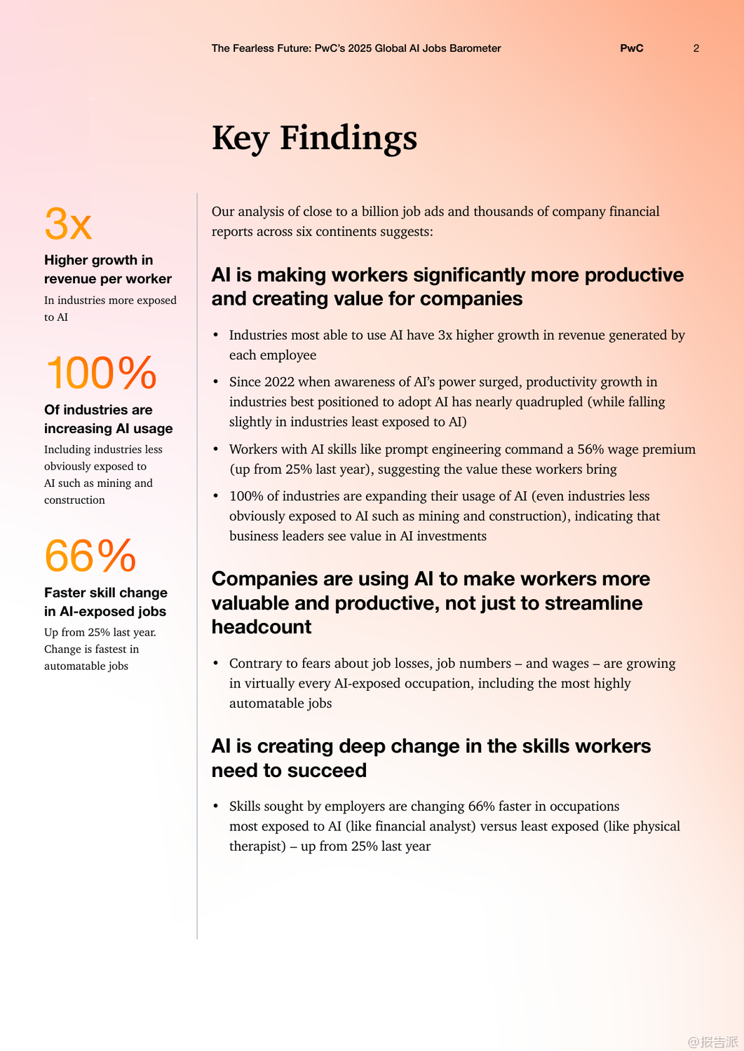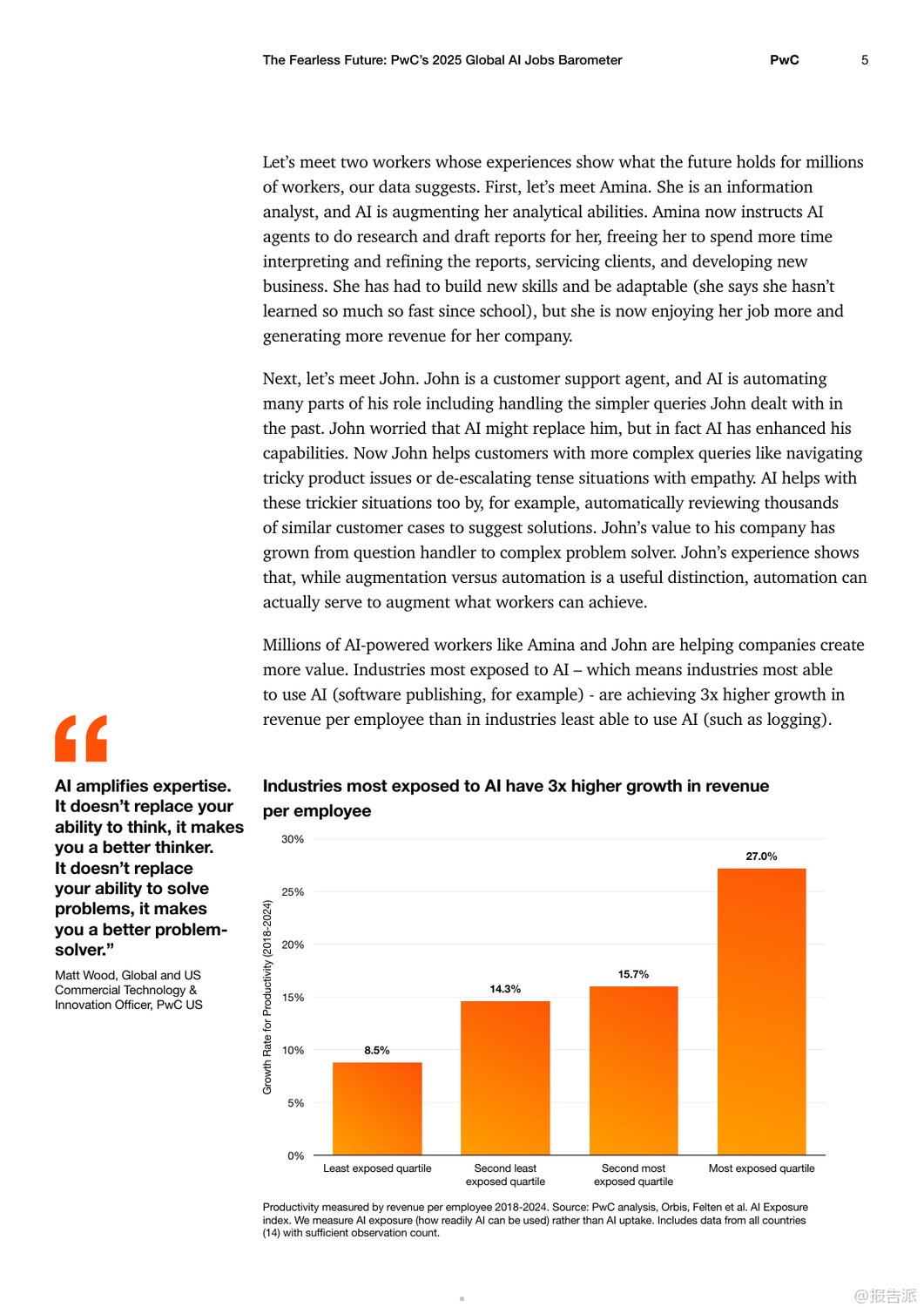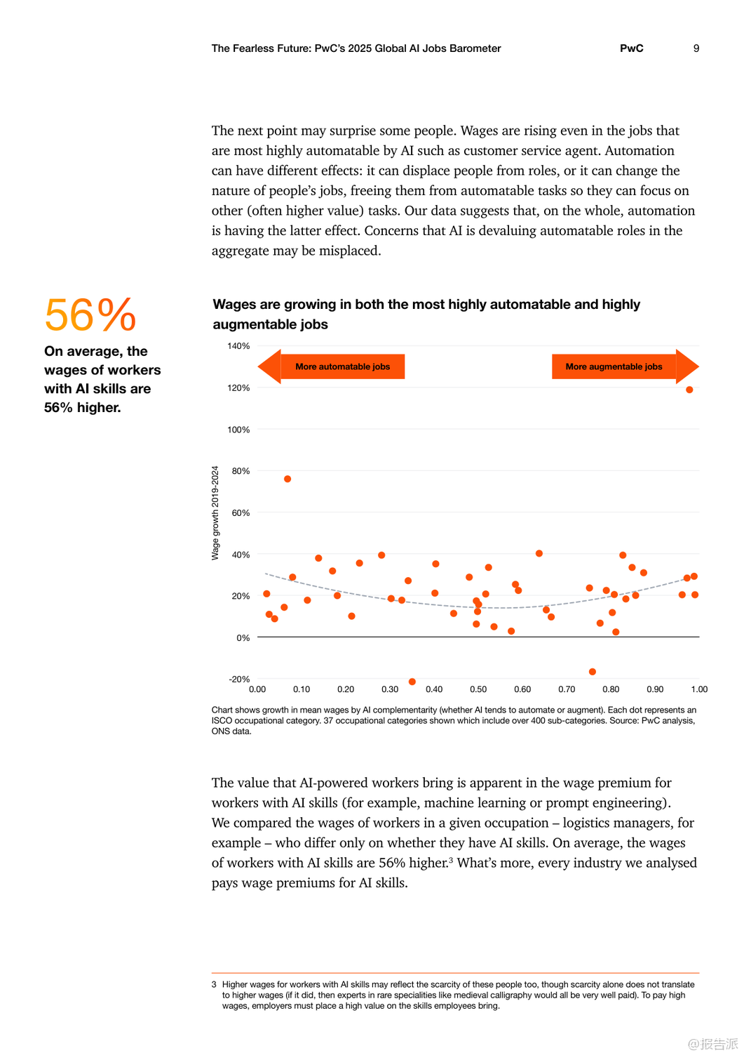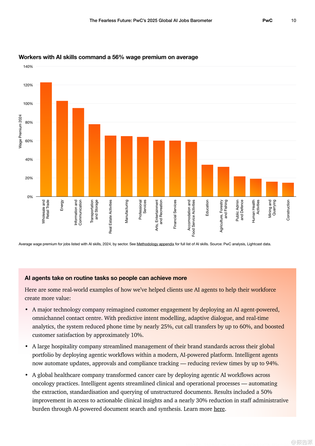 普華永道(PwC)發(fā)布的《2025年全球人工智能就業(yè)晴雨表》基于近十億條職位招聘信息及數(shù)千份企業(yè)財務(wù)報告,深入剖析了人工智能對全球就業(yè)市場的影響。 研究發(fā)現(xiàn),AI正在顯著提升員工生產(chǎn)力,并為企業(yè)創(chuàng)造真實價值。 在最能利用AI的行業(yè)中,每位員工帶來的收入增長率是AI應(yīng)用較少行業(yè)的3倍,自2022年ChatGPT引爆AI熱潮以來,這些行業(yè)的生產(chǎn)率增長幾乎翻了兩番,而低暴露行業(yè)則略有下降,顯示出AI已從技術(shù)概念轉(zhuǎn)化為實際經(jīng)濟動力。 與普遍擔(dān)憂AI導(dǎo)致失業(yè)不同,報告指出,幾乎所有受AI影響的職業(yè)崗位數(shù)量和薪資都在增長,包括那些高度可自動化的工作如客服、數(shù)據(jù)錄入等。 AI并未取代人類,而是將員工從重復(fù)性任務(wù)中解放出來,使其專注于更高價值的復(fù)雜問題解決、客戶關(guān)系維護和創(chuàng)新工作。 例如,一位客戶支持人員John在AI處理簡單查詢后,得以專注于解決棘手問題和情緒安撫,其角色從“問題處理者”升級為“復(fù)雜問題解決專家”,個人價值和公司貢獻均大幅提升。 技能需求正經(jīng)歷前所未有的快速變革。 在AI高度暴露的職業(yè)中,雇主所需技能的變化速度比低暴露職業(yè)快66%,遠超去年的25%。 這表明AI驅(qū)動的技能重構(gòu)正在加速。 同時,對正式學(xué)位的要求在下降,特別是在AI相關(guān)領(lǐng)域,企業(yè)更看重實際能力而非學(xué)歷背景,這為更多人提供了平等機會。 掌握AI技能,如提示工程(prompt engineering),平均可帶來56%的薪資溢價,較去年大幅上升。 報告強調(diào),企業(yè)應(yīng)將AI視為增長戰(zhàn)略而非單純的效率工具。 只用于裁員的企業(yè)可能錯失開拓新市場、創(chuàng)造新收入的巨大機遇。 真正的價值在于“企業(yè)級轉(zhuǎn)型”,即利用AI代理(Agentic AI)賦能員工,實現(xiàn)跨職能協(xié)作與創(chuàng)新。 PwC建議領(lǐng)導(dǎo)者需繪制清晰的技能圖譜,投資于員工再培訓(xùn),并建立組織內(nèi)外的信任,確保AI的負責(zé)任部署。 一個關(guān)鍵發(fā)現(xiàn)是,自動化并非削弱崗位,反而在“升級”它們。 即使是“可自動化”的工作,其工資和招聘需求也在同步增長,說明AI正在重塑而非消除這些角色。 此外,女性在AI暴露型工作中占比更高,面臨更大機遇與挑戰(zhàn),需加快AI技能學(xué)習(xí)以把握未來。 總之,AI革命的早期證據(jù)顯示,它正在增強人類價值,而非替代。 未來的關(guān)鍵不在于預(yù)測,而在于設(shè)計——通過明智的投資、政策和領(lǐng)導(dǎo)力,引導(dǎo)AI創(chuàng)造更多高質(zhì)量就業(yè),推動共享繁榮,邁向一個“無所畏懼的未來”。 出品方:普華永道 發(fā)布時間:2025年 |