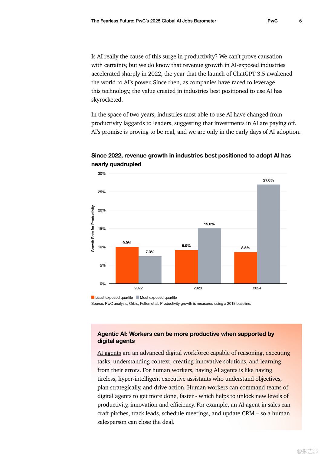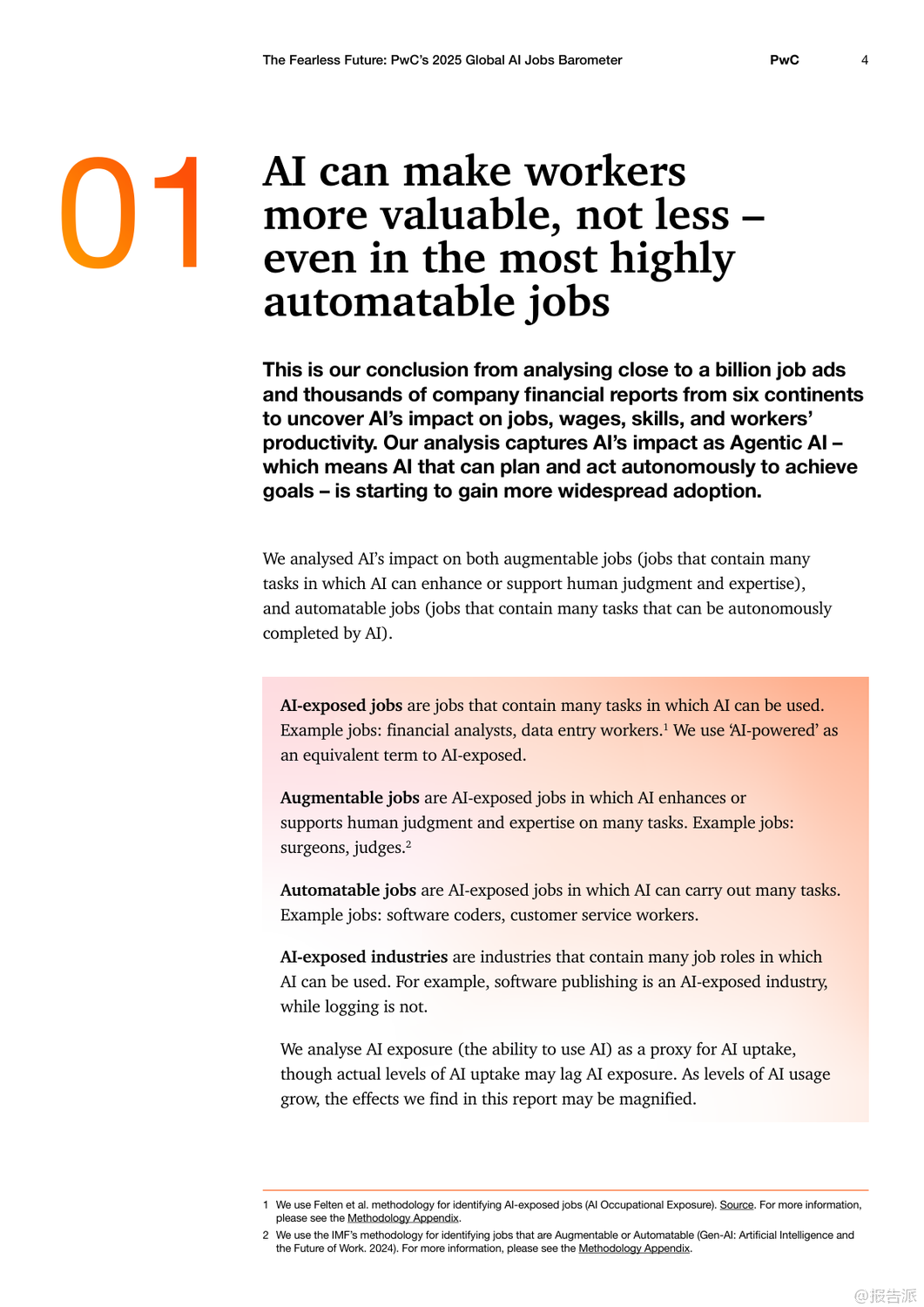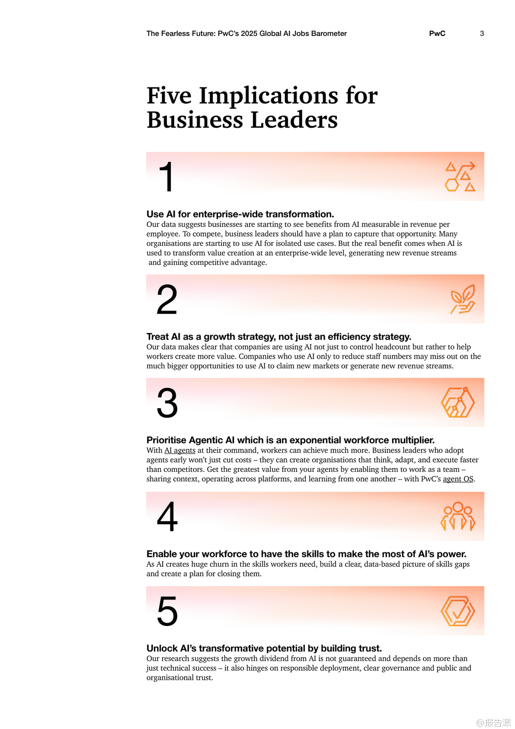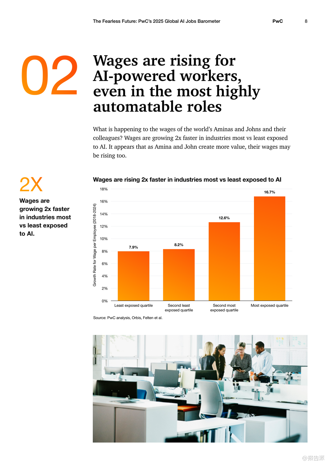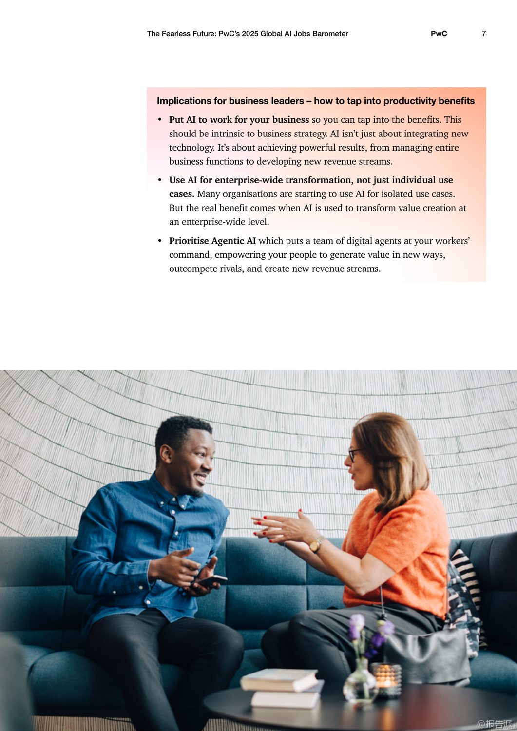 普華永道(PwC)發(fā)布的《2025年全球人工智能就業(yè)晴雨表》基于近十億條職位招聘信息及數(shù)千份企業(yè)財務(wù)報告,深入剖析了人工智能對全球就業(yè)市場的影響。 研究發(fā)現(xiàn),AI正在顯著提升員工生產(chǎn)力,并為企業(yè)創(chuàng)造真實價值。 在最能利用AI的行業(yè)中,每位員工帶來的收入增長率是AI應(yīng)用較少行業(yè)的3倍,自2022年ChatGPT引爆AI熱潮以來,這些行業(yè)的生產(chǎn)率增長幾乎翻了兩番,而低暴露行業(yè)則略有下降,顯示出AI已從技術(shù)概念轉(zhuǎn)化為實際經(jīng)濟動力。 與普遍擔(dān)憂AI導(dǎo)致失業(yè)不同,報告指出,幾乎所有受AI影響的職業(yè)崗位數(shù)量和薪資都在增長,包括那些高度可自動化的工作如客服、數(shù)據(jù)錄入等。 AI并未取代人類,而是將員工從重復(fù)性任務(wù)中解放出來,使其專注于更高價值的復(fù)雜問題解決、客戶關(guān)系維護和創(chuàng)新工作。 例如,一位客戶支持人員John在AI處理簡單查詢后,得以專注于解決棘手問題和情緒安撫,其角色從“問題處理者”升級為“復(fù)雜問題解決專家”,個人價值和公司貢獻均大幅提升。 技能需求正經(jīng)歷前所未有的快速變革。 在AI高度暴露的職業(yè)中,雇主所需技能的變化速度比低暴露職業(yè)快66%,遠超去年的25%。 這表明AI驅(qū)動的技能重構(gòu)正在加速。 同時,對正式學(xué)位的要求在下降,特別是在AI相關(guān)領(lǐng)域,企業(yè)更看重實際能力而非學(xué)歷背景,這為更多人提供了平等機會。 掌握AI技能,如提示工程(prompt engineering),平均可帶來56%的薪資溢價,較去年大幅上升。 報告強調(diào),企業(yè)應(yīng)將AI視為增長戰(zhàn)略而非單純的效率工具。 只用于裁員的企業(yè)可能錯失開拓新市場、創(chuàng)造新收入的巨大機遇。 真正的價值在于“企業(yè)級轉(zhuǎn)型”,即利用AI代理(Agentic AI)賦能員工,實現(xiàn)跨職能協(xié)作與創(chuàng)新。 PwC建議領(lǐng)導(dǎo)者需繪制清晰的技能圖譜,投資于員工再培訓(xùn),并建立組織內(nèi)外的信任,確保AI的負責(zé)任部署。 一個關(guān)鍵發(fā)現(xiàn)是,自動化并非削弱崗位,反而在“升級”它們。 即使是“可自動化”的工作,其工資和招聘需求也在同步增長,說明AI正在重塑而非消除這些角色。 此外,女性在AI暴露型工作中占比更高,面臨更大機遇與挑戰(zhàn),需加快AI技能學(xué)習(xí)以把握未來。 總之,AI革命的早期證據(jù)顯示,它正在增強人類價值,而非替代。 未來的關(guān)鍵不在于預(yù)測,而在于設(shè)計——通過明智的投資、政策和領(lǐng)導(dǎo)力,引導(dǎo)AI創(chuàng)造更多高質(zhì)量就業(yè),推動共享繁榮,邁向一個“無所畏懼的未來”。 出品方:普華永道 發(fā)布時間:2025年 |