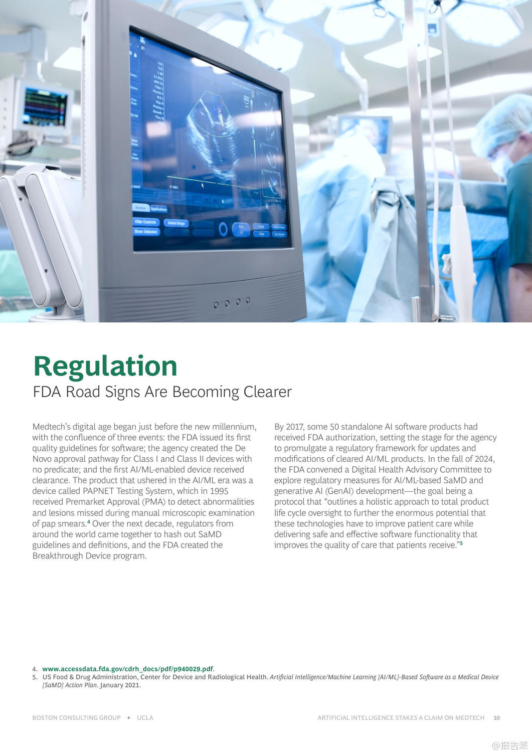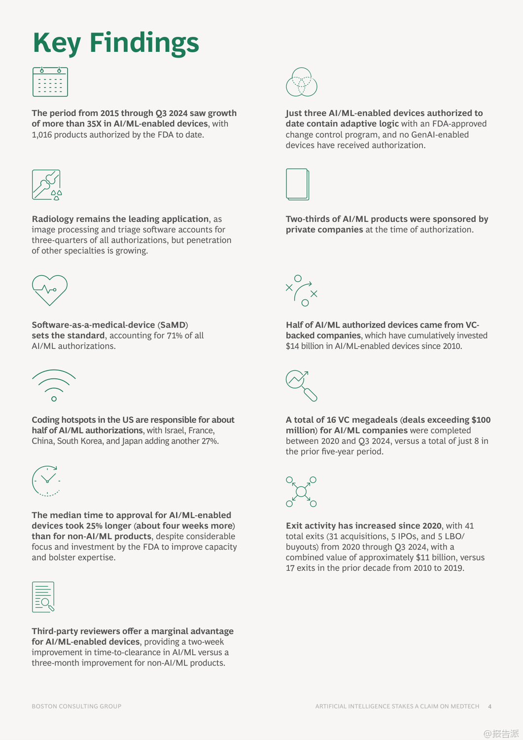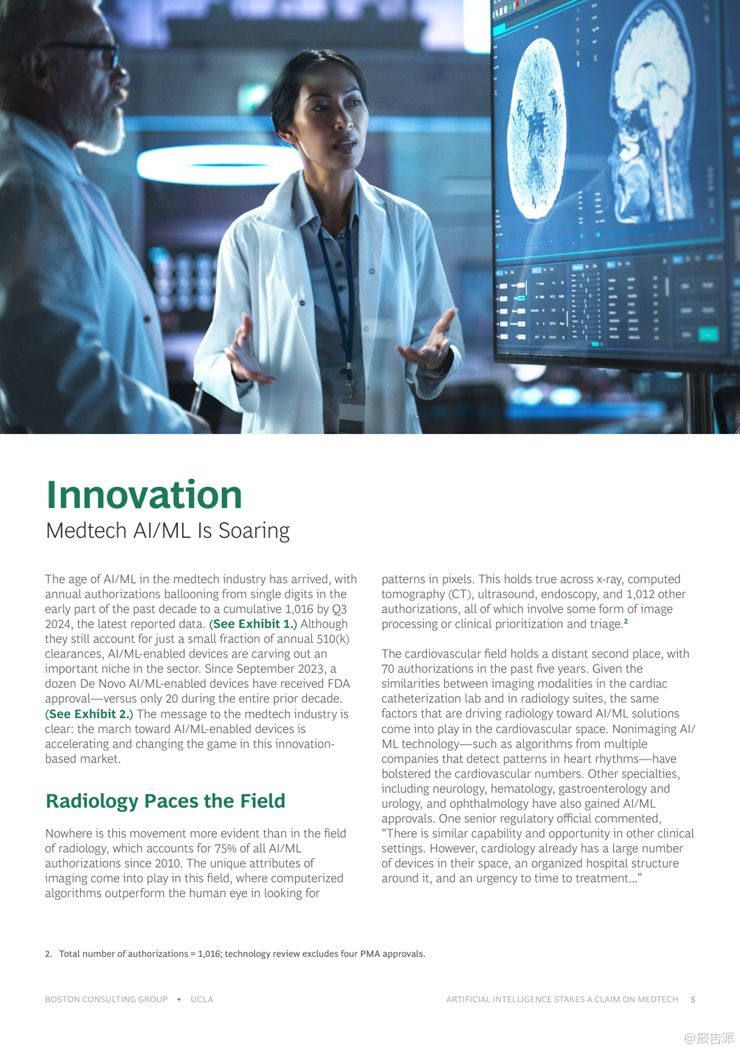 人工智能與機(jī)器學(xué)習(xí)(AI/ML)正在深刻重塑全球醫(yī)療科技(MedTech)產(chǎn)業(yè)格局。 根據(jù)波士頓咨詢集團(tuán)(BCG)與加州大學(xué)洛杉磯分校(UCLA)Biodesign中心聯(lián)合發(fā)布的最新研究報(bào)告,截至2024年第三季度,美國食品藥品監(jiān)督管理局(FDA)已累計(jì)批準(zhǔn)超過1,016項(xiàng)AI/ML醫(yī)療設(shè)備,標(biāo)志著該技術(shù)正加速邁向主流化。 這一數(shù)字相較于2015年增長了35倍以上,僅2023年一年就獲批223項(xiàng),顯示出強(qiáng)勁的發(fā)展勢頭。 從應(yīng)用領(lǐng)域來看,放射學(xué)依然是AI/ML技術(shù)的主導(dǎo)戰(zhàn)場,占據(jù)了所有授權(quán)產(chǎn)品的約75%,主要應(yīng)用于醫(yī)學(xué)影像的處理、分析與優(yōu)先級(jí)排序。 然而,心臟病學(xué)等其他??埔苍诳焖僮汾s,過去五年內(nèi)獲得了70項(xiàng)授權(quán),其成功得益于與放射學(xué)相似的成像技術(shù)和對實(shí)時(shí)心律模式識(shí)別的需求。 值得注意的是,軟件已成為AI醫(yī)療的核心形態(tài),其中“作為醫(yī)療器械的軟件”(SaMD)占比高達(dá)71%,而軟硬件結(jié)合的產(chǎn)品占剩余部分。 這表明創(chuàng)新重心已從傳統(tǒng)的嵌入式系統(tǒng)轉(zhuǎn)向獨(dú)立、靈活的算法解決方案。 在全球地理分布上,美國是絕對的領(lǐng)導(dǎo)者,貢獻(xiàn)了近49%的AI/ML設(shè)備,其中加利福尼亞州尤其是舊金山灣區(qū)是核心創(chuàng)新熱區(qū)。 美國之外,以色列(81項(xiàng))、法國、中國和韓國共同構(gòu)成了重要的創(chuàng)新集群,合計(jì)占全球總量的27%。 以色列憑借其獨(dú)特的軍事數(shù)據(jù)科學(xué)人才培養(yǎng)體系和強(qiáng)烈的醫(yī)療使命感,在國際舞臺(tái)上表現(xiàn)尤為突出。 盡管創(chuàng)新活躍,監(jiān)管審批仍面臨挑戰(zhàn)。 報(bào)告顯示,AI/ML設(shè)備的中位審批時(shí)間比非AI/ML設(shè)備長約25%(約多4周),盡管FDA已投入大量資源提升審查能力。 第三方審查機(jī)構(gòu)對標(biāo)準(zhǔn)設(shè)備的審批有顯著加速作用,但對AI/ML設(shè)備的效果有限,僅縮短約兩周,凸顯了AI審查的專業(yè)性門檻。 更關(guān)鍵的是,具備“自適應(yīng)學(xué)習(xí)”能力的設(shè)備進(jìn)展緩慢,目前僅有3款產(chǎn)品獲得FDA批準(zhǔn)的預(yù)設(shè)變更控制計(jì)劃(PCCP),生成式AI(GenAI)設(shè)備尚未有獲批案例。 資本市場的熱情是推動(dòng)發(fā)展的另一大引擎。 自2010年以來,風(fēng)險(xiǎn)投資(VC)已向該領(lǐng)域注入約140億美元,支持了387家公司。 投資趨勢顯示,資金正從早期種子輪轉(zhuǎn)向C輪和D輪等后期階段,2020年至2024年第三季度間完成了16筆超1億美元的“超級(jí)交易”。 退出活動(dòng)也十分活躍,同期發(fā)生了近60起并購、IPO和杠桿收購,總價(jià)值約110億美元,表明市場對AI醫(yī)療的長期價(jià)值充滿信心。 總體而言,AI/ML在醫(yī)療科技領(lǐng)域已站穩(wěn)腳跟,未來如何克服數(shù)據(jù)隱私、監(jiān)管協(xié)調(diào)及實(shí)現(xiàn)真正的自適應(yīng)學(xué)習(xí),將是決定其能否徹底變革醫(yī)療健康的關(guān)鍵。 出品方:BCG 發(fā)布時(shí)間:2025年 文檔頁數(shù):27頁 |