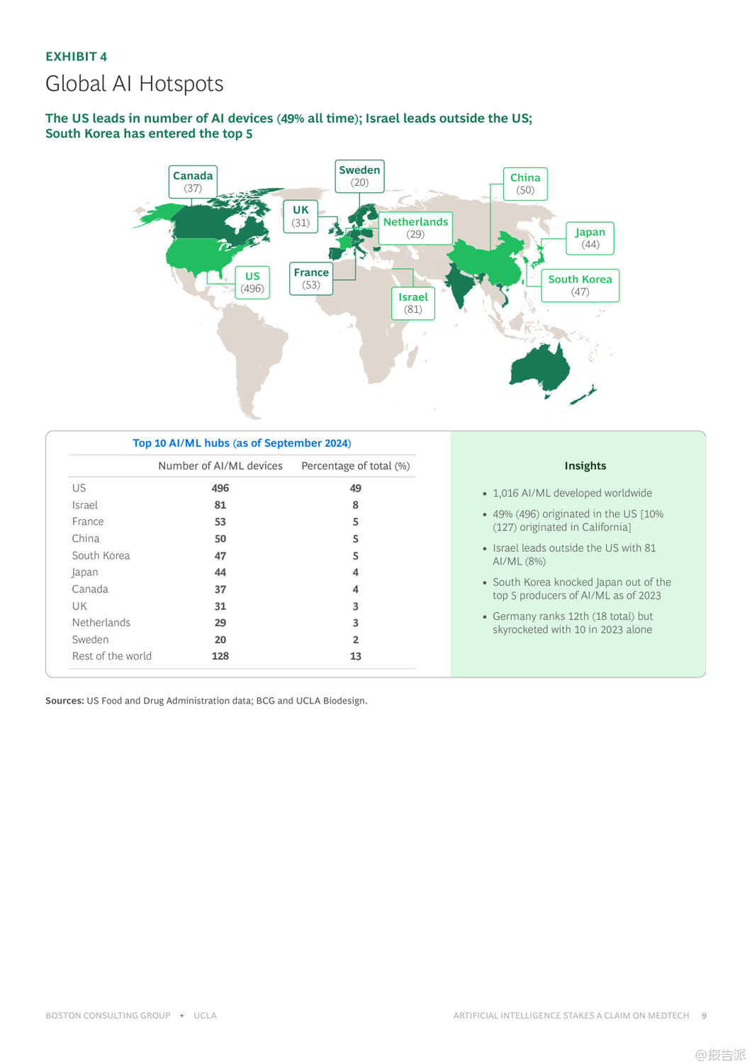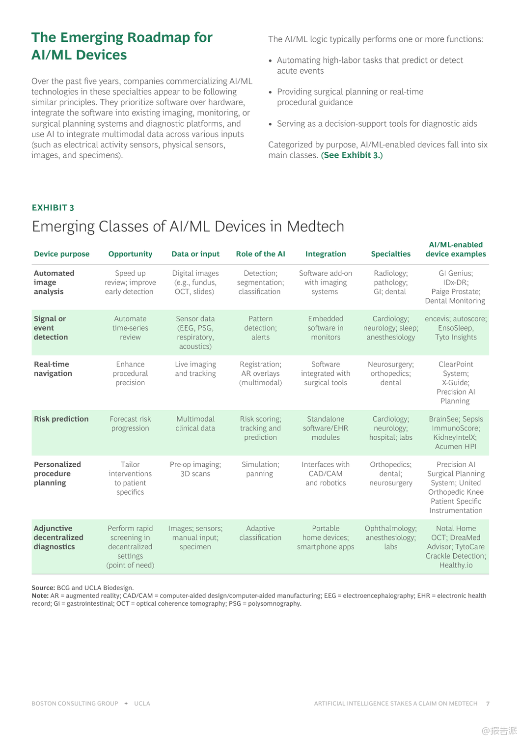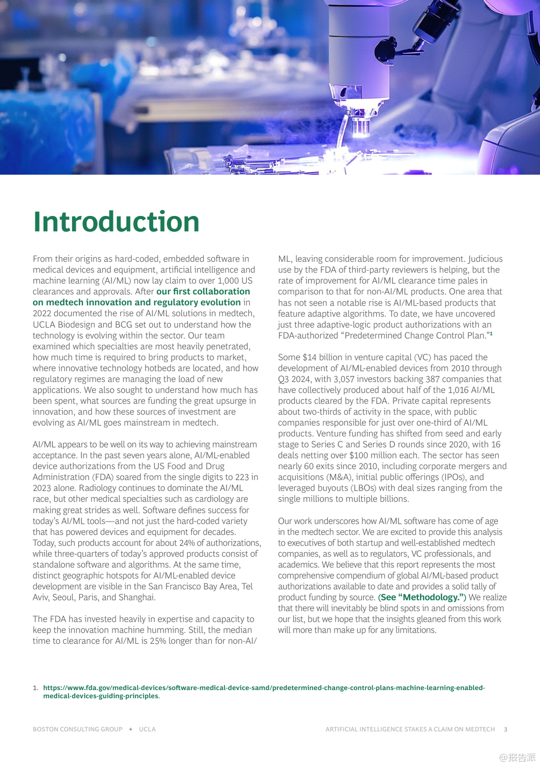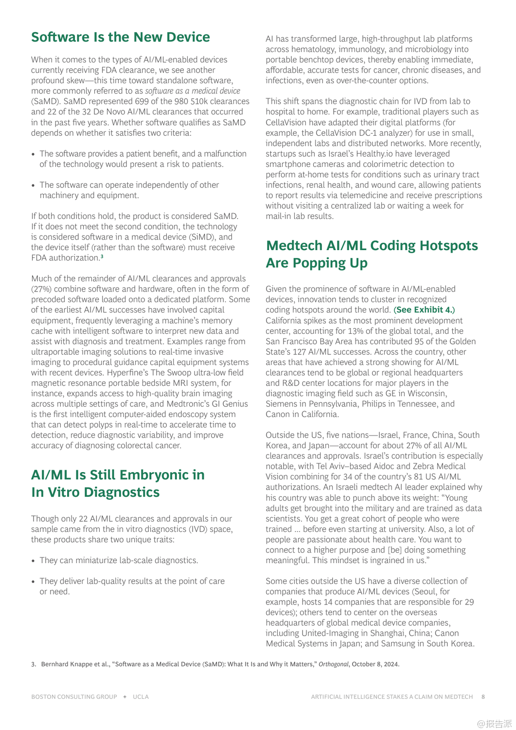 人工智能與機(jī)器學(xué)習(xí)(AI/ML)正在深刻重塑全球醫(yī)療科技(MedTech)產(chǎn)業(yè)格局。 根據(jù)波士頓咨詢集團(tuán)(BCG)與加州大學(xué)洛杉磯分校(UCLA)Biodesign中心聯(lián)合發(fā)布的最新研究報(bào)告,截至2024年第三季度,美國食品藥品監(jiān)督管理局(FDA)已累計(jì)批準(zhǔn)超過1,016項(xiàng)AI/ML醫(yī)療設(shè)備,標(biāo)志著該技術(shù)正加速邁向主流化。 這一數(shù)字相較于2015年增長了35倍以上,僅2023年一年就獲批223項(xiàng),顯示出強(qiáng)勁的發(fā)展勢頭。 從應(yīng)用領(lǐng)域來看,放射學(xué)依然是AI/ML技術(shù)的主導(dǎo)戰(zhàn)場,占據(jù)了所有授權(quán)產(chǎn)品的約75%,主要應(yīng)用于醫(yī)學(xué)影像的處理、分析與優(yōu)先級(jí)排序。 然而,心臟病學(xué)等其他??埔苍诳焖僮汾s,過去五年內(nèi)獲得了70項(xiàng)授權(quán),其成功得益于與放射學(xué)相似的成像技術(shù)和對實(shí)時(shí)心律模式識(shí)別的需求。 值得注意的是,軟件已成為AI醫(yī)療的核心形態(tài),其中“作為醫(yī)療器械的軟件”(SaMD)占比高達(dá)71%,而軟硬件結(jié)合的產(chǎn)品占剩余部分。 這表明創(chuàng)新重心已從傳統(tǒng)的嵌入式系統(tǒng)轉(zhuǎn)向獨(dú)立、靈活的算法解決方案。 在全球地理分布上,美國是絕對的領(lǐng)導(dǎo)者,貢獻(xiàn)了近49%的AI/ML設(shè)備,其中加利福尼亞州尤其是舊金山灣區(qū)是核心創(chuàng)新熱區(qū)。 美國之外,以色列(81項(xiàng))、法國、中國和韓國共同構(gòu)成了重要的創(chuàng)新集群,合計(jì)占全球總量的27%。 以色列憑借其獨(dú)特的軍事數(shù)據(jù)科學(xué)人才培養(yǎng)體系和強(qiáng)烈的醫(yī)療使命感,在國際舞臺(tái)上表現(xiàn)尤為突出。 盡管創(chuàng)新活躍,監(jiān)管審批仍面臨挑戰(zhàn)。 報(bào)告顯示,AI/ML設(shè)備的中位審批時(shí)間比非AI/ML設(shè)備長約25%(約多4周),盡管FDA已投入大量資源提升審查能力。 第三方審查機(jī)構(gòu)對標(biāo)準(zhǔn)設(shè)備的審批有顯著加速作用,但對AI/ML設(shè)備的效果有限,僅縮短約兩周,凸顯了AI審查的專業(yè)性門檻。 更關(guān)鍵的是,具備“自適應(yīng)學(xué)習(xí)”能力的設(shè)備進(jìn)展緩慢,目前僅有3款產(chǎn)品獲得FDA批準(zhǔn)的預(yù)設(shè)變更控制計(jì)劃(PCCP),生成式AI(GenAI)設(shè)備尚未有獲批案例。 資本市場的熱情是推動(dòng)發(fā)展的另一大引擎。 自2010年以來,風(fēng)險(xiǎn)投資(VC)已向該領(lǐng)域注入約140億美元,支持了387家公司。 投資趨勢顯示,資金正從早期種子輪轉(zhuǎn)向C輪和D輪等后期階段,2020年至2024年第三季度間完成了16筆超1億美元的“超級(jí)交易”。 退出活動(dòng)也十分活躍,同期發(fā)生了近60起并購、IPO和杠桿收購,總價(jià)值約110億美元,表明市場對AI醫(yī)療的長期價(jià)值充滿信心。 總體而言,AI/ML在醫(yī)療科技領(lǐng)域已站穩(wěn)腳跟,未來如何克服數(shù)據(jù)隱私、監(jiān)管協(xié)調(diào)及實(shí)現(xiàn)真正的自適應(yīng)學(xué)習(xí),將是決定其能否徹底變革醫(yī)療健康的關(guān)鍵。 出品方:BCG 發(fā)布時(shí)間:2025年 文檔頁數(shù):27頁 |