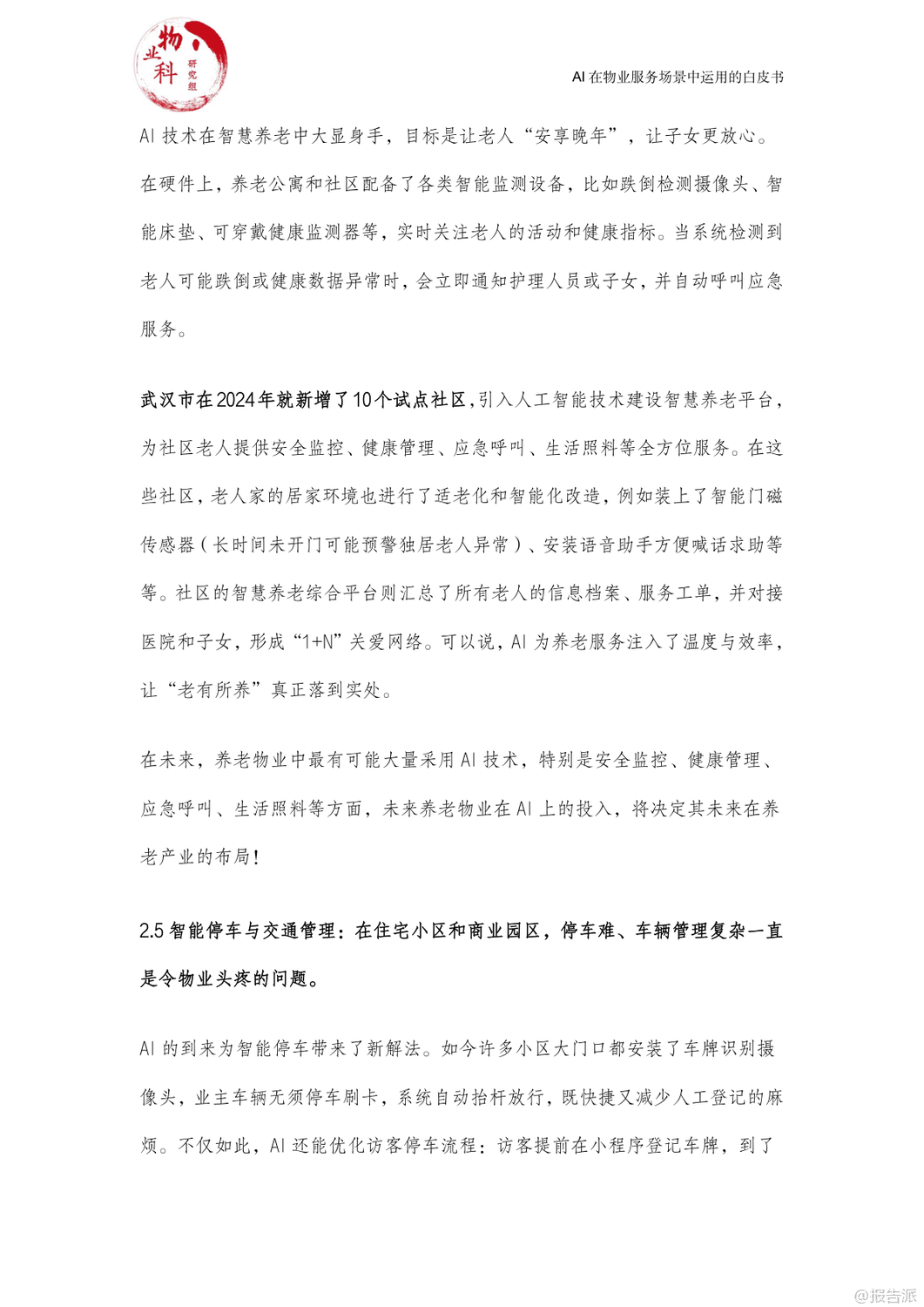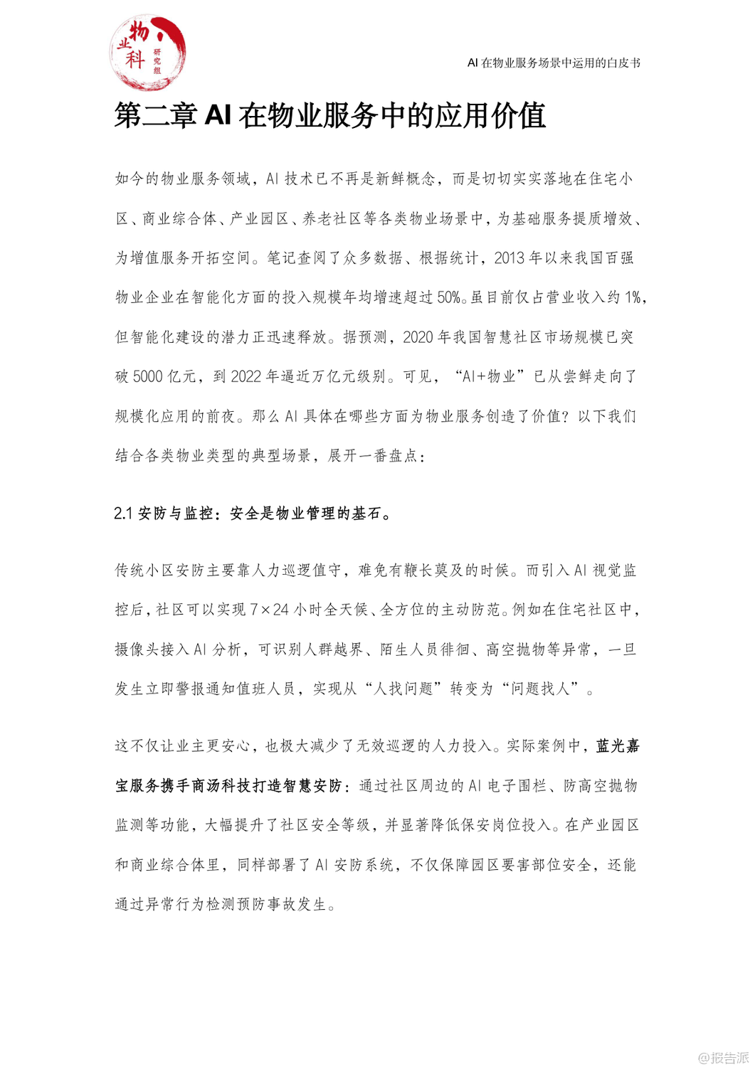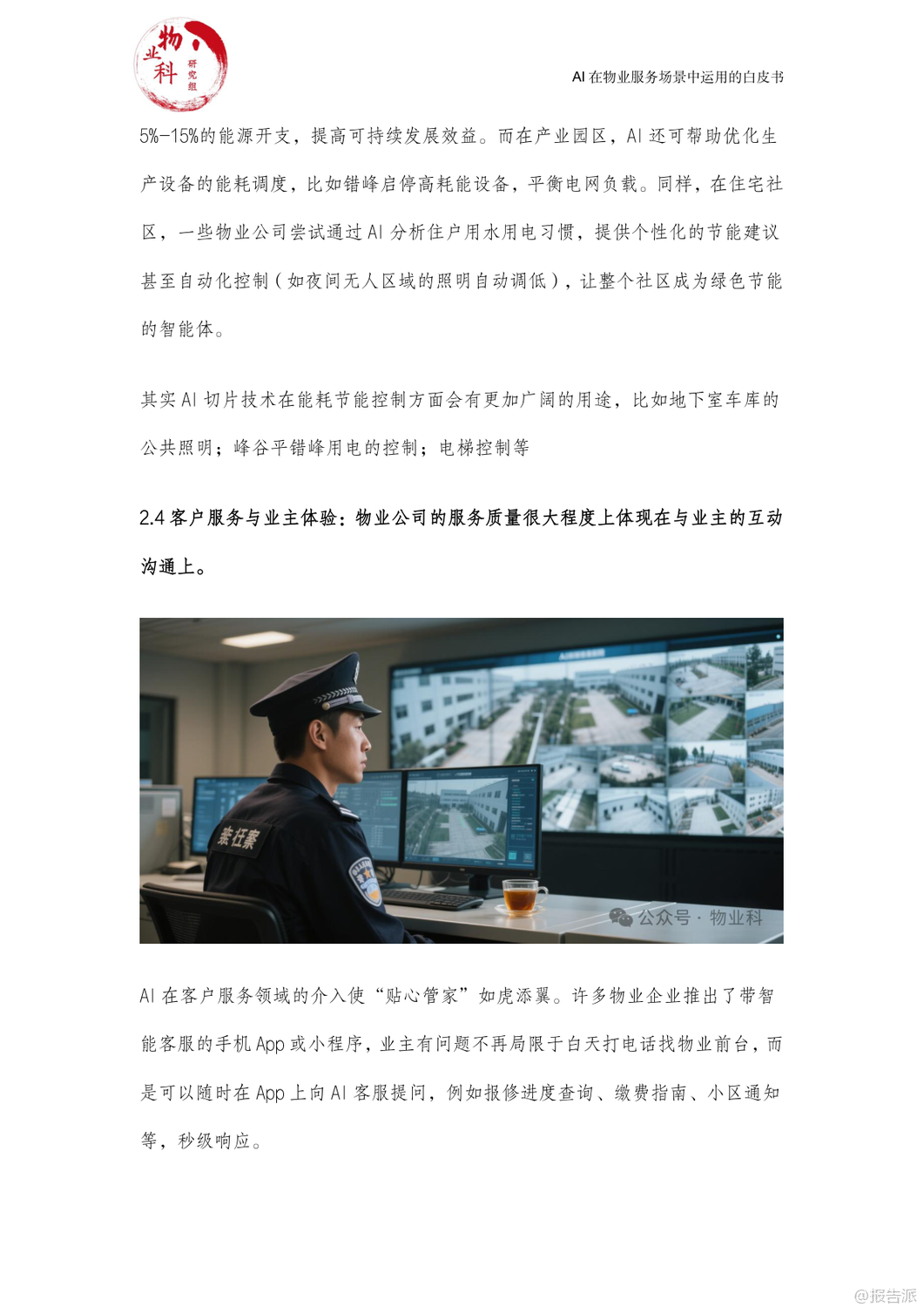 當人工智能的浪潮席卷各行各業(yè),傳統(tǒng)物業(yè)管理這一看似“接地氣”的行業(yè)也迎來了深刻的智能化變革。 從24小時無休的智能攝像頭,到隨時響應的AI客服,AI正悄然重塑物業(yè)服務的每一個細節(jié)。 這份由中物科發(fā)布的《2025年AI在物業(yè)場景中運用的白皮書》系統(tǒng)梳理了AI技術(shù)在物業(yè)領域的應用價值、未來趨勢、真實案例與落地挑戰(zhàn),為行業(yè)描繪了一幅清晰的智慧轉(zhuǎn)型藍圖。 白皮書指出,AI在物業(yè)領域的應用已從概念走向規(guī)?;涞?。 在安防監(jiān)控方面,AI視覺技術(shù)能實現(xiàn)7×24小時主動防范,通過識別越界、徘徊、高空拋物等異常行為,將“人找問題”變?yōu)椤皢栴}找人”,顯著提升安全性并降低人力投入。 藍光嘉寶與商湯科技的合作案例顯示,智慧安防系統(tǒng)不僅提升了安全等級,還實現(xiàn)了安保成本的顯著下降。 在設備維護上,AI驅(qū)動的預測性維護正取代傳統(tǒng)的“壞了再修”模式。 通過物聯(lián)網(wǎng)傳感器和AI算法分析電梯、水泵等設備的運行數(shù)據(jù),可提前預警故障,避免突發(fā)事件。 萬科的萬物云平臺正是這一理念的實踐者,通過集中管理全國項目的數(shù)據(jù),實現(xiàn)設備健康狀態(tài)的智能判斷與主動干預。 能源管理是另一大價值洼地。 AI系統(tǒng)通過分析樓宇的用電、用水、人流和天氣數(shù)據(jù),動態(tài)調(diào)節(jié)空調(diào)、照明等設備,實現(xiàn)節(jié)能5%-15%。 這不僅降低了運營成本,也響應了國家“雙碳”戰(zhàn)略。 此外,AI在客戶服務上的表現(xiàn)尤為亮眼,24小時在線的AI客服機器人能秒級響應業(yè)主的報修、繳費等咨詢,解放了大量一線人力,提升了服務體驗。 碧桂園服務已上線語音機器人,處理簡單事務游刃有余。 智慧養(yǎng)老是AI應用最具溫度的場景。 武漢的試點社區(qū)通過智能傳感器、健康監(jiān)測設備和5G遠程醫(yī)療,構(gòu)建起“1+N”關愛網(wǎng)絡,對獨居老人的跌倒、健康異常等情況實現(xiàn)自動預警和應急響應,讓科技真正服務于社會剛需。 然而,AI的落地并非坦途。 白皮書也直面了四大挑戰(zhàn):一是“數(shù)據(jù)孤島”,不同系統(tǒng)間難以互通;二是高昂的技術(shù)成本與不確定的ROI讓中小企業(yè)望而卻步;三是缺乏既懂物業(yè)又懂AI的復合型人才;四是數(shù)據(jù)安全與隱私泄露的風險。 對此,報告提出了應對策略:通過平臺化集成打破數(shù)據(jù)壁壘;采用“鳳凰魔盒”類邊緣計算設備,低成本改造老舊社區(qū);與科技公司合作分攤成本;加強員工技能培訓,實現(xiàn)人機協(xié)同;并通過透明化管理和技術(shù)加密保障數(shù)據(jù)安全。 總體而言,AI正推動物業(yè)行業(yè)從“人海戰(zhàn)術(shù)”向“智慧科技”轉(zhuǎn)型。 未來,物業(yè)的角色將從“房屋管家”升級為“社區(qū)生活運營商”,通過平臺化、智能化和人性化服務,構(gòu)建安全、便捷、溫馨的智慧社區(qū)。 這場變革不僅是技術(shù)的革新,更是管理模式與人文關懷的深度融合。 出品方:中物科 發(fā)布時間:2025年 |