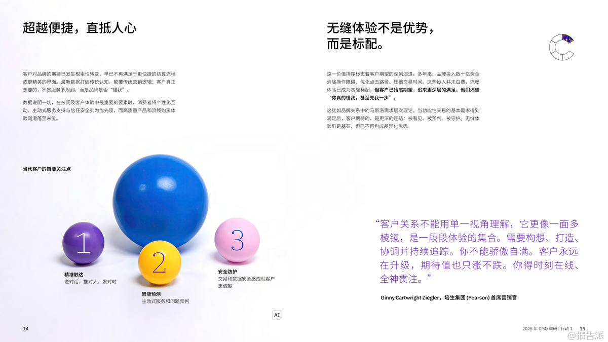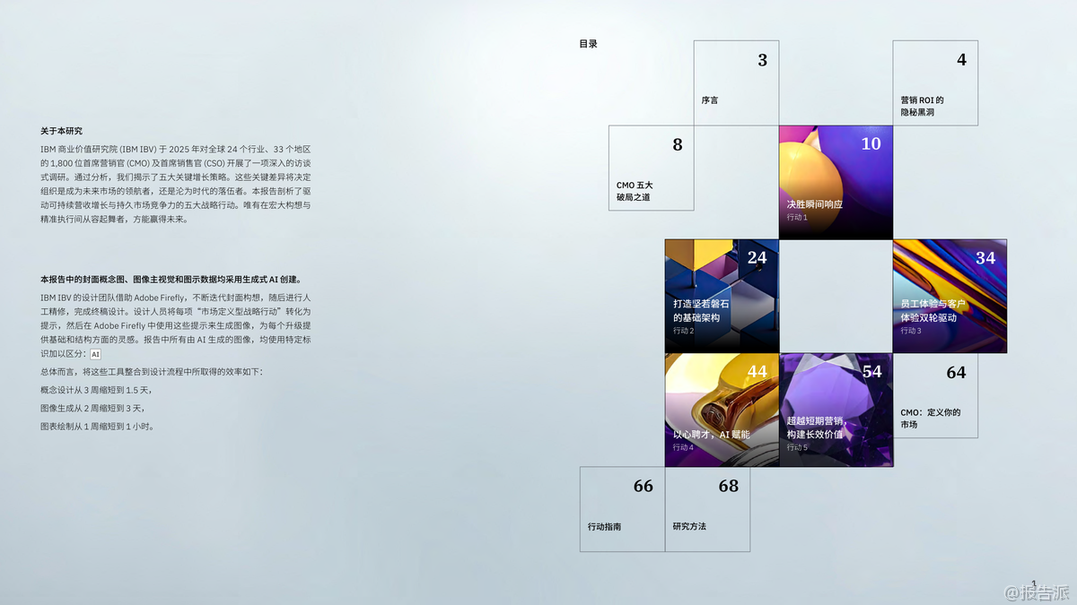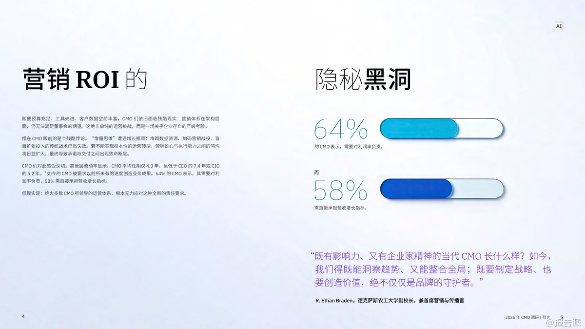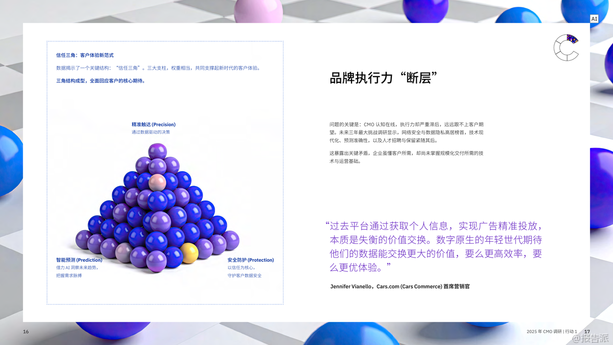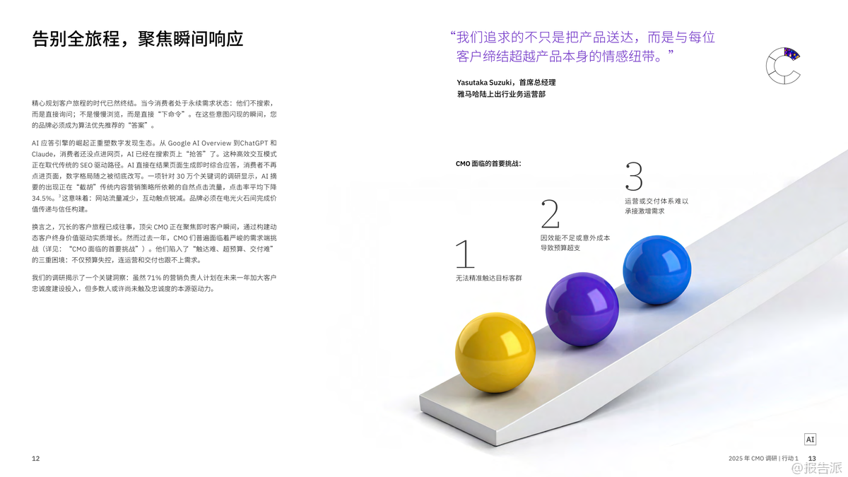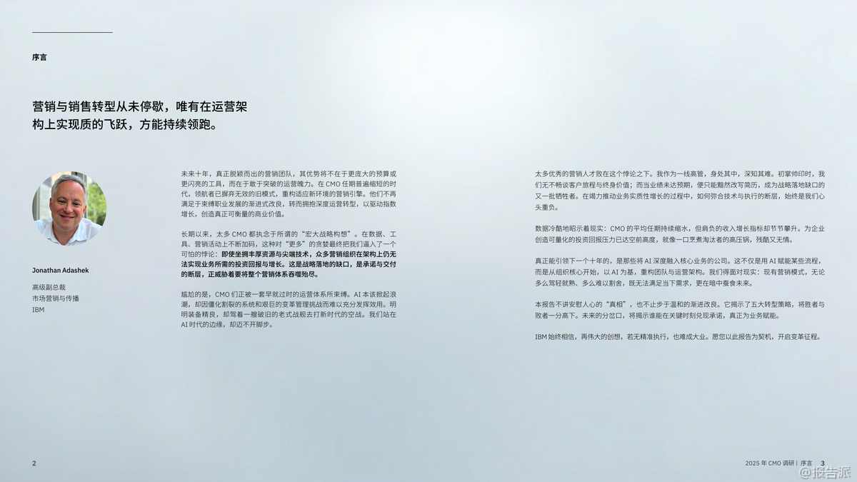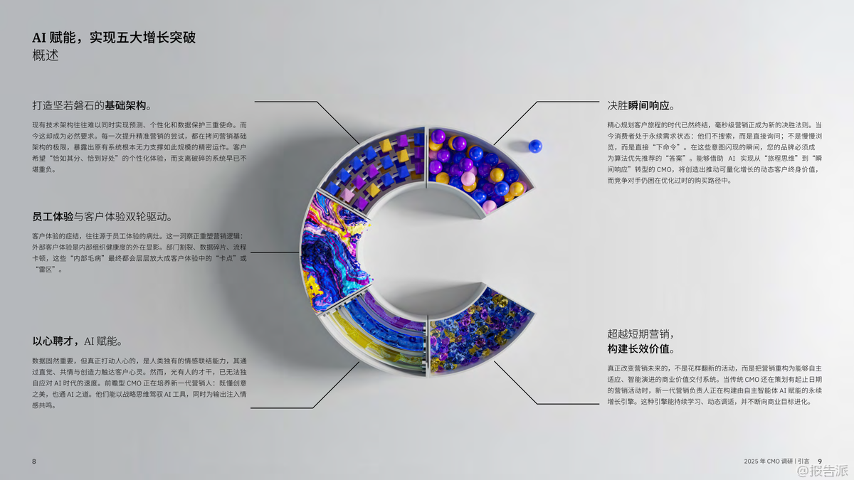 在AI技術(shù)迅猛發(fā)展的背景下,IBM商業(yè)價(jià)值研究院于2025年發(fā)布了《CMO革命:AI賦能,實(shí)現(xiàn)五大增長(zhǎng)突破》報(bào)告,通過(guò)對(duì)全球24個(gè)行業(yè)、33個(gè)地區(qū)的1800位首席營(yíng)銷官(CMO)及首席銷售官(CSO)的深度調(diào)研,揭示了未來(lái)營(yíng)銷增長(zhǎng)的五大關(guān)鍵戰(zhàn)略。 這份報(bào)告不僅是一次趨勢(shì)洞察,更是一份指導(dǎo)企業(yè)從傳統(tǒng)營(yíng)銷向智能增長(zhǎng)躍遷的操作手冊(cè)。 報(bào)告開(kāi)篇即指出,當(dāng)前CMO面臨前所未有的挑戰(zhàn):平均任期僅4.3年,卻要承擔(dān)更高的營(yíng)收與利潤(rùn)指標(biāo)。 64%的CMO需對(duì)利潤(rùn)率負(fù)責(zé),58%需直接推動(dòng)收入增長(zhǎng)。 然而,大多數(shù)企業(yè)的營(yíng)銷體系仍停留在舊有架構(gòu)中,陷入“戰(zhàn)略有余、執(zhí)行乏力”的困境。 數(shù)據(jù)、工具、預(yù)算不斷加碼,但ROI卻難以提升,形成了所謂的“營(yíng)銷ROI隱秘黑洞”。 在此背景下,IBM提出五大破局之道,構(gòu)成新時(shí)代CMO的增長(zhǎng)引擎。 第一,決勝“瞬間響應(yīng)”。 隨著AI應(yīng)答引擎(如Google AI Overview、ChatGPT)的普及,消費(fèi)者不再主動(dòng)搜索,而是直接“提問(wèn)”。 品牌必須在毫秒級(jí)時(shí)間內(nèi)成為算法優(yōu)先推薦的答案。 這意味著傳統(tǒng)的客戶旅程規(guī)劃已被淘汰,取而代之的是對(duì)“關(guān)鍵觸點(diǎn)”的即時(shí)響應(yīng)能力。 第二,打造堅(jiān)若磐石的基礎(chǔ)架構(gòu)。 當(dāng)前技術(shù)系統(tǒng)普遍存在碎片化、割裂化問(wèn)題,導(dǎo)致AI項(xiàng)目難以從“試點(diǎn)”走向規(guī)?;?br> 調(diào)研顯示,僅有19%的AI試點(diǎn)實(shí)現(xiàn)預(yù)期回報(bào),25%得以擴(kuò)展。 高績(jī)效企業(yè)正通過(guò)平臺(tái)化整合,構(gòu)建一體化的技術(shù)生態(tài),實(shí)現(xiàn)數(shù)據(jù)無(wú)縫流轉(zhuǎn)與跨部門(mén)協(xié)作,從而打破“試點(diǎn)煉獄”。 第三,員工體驗(yàn)與客戶體驗(yàn)雙輪驅(qū)動(dòng)。 報(bào)告強(qiáng)調(diào),客戶體驗(yàn)的本質(zhì)是組織健康的外顯。 內(nèi)部流程割裂、數(shù)據(jù)孤島、協(xié)作不暢,最終都會(huì)轉(zhuǎn)化為客戶側(cè)的“卡點(diǎn)”。 協(xié)同高效的組織比協(xié)同不足者營(yíng)收高出1個(gè)百分點(diǎn),在140億美元體量下即意味著1.4億美元的差距。 因此,CMO的角色正在從“品牌守護(hù)者”轉(zhuǎn)變?yōu)椤皟?nèi)部變革推動(dòng)者”。 第四,以心聘才,AI賦能。 盡管AI工具廣泛應(yīng)用,但客戶已能識(shí)別出AI生成內(nèi)容的“機(jī)械感”與“乏味感”。 真正打動(dòng)人心的仍是人類的情感聯(lián)結(jié)能力。 未來(lái)營(yíng)銷人才需兼具AI駕馭力與人文洞察力,成為“情感架構(gòu)師”。 同時(shí),僅22%的企業(yè)為AI決策建立了倫理與質(zhì)量“護(hù)欄”,凸顯治理缺失的風(fēng)險(xiǎn)。 第五,超越短期營(yíng)銷,構(gòu)建長(zhǎng)效價(jià)值。 新一代CMO不再策劃有始有終的營(yíng)銷活動(dòng),而是構(gòu)建由自主智能體AI驅(qū)動(dòng)的“永續(xù)增長(zhǎng)引擎”。 這種系統(tǒng)能持續(xù)學(xué)習(xí)、動(dòng)態(tài)調(diào)適,并預(yù)測(cè)客戶需求。 與此同時(shí),隨著第三方數(shù)據(jù)萎縮,CMO正轉(zhuǎn)向第一方與零方數(shù)據(jù)建設(shè),通過(guò)直連客戶、構(gòu)建信任關(guān)系來(lái)獲取真實(shí)洞察。 總體來(lái)看,2025年的營(yíng)銷已進(jìn)入“AI重構(gòu)”階段。 勝負(fù)不再取決于預(yù)算多少或創(chuàng)意好壞,而在于是否具備系統(tǒng)性思維、組織協(xié)同力與AI深度融合能力。 CMO的使命,正從“執(zhí)行者”升維為“市場(chǎng)定義者”——用AI賦能的智能系統(tǒng),重新定義客戶關(guān)系與商業(yè)價(jià)值。 出品方:IBM 發(fā)布時(shí)間:2025年 文檔頁(yè)數(shù):73頁(yè) |
