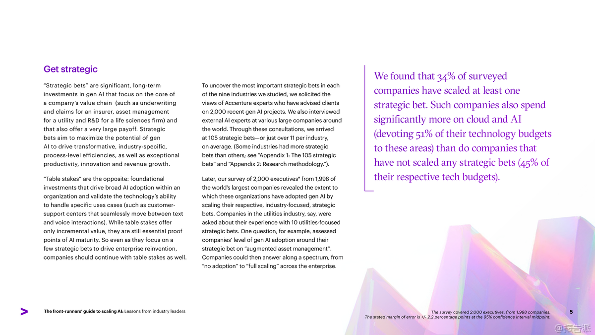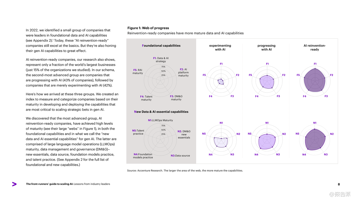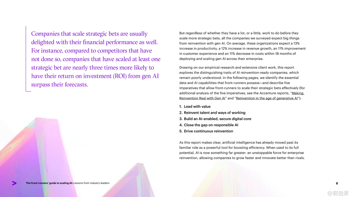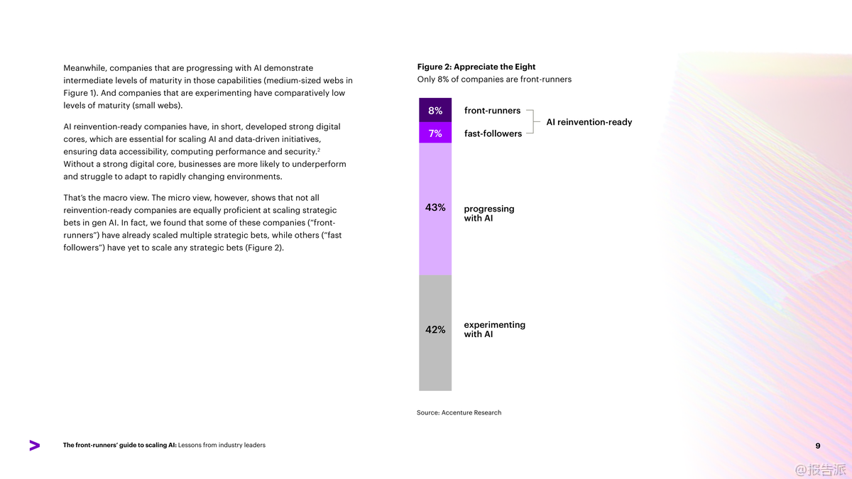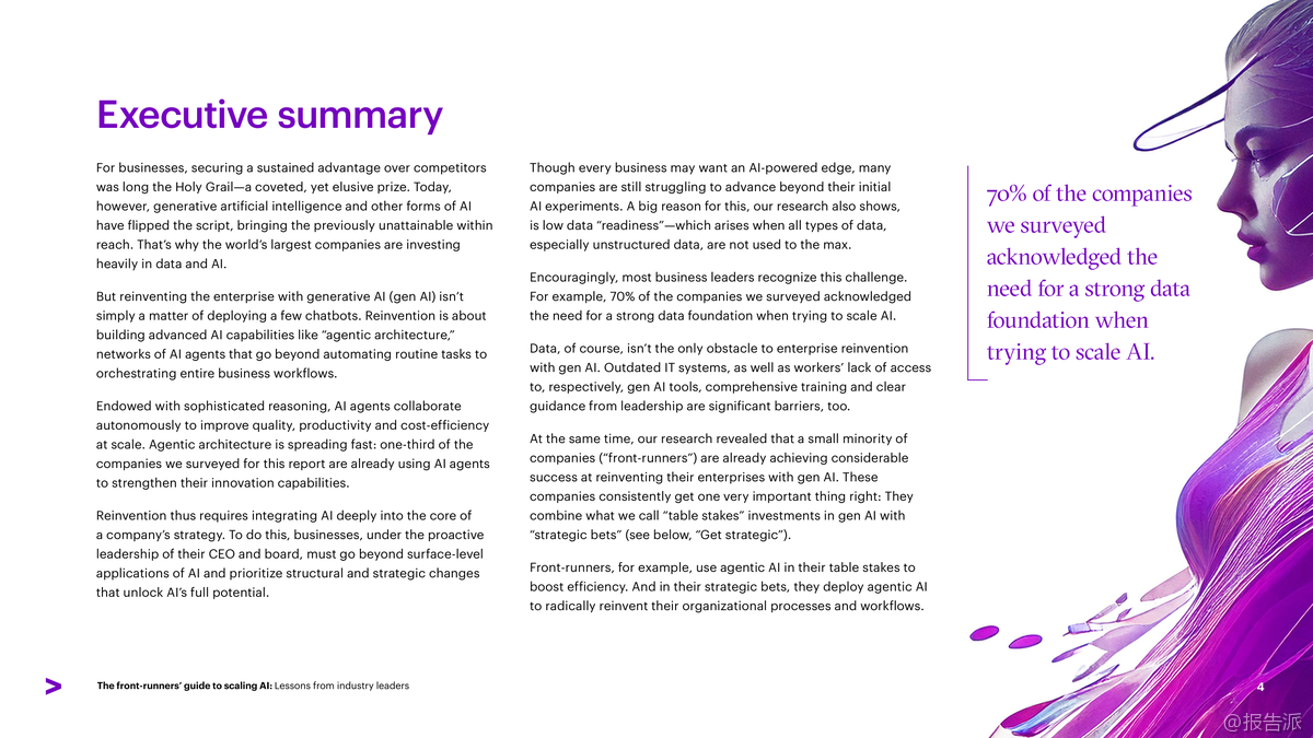 在全球企業(yè)加速布局人工智能(AI)的背景下,如何真正實(shí)現(xiàn)AI的大規(guī)模落地與商業(yè)價(jià)值轉(zhuǎn)化,成為決定未來(lái)競(jìng)爭(zhēng)格局的關(guān)鍵。 最新發(fā)布的《2025年前沿者的AI擴(kuò)展指南:來(lái)自行業(yè)領(lǐng)導(dǎo)者的經(jīng)驗(yàn)教訓(xùn)》報(bào)告,基于對(duì)全球近2000家年收入超10億美元企業(yè)的高管調(diào)研,揭示了企業(yè)在生成式AI時(shí)代實(shí)現(xiàn)“企業(yè)重塑”的核心路徑。 報(bào)告指出,當(dāng)前多數(shù)企業(yè)仍停留在AI試點(diǎn)階段,僅有15%的企業(yè)具備“AI重塑就緒”能力,而其中真正脫穎而出的“領(lǐng)跑者”(front-runners)僅占8%。 這些領(lǐng)跑者之所以成功,關(guān)鍵在于他們不僅投入基礎(chǔ)性AI應(yīng)用(table stakes),更敢于下注“戰(zhàn)略性賭注”(strategic bets)——即聚焦行業(yè)核心價(jià)值鏈、能帶來(lái)巨大回報(bào)的長(zhǎng)期AI投資。 例如在生命科學(xué)領(lǐng)域,領(lǐng)跑企業(yè)正利用AI加速藥物上市和臨床試驗(yàn)進(jìn)程;在保險(xiǎn)業(yè),則通過(guò)AI實(shí)現(xiàn)100%保單自動(dòng)化處理,顯著提升承保效率與客戶(hù)體驗(yàn)。 研究發(fā)現(xiàn),已規(guī)?;辽僖豁?xiàng)戰(zhàn)略賭注的企業(yè),其技術(shù)預(yù)算中高達(dá)51%投向云與AI,遠(yuǎn)高于未規(guī)模化企業(yè)的45%。 更重要的是,這類(lèi)企業(yè)實(shí)現(xiàn)AI投資回報(bào)率超預(yù)期的可能性是同行的近三倍。 領(lǐng)跑者普遍具備五大關(guān)鍵行動(dòng)準(zhǔn)則:一是“以?xún)r(jià)值為導(dǎo)向”,由CEO和董事會(huì)親自推動(dòng)AI戰(zhàn)略,確保投資與業(yè)務(wù)目標(biāo)高度對(duì)齊;二是“重構(gòu)人才與工作方式”,建立個(gè)性化學(xué)習(xí)路徑,推動(dòng)人機(jī)協(xié)同;三是“構(gòu)建AI賦能的安全數(shù)字核心”,打通數(shù)據(jù)孤島,打造可擴(kuò)展的智能中樞;四是“彌合負(fù)責(zé)任AI的差距”,將倫理與合規(guī)轉(zhuǎn)化為信任資產(chǎn);五是“驅(qū)動(dòng)持續(xù)重塑”,把變革本身作為組織核心能力。 值得注意的是,盡管許多企業(yè)意識(shí)到數(shù)據(jù)基礎(chǔ)的重要性(70%承認(rèn)需強(qiáng)化數(shù)據(jù)準(zhǔn)備度),但真正能有效整合零方數(shù)據(jù)、合成數(shù)據(jù)及隱性知識(shí)等多元數(shù)據(jù)源的仍是少數(shù)。 領(lǐng)跑者在大語(yǔ)言模型運(yùn)維(LLMOps)、知識(shí)圖譜、檢索增強(qiáng)生成(RAG)等新興能力上也明顯領(lǐng)先。 此外,設(shè)立AI卓越中心(CoE)等集中化運(yùn)營(yíng)模式,成為領(lǐng)跑者高效推進(jìn)AI規(guī)模化的重要組織保障。 財(cái)務(wù)表現(xiàn)上,領(lǐng)跑企業(yè)2023年?duì)I收增速比僅做實(shí)驗(yàn)的企業(yè)高出7個(gè)百分點(diǎn),股東總回報(bào)高出6個(gè)百分點(diǎn),印證了深度AI轉(zhuǎn)型帶來(lái)的實(shí)質(zhì)性競(jìng)爭(zhēng)優(yōu)勢(shì)。 報(bào)告強(qiáng)調(diào),AI重塑不是一次性項(xiàng)目,而是一場(chǎng)沒(méi)有終點(diǎn)的持續(xù)進(jìn)化。 無(wú)論處于何種起點(diǎn),企業(yè)只要聚焦五大準(zhǔn)則,均有機(jī)會(huì)躋身前列。 未來(lái)屬于那些不僅能部署AI,更能系統(tǒng)性重構(gòu)自身運(yùn)營(yíng)邏輯與價(jià)值創(chuàng)造模式的組織。 出品方:Accenture 發(fā)布時(shí)間:2025年 文檔頁(yè)數(shù):38頁(yè) |
