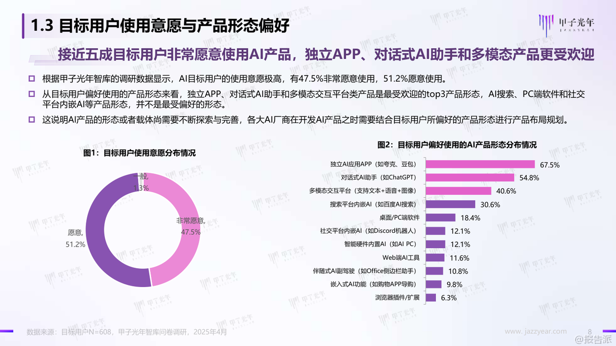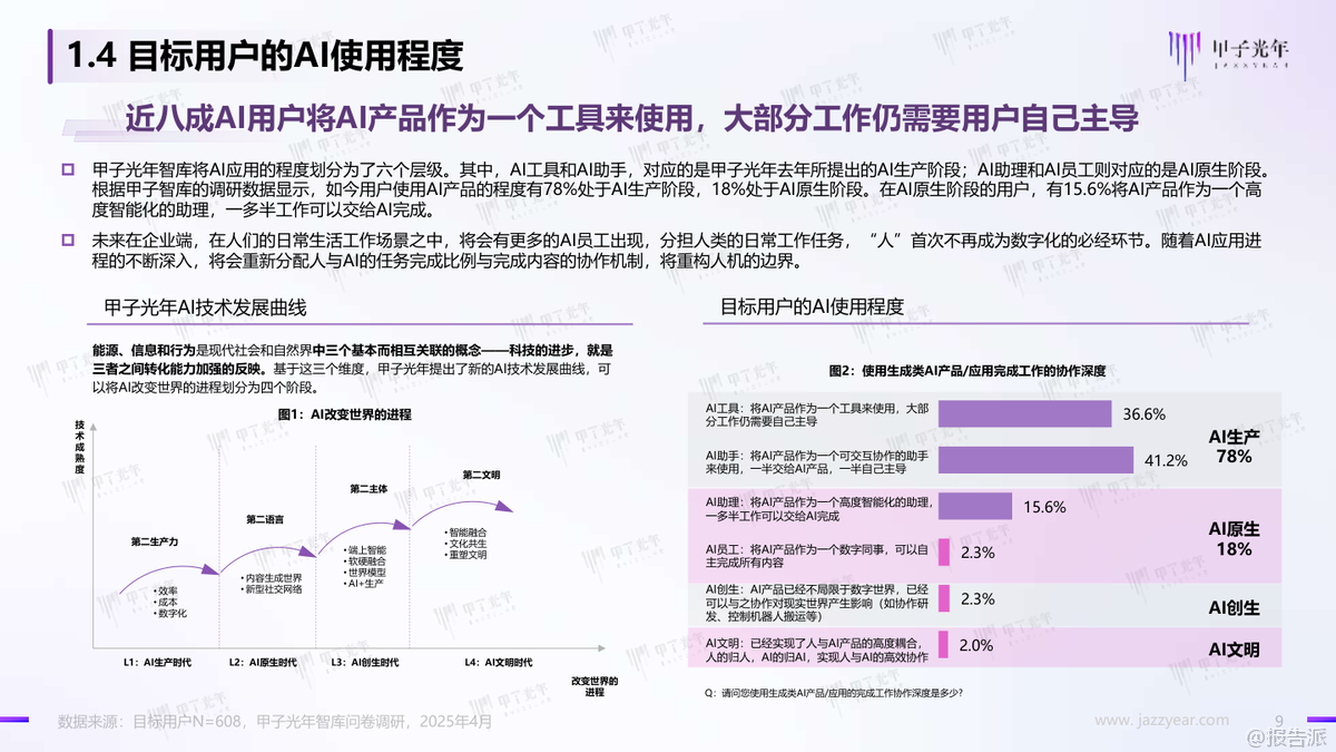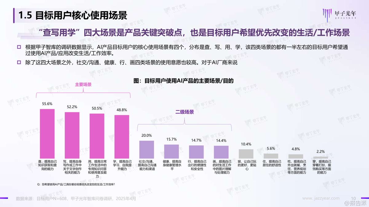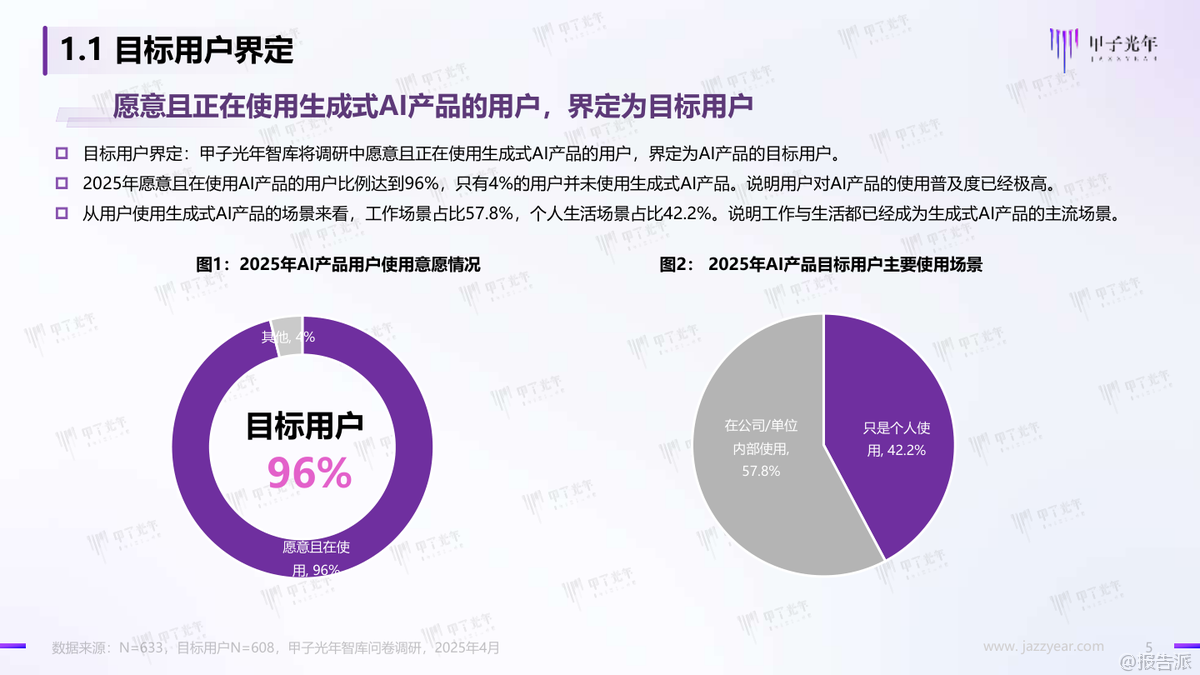 近日,甲子光年智庫發(fā)布了《2025 AI產(chǎn)品用戶需求調(diào)研報告系列1:AI產(chǎn)品的用戶類型細(xì)分與畫像分析》,通過對633名用戶的定量調(diào)研,深入揭示了當(dāng)前AI產(chǎn)品用戶的使用行為、認(rèn)知水平、場景偏好及人群畫像。 報告指出,截至2025年,高達(dá)96%的用戶已愿意且正在使用生成式AI產(chǎn)品,AI技術(shù)正加速滲透至工作與生活的各個角落。 從使用場景看,57.8%的用戶主要在工作場景中使用AI,42.2%用于個人生活,顯示出AI已成為提升效率的重要工具。 而在核心應(yīng)用場景中,“查、寫、用、學(xué)”四大場景占據(jù)主導(dǎo)地位,分別對應(yīng)知識獲取、文字創(chuàng)作、專業(yè)問答與自我提升,均有一半左右用戶希望通過AI優(yōu)化效率。 值得注意的是,“穿、娛、社交/溝通”等新興場景在AI原生用戶中表現(xiàn)突出,預(yù)示著未來AI將在個性化生活服務(wù)領(lǐng)域釋放更大潛力。 用戶對AI的認(rèn)知水平整體較高,理解得分達(dá)82分(滿分100),尤其在食品餐飲、醫(yī)療健康、零售、電信、教育等行業(yè),超80%用戶認(rèn)可AI對自身工作的價值,技術(shù)共識已在千行百業(yè)形成。 與此同時,用戶使用頻次持續(xù)上升,61.3%的用戶每天使用AI,7.8%已將其視為習(xí)慣性行為,平均可由AI完成37.7%的工作任務(wù),標(biāo)志著AI正從輔助工具逐步演變?yōu)樯a(chǎn)力伙伴。 報告通過聚類分析將AI用戶劃分為四大類型:AI工具用戶(38%)、AI助手用戶(48%)、AI原生用戶(12%)和AI創(chuàng)生用戶(2%)。 前者以軟件形態(tài)為主,依賴AI完成部分任務(wù);后者則傾向軟硬融合產(chǎn)品,接受更高價格,且多分布在交通運(yùn)輸、醫(yī)療健康、互聯(lián)網(wǎng)、制造等前沿領(lǐng)域。 其中,AI原生與創(chuàng)生用戶雖占比較小,但代表了未來人機(jī)協(xié)同的發(fā)展方向。 在產(chǎn)品偏好方面,豆包、DeepSeek、文心一言、ChatGPT、夸克等成為用戶首選,獨立APP、對話式AI助手和多模態(tài)平臺最受歡迎。 價格接受度方面,用戶可接受年費(fèi)區(qū)間為500元至2萬元,最優(yōu)價格點為3000元/年,較2023年大幅提升,反映出用戶對高質(zhì)量AI服務(wù)的付費(fèi)意愿不斷增強(qiáng)。 綜合來看,2025年的AI用戶已進(jìn)入深度應(yīng)用階段,使用習(xí)慣趨于成熟,需求從單一功能向全場景智能演進(jìn)。 對于廠商而言,需圍繞“查寫用學(xué)”夯實基礎(chǔ)體驗,同時在“穿娛社交”等高潛力場景創(chuàng)新產(chǎn)品形態(tài),并加快軟硬一體解決方案布局,以滿足高階用戶需求。 隨著AI從“生產(chǎn)工具”邁向“智能主體”,一場深刻的人機(jī)協(xié)作變革正在到來。 出品方:甲子光年 發(fā)布時間:2025年 |