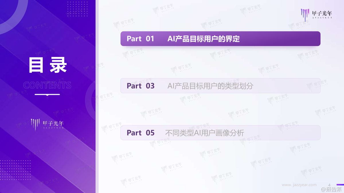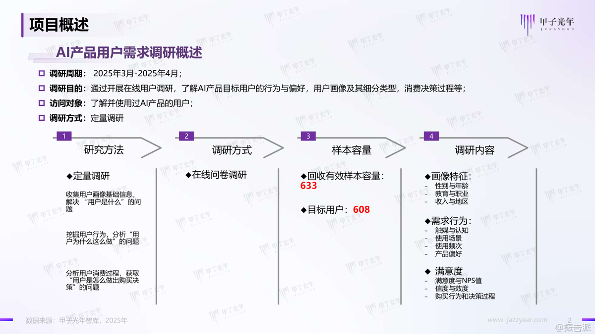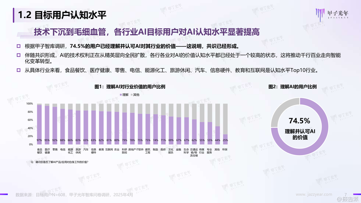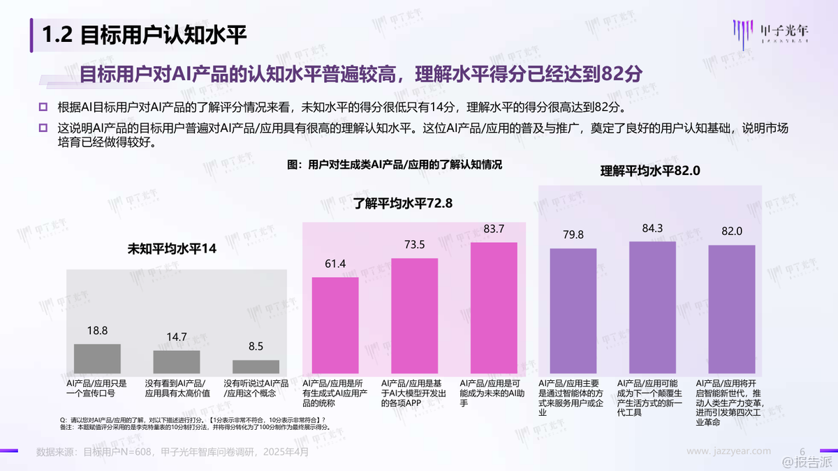 近日,甲子光年智庫發(fā)布了《2025 AI產(chǎn)品用戶需求調(diào)研報告系列1:AI產(chǎn)品的用戶類型細(xì)分與畫像分析》,通過對633名用戶的定量調(diào)研,深入揭示了當(dāng)前AI產(chǎn)品用戶的使用行為、認(rèn)知水平、場景偏好及人群畫像。 報告指出,截至2025年,高達(dá)96%的用戶已愿意且正在使用生成式AI產(chǎn)品,AI技術(shù)正加速滲透至工作與生活的各個角落。 從使用場景看,57.8%的用戶主要在工作場景中使用AI,42.2%用于個人生活,顯示出AI已成為提升效率的重要工具。 而在核心應(yīng)用場景中,“查、寫、用、學(xué)”四大場景占據(jù)主導(dǎo)地位,分別對應(yīng)知識獲取、文字創(chuàng)作、專業(yè)問答與自我提升,均有一半左右用戶希望通過AI優(yōu)化效率。 值得注意的是,“穿、娛、社交/溝通”等新興場景在AI原生用戶中表現(xiàn)突出,預(yù)示著未來AI將在個性化生活服務(wù)領(lǐng)域釋放更大潛力。 用戶對AI的認(rèn)知水平整體較高,理解得分達(dá)82分(滿分100),尤其在食品餐飲、醫(yī)療健康、零售、電信、教育等行業(yè),超80%用戶認(rèn)可AI對自身工作的價值,技術(shù)共識已在千行百業(yè)形成。 與此同時,用戶使用頻次持續(xù)上升,61.3%的用戶每天使用AI,7.8%已將其視為習(xí)慣性行為,平均可由AI完成37.7%的工作任務(wù),標(biāo)志著AI正從輔助工具逐步演變?yōu)樯a(chǎn)力伙伴。 報告通過聚類分析將AI用戶劃分為四大類型:AI工具用戶(38%)、AI助手用戶(48%)、AI原生用戶(12%)和AI創(chuàng)生用戶(2%)。 前者以軟件形態(tài)為主,依賴AI完成部分任務(wù);后者則傾向軟硬融合產(chǎn)品,接受更高價格,且多分布在交通運(yùn)輸、醫(yī)療健康、互聯(lián)網(wǎng)、制造等前沿領(lǐng)域。 其中,AI原生與創(chuàng)生用戶雖占比較小,但代表了未來人機(jī)協(xié)同的發(fā)展方向。 在產(chǎn)品偏好方面,豆包、DeepSeek、文心一言、ChatGPT、夸克等成為用戶首選,獨立APP、對話式AI助手和多模態(tài)平臺最受歡迎。 價格接受度方面,用戶可接受年費(fèi)區(qū)間為500元至2萬元,最優(yōu)價格點為3000元/年,較2023年大幅提升,反映出用戶對高質(zhì)量AI服務(wù)的付費(fèi)意愿不斷增強(qiáng)。 綜合來看,2025年的AI用戶已進(jìn)入深度應(yīng)用階段,使用習(xí)慣趨于成熟,需求從單一功能向全場景智能演進(jìn)。 對于廠商而言,需圍繞“查寫用學(xué)”夯實基礎(chǔ)體驗,同時在“穿娛社交”等高潛力場景創(chuàng)新產(chǎn)品形態(tài),并加快軟硬一體解決方案布局,以滿足高階用戶需求。 隨著AI從“生產(chǎn)工具”邁向“智能主體”,一場深刻的人機(jī)協(xié)作變革正在到來。 出品方:甲子光年 發(fā)布時間:2025年 |
