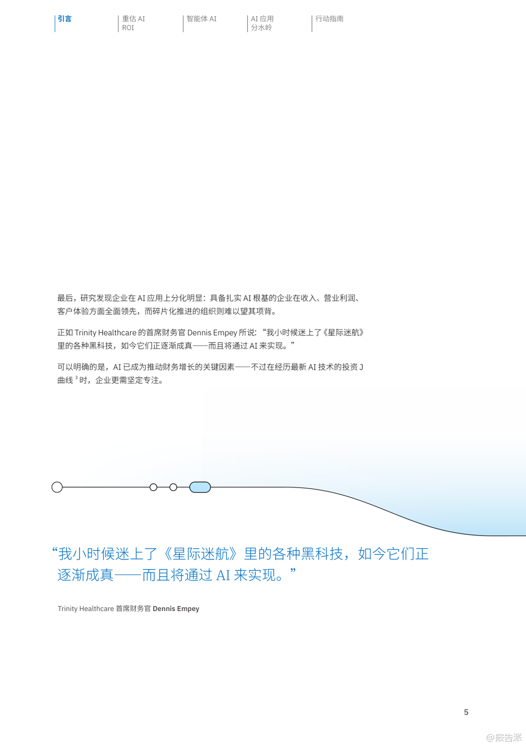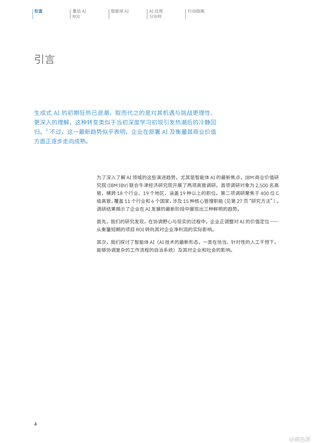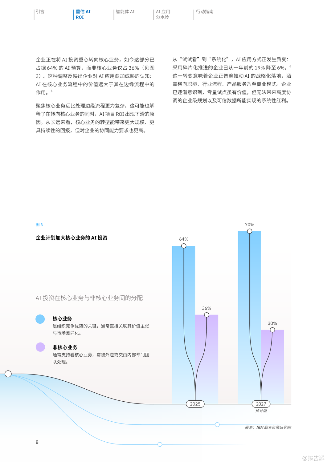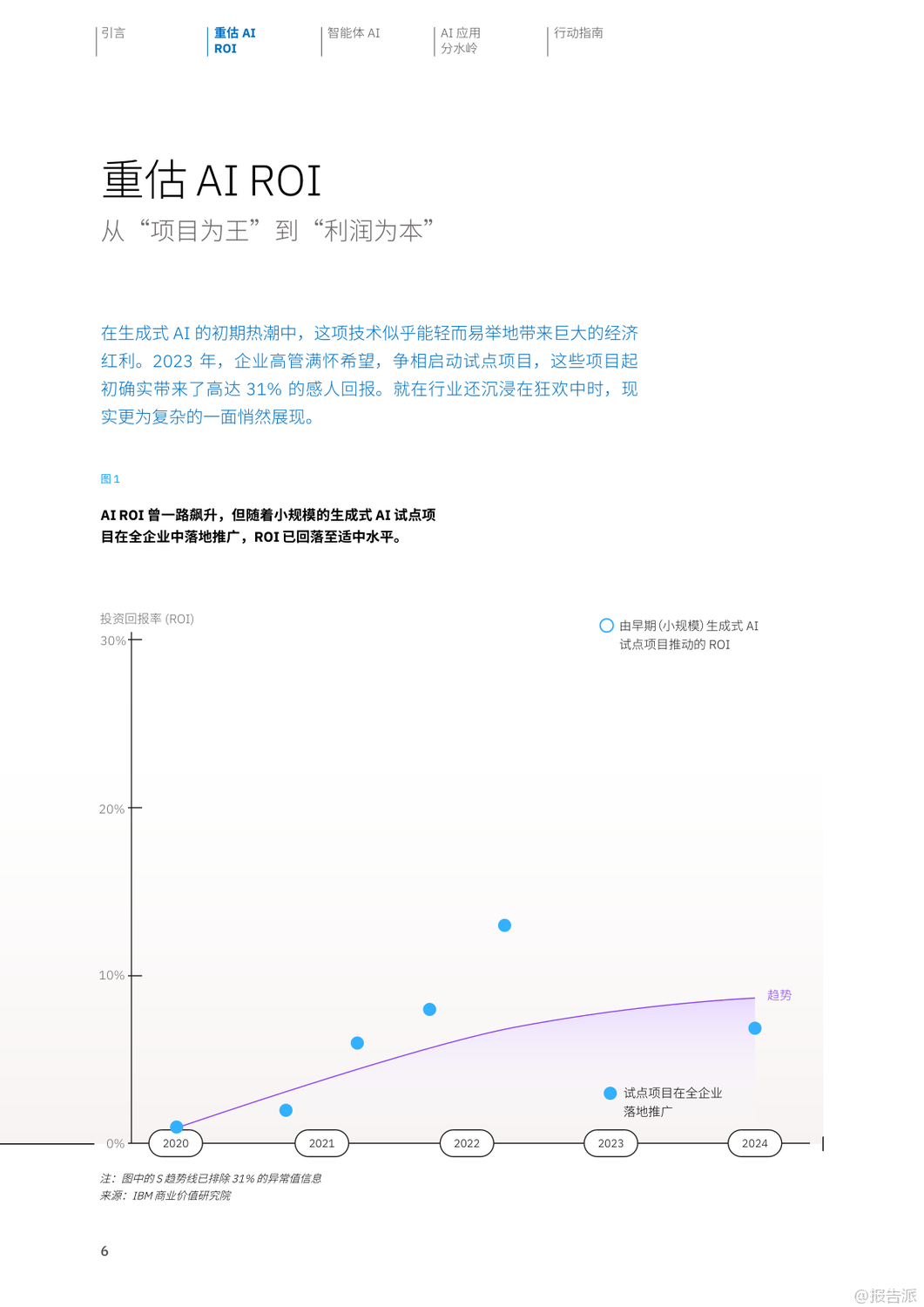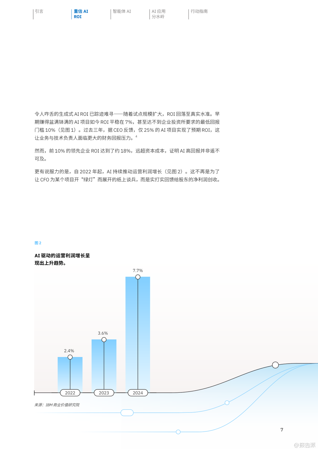 生成式AI的熱潮正在褪去,企業(yè)對(duì)AI的投資與應(yīng)用正從最初的狂熱走向理性與成熟。 IBM商業(yè)價(jià)值研究院聯(lián)合牛津經(jīng)濟(jì)研究院發(fā)布的這份《AI項(xiàng)目變現(xiàn)之路》報(bào)告,通過對(duì)全球2500名高管及400位C級(jí)高管的調(diào)研,揭示了當(dāng)前AI在企業(yè)中的真實(shí)落地情況與未來(lái)發(fā)展趨勢(shì)。 報(bào)告顯示,早期生成式AI試點(diǎn)項(xiàng)目曾帶來(lái)高達(dá)31%的投資回報(bào)率(ROI),但隨著項(xiàng)目在全企業(yè)范圍內(nèi)推廣,整體ROI已回落至7%左右,甚至低于企業(yè)10%的基準(zhǔn)回報(bào)要求。 然而,這并不意味著AI價(jià)值縮水——相反,AI對(duì)運(yùn)營(yíng)利潤(rùn)的貢獻(xiàn)持續(xù)上升,2024年已推動(dòng)企業(yè)運(yùn)營(yíng)利潤(rùn)增長(zhǎng)達(dá)7.7%。 這表明,AI的價(jià)值正從短期“驚艷”轉(zhuǎn)向長(zhǎng)期“穩(wěn)健”的財(cái)務(wù)回報(bào)。 當(dāng)前,企業(yè)AI投資重心正從非核心業(yè)務(wù)向核心業(yè)務(wù)轉(zhuǎn)移。 2025年,64%的AI預(yù)算已投向核心業(yè)務(wù)流程,預(yù)計(jì)到2027年將進(jìn)一步提升。 這種戰(zhàn)略調(diào)整反映了企業(yè)對(duì)AI認(rèn)知的深化:真正的價(jià)值不在邊緣優(yōu)化,而在重塑主營(yíng)業(yè)務(wù)。 然而,僅有22%-23%的企業(yè)正在利用AI重構(gòu)端到端流程、創(chuàng)新產(chǎn)品服務(wù)或重塑商業(yè)模式,大多數(shù)企業(yè)仍停留在“碎片化試點(diǎn)”階段,錯(cuò)失系統(tǒng)性變革機(jī)遇。 報(bào)告提出,“智能體AI”(Agentic AI)將成為下一個(gè)關(guān)鍵轉(zhuǎn)折點(diǎn)。 與傳統(tǒng)的被動(dòng)式AI不同,智能體AI具備自主決策與協(xié)調(diào)復(fù)雜任務(wù)的能力。 預(yù)計(jì)到2026年,由AI驅(qū)動(dòng)的工作流程將從2024年的3%躍升至25%,實(shí)現(xiàn)八倍增長(zhǎng)。 70%的高管認(rèn)為智能體AI已進(jìn)入“量產(chǎn)就緒”階段,83%的高管期待其大幅提升流程效率與重構(gòu)能力。 但智能體AI的落地面臨多重挑戰(zhàn):數(shù)據(jù)質(zhì)量與偏見(49%)、知識(shí)產(chǎn)權(quán)風(fēng)險(xiǎn)(50%)、系統(tǒng)信任問題(46%)以及人才短缺(42%)成為主要障礙。 報(bào)告強(qiáng)調(diào),成功的關(guān)鍵不在于技術(shù)本身,而在于組織能力的重構(gòu)——包括數(shù)據(jù)治理、流程再造、人機(jī)協(xié)作與責(zé)任機(jī)制的建立。 值得關(guān)注的是,一批“AI優(yōu)先”企業(yè)已脫穎而出。 這些企業(yè)不僅在收入與運(yùn)營(yíng)利潤(rùn)增長(zhǎng)上顯著領(lǐng)先同行,更建立了成熟的數(shù)據(jù)治理體系(68% vs 32%),并將AI納入創(chuàng)新投資組合管理。 它們不再局限于效率提升,而是利用AI開辟新市場(chǎng)、新客戶與全新商業(yè)模式,真正重塑行業(yè)競(jìng)爭(zhēng)格局。 報(bào)告最后指出,AI的競(jìng)爭(zhēng)窗口正在快速關(guān)閉。 企業(yè)若想突圍,必須采取系統(tǒng)性行動(dòng):確保高層支持、對(duì)齊戰(zhàn)略重點(diǎn)、將AI責(zé)任從IT轉(zhuǎn)移至業(yè)務(wù)領(lǐng)導(dǎo)、構(gòu)建AI治理框架,并將數(shù)據(jù)“工業(yè)化”為可復(fù)用的“數(shù)據(jù)產(chǎn)品”。 未來(lái)屬于那些將AI融入戰(zhàn)略核心、敢于重構(gòu)工作方式的企業(yè)——它們不是在追趕趨勢(shì),而是在定義未來(lái)。 出品方:IBM 發(fā)布時(shí)間:2025年 文檔頁(yè)數(shù):30頁(yè) |