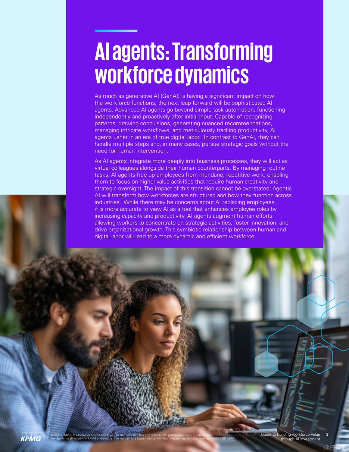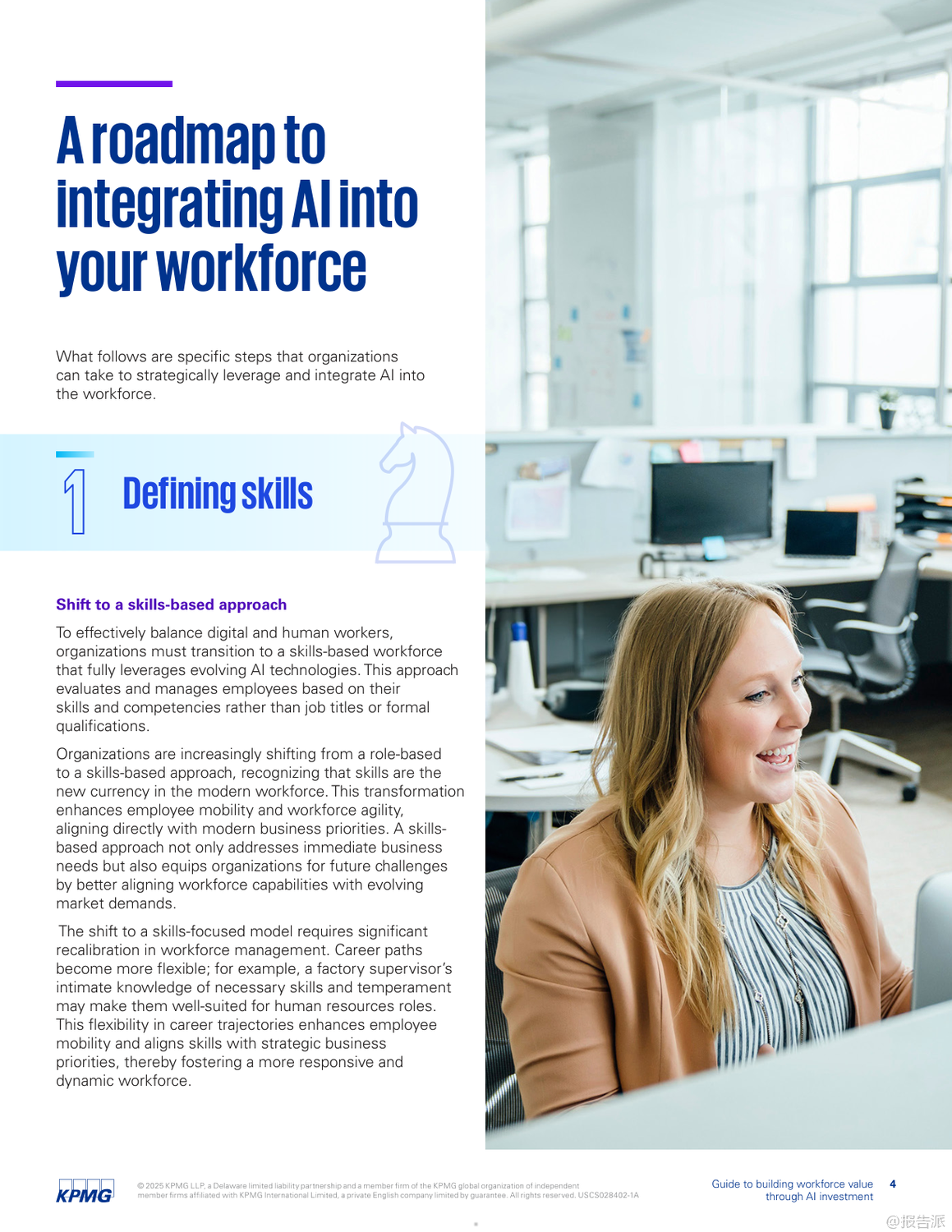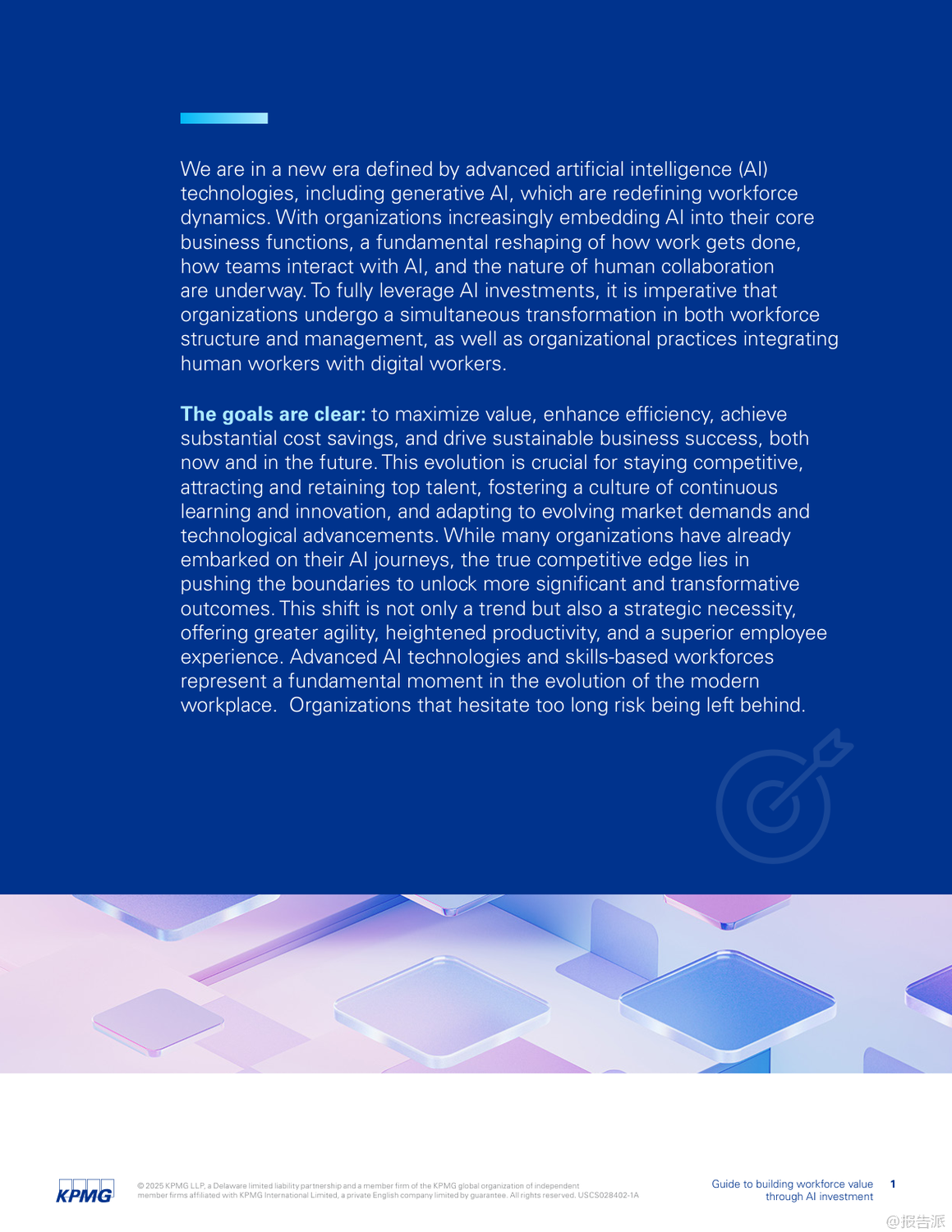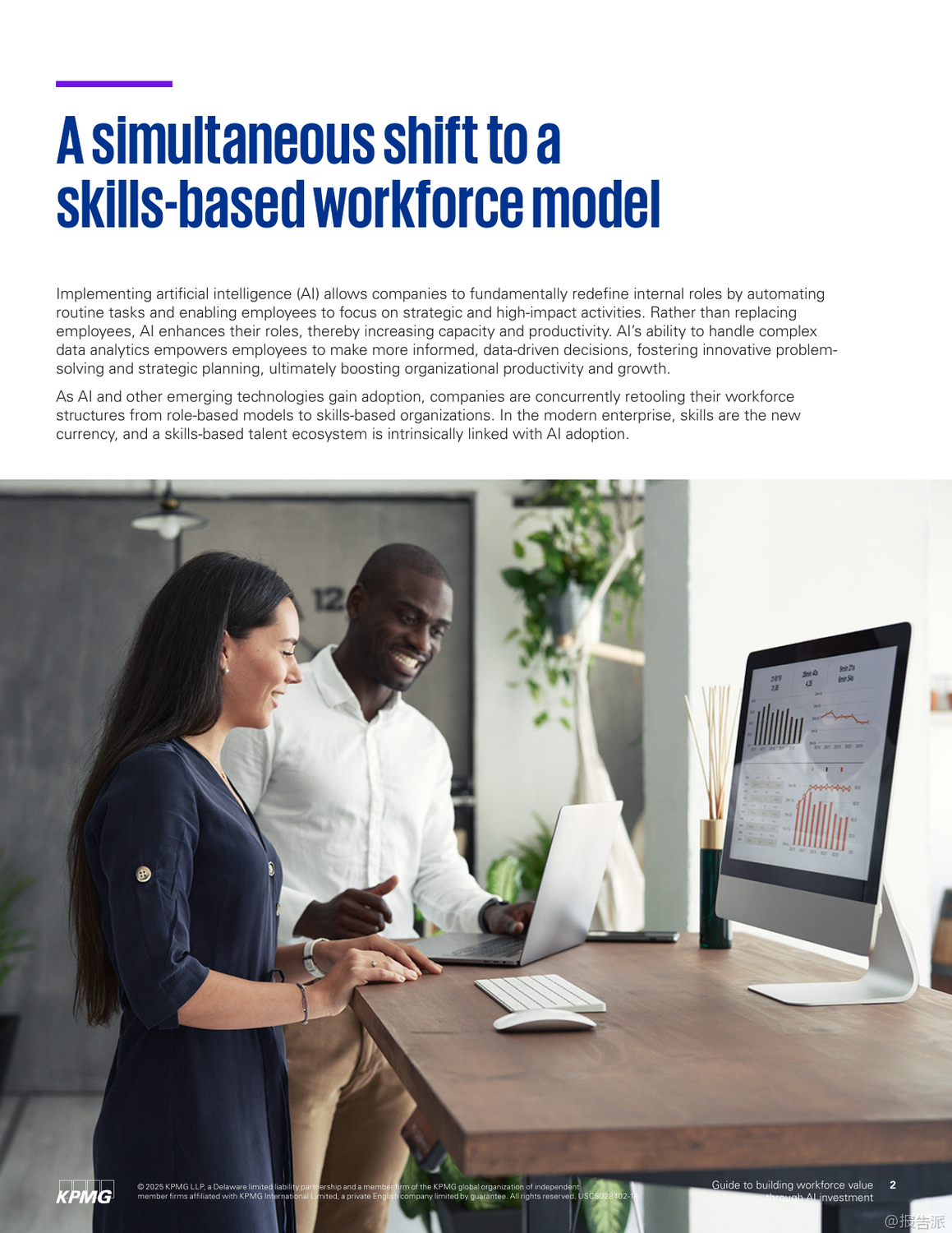 我們正處在一個由人工智能(AI)技術(shù),特別是生成式AI(GenAI)驅(qū)動的新時代,企業(yè)正在將AI深度融入核心業(yè)務(wù)流程,重塑工作方式、團隊協(xié)作模式以及人機協(xié)同關(guān)系。 畢馬威發(fā)布的《2025AI投資賦能勞動力價值構(gòu)建指南》指出,要真正釋放AI的投資價值,企業(yè)必須同步推進組織結(jié)構(gòu)、人才管理和運營實踐的變革,實現(xiàn)人類員工與數(shù)字員工的深度融合。 AI并非簡單替代人力,而是通過自動化重復(fù)性任務(wù),讓員工聚焦于更具戰(zhàn)略性和創(chuàng)造性的工作,從而提升整體生產(chǎn)力與創(chuàng)新能力。 隨著AI技術(shù)演進,未來的關(guān)鍵驅(qū)動力將是“AI智能體”(AI Agents)。 這些智能體不僅能執(zhí)行單一指令,更能獨立完成多步驟復(fù)雜任務(wù)、管理流程、追蹤績效,甚至主動追求戰(zhàn)略目標(biāo),成為真正的“數(shù)字勞動力”。 這種人機協(xié)作新模式將徹底改變組織架構(gòu)和運作邏輯。 為了最大化AI的價值,企業(yè)需向“技能型組織”轉(zhuǎn)型。 傳統(tǒng)以崗位為中心的管理模式正被以技能為核心的體系取代,技能已成為現(xiàn)代職場的新貨幣。 企業(yè)需要重新評估人才,關(guān)注其實際能力而非頭銜或資歷。 這一轉(zhuǎn)變提升了員工流動性與組織敏捷性,使人才配置更靈活高效。 實現(xiàn)這一轉(zhuǎn)型需系統(tǒng)化路徑:首先開展內(nèi)部技能盤點,利用AI工具繪制技能地圖,識別能力缺口;其次改革招聘機制,推行技能導(dǎo)向的用人策略,提升人崗匹配度;同時建立持續(xù)學(xué)習(xí)文化,借助AI預(yù)測未來所需技能,為員工定制個性化發(fā)展路徑,推動終身成長。 在具體實施上,建議從試點項目入手,驗證AI應(yīng)用的ROI后再規(guī)?;茝V。 同時需打通AI與現(xiàn)有系統(tǒng)(如Workday、ServiceNow)的集成,提升決策效率。 文化層面,領(lǐng)導(dǎo)層支持至關(guān)重要,需營造鼓勵學(xué)習(xí)、包容變化的組織氛圍,明確傳達AI是增強而非取代人類工作的理念。 此外,企業(yè)還需重構(gòu)人力資源管理體系,將數(shù)字員工納入績效考核范疇,建立新的衡量標(biāo)準(zhǔn),對比人與AI的成本效益,優(yōu)化資源配置。 同時設(shè)立AI卓越中心(COE),統(tǒng)籌風(fēng)險管理,應(yīng)對數(shù)據(jù)安全、算法偏見等挑戰(zhàn),確保AI應(yīng)用的可靠性與合規(guī)性。 最終,成功整合AI的企業(yè)將獲得顯著競爭優(yōu)勢——更高的運營效率、更強的創(chuàng)新能力、更具吸引力的員工體驗,以及面向未來的組織韌性。 猶豫不決者則可能在新一輪科技浪潮中掉隊。 這份指南為企業(yè)提供了從戰(zhàn)略規(guī)劃到落地執(zhí)行的完整路線圖,是邁向智能化組織的重要參考。 出品方:畢馬威 發(fā)布時間:2025年 文檔頁數(shù):15頁 |