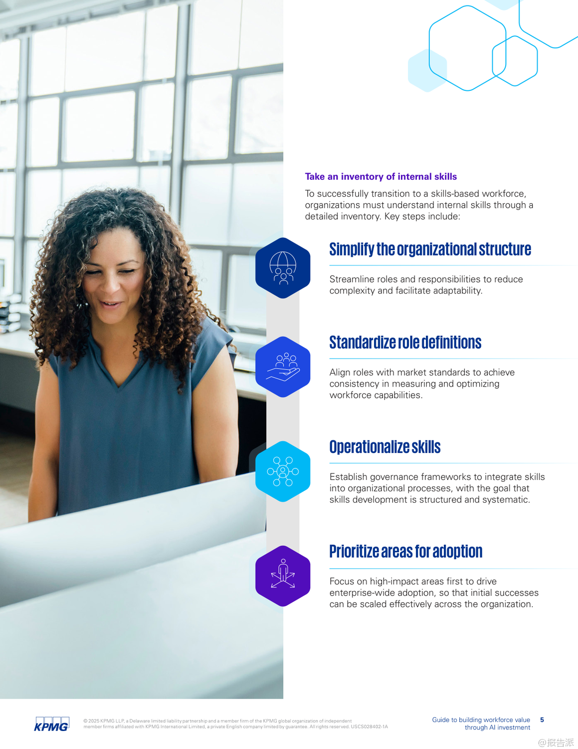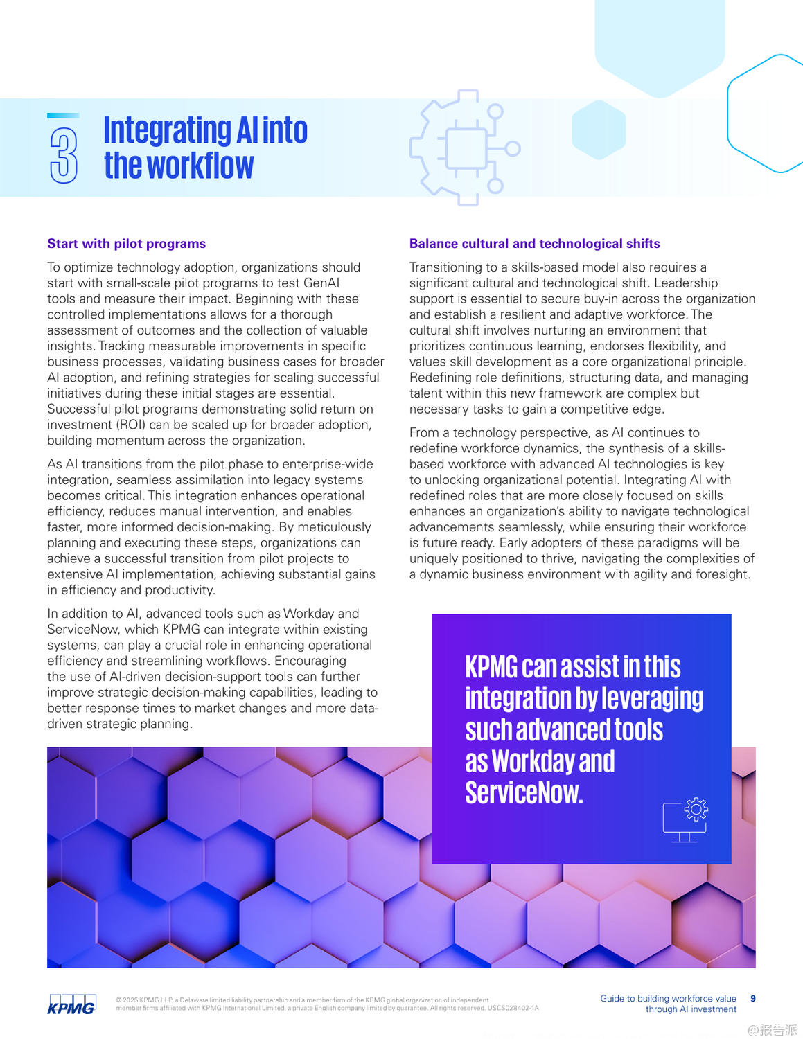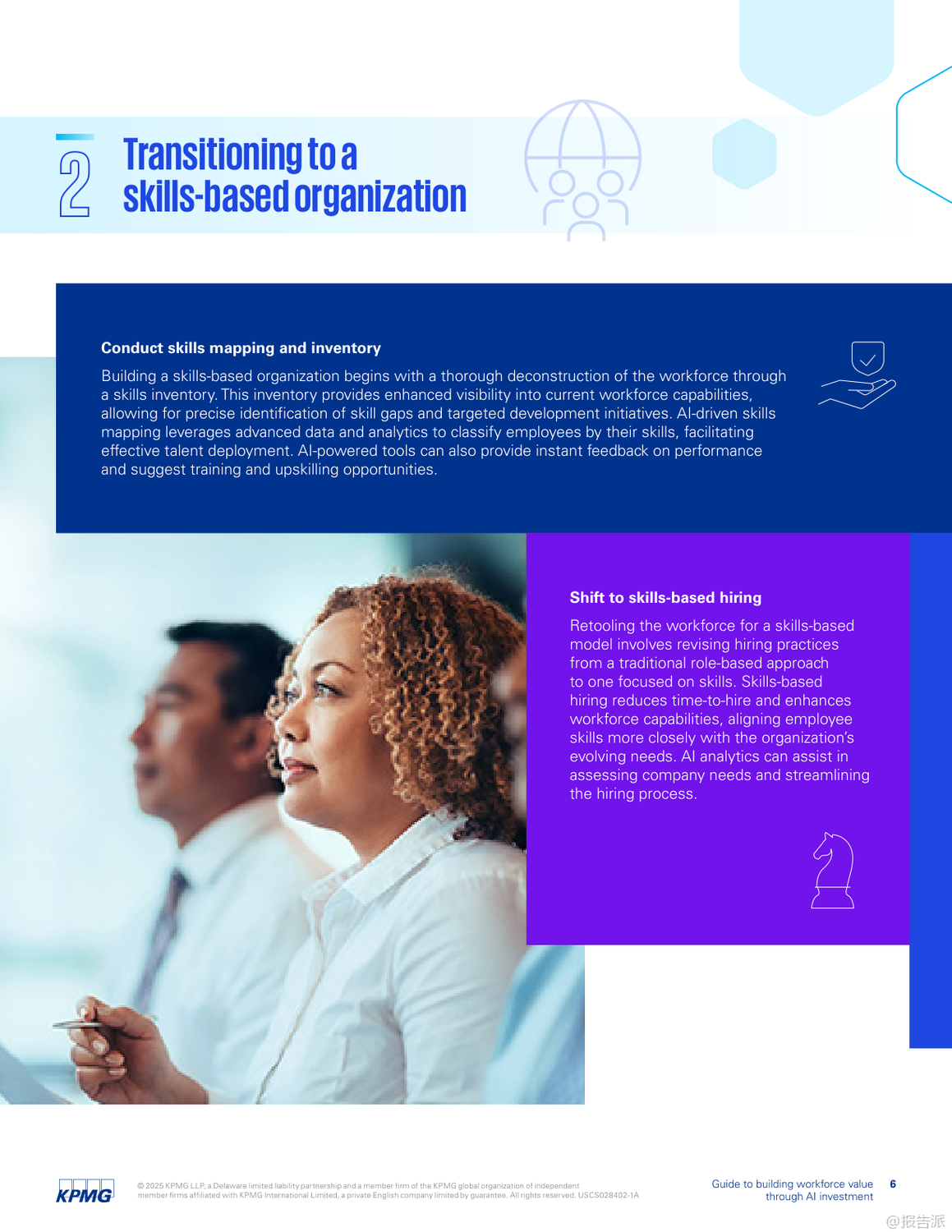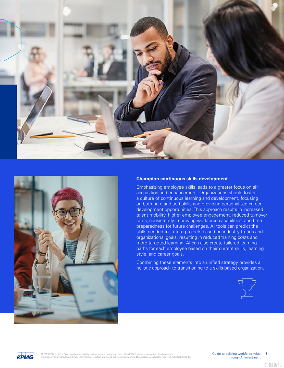 我們正處在一個由人工智能(AI)技術(shù),特別是生成式AI(GenAI)驅(qū)動的新時代,企業(yè)正在將AI深度融入核心業(yè)務(wù)流程,重塑工作方式、團隊協(xié)作模式以及人機協(xié)同關(guān)系。 畢馬威發(fā)布的《2025AI投資賦能勞動力價值構(gòu)建指南》指出,要真正釋放AI的投資價值,企業(yè)必須同步推進組織結(jié)構(gòu)、人才管理和運營實踐的變革,實現(xiàn)人類員工與數(shù)字員工的深度融合。 AI并非簡單替代人力,而是通過自動化重復(fù)性任務(wù),讓員工聚焦于更具戰(zhàn)略性和創(chuàng)造性的工作,從而提升整體生產(chǎn)力與創(chuàng)新能力。 隨著AI技術(shù)演進,未來的關(guān)鍵驅(qū)動力將是“AI智能體”(AI Agents)。 這些智能體不僅能執(zhí)行單一指令,更能獨立完成多步驟復(fù)雜任務(wù)、管理流程、追蹤績效,甚至主動追求戰(zhàn)略目標(biāo),成為真正的“數(shù)字勞動力”。 這種人機協(xié)作新模式將徹底改變組織架構(gòu)和運作邏輯。 為了最大化AI的價值,企業(yè)需向“技能型組織”轉(zhuǎn)型。 傳統(tǒng)以崗位為中心的管理模式正被以技能為核心的體系取代,技能已成為現(xiàn)代職場的新貨幣。 企業(yè)需要重新評估人才,關(guān)注其實際能力而非頭銜或資歷。 這一轉(zhuǎn)變提升了員工流動性與組織敏捷性,使人才配置更靈活高效。 實現(xiàn)這一轉(zhuǎn)型需系統(tǒng)化路徑:首先開展內(nèi)部技能盤點,利用AI工具繪制技能地圖,識別能力缺口;其次改革招聘機制,推行技能導(dǎo)向的用人策略,提升人崗匹配度;同時建立持續(xù)學(xué)習(xí)文化,借助AI預(yù)測未來所需技能,為員工定制個性化發(fā)展路徑,推動終身成長。 在具體實施上,建議從試點項目入手,驗證AI應(yīng)用的ROI后再規(guī)?;茝V。 同時需打通AI與現(xiàn)有系統(tǒng)(如Workday、ServiceNow)的集成,提升決策效率。 文化層面,領(lǐng)導(dǎo)層支持至關(guān)重要,需營造鼓勵學(xué)習(xí)、包容變化的組織氛圍,明確傳達AI是增強而非取代人類工作的理念。 此外,企業(yè)還需重構(gòu)人力資源管理體系,將數(shù)字員工納入績效考核范疇,建立新的衡量標(biāo)準(zhǔn),對比人與AI的成本效益,優(yōu)化資源配置。 同時設(shè)立AI卓越中心(COE),統(tǒng)籌風(fēng)險管理,應(yīng)對數(shù)據(jù)安全、算法偏見等挑戰(zhàn),確保AI應(yīng)用的可靠性與合規(guī)性。 最終,成功整合AI的企業(yè)將獲得顯著競爭優(yōu)勢——更高的運營效率、更強的創(chuàng)新能力、更具吸引力的員工體驗,以及面向未來的組織韌性。 猶豫不決者則可能在新一輪科技浪潮中掉隊。 這份指南為企業(yè)提供了從戰(zhàn)略規(guī)劃到落地執(zhí)行的完整路線圖,是邁向智能化組織的重要參考。 出品方:畢馬威 發(fā)布時間:2025年 文檔頁數(shù):15頁 |