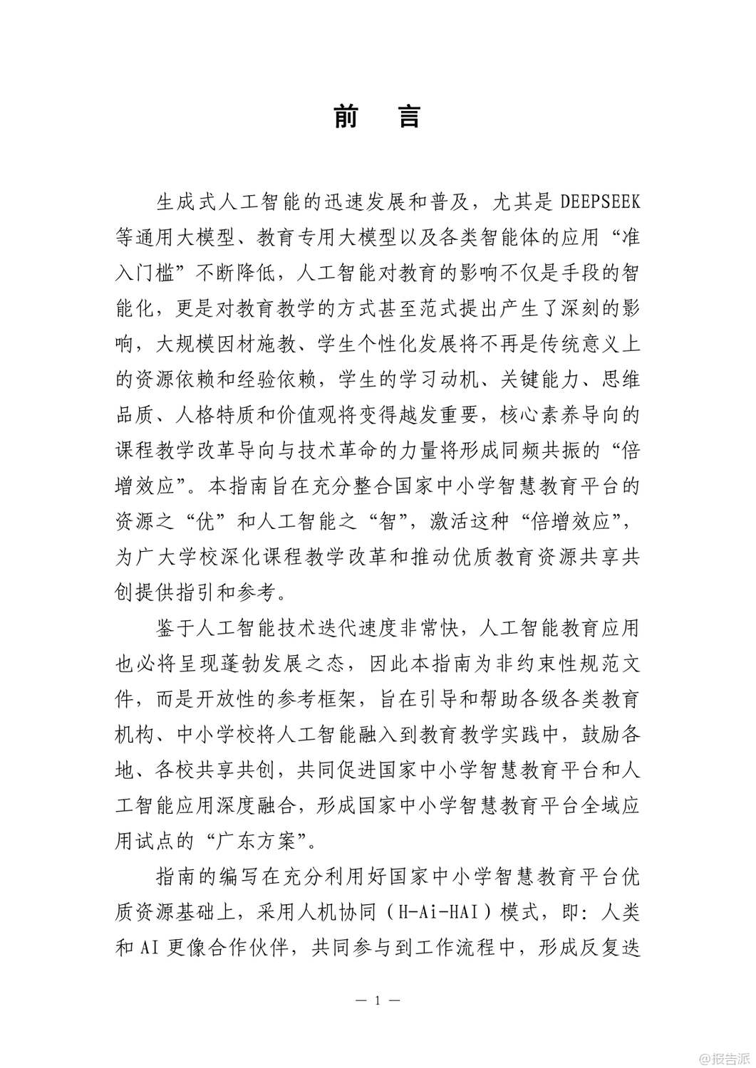 近日,國家中小學(xué)智慧教育平臺(tái)發(fā)布了《國家中小學(xué)智慧教育平臺(tái)與人工智能融合應(yīng)用指南(試行)》,標(biāo)志著我國基礎(chǔ)教育在智能化轉(zhuǎn)型道路上邁出關(guān)鍵一步。 這份指南以“人機(jī)協(xié)同”為核心理念,系統(tǒng)構(gòu)建了AI技術(shù)與教育教學(xué)深度融合的五大應(yīng)用場景,覆蓋課程教學(xué)、師生發(fā)展、教研科研、教育治理以及家校社共育,提出了31個(gè)具體實(shí)踐場景,為全國中小學(xué)提供了可復(fù)制、可推廣的智能化教育樣板。 該指南的一大亮點(diǎn)在于強(qiáng)調(diào)“AI不是替代,而是增強(qiáng)”。 它倡導(dǎo)H-AI-HAI(人—人工智能—人)協(xié)同模式,即教師設(shè)定目標(biāo),AI提供初步建議與資源支持,再由教師進(jìn)行多輪交互、批判性調(diào)整與最終確認(rèn),形成閉環(huán)工作流。 這種設(shè)計(jì)理念避免了對(duì)AI的盲目依賴,突出了教師在教學(xué)中的主體地位,同時(shí)充分發(fā)揮AI在資源生成、數(shù)據(jù)分析和個(gè)性化推薦方面的優(yōu)勢(shì)。 在課程教學(xué)方面,指南展示了AI如何貫穿“課前—課中—課后”全流程。 課前,教師可利用AI進(jìn)行簡易備課,通過分析平臺(tái)優(yōu)質(zhì)課例,快速生成教學(xué)設(shè)計(jì)、PPT課件甚至順口溜等記憶輔助工具;課中,AI支持雙師課堂、智能點(diǎn)名、實(shí)時(shí)測(cè)評(píng),實(shí)現(xiàn)課堂互動(dòng)升級(jí)與數(shù)據(jù)驅(qū)動(dòng)的教學(xué)反饋;課后,則可通過AI生成個(gè)性化作業(yè)、實(shí)現(xiàn)智能批改與學(xué)情分析,真正做到因材施教。 在教師發(fā)展上,指南提出“教學(xué)個(gè)性成長規(guī)劃”“教學(xué)質(zhì)量監(jiān)測(cè)與改進(jìn)”等創(chuàng)新路徑。 新手教師可通過AI分析優(yōu)秀教師案例,繪制“專家畫像”,并與自身教學(xué)視頻、教案進(jìn)行比對(duì),生成差距分析報(bào)告,進(jìn)而制定個(gè)性化成長路徑。 資深教師則可借助AI構(gòu)建“個(gè)人智能體”,整合自身教學(xué)成果與研究成果,實(shí)現(xiàn)知識(shí)資產(chǎn)的系統(tǒng)化管理與高效復(fù)用。 更值得關(guān)注的是,AI在家校社共育中的應(yīng)用。 指南通過“北京教育新地圖”等案例,展示了如何利用AI整合社會(huì)資源,實(shí)現(xiàn)家校社數(shù)據(jù)的自動(dòng)同步與協(xié)同指導(dǎo)。 家長可通過智能體實(shí)時(shí)了解孩子實(shí)踐活動(dòng)進(jìn)展,教師可一鍵生成家長會(huì)通知,學(xué)生則能在AI輔助下完成古文講解視頻制作等跨學(xué)科項(xiàng)目,真正打通了教育的“最后一公里”。 值得注意的是,該指南定位為“非約束性”“開放性”參考框架,鼓勵(lì)各地各?;趪移脚_(tái)資源進(jìn)行共創(chuàng)共享。 其背后依托的國家中小學(xué)智慧教育平臺(tái)已匯聚超9萬條精品資源,覆蓋德智體美勞全領(lǐng)域,為AI應(yīng)用提供了堅(jiān)實(shí)的內(nèi)容基礎(chǔ)。 隨著AI技術(shù)的快速迭代,這份指南或?qū)⒊掷m(xù)更新,推動(dòng)我國基礎(chǔ)教育從“規(guī)?;弊呦颉皞€(gè)性化”與“智能化”的深度融合新時(shí)代。 出品方:國家中小學(xué)智慧教育平臺(tái) 發(fā)布時(shí)間:2025年 文檔頁數(shù):129頁 |