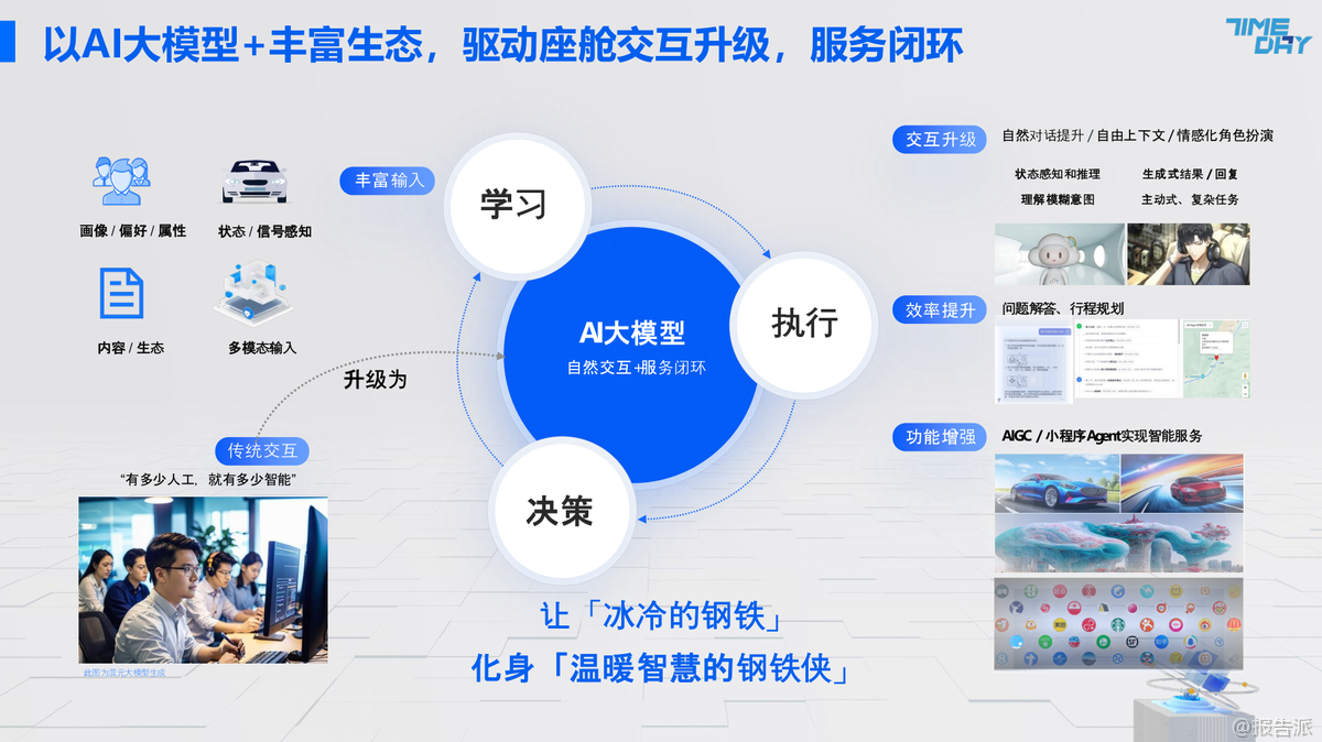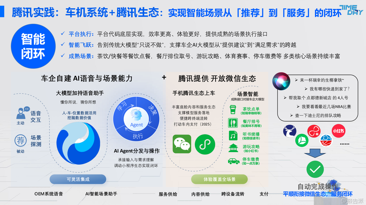 隨著人工智能技術的快速發(fā)展,智能座艙正迎來一場由AI深度驅動的變革。 騰訊云最新發(fā)布的《2025年AI技術驅動下座艙演進趨勢與實踐報告》系統(tǒng)性地揭示了未來座艙的核心發(fā)展方向——從傳統(tǒng)的功能堆砌轉向以用戶為中心的服務閉環(huán)體驗。 報告指出,當前用戶在用車過程中仍面臨大量跨設備操作痛點,如出發(fā)前需手動解鎖車輛、駕車中頻繁切換手機與車機進行導航設定、微信通話或位置共享等,不僅操作繁瑣,還存在安全隱患。 這些‘手忙腳亂’的體驗背后,反映出傳統(tǒng)交互方式與用戶真實場景需求之間的巨大鴻溝。 在此背景下,AI大模型成為破局關鍵。 報告提出,未來的智能座艙將依托AI大模型實現(xiàn)“自然交互+服務閉環(huán)”的全新范式。 通過深度理解用戶模糊意圖、主動推理狀態(tài)并生成個性化服務建議,AI不僅能聽懂“來一杯瑞幸生椰拿鐵”這樣的口語指令,更能自動完成點單、支付、導航等全流程操作。 這種從“被動響應”到“主動服務”的躍遷,標志著座艙系統(tǒng)正從“冰冷的鋼鐵”進化為“溫暖智慧的鋼鐵俠”。 尤其值得關注的是,騰訊基于其龐大的微信生態(tài),構建了一套完整的Agent服務體系,涵蓋茶飲點單、餐廳排號、停車繳費、游玩攻略、賽事查詢等多個高頻場景,真正實現(xiàn)“一句話搞定所有”。 報告進一步強調,AI的價值不僅體現(xiàn)在交互升級,更在于打通人-車-服務的數(shù)據(jù)鏈條。 通過融合用戶畫像、行為偏好、實時位置等多維度數(shù)據(jù),座艙系統(tǒng)能夠提供比用戶更懂自己的貼心推薦。 例如,在朋友聚會場景中,微信內(nèi)收到的大眾點評餐廳信息可一鍵“發(fā)送到車”,上車即自動發(fā)起導航;駕車途中只需語音指令即可發(fā)起微信通話或共享實時位置,全程無需觸控手機,極大提升了安全性與便捷性。 此外,騰訊還開放了微信生態(tài)的完整能力接口,支持車企將其與自有AI中臺深度融合,打造具備品牌特色的高活躍、閉環(huán)式智能座艙。 值得一提的是,報告展示了騰訊在數(shù)字鑰匙、云游戲、視聽娛樂等方面的創(chuàng)新實踐。 “我的車鑰匙”小程序依托微信跨平臺優(yōu)勢,實現(xiàn)iOS與安卓通用、自動解閉鎖、便捷分享及異常提醒等功能,同時連接代客維保、充電、泊車等車后服務,拓展了智能出行的服務邊界。 而在非駕駛場景下,騰訊云游戲與高品質音頻內(nèi)容的引入,則助力車企構建真正的“第三空間”,滿足用戶在車內(nèi)辦公、娛樂、休息等多元化需求。 截至2025年,騰訊車聯(lián)方案已落地超過1300萬臺車輛,合作車企超30家,驗證了其生態(tài)模式的廣泛適用性與商業(yè)潛力。 可以預見,AI與開放生態(tài)的深度融合,將成為推動智能汽車邁向人性化、智能化時代的核心引擎。 出品方:騰訊云 發(fā)布時間:2025年 |
