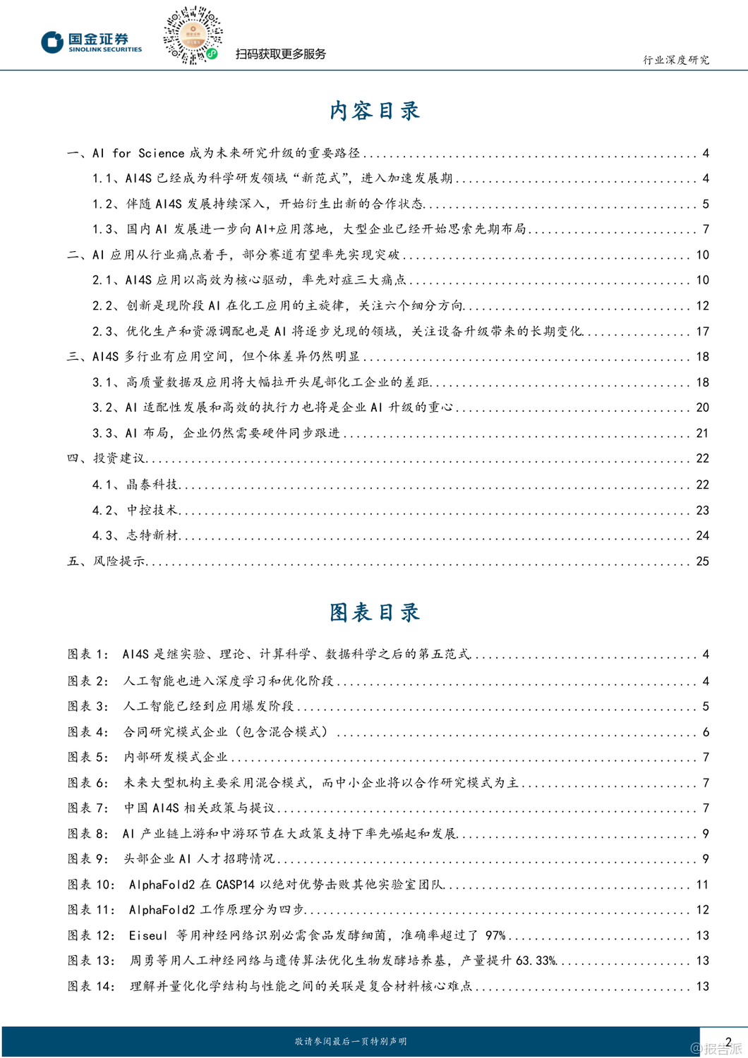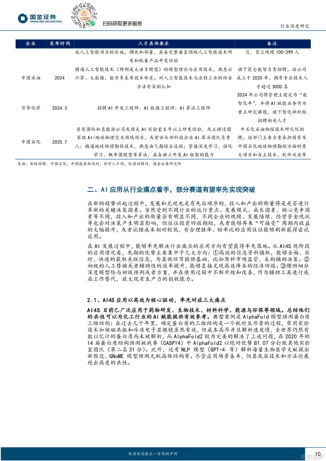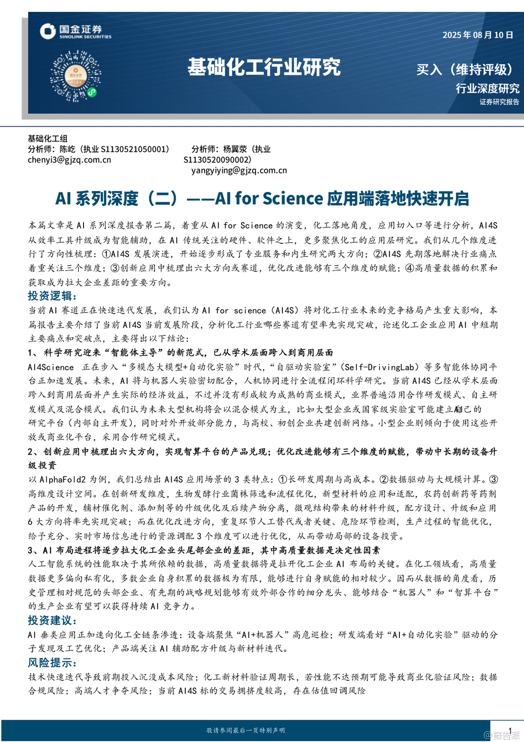 AI for Science(AI4S)正在重塑基礎(chǔ)化工行業(yè)的研發(fā)范式,從效率工具升級(jí)為智能輔助,推動(dòng)科學(xué)研究邁入“智能體主導(dǎo)”的新時(shí)代。 這份由國(guó)金證券發(fā)布的《2025年08月15日更新-基礎(chǔ)化工行業(yè)研究:AI系列深度-二-——AI for Science應(yīng)用端落地快速開(kāi)啟》報(bào)告指出,AI4S已從學(xué)術(shù)探索走向商業(yè)應(yīng)用,盡管尚未形成成熟商業(yè)模式,但正通過(guò)合作研發(fā)、自主開(kāi)發(fā)及混合模式加速滲透。 當(dāng)前,AI4S正處于“多模態(tài)大模型+自動(dòng)化實(shí)驗(yàn)”時(shí)代,Self-Driving Lab(自驅(qū)動(dòng)實(shí)驗(yàn)室)等多智能體協(xié)同平臺(tái)快速發(fā)展,AI與機(jī)器人緊密協(xié)作,實(shí)現(xiàn)假設(shè)提出、實(shí)驗(yàn)執(zhí)行、反饋評(píng)估的全流程閉環(huán)科研。 大型企業(yè)或國(guó)家級(jí)實(shí)驗(yàn)室傾向于建立自有AI平臺(tái)并對(duì)外開(kāi)放,構(gòu)建創(chuàng)新網(wǎng)絡(luò);中小企業(yè)則更依賴外部商業(yè)化平臺(tái),采取合作模式降低成本與風(fēng)險(xiǎn)。 在化工領(lǐng)域,AI的應(yīng)用正從解決行業(yè)痛點(diǎn)切入,六大創(chuàng)新方向有望率先突破:一是生物發(fā)酵中的菌株篩選與流程優(yōu)化,利用AI提升培養(yǎng)基設(shè)計(jì)效率,顯著提高產(chǎn)量;二是新型材料的逆向設(shè)計(jì)與性能預(yù)測(cè),通過(guò)生成式模型在高維空間中快速篩選最優(yōu)材料組合;三是農(nóng)藥、醫(yī)藥等藥劑產(chǎn)品的分子發(fā)現(xiàn)與結(jié)構(gòu)優(yōu)化,借鑒醫(yī)藥AI經(jīng)驗(yàn)加速創(chuàng)新藥開(kāi)發(fā);四是催化劑、添加劑的性能升級(jí)與產(chǎn)物分離技術(shù)優(yōu)化,降低研發(fā)周期與成本;五是基于微觀結(jié)構(gòu)的數(shù)據(jù)遷移學(xué)習(xí),實(shí)現(xiàn)跨材料體系的智能設(shè)計(jì);六是配方智能化,如鋰電池電解液的AI輔助設(shè)計(jì),提升性能與穩(wěn)定性。 此外,AI在生產(chǎn)優(yōu)化方面也有三大賦能路徑:替代重復(fù)性人工操作、實(shí)現(xiàn)關(guān)鍵環(huán)節(jié)的智能監(jiān)測(cè)、優(yōu)化生產(chǎn)過(guò)程與資源調(diào)配,進(jìn)而帶動(dòng)設(shè)備升級(jí)投資。 值得注意的是,高質(zhì)量數(shù)據(jù)已成為拉開(kāi)企業(yè)AI競(jìng)爭(zhēng)力差距的核心因素。 由于化工數(shù)據(jù)高度私有化且積累門檻高,歷史管理規(guī)范的頭部企業(yè)、具備外部合作能力的細(xì)分龍頭以及融合“機(jī)器人+智算平臺(tái)”的生產(chǎn)企業(yè)更具長(zhǎng)期優(yōu)勢(shì)。 報(bào)告建議關(guān)注AI在化工全鏈條的滲透機(jī)會(huì):設(shè)備端聚焦“AI+機(jī)器人”高危巡檢,研發(fā)端布局“AI+自動(dòng)化實(shí)驗(yàn)”驅(qū)動(dòng)分子發(fā)現(xiàn),產(chǎn)品端重視AI輔助配方升級(jí)與新材料迭代。 重點(diǎn)推薦晶泰科技、中控技術(shù)、志特新材等企業(yè)。 同時(shí)提醒關(guān)注技術(shù)迭代、商業(yè)化驗(yàn)證、數(shù)據(jù)合規(guī)、人才爭(zhēng)奪及估值回調(diào)等五大風(fēng)險(xiǎn)。 總體來(lái)看,AI4S不僅是技術(shù)變革,更是未來(lái)化工行業(yè)競(jìng)爭(zhēng)格局重構(gòu)的關(guān)鍵驅(qū)動(dòng)力。 出品方:國(guó)金證券 發(fā)布時(shí)間:2025年 文檔頁(yè)數(shù):26頁(yè) |