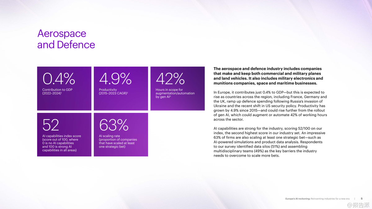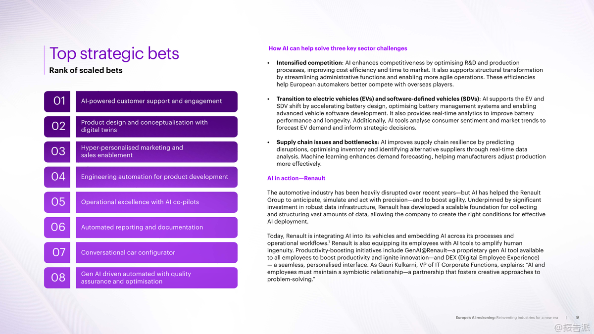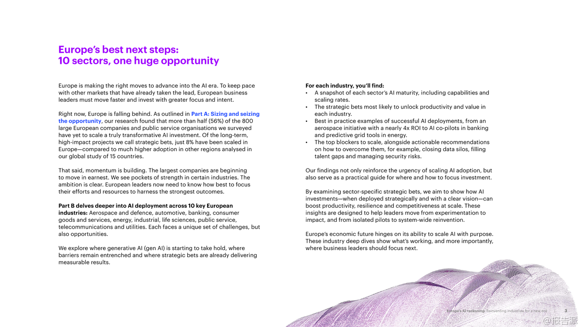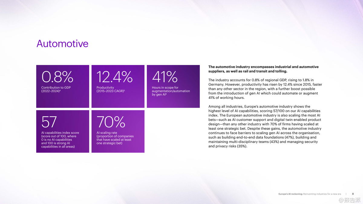 歐洲正站在人工智能變革的關(guān)鍵節(jié)點(diǎn)。 根據(jù)Accenture發(fā)布的《2025年歐洲AI審視:為新時(shí)代重塑產(chǎn)業(yè)格局》報(bào)告,盡管歐洲已在推進(jìn)AI戰(zhàn)略,但整體進(jìn)展仍落后于全球領(lǐng)先市場(chǎng)。 調(diào)研顯示,高達(dá)56%的歐洲大型企業(yè)及公共機(jī)構(gòu)尚未規(guī)?;渴鹫嬲哂凶兏镆饬x的AI項(xiàng)目,僅有8%的戰(zhàn)略級(jí)AI項(xiàng)目實(shí)現(xiàn)規(guī)模化落地,遠(yuǎn)低于其他地區(qū)水平。 然而,部分行業(yè)已展現(xiàn)出強(qiáng)勁勢(shì)頭,成為引領(lǐng)者。 報(bào)告聚焦歐洲10大核心產(chǎn)業(yè),揭示了AI應(yīng)用現(xiàn)狀、潛力與挑戰(zhàn)。 其中,汽車行業(yè)表現(xiàn)最為突出,AI能力指數(shù)達(dá)57/100,70%的企業(yè)已規(guī)?;辽僖豁?xiàng)戰(zhàn)略AI項(xiàng)目,如AI客服、數(shù)字孿生設(shè)計(jì)等。 航空航天與國防緊隨其后,AI能力指數(shù)52,63%企業(yè)完成規(guī)?;季?,AI仿真與產(chǎn)品數(shù)據(jù)分析成關(guān)鍵抓手。 相比之下,公用事業(yè)、電信和消費(fèi)品行業(yè)則面臨更大瓶頸,尤其是數(shù)據(jù)孤島、跨學(xué)科團(tuán)隊(duì)建設(shè)不足及安全風(fēng)險(xiǎn)等問題嚴(yán)重制約發(fā)展。 各行業(yè)AI賦能路徑清晰。 在汽車領(lǐng)域,AI助力電動(dòng)化與軟件定義車輛轉(zhuǎn)型,優(yōu)化電池管理與研發(fā)流程;銀行業(yè)利用AI提升反欺詐、客戶識(shí)別(KYC)與個(gè)性化服務(wù),NatWest通過AI通信教練顯著提升客戶滿意度;能源行業(yè)借助AI預(yù)測(cè)可再生能源波動(dòng)、優(yōu)化電網(wǎng)調(diào)度,Moeve公司通過原生數(shù)字化工廠實(shí)現(xiàn)高效生產(chǎn);工業(yè)領(lǐng)域如西門子推出“工業(yè)副駕駛”工具,提升工程師效率;生命科學(xué)方面,諾和諾德等企業(yè)探索AI加速藥物研發(fā),縮短從實(shí)驗(yàn)室到臨床的時(shí)間。 值得注意的是,生成式AI正在多個(gè)行業(yè)中釋放巨大潛力。 報(bào)告顯示,銀行69%、電信55%、生命科學(xué)49%的工作小時(shí)具備被AI增強(qiáng)或自動(dòng)化的能力。 成功案例表明,AI不僅提升效率,更推動(dòng)商業(yè)模式創(chuàng)新。 例如西班牙司法部采用AI法律搜索引擎Delfos,信息檢索時(shí)間減少40%;英國電信VMO2借助AI客服系統(tǒng),投訴解決率大幅提升,客戶滿意度顯著改善。 然而,規(guī)?;系K依然存在。 數(shù)據(jù)基礎(chǔ)薄弱、復(fù)合型人才短缺、安全合規(guī)壓力是普遍難題。 報(bào)告強(qiáng)調(diào),歐洲需加快構(gòu)建自主可控的AI生態(tài)系統(tǒng),推動(dòng)跨行業(yè)協(xié)作,強(qiáng)化中小企業(yè)支持,并制定統(tǒng)一的工業(yè)戰(zhàn)略。 Accenture呼吁企業(yè)領(lǐng)導(dǎo)者從“試驗(yàn)”轉(zhuǎn)向“影響”,將AI投資聚焦于高價(jià)值戰(zhàn)略場(chǎng)景,實(shí)現(xiàn)系統(tǒng)性重塑。 唯有如此,歐洲才能在全球AI競(jìng)爭(zhēng)中搶占先機(jī),實(shí)現(xiàn)包容性增長與長期競(jìng)爭(zhēng)力躍升。 出品方:Accenture 發(fā)布時(shí)間:2025年 文檔頁數(shù):40頁 |