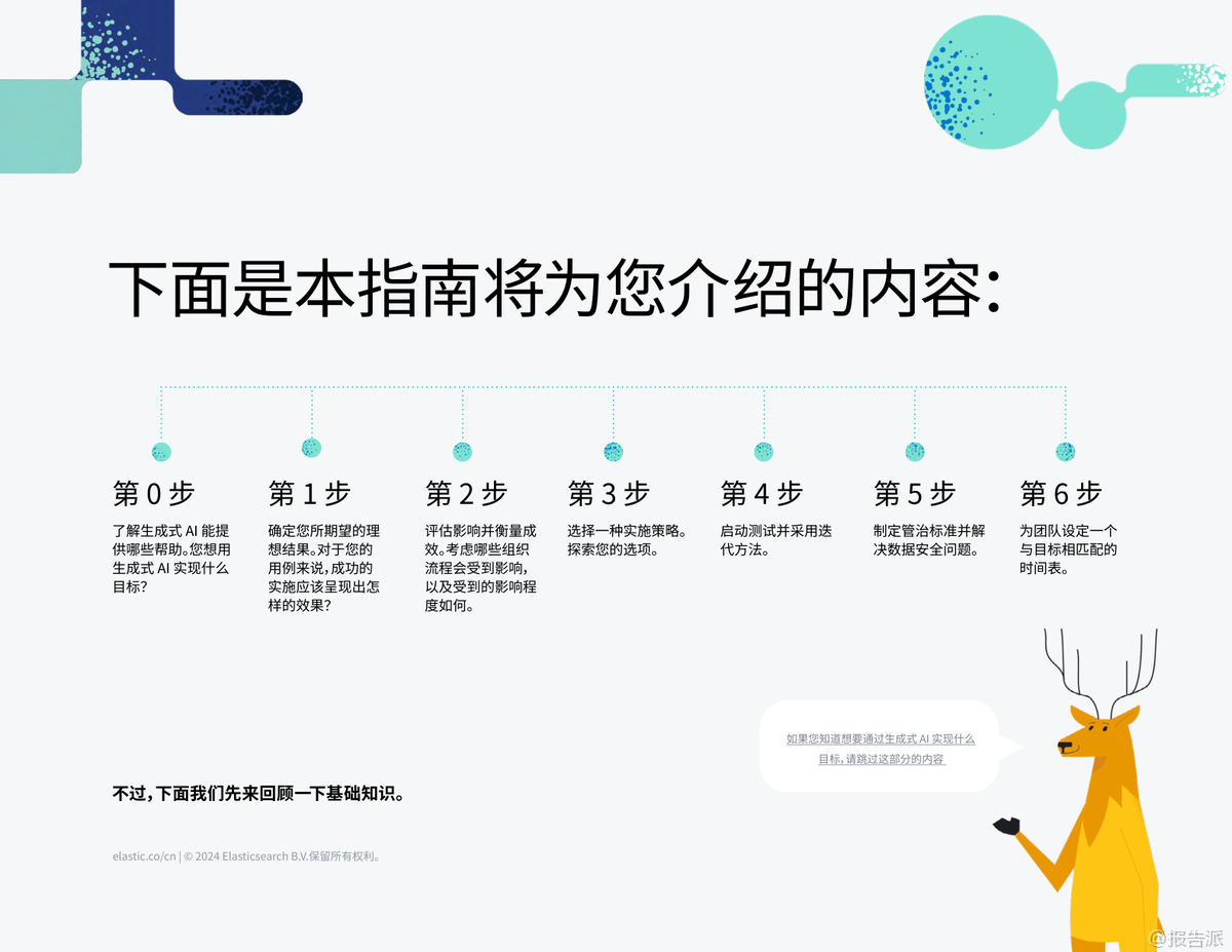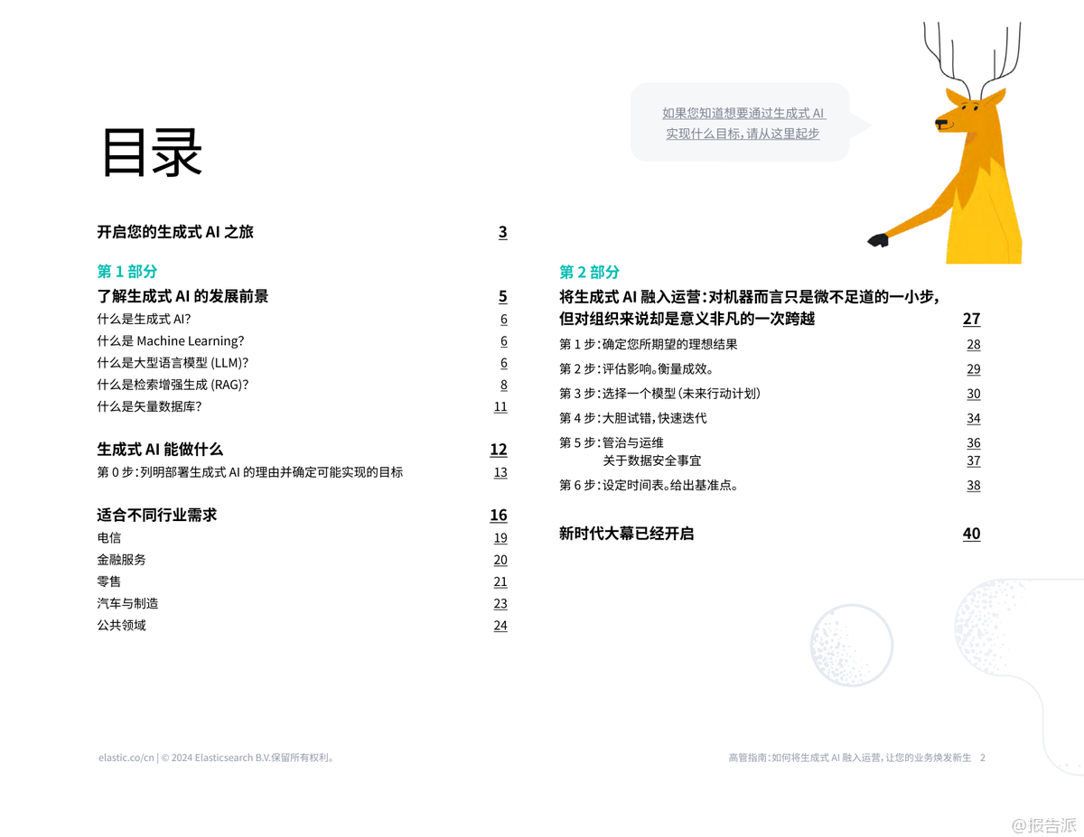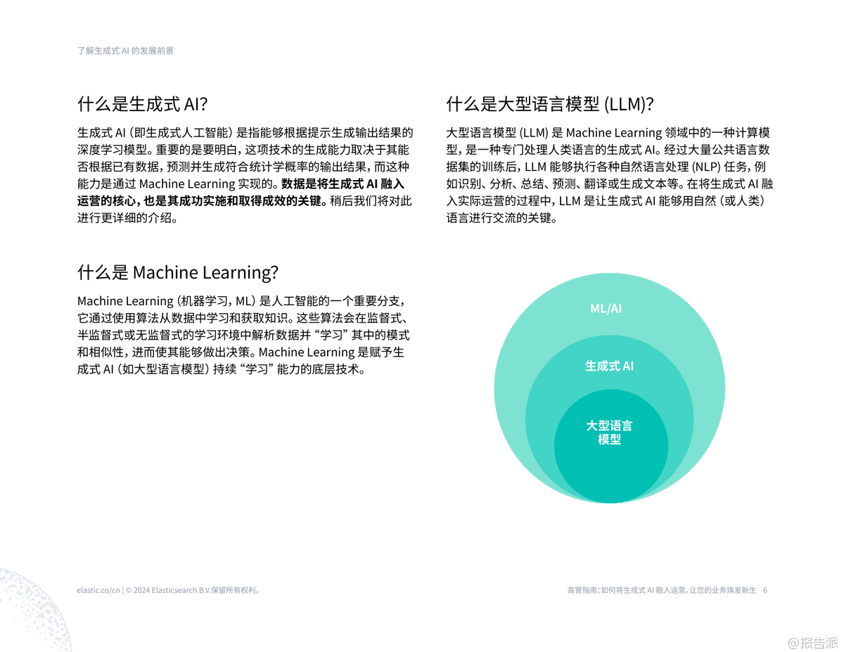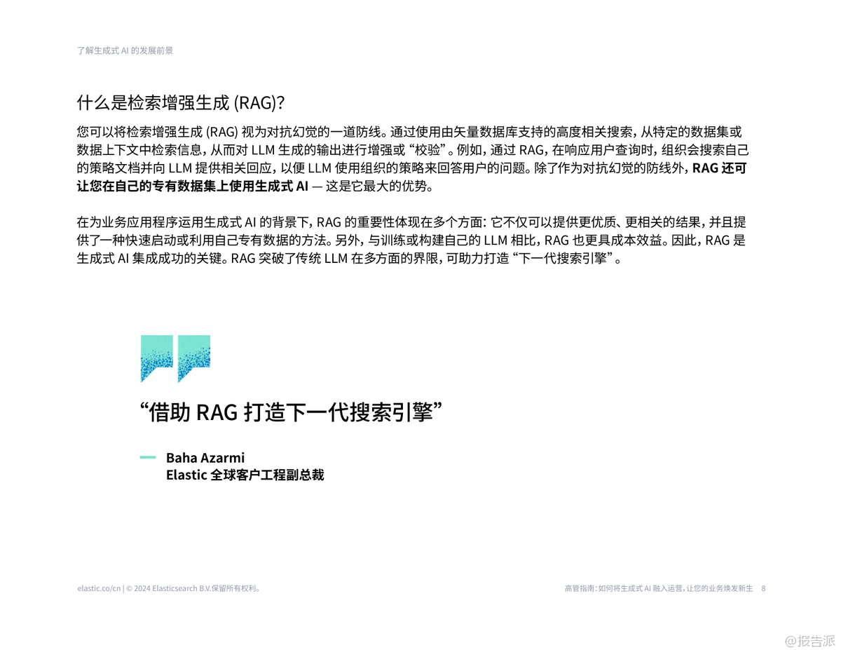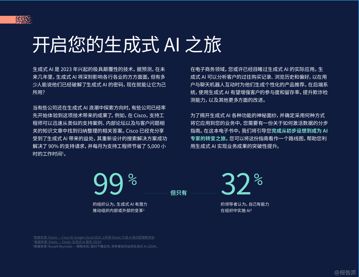 生成式AI已成為2023年以來最具顛覆性的技術(shù)趨勢,正在深刻重塑各行各業(yè)的運營模式。 根據(jù)Elastic發(fā)布的《2024年高管指南報告:如何將生成式AI融入運營》,企業(yè)若想真正釋放其潛力,必須從實驗走向系統(tǒng)化落地。 報告指出,盡管99%的組織認(rèn)為生成式AI具備推動變革的潛力,但僅有32%的領(lǐng)導(dǎo)者自信能夠在組織內(nèi)成功實施,這凸顯了從愿景到現(xiàn)實之間的巨大鴻溝。 報告的核心在于提供了一套從0到1的實用路線圖。 首要步驟是明確“為什么”——即第0步:列明部署生成式AI的理由并確定目標(biāo)。 企業(yè)不應(yīng)盲目跟風(fēng),而應(yīng)聚焦于解決具體痛點,如員工查找信息效率低下、客戶服務(wù)響應(yīng)慢或安全團(tuán)隊負(fù)擔(dān)過重。 通過與HR、IT、安全等受影響的團(tuán)隊緊密合作,確保用例選擇切中要害,例如為員工構(gòu)建一個能自動回答“我還有幾天年假”的智能助手。 報告強調(diào),生成式AI的成功落地依賴于關(guān)鍵技術(shù)的協(xié)同。 其中,檢索增強生成(RAG)被視為對抗“AI幻覺”(即生成錯誤信息)的關(guān)鍵防線。 RAG通過連接企業(yè)自身的專有數(shù)據(jù)(如政策文檔、客戶記錄),為大型語言模型(LLM)提供精準(zhǔn)上下文,確保輸出既相關(guān)又準(zhǔn)確。 結(jié)合矢量數(shù)據(jù)庫,RAG能實現(xiàn)語義搜索,理解用戶提問的真實意圖,而非僅僅匹配關(guān)鍵詞。 報告提倡“混合搜索”,即融合矢量語義搜索與傳統(tǒng)關(guān)鍵詞搜索,以提供最全面、最相關(guān)的答案。 報告為高管規(guī)劃了六步走的實施路徑:第1步,清晰定義理想結(jié)果;第2步,設(shè)定KPI(如客戶滿意度、問題解決時間)來量化影響;第3步,選擇技術(shù)模型,對比了從頭訓(xùn)練、微調(diào)模型和RAG三種方案,強烈推薦RAG因其成本低、部署快、數(shù)據(jù)隱私性高;第4步,采用大膽試錯、快速迭代的方式,從小規(guī)模試點開始;第5步,建立嚴(yán)格的治理與運維體系,涵蓋數(shù)據(jù)安全、合規(guī)性、偏見監(jiān)測和成本控制;第6步,設(shè)定30天和90天的時間表,快速驗證價值并規(guī)?;茝V。 報告展示了生成式AI在電信、金融、零售、制造和公共部門的廣泛應(yīng)用前景,預(yù)計將在這些領(lǐng)域創(chuàng)造數(shù)千億美元的經(jīng)濟(jì)價值。 典型案例包括思科利用生成式AI重構(gòu)搜索,每月為工程師節(jié)省5000小時;電商HSE通過AI優(yōu)化搜索,點擊率提升4%,客戶滿意度提高8%。 這些實踐證明,生成式AI不僅是技術(shù)升級,更是提升運營效率、客戶體驗和安全保障的戰(zhàn)略機遇。 報告最后呼吁,新時代已經(jīng)開啟,企業(yè)應(yīng)立即行動,將生成式AI融入核心運營,以保持競爭力。 出品方:Elastic 發(fā)布時間:2025年 文檔頁數(shù):41頁 |