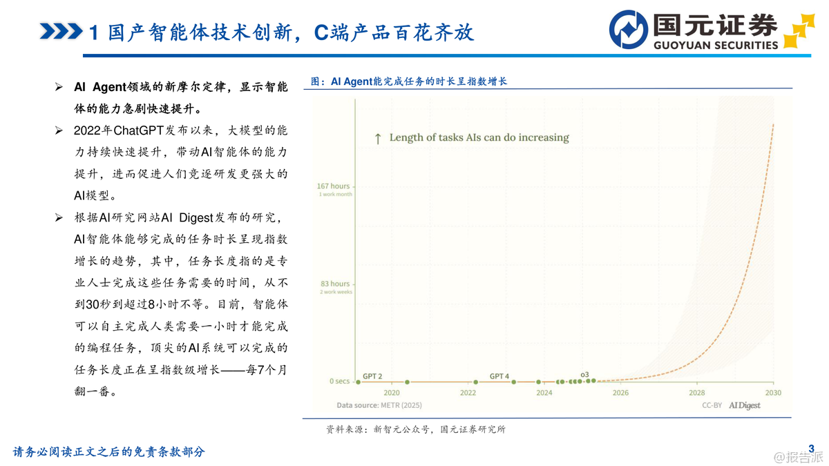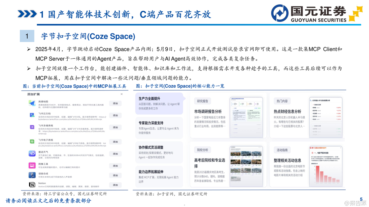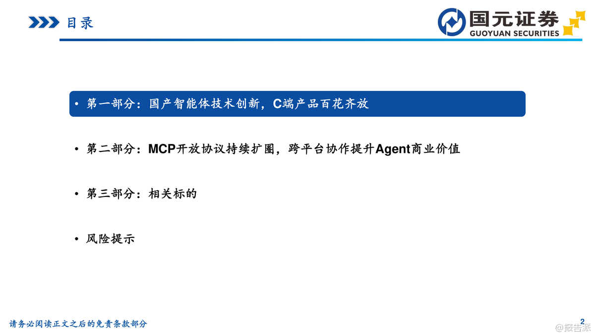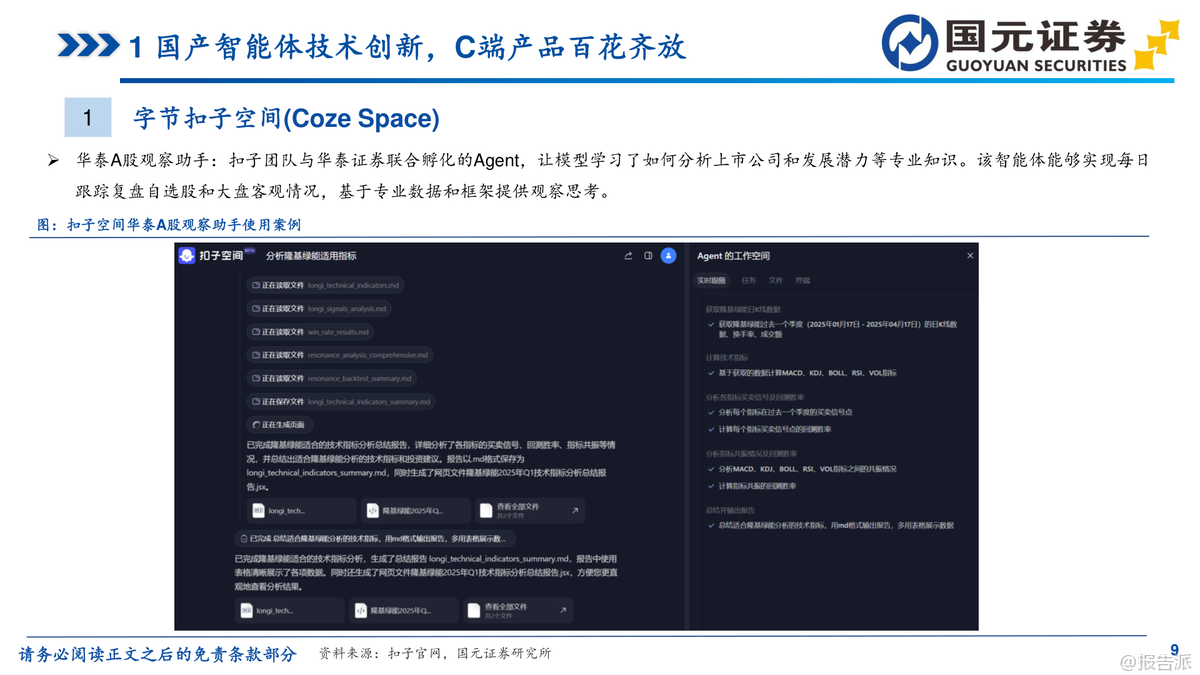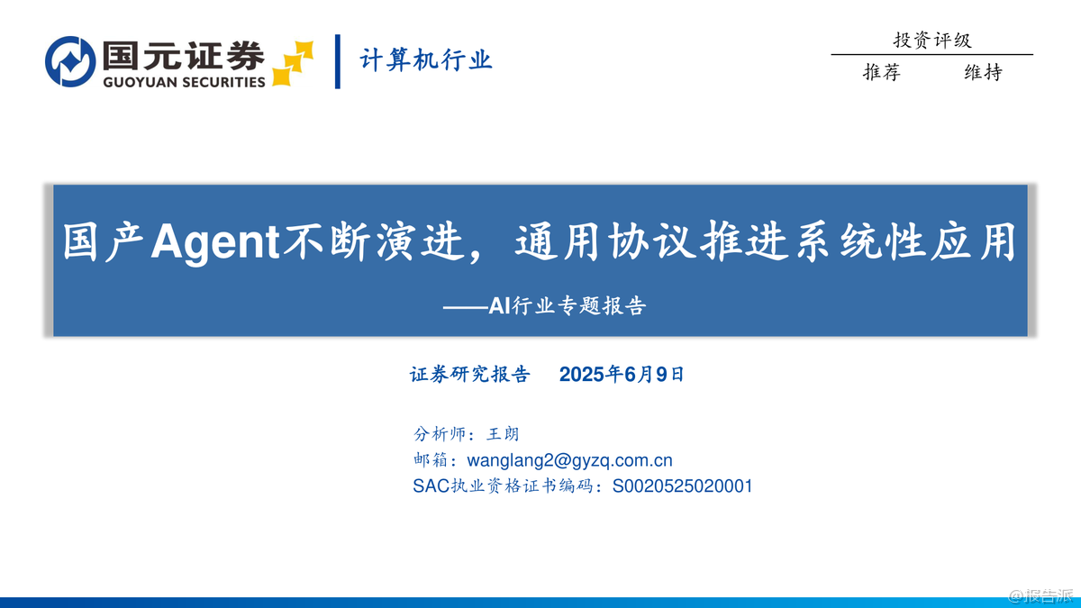 2025年,國產(chǎn)AI智能體(Agent)迎來爆發(fā)式發(fā)展,技術(shù)迭代加速,應用場景迅速拓展,正逐步重塑人機交互方式與產(chǎn)業(yè)生態(tài)格局。 根據(jù)國元證券發(fā)布的《AI行業(yè)專題報告》,AI Agent領(lǐng)域正遵循“新摩爾定律”,其能力每7個月翻一番,已能自主完成人類需耗時一小時以上的復雜任務,展現(xiàn)出指數(shù)級進化趨勢。 這一進步得益于大模型能力的持續(xù)躍升,推動智能體在任務規(guī)劃、工具調(diào)用和跨平臺協(xié)作方面實現(xiàn)突破。 在C端產(chǎn)品層面,多家科技巨頭紛紛推出通用型Agent平臺,爭奪AI時代的新型交互入口。 字節(jié)跳動推出的“扣子空間(Coze Space)”集成了MCP Client與Server功能,支持創(chuàng)建插件、智能體、知識庫和工作流,提供規(guī)劃與探索雙模式協(xié)作機制,滿足從輕量到復雜任務的不同需求。 百度發(fā)布“心響”APP,作為首個移動端通用超級智能體,用戶無需掌握提示詞即可通過自然語言下達指令,系統(tǒng)自動拆解任務并調(diào)用內(nèi)外部工具完成交付,目前已支持超200種工作、學習與生活場景。 昆侖萬維推出的“天工超級智能體”則聚焦多模態(tài)內(nèi)容生成,具備deep research能力,在GAIA榜單上位居全球第一,可一站式生成文檔、PPT、表格、播客及音視頻內(nèi)容。 此外,納米AI上線MCP萬能工具箱,成為國內(nèi)首家開放生態(tài)MCP平臺,覆蓋辦公、學術(shù)、金融、媒體等多場景,顯著降低開發(fā)者接入門檻。 在協(xié)議與生態(tài)建設方面,MCP(Model Context Protocol)和新興的A2A(Agent-to-Agent)協(xié)議正推動智能體間的互聯(lián)互通。 谷歌于2025年4月推出A2A開放協(xié)議,支持不同來源的智能體安全通信與協(xié)同執(zhí)行跨平臺任務,已有超50家技術(shù)伙伴響應。 微軟在Build大會上提出構(gòu)建“智能體網(wǎng)絡”(Agentic Web),旨在讓智能體像網(wǎng)頁一樣互聯(lián),并加入MCP指導委員會,推動標準化進程。 OpenAI也宣布其核心API Responses API正式支持MCP,簡化開發(fā)流程,提升執(zhí)行效率。 這些協(xié)議的普及,標志著AI系統(tǒng)正從孤立應用走向協(xié)同網(wǎng)絡,極大提升了Agent的商業(yè)價值與落地可能性。 報告還梳理了重點投資標的,涵蓋AI+編程與AI+辦公兩大方向。 在編程領(lǐng)域,卓易信息布局“IDE+AI”與“AI+IDE”雙產(chǎn)品線,構(gòu)建虛擬開發(fā)團隊;普元信息推進低代碼平臺與MCP協(xié)議融合,提升開發(fā)智能化水平。 在辦公領(lǐng)域,合合信息上線首批MCP Server服務,賦能復雜文檔解析;金山辦公升級WPS AI 2.0,推出“AI伴寫”等功能,深耕內(nèi)容創(chuàng)作與知識洞察場景。 總體來看,國產(chǎn)AI Agent正處于技術(shù)突破與生態(tài)構(gòu)建的關(guān)鍵階段,C端產(chǎn)品百花齊放,底層協(xié)議加速統(tǒng)一,跨平臺協(xié)作能力顯著增強,正朝著真正的自主智能邁進。 然而,報告也提示了技術(shù)進展不及預期、商業(yè)化落地困難及行業(yè)競爭加劇等潛在風險。 未來,誰能構(gòu)建更開放的生態(tài)、更高效的協(xié)作機制,誰就將在AI Agent時代占據(jù)先機。 出品方:國元證券 發(fā)布時間:2025年 文檔頁數(shù):38頁 |