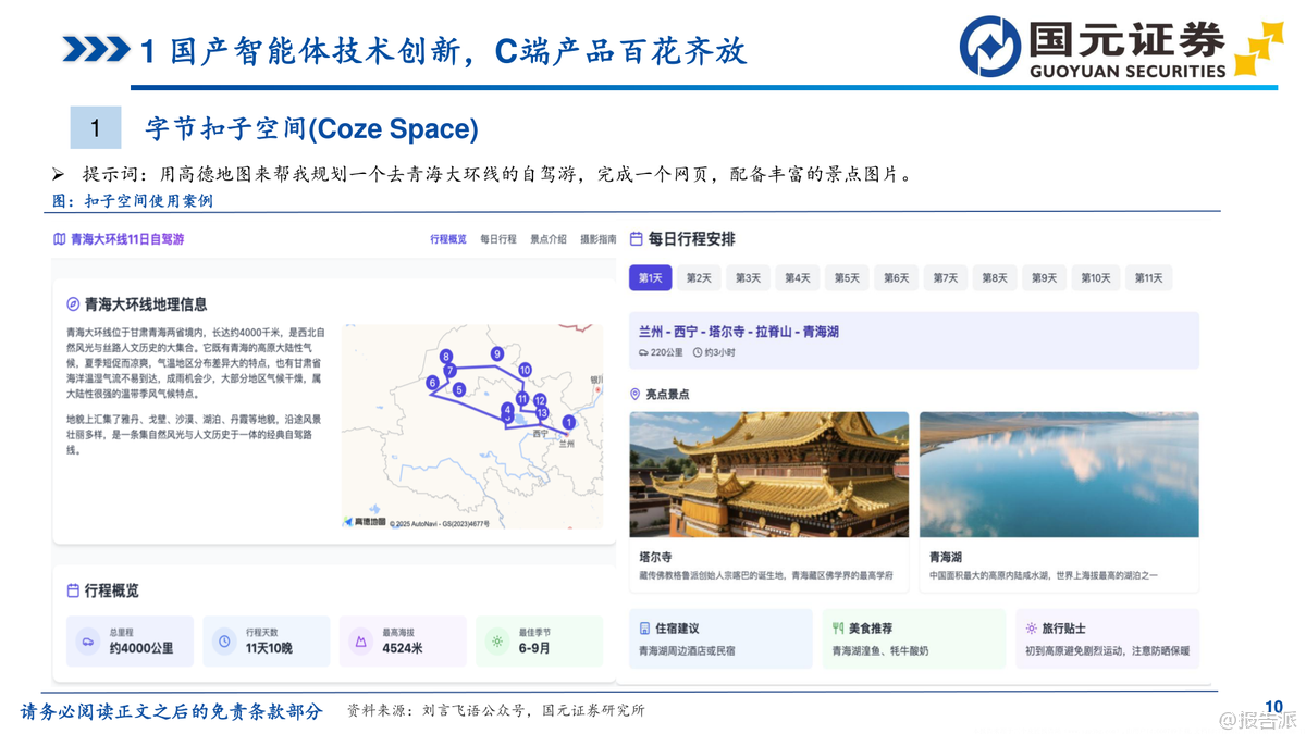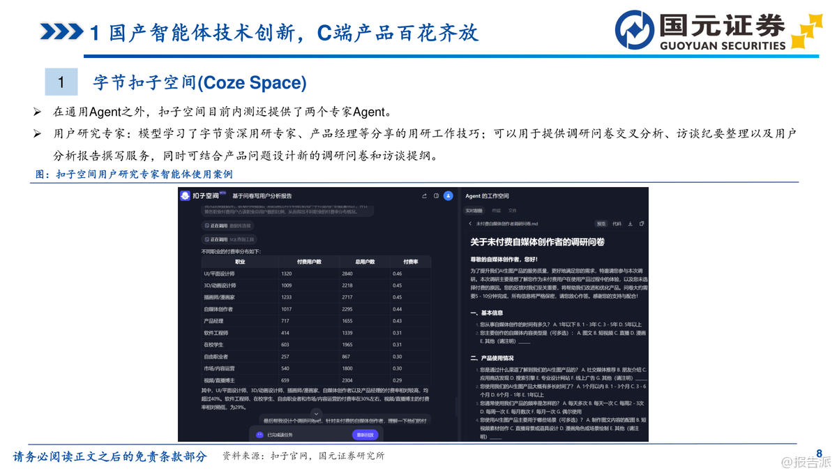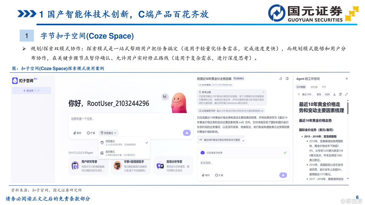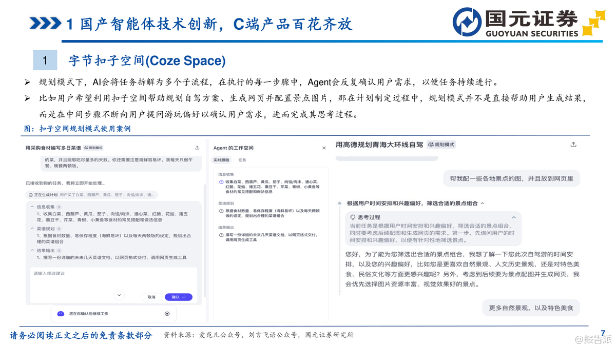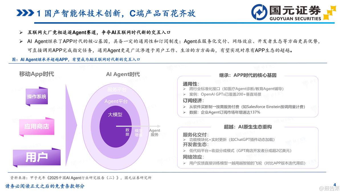 2025年,國產(chǎn)AI智能體(Agent)迎來爆發(fā)式發(fā)展,技術(shù)迭代加速,應用場景迅速拓展,正逐步重塑人機交互方式與產(chǎn)業(yè)生態(tài)格局。 根據(jù)國元證券發(fā)布的《AI行業(yè)專題報告》,AI Agent領(lǐng)域正遵循“新摩爾定律”,其能力每7個月翻一番,已能自主完成人類需耗時一小時以上的復雜任務,展現(xiàn)出指數(shù)級進化趨勢。 這一進步得益于大模型能力的持續(xù)躍升,推動智能體在任務規(guī)劃、工具調(diào)用和跨平臺協(xié)作方面實現(xiàn)突破。 在C端產(chǎn)品層面,多家科技巨頭紛紛推出通用型Agent平臺,爭奪AI時代的新型交互入口。 字節(jié)跳動推出的“扣子空間(Coze Space)”集成了MCP Client與Server功能,支持創(chuàng)建插件、智能體、知識庫和工作流,提供規(guī)劃與探索雙模式協(xié)作機制,滿足從輕量到復雜任務的不同需求。 百度發(fā)布“心響”APP,作為首個移動端通用超級智能體,用戶無需掌握提示詞即可通過自然語言下達指令,系統(tǒng)自動拆解任務并調(diào)用內(nèi)外部工具完成交付,目前已支持超200種工作、學習與生活場景。 昆侖萬維推出的“天工超級智能體”則聚焦多模態(tài)內(nèi)容生成,具備deep research能力,在GAIA榜單上位居全球第一,可一站式生成文檔、PPT、表格、播客及音視頻內(nèi)容。 此外,納米AI上線MCP萬能工具箱,成為國內(nèi)首家開放生態(tài)MCP平臺,覆蓋辦公、學術(shù)、金融、媒體等多場景,顯著降低開發(fā)者接入門檻。 在協(xié)議與生態(tài)建設方面,MCP(Model Context Protocol)和新興的A2A(Agent-to-Agent)協(xié)議正推動智能體間的互聯(lián)互通。 谷歌于2025年4月推出A2A開放協(xié)議,支持不同來源的智能體安全通信與協(xié)同執(zhí)行跨平臺任務,已有超50家技術(shù)伙伴響應。 微軟在Build大會上提出構(gòu)建“智能體網(wǎng)絡”(Agentic Web),旨在讓智能體像網(wǎng)頁一樣互聯(lián),并加入MCP指導委員會,推動標準化進程。 OpenAI也宣布其核心API Responses API正式支持MCP,簡化開發(fā)流程,提升執(zhí)行效率。 這些協(xié)議的普及,標志著AI系統(tǒng)正從孤立應用走向協(xié)同網(wǎng)絡,極大提升了Agent的商業(yè)價值與落地可能性。 報告還梳理了重點投資標的,涵蓋AI+編程與AI+辦公兩大方向。 在編程領(lǐng)域,卓易信息布局“IDE+AI”與“AI+IDE”雙產(chǎn)品線,構(gòu)建虛擬開發(fā)團隊;普元信息推進低代碼平臺與MCP協(xié)議融合,提升開發(fā)智能化水平。 在辦公領(lǐng)域,合合信息上線首批MCP Server服務,賦能復雜文檔解析;金山辦公升級WPS AI 2.0,推出“AI伴寫”等功能,深耕內(nèi)容創(chuàng)作與知識洞察場景。 總體來看,國產(chǎn)AI Agent正處于技術(shù)突破與生態(tài)構(gòu)建的關(guān)鍵階段,C端產(chǎn)品百花齊放,底層協(xié)議加速統(tǒng)一,跨平臺協(xié)作能力顯著增強,正朝著真正的自主智能邁進。 然而,報告也提示了技術(shù)進展不及預期、商業(yè)化落地困難及行業(yè)競爭加劇等潛在風險。 未來,誰能構(gòu)建更開放的生態(tài)、更高效的協(xié)作機制,誰就將在AI Agent時代占據(jù)先機。 出品方:國元證券 發(fā)布時間:2025年 文檔頁數(shù):38頁 |