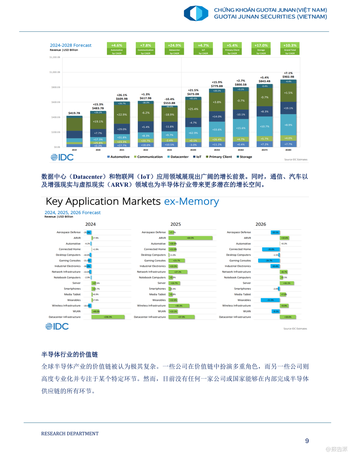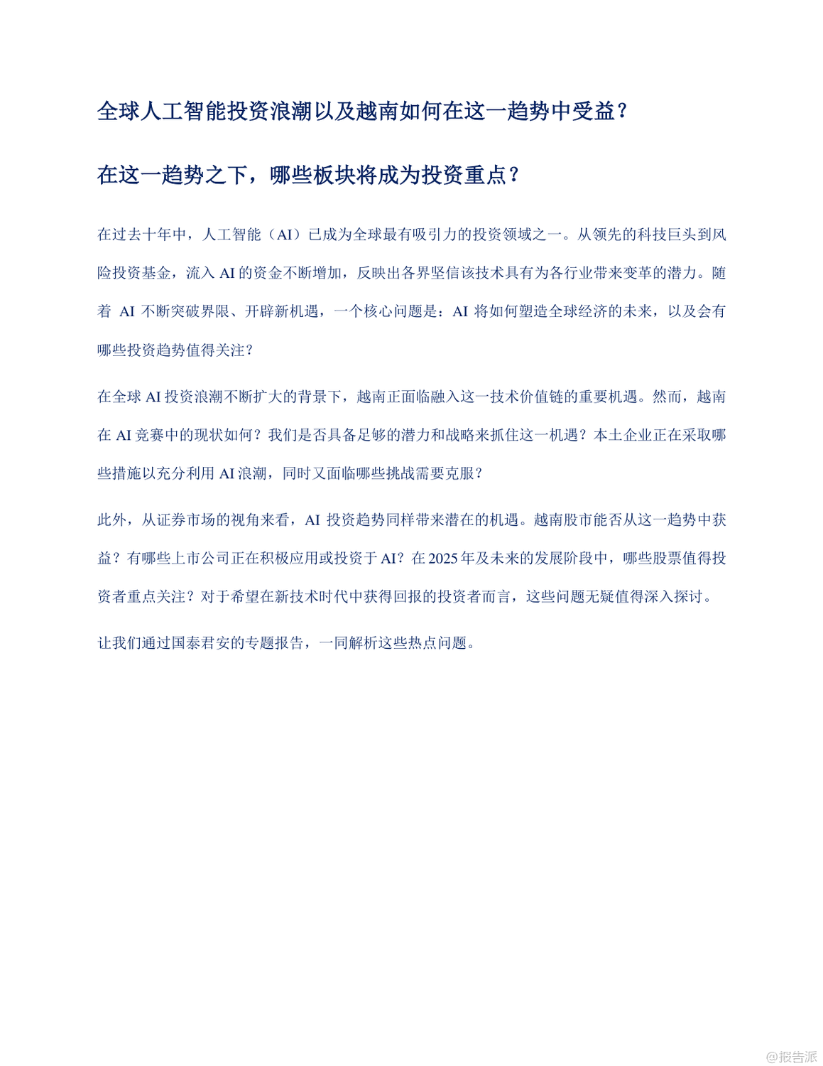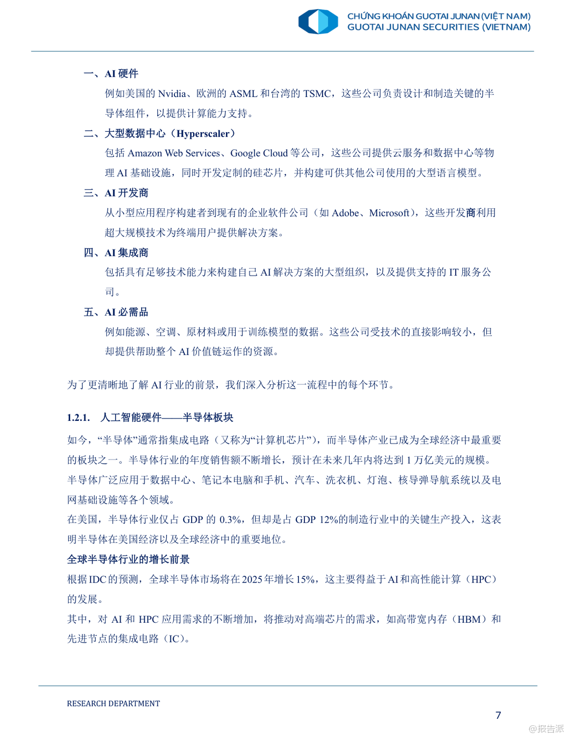 在全球人工智能(AI)投資浪潮持續(xù)升溫的背景下,越南正迎來深度融入全球科技價(jià)值鏈的歷史性機(jī)遇。 這份由國(guó)泰君安發(fā)布的《2025年人工智能時(shí)代及越南股市的投資機(jī)會(huì)報(bào)告》系統(tǒng)梳理了AI產(chǎn)業(yè)的發(fā)展趨勢(shì)、全球半導(dǎo)體與數(shù)據(jù)中心布局演變,并聚焦越南在新一輪科技革命中的戰(zhàn)略定位與投資潛力。 報(bào)告指出,2024年全球AI市場(chǎng)規(guī)模已突破1840億美元,預(yù)計(jì)到2029年將飆升至1.1萬(wàn)億美元,年復(fù)合增長(zhǎng)率高達(dá)39.7%。 其中,生成式AI(GenAI)成為增長(zhǎng)最快的核心引擎,未來五年增速有望達(dá)到59.2%。 這一趨勢(shì)正推動(dòng)全球科技巨頭與風(fēng)投機(jī)構(gòu)加速布局,形成以半導(dǎo)體、數(shù)據(jù)中心、AI開發(fā)與集成為主的完整價(jià)值鏈。 在這一背景下,越南憑借低成本勞動(dòng)力、年輕且高素質(zhì)的STEM人才儲(chǔ)備、優(yōu)越的地緣位置以及政府強(qiáng)有力的政策支持,正逐步成為全球半導(dǎo)體產(chǎn)業(yè)鏈轉(zhuǎn)移的關(guān)鍵承接地。 目前,越南已吸引英特爾、三星、NVIDIA、Amkor等國(guó)際巨頭投資,累計(jì)FDI項(xiàng)目達(dá)174個(gè),注冊(cè)資金近116億美元。 越南政府更于2024年出臺(tái)《半導(dǎo)體工業(yè)發(fā)展戰(zhàn)略》,明確分三階段打造本土芯片設(shè)計(jì)與制造能力,目標(biāo)到2030年培育5萬(wàn)名半導(dǎo)體工程師,并建設(shè)首座晶圓廠。 盡管越南當(dāng)前仍主要集中于附加值較低的封裝測(cè)試(OSAT)環(huán)節(jié),但本土企業(yè)如FPT、Viettel已開始向芯片設(shè)計(jì)與研發(fā)邁進(jìn)。 FPT已成立半導(dǎo)體子公司,獲得超7000萬(wàn)顆芯片訂單,并計(jì)劃與NVIDIA共建2億美元AI工廠。 與此同時(shí),越南數(shù)據(jù)中心市場(chǎng)也呈現(xiàn)爆發(fā)式增長(zhǎng),2024年市場(chǎng)規(guī)模預(yù)計(jì)達(dá)21.6億美元,得益于5G商用、云計(jì)算普及及國(guó)際科技企業(yè)本地化部署需求。 報(bào)告認(rèn)為,AI時(shí)代為越南股市帶來結(jié)構(gòu)性投資機(jī)遇。 重點(diǎn)推薦四類標(biāo)的:一是覆蓋AI全產(chǎn)業(yè)鏈的科技龍頭FPT;二是受益于5G與智慧城市建設(shè)的電信基建商CTR;三是為半導(dǎo)體生產(chǎn)提供關(guān)鍵原材料黃磷的化工企業(yè)DGC;四是布局工業(yè)區(qū)數(shù)字基礎(chǔ)設(shè)施與數(shù)據(jù)中心的綜合服務(wù)商TTN。 總體來看,越南正從“世界工廠”向“區(qū)域科技樞紐”轉(zhuǎn)型。 雖然在核心技術(shù)、人才儲(chǔ)備和能源配套方面仍面臨挑戰(zhàn),但在全球供應(yīng)鏈重構(gòu)與AI技術(shù)擴(kuò)散的雙重驅(qū)動(dòng)下,越南有望在2025年及未來成為亞太地區(qū)不可忽視的科技投資新高地。 出品方:國(guó)泰君安 發(fā)布時(shí)間:2025年 文檔頁(yè)數(shù):59頁(yè) |