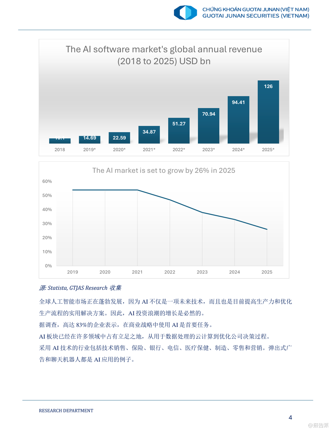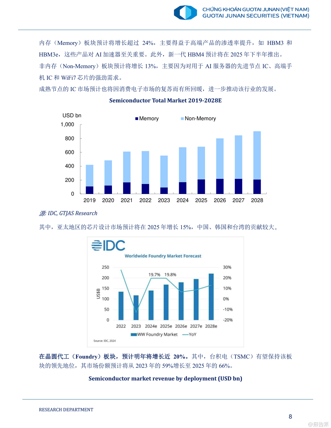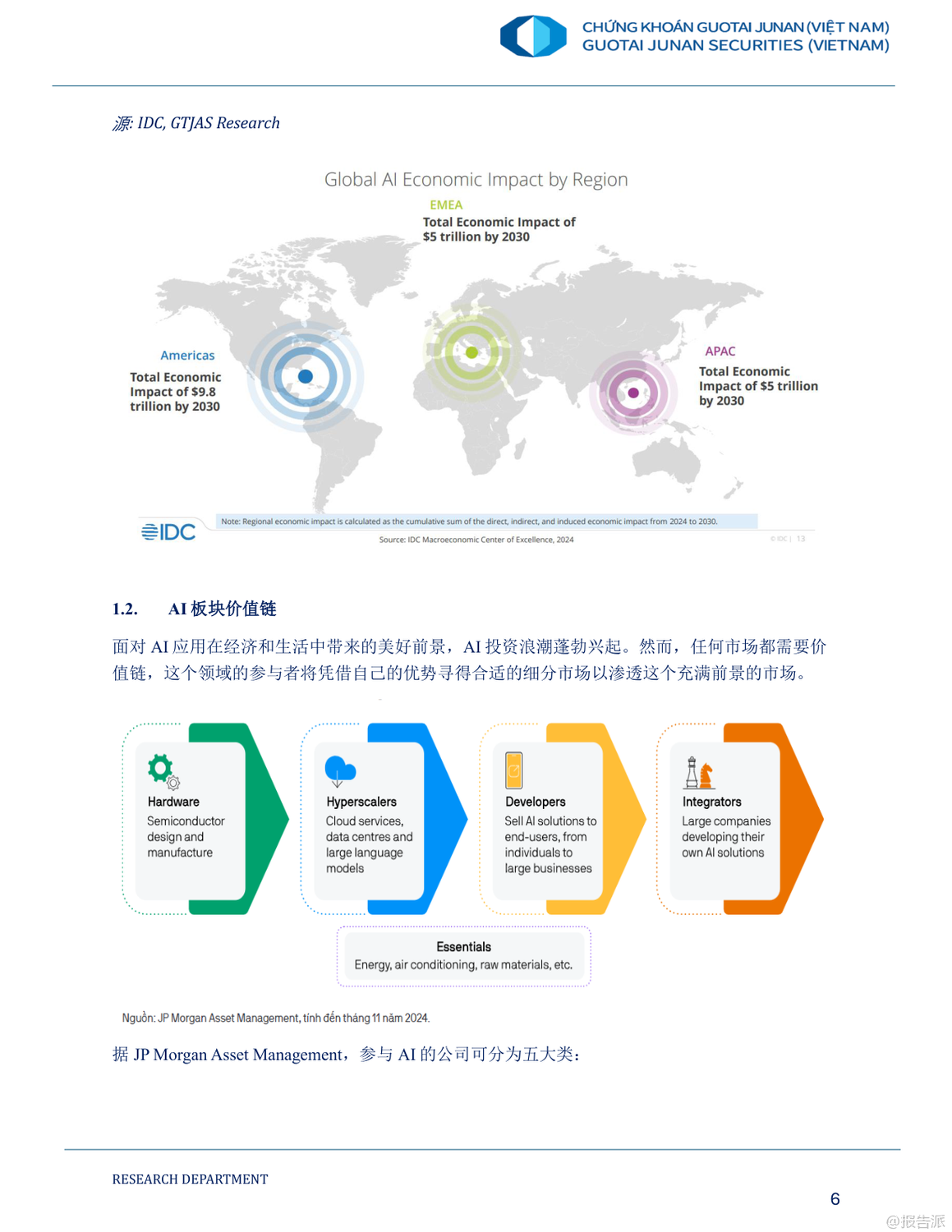 在全球人工智能(AI)投資浪潮持續(xù)升溫的背景下,越南正迎來深度融入全球科技價(jià)值鏈的歷史性機(jī)遇。 這份由國(guó)泰君安發(fā)布的《2025年人工智能時(shí)代及越南股市的投資機(jī)會(huì)報(bào)告》系統(tǒng)梳理了AI產(chǎn)業(yè)的發(fā)展趨勢(shì)、全球半導(dǎo)體與數(shù)據(jù)中心布局演變,并聚焦越南在新一輪科技革命中的戰(zhàn)略定位與投資潛力。 報(bào)告指出,2024年全球AI市場(chǎng)規(guī)模已突破1840億美元,預(yù)計(jì)到2029年將飆升至1.1萬(wàn)億美元,年復(fù)合增長(zhǎng)率高達(dá)39.7%。 其中,生成式AI(GenAI)成為增長(zhǎng)最快的核心引擎,未來五年增速有望達(dá)到59.2%。 這一趨勢(shì)正推動(dòng)全球科技巨頭與風(fēng)投機(jī)構(gòu)加速布局,形成以半導(dǎo)體、數(shù)據(jù)中心、AI開發(fā)與集成為主的完整價(jià)值鏈。 在這一背景下,越南憑借低成本勞動(dòng)力、年輕且高素質(zhì)的STEM人才儲(chǔ)備、優(yōu)越的地緣位置以及政府強(qiáng)有力的政策支持,正逐步成為全球半導(dǎo)體產(chǎn)業(yè)鏈轉(zhuǎn)移的關(guān)鍵承接地。 目前,越南已吸引英特爾、三星、NVIDIA、Amkor等國(guó)際巨頭投資,累計(jì)FDI項(xiàng)目達(dá)174個(gè),注冊(cè)資金近116億美元。 越南政府更于2024年出臺(tái)《半導(dǎo)體工業(yè)發(fā)展戰(zhàn)略》,明確分三階段打造本土芯片設(shè)計(jì)與制造能力,目標(biāo)到2030年培育5萬(wàn)名半導(dǎo)體工程師,并建設(shè)首座晶圓廠。 盡管越南當(dāng)前仍主要集中于附加值較低的封裝測(cè)試(OSAT)環(huán)節(jié),但本土企業(yè)如FPT、Viettel已開始向芯片設(shè)計(jì)與研發(fā)邁進(jìn)。 FPT已成立半導(dǎo)體子公司,獲得超7000萬(wàn)顆芯片訂單,并計(jì)劃與NVIDIA共建2億美元AI工廠。 與此同時(shí),越南數(shù)據(jù)中心市場(chǎng)也呈現(xiàn)爆發(fā)式增長(zhǎng),2024年市場(chǎng)規(guī)模預(yù)計(jì)達(dá)21.6億美元,得益于5G商用、云計(jì)算普及及國(guó)際科技企業(yè)本地化部署需求。 報(bào)告認(rèn)為,AI時(shí)代為越南股市帶來結(jié)構(gòu)性投資機(jī)遇。 重點(diǎn)推薦四類標(biāo)的:一是覆蓋AI全產(chǎn)業(yè)鏈的科技龍頭FPT;二是受益于5G與智慧城市建設(shè)的電信基建商CTR;三是為半導(dǎo)體生產(chǎn)提供關(guān)鍵原材料黃磷的化工企業(yè)DGC;四是布局工業(yè)區(qū)數(shù)字基礎(chǔ)設(shè)施與數(shù)據(jù)中心的綜合服務(wù)商TTN。 總體來看,越南正從“世界工廠”向“區(qū)域科技樞紐”轉(zhuǎn)型。 雖然在核心技術(shù)、人才儲(chǔ)備和能源配套方面仍面臨挑戰(zhàn),但在全球供應(yīng)鏈重構(gòu)與AI技術(shù)擴(kuò)散的雙重驅(qū)動(dòng)下,越南有望在2025年及未來成為亞太地區(qū)不可忽視的科技投資新高地。 出品方:國(guó)泰君安 發(fā)布時(shí)間:2025年 文檔頁(yè)數(shù):59頁(yè) |