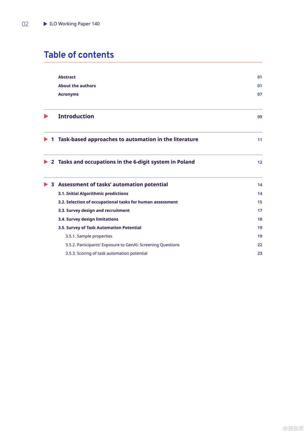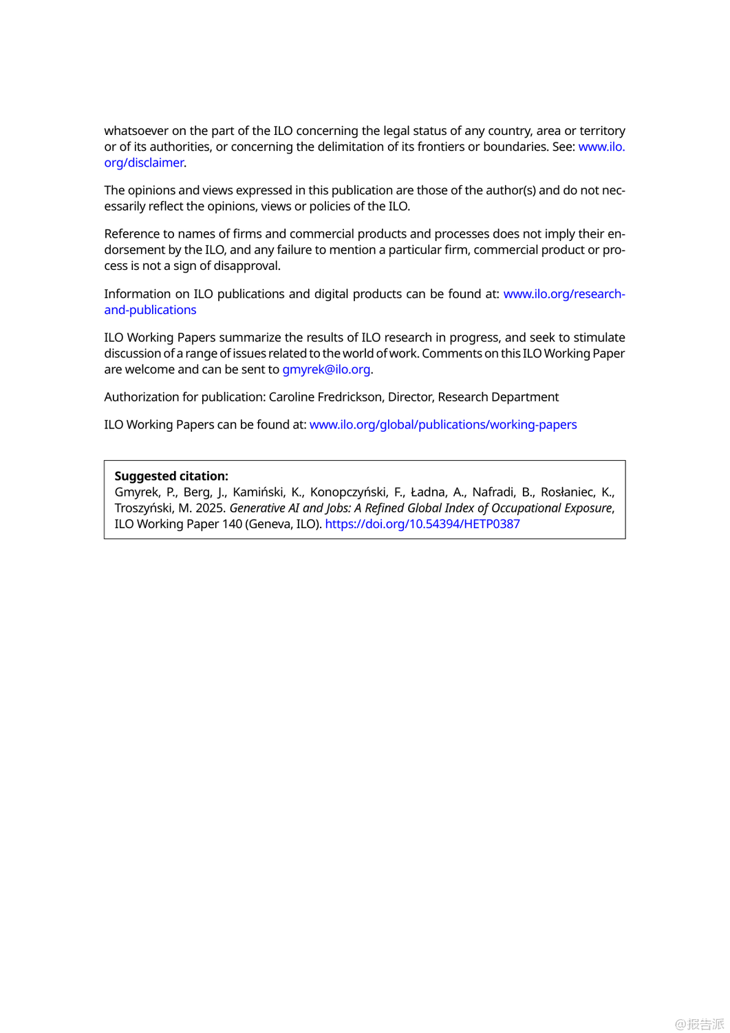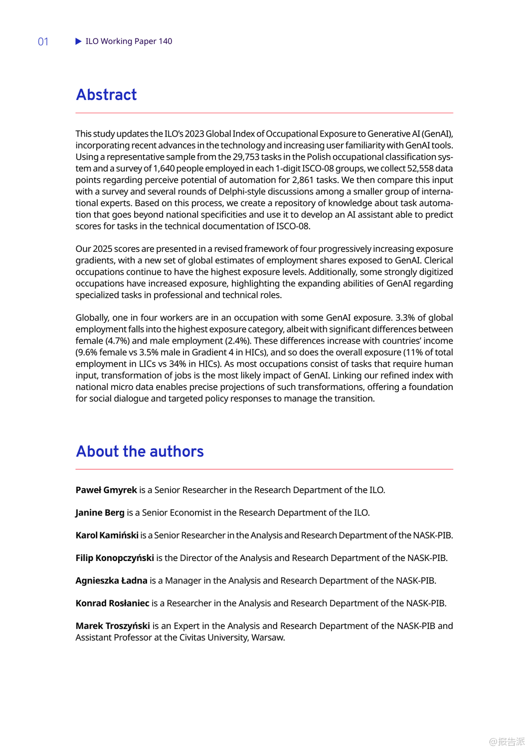 國際勞工組織(ILO)最新發(fā)布的《生成式人工智能與工作:一個精確的全球職業(yè)暴露指數(shù)》報告,基于對近3萬項工作任務的深入分析,揭示了生成式AI對全球勞動力市場的深遠影響。 該研究結合波蘭6位數(shù)職業(yè)分類系統(tǒng)及1640名在職人員的調(diào)查數(shù)據(jù),構建了一個更為精細的職業(yè)暴露評估體系,涵蓋52558條任務自動化潛力評分,并通過專家驗證和AI模型預測,形成全球首個高精度生成式AI職業(yè)暴露指數(shù)。 報告將職業(yè)暴露劃分為四個梯度:第四梯度為最高暴露級別,任務自動化一致性高,主要集中于文職類崗位,如數(shù)據(jù)錄入員、會計文員、行政秘書等;第三梯度為顯著暴露但任務差異大,包括金融分析師、網(wǎng)頁開發(fā)者、翻譯等專業(yè)崗位;第二和第一梯度則分別為中等和低暴露水平,覆蓋更多需要人際互動或復雜判斷的職業(yè)。 值得注意的是,盡管部分技術崗位如軟件開發(fā)、多媒體設計的暴露程度有所上升,反映出生成式AI在圖像、音頻、視頻等多模態(tài)能力上的突破,但絕大多數(shù)職業(yè)仍包含需人類參與的核心任務,因此“崗位重塑”而非“全面替代”是更可能的發(fā)展路徑。 全球約四分之一的勞動者處于某種形式的生成式AI暴露之下,其中高收入國家比例高達34%,而低收入國家僅為11%。 性別差異尤為突出:女性就業(yè)在高暴露梯度中的占比遠超男性,全球范圍內(nèi),4.7%的女性崗位屬于最高暴露等級,而男性僅為2.4%;在高收入國家,這一差距擴大至9.6%對3.5%。 這主要源于女性在文職、客服、財務等高度數(shù)字化且流程化職業(yè)中的集中分布。 報告強調(diào),當前的暴露評估反映的是技術可行性上限,實際影響受限于基礎設施、數(shù)字技能、成本以及社會接受度等因素。 例如,即便技術上可行,消費者可能仍偏好真人播報新聞,銀行也傾向于保留人工審批貸款。 此外,自動化可能導致崗位需求總量下降,即使未被完全取代,工作內(nèi)容也可能變得碎片化或難以持續(xù)。 未來的研究方向應關注如何通過技能培訓和社會對話,推動人機協(xié)同,實現(xiàn)生產(chǎn)力提升的同時保障勞動者權益,避免加劇不平等。 出品方:ILO 發(fā)布時間:2025年 文檔頁數(shù):72頁 |