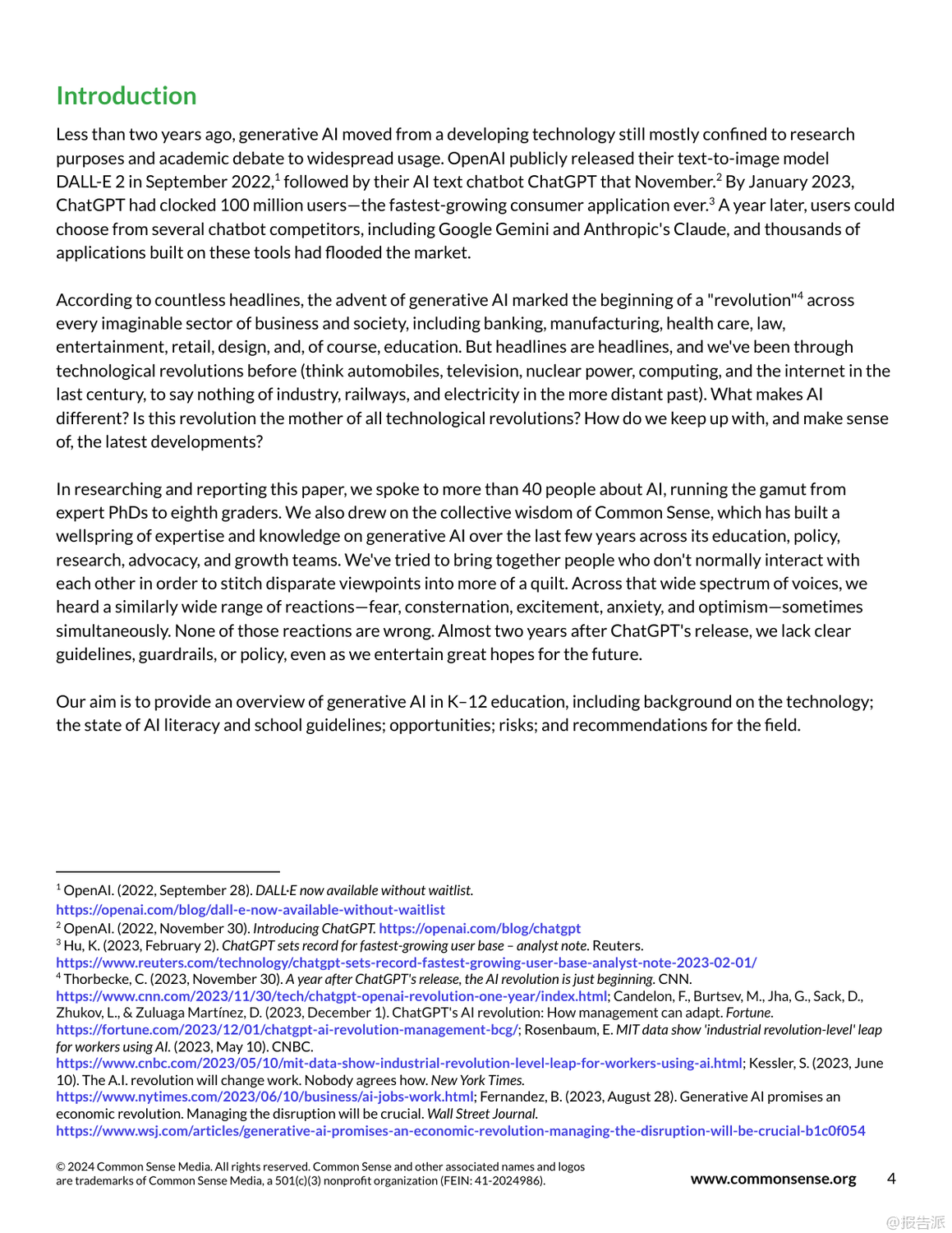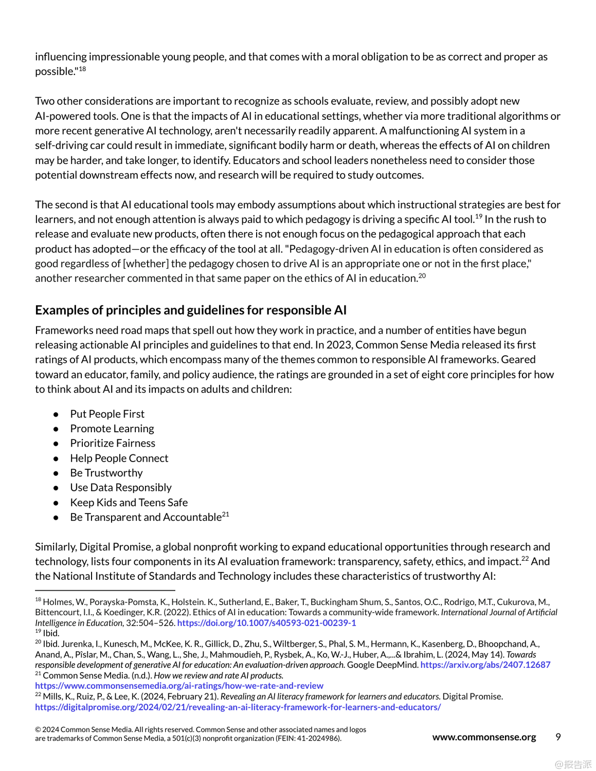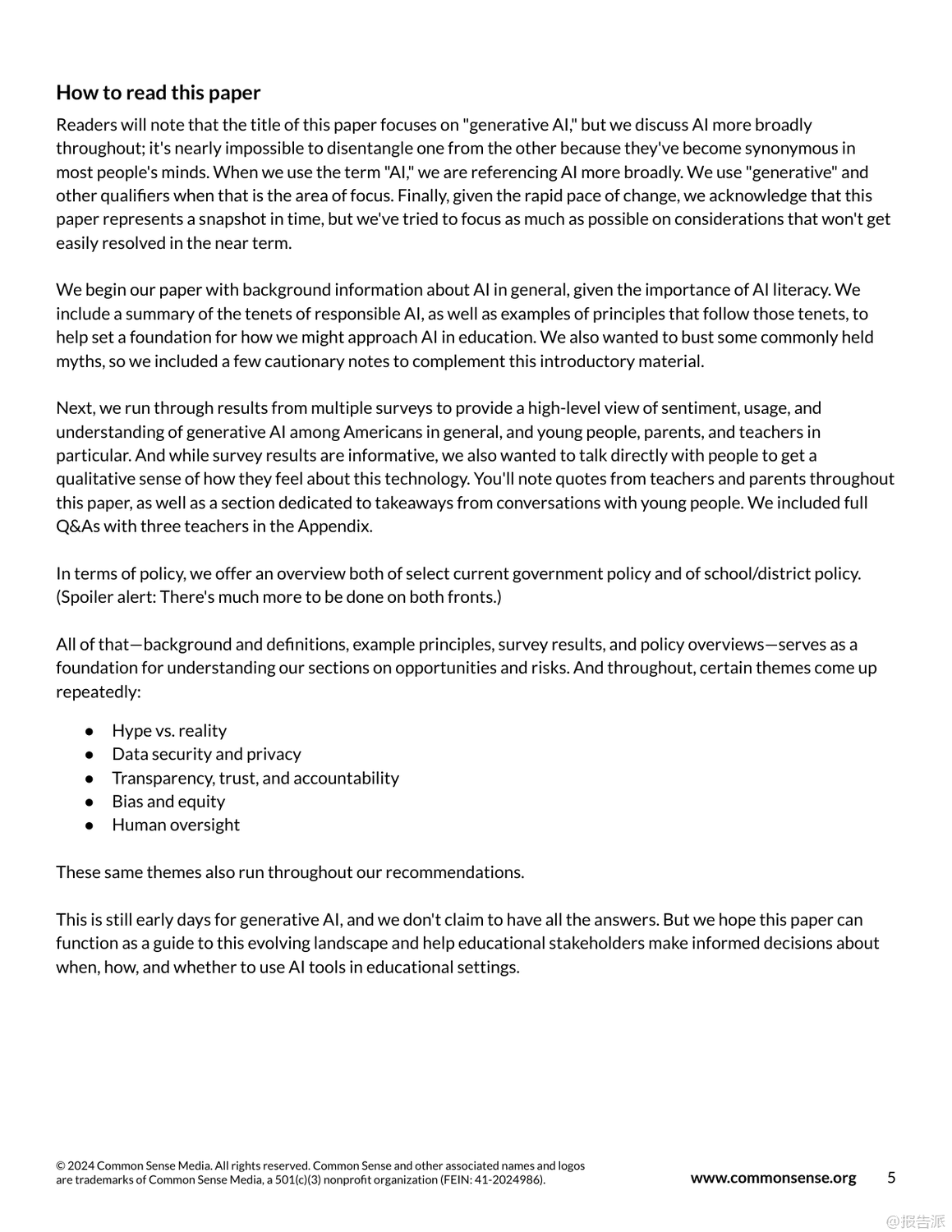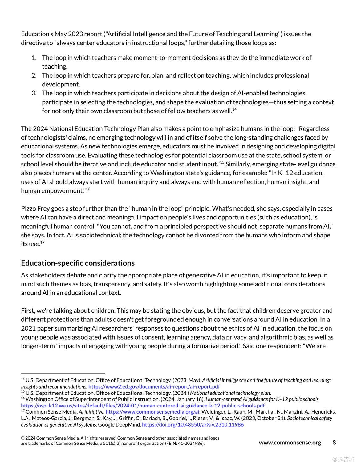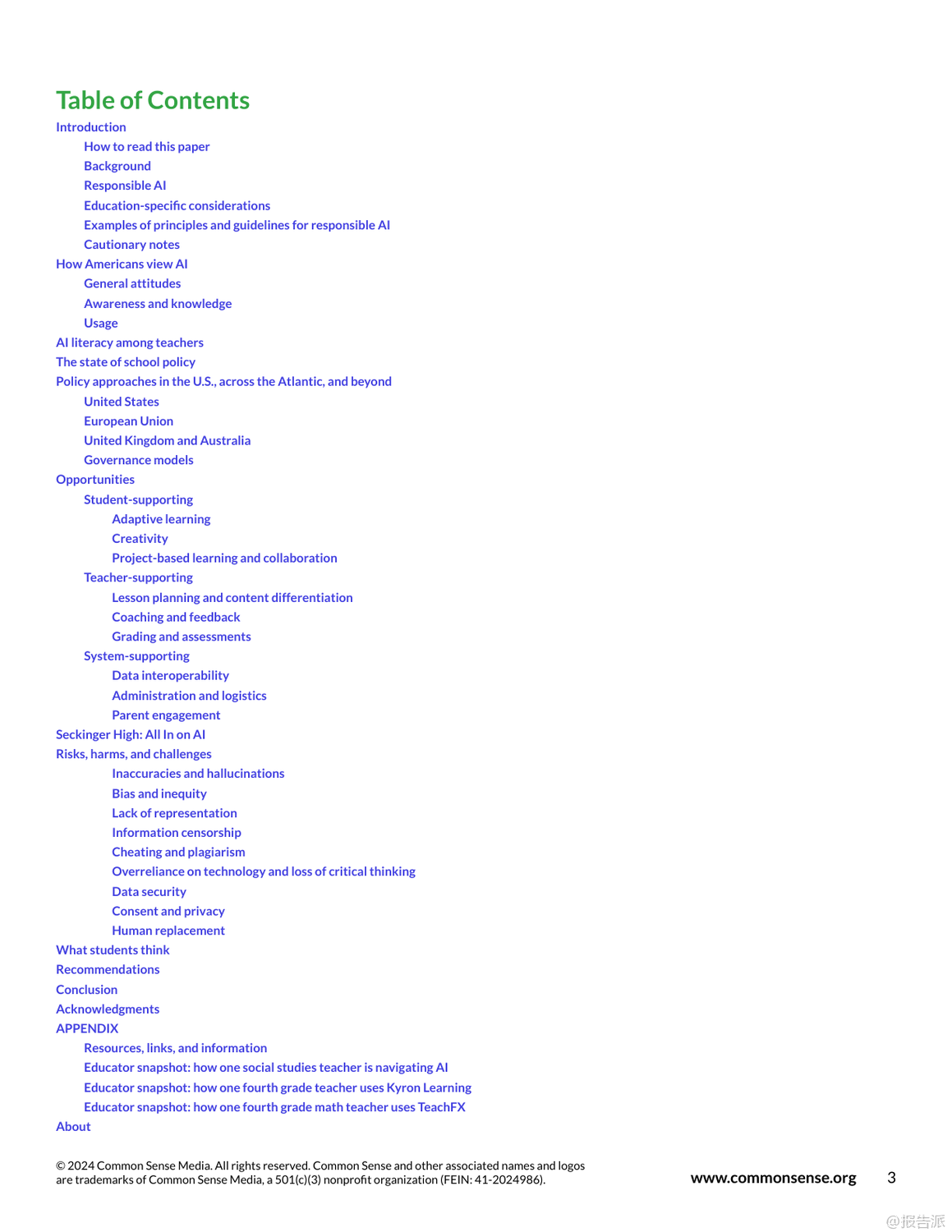 生成式AI正以前所未有的速度滲透進K-12教育領(lǐng)域,帶來變革的同時也引發(fā)深刻反思。 自2022年OpenAI發(fā)布DALL-E2和ChatGPT以來,AI技術(shù)迅速從實驗室走向大眾,短短一年內(nèi)ChatGPT用戶突破1億,成為歷史上增長最快的消費級應用。 這一浪潮席卷各行各業(yè),教育也不例外。 然而,熱潮背后是普遍存在的認知誤區(qū)、政策空白與倫理風險。 當前美國公眾對AI的態(tài)度呈現(xiàn)明顯分化:超半數(shù)成年人對AI感到擔憂而非興奮,教師群體中近半數(shù)尚未使用過AI工具,僅有23%的學區(qū)為教師提供了相關(guān)培訓。 學生使用情況則更為活躍,約一半14至22歲年輕人曾使用生成式AI,其中黑人和拉丁裔青少年的使用頻率顯著高于白人同齡人。 這種不均衡的使用現(xiàn)狀凸顯了數(shù)字鴻溝與公平性問題。 在實踐層面,AI展現(xiàn)出三大支持方向:學生支持、教師支持與系統(tǒng)支持。 在學生端,AI可用于自適應學習輔導(如Eedi、Kyron Learning)、創(chuàng)意項目協(xié)作(如Giant Room設(shè)計工作坊)及探究式學習。 教師則利用AI輔助備課、差異化教學設(shè)計、即時反饋(如TeachFX)以及評估優(yōu)化。 學校系統(tǒng)還可借助AI提升數(shù)據(jù)互通、行政效率與家校溝通。 但與此同時,五大核心風險不容忽視:一是準確性風險,AI常產(chǎn)生“幻覺”式錯誤信息;二是偏見與不公,訓練數(shù)據(jù)中的結(jié)構(gòu)性偏差可能被放大;三是隱私安全,學生敏感數(shù)據(jù)面臨泄露與濫用風險;四是學術(shù)誠信危機,AI代寫導致抄襲邊界模糊;五是過度依賴技術(shù),削弱學生批判性思維與“有效掙扎”的學習過程。 尤為關(guān)鍵的是,當前絕大多數(shù)學區(qū)缺乏明確的AI使用政策。 調(diào)查顯示,僅5%的學區(qū)制定了專門的生成式AI政策,家長和學生普遍缺乏指導。 監(jiān)管方面,美國尚無聯(lián)邦層級AI立法,主要依靠COPPA等舊規(guī)調(diào)整;歐盟已通過《人工智能法案》,確立高風險系統(tǒng)監(jiān)管框架;英國與澳大利亞仍處于觀望階段。 報告強調(diào),AI不應替代人類教育者,而應作為增強工具。 未來路徑需聚焦四大方向:第一,全面推進AI素養(yǎng)教育,覆蓋師生與家長;第二,建立清晰的使用指南與倫理規(guī)范;第三,強化采購標準,確保產(chǎn)品透明、安全、可問責;第四,推動參與式設(shè)計,讓教師、學生與社區(qū)共同參與AI教育產(chǎn)品的開發(fā)與治理。 真正的教育變革不在于技術(shù)本身,而在于我們?nèi)绾斡幸庾R地引導其發(fā)展。 與其被動應對,不如主動塑造一個以人為本、公平可信、促進深度學習的AI教育生態(tài)。 出品方:CommonSense 發(fā)布時間:2025年 文檔頁數(shù):63頁 |