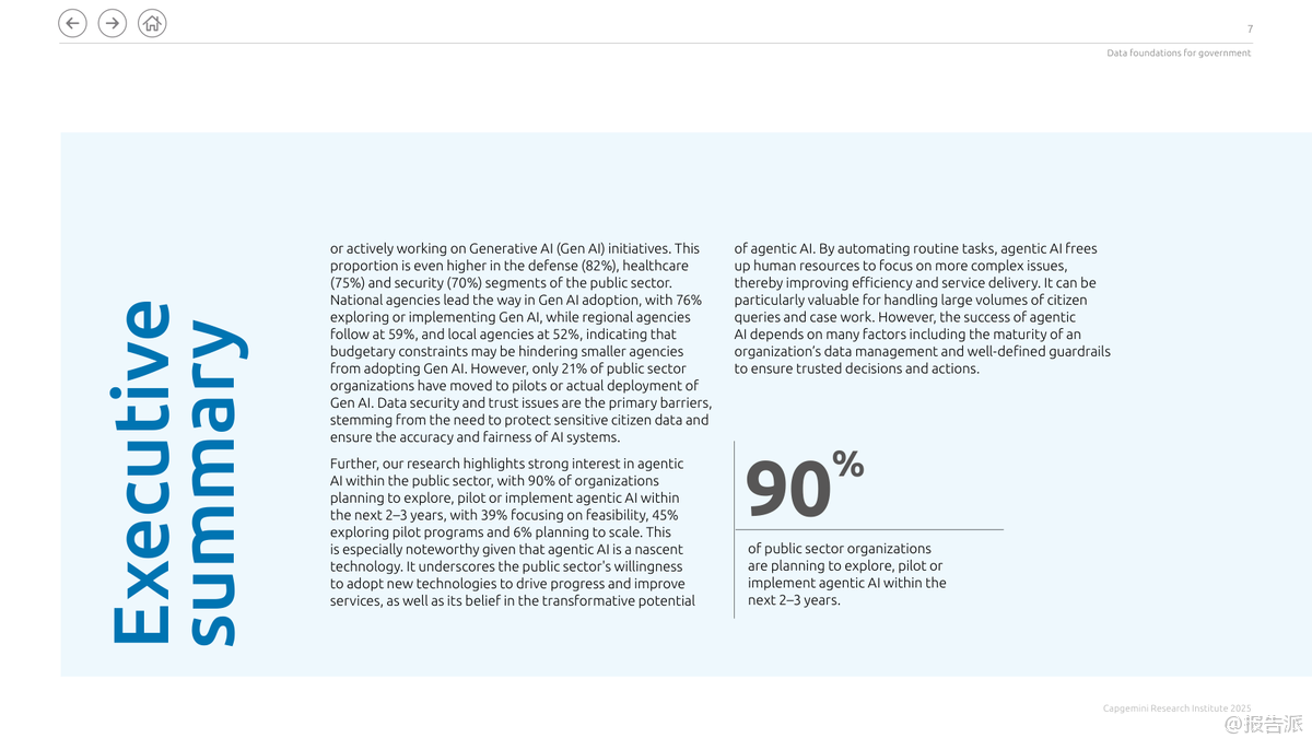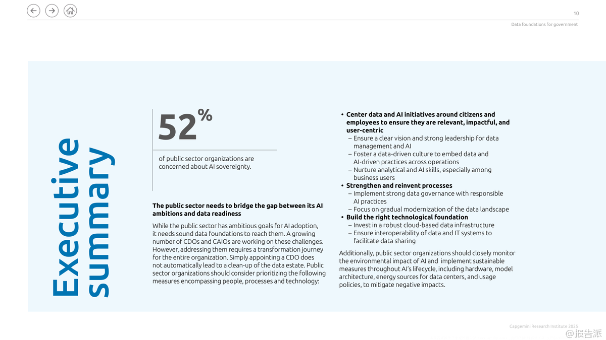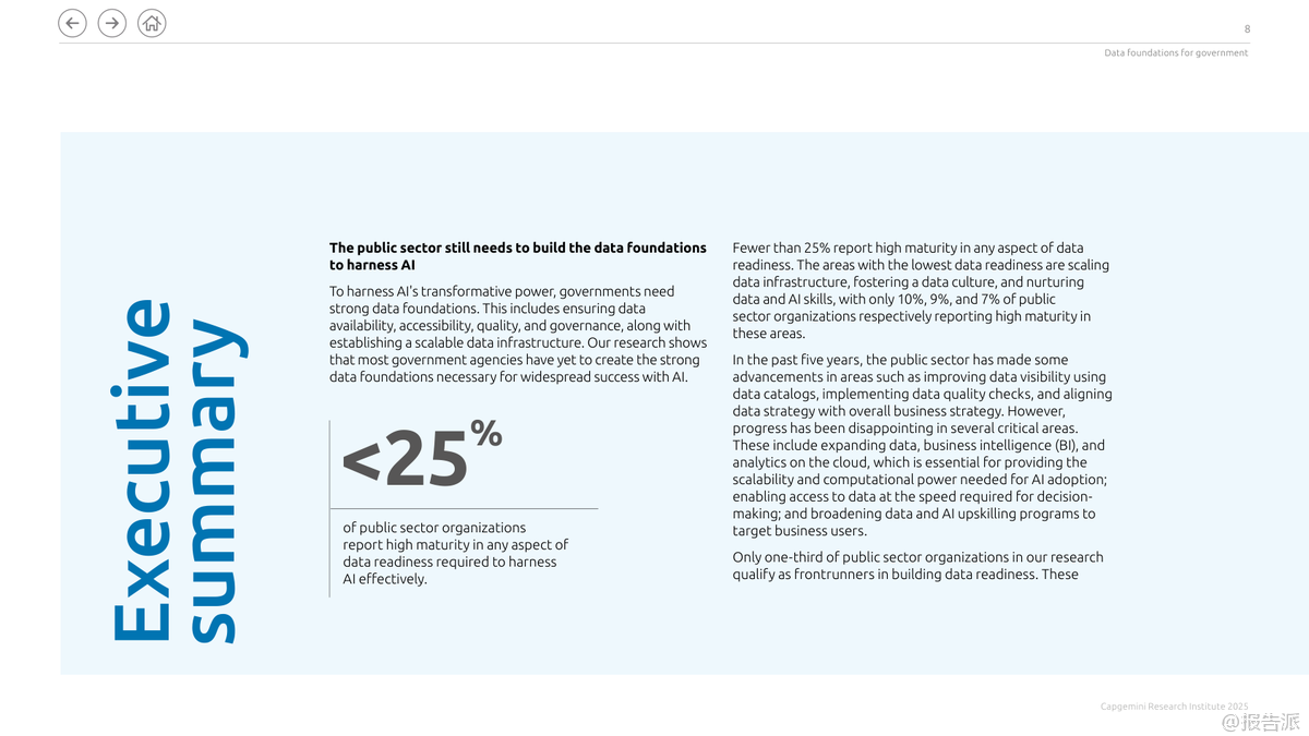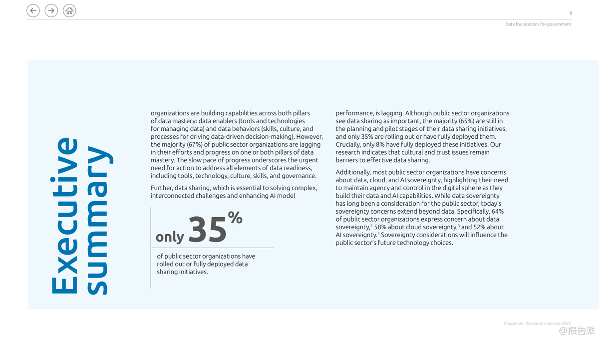 2025年,全球政府正加速推進數(shù)字化轉(zhuǎn)型,數(shù)據(jù)與人工智能(AI)被視為提升公共部門效率、優(yōu)化服務(wù)交付的核心驅(qū)動力。 然而,盡管各國政府對AI抱有高度期待,實際落地仍面臨嚴峻挑戰(zhàn)——核心癥結(jié)在于薄弱的數(shù)據(jù)基礎(chǔ)。 根據(jù)凱捷發(fā)布的《2025政府數(shù)據(jù)基礎(chǔ)建設(shè)研究報告》,高達64%的公共部門組織正在探索或積極部署生成式AI(Gen AI),其中國防、醫(yī)療和安全領(lǐng)域尤為領(lǐng)先,占比分別達82%、75%和70%。 更有90%的組織計劃在未來2-3年內(nèi)試點或?qū)嵤└咦灾餍缘摹爸悄荏wAI”(agentic AI)。 這表明,政府已不滿足于簡單的自動化,而是追求能自主決策、協(xié)同工作的高級AI應(yīng)用。 但現(xiàn)實是,僅有21%的組織進入試點或部署階段,真正將Gen AI投入生產(chǎn)的更是不足6%。 阻礙進展的關(guān)鍵因素包括:79%的機構(gòu)擔憂數(shù)據(jù)安全,74%缺乏對AI輸出的信任,71%受困于數(shù)據(jù)主權(quán)合規(guī)問題,以及普遍存在的預(yù)算限制和技術(shù)人才短缺。 更深層次的問題在于整體數(shù)據(jù)成熟度低下。 報告顯示,不到25%的公共部門在任何一項數(shù)據(jù)準備維度上達到高成熟水平。 尤其在數(shù)據(jù)基礎(chǔ)設(shè)施擴展、數(shù)據(jù)文化培育和AI技能儲備方面,成熟度分別僅有10%、9%和7%。 這意味著大多數(shù)政府尚未建立起支撐大規(guī)模AI應(yīng)用所需的數(shù)據(jù)治理體系、技術(shù)平臺和組織能力。 數(shù)據(jù)共享進展同樣緩慢。 盡管所有受訪機構(gòu)都認可其重要性,但僅有35%已啟動或全面部署數(shù)據(jù)共享計劃,完全部署的更是只有8%。 文化壁壘、信任缺失和系統(tǒng)互操作性差是主要障礙。 與此同時,數(shù)字主權(quán)成為新焦點,64%關(guān)注數(shù)據(jù)主權(quán),58%擔憂云主權(quán),52%重視AI主權(quán),反映出政府對技術(shù)自主權(quán)的強烈訴求。 報告指出,要彌合“AI雄心”與“數(shù)據(jù)現(xiàn)實”之間的鴻溝,必須采取系統(tǒng)性變革:首先,強化頂層設(shè)計,明確首席數(shù)據(jù)官(CDO)和首席AI官(CAIO)的權(quán)責,并確保充足資源支持;其次,推動漸進式技術(shù)現(xiàn)代化,優(yōu)先投資可擴展的云原生數(shù)據(jù)基礎(chǔ)設(shè)施;再次,加強跨部門數(shù)據(jù)治理與互操作標準建設(shè),打破數(shù)據(jù)孤島;最后,大力培養(yǎng)公務(wù)員的數(shù)據(jù)素養(yǎng)和AI應(yīng)用能力,構(gòu)建以公民為中心的數(shù)據(jù)驅(qū)動文化。 總而言之,2025年的政府AI競賽,勝負關(guān)鍵不在算法本身,而在誰擁有更堅實、更可信、更開放的數(shù)據(jù)根基。 唯有夯實數(shù)據(jù)底座,AI的承諾才能真正轉(zhuǎn)化為高效、公平且可持續(xù)的公共服務(wù)。 出品方:凱捷 發(fā)布時間:2025年 文檔頁數(shù):83頁 |