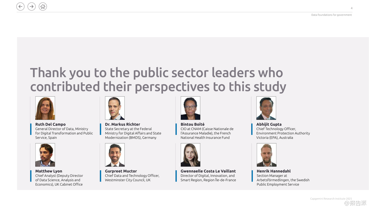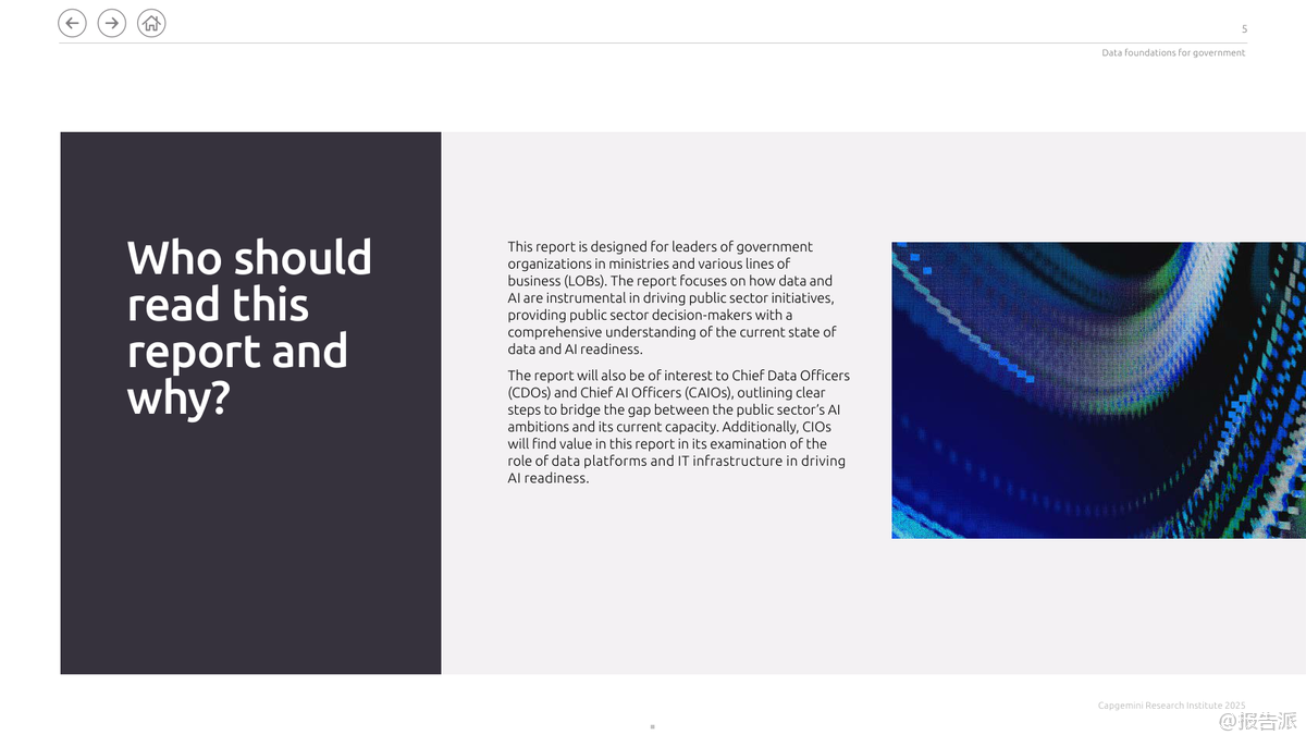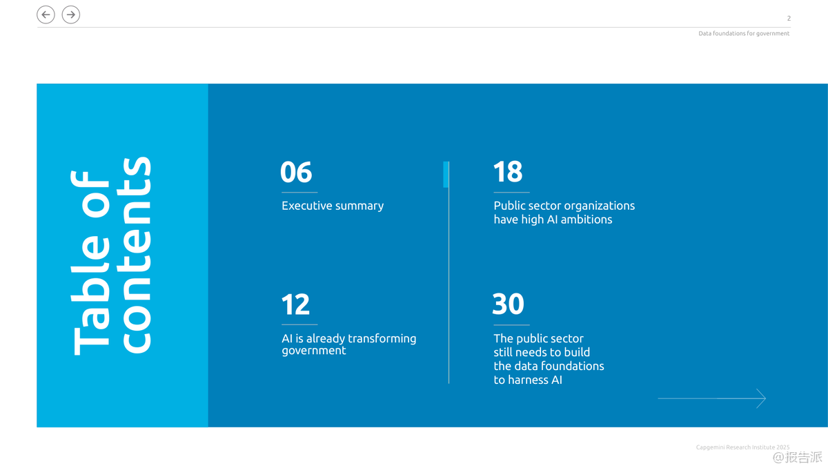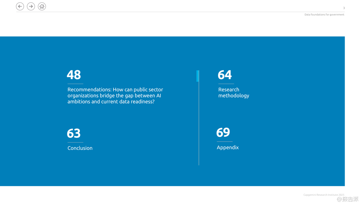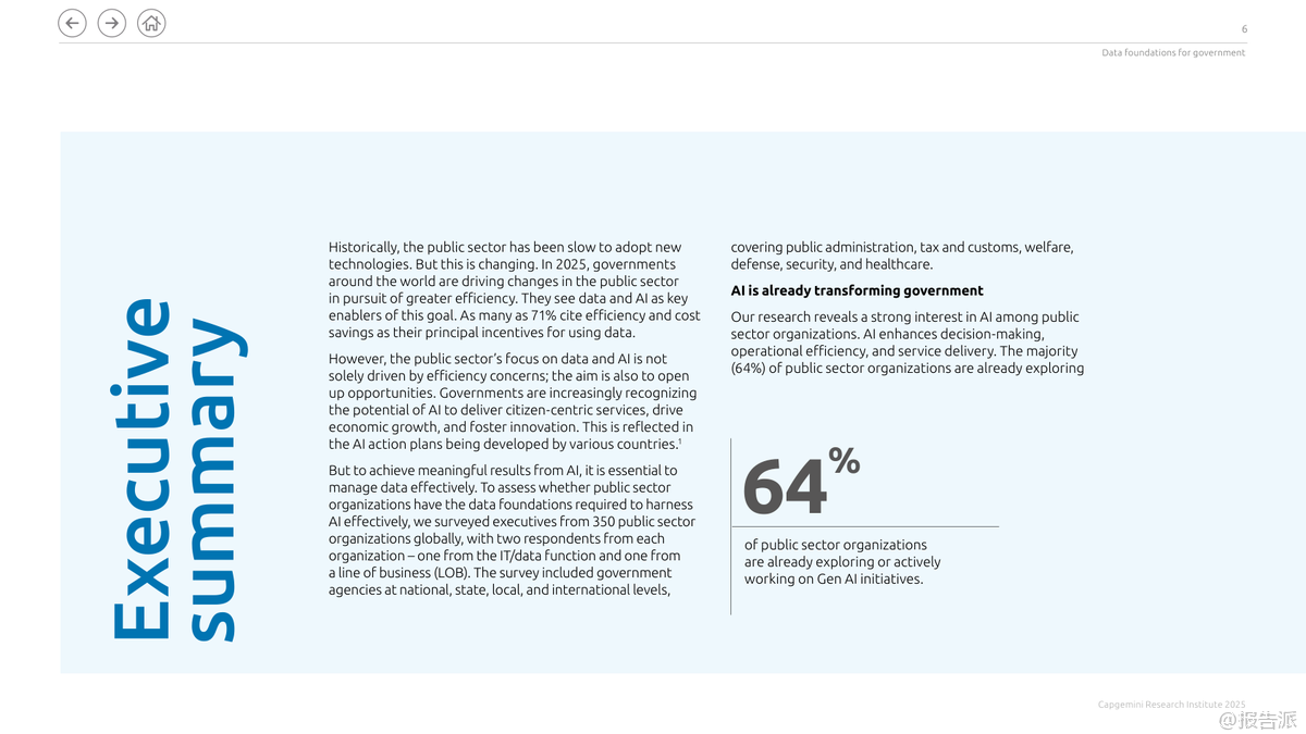 2025年,全球政府正加速推進數(shù)字化轉(zhuǎn)型,數(shù)據(jù)與人工智能(AI)被視為提升公共部門效率、優(yōu)化服務(wù)交付的核心驅(qū)動力。 然而,盡管各國政府對AI抱有高度期待,實際落地仍面臨嚴峻挑戰(zhàn)——核心癥結(jié)在于薄弱的數(shù)據(jù)基礎(chǔ)。 根據(jù)凱捷發(fā)布的《2025政府數(shù)據(jù)基礎(chǔ)建設(shè)研究報告》,高達64%的公共部門組織正在探索或積極部署生成式AI(Gen AI),其中國防、醫(yī)療和安全領(lǐng)域尤為領(lǐng)先,占比分別達82%、75%和70%。 更有90%的組織計劃在未來2-3年內(nèi)試點或?qū)嵤└咦灾餍缘摹爸悄荏wAI”(agentic AI)。 這表明,政府已不滿足于簡單的自動化,而是追求能自主決策、協(xié)同工作的高級AI應(yīng)用。 但現(xiàn)實是,僅有21%的組織進入試點或部署階段,真正將Gen AI投入生產(chǎn)的更是不足6%。 阻礙進展的關(guān)鍵因素包括:79%的機構(gòu)擔憂數(shù)據(jù)安全,74%缺乏對AI輸出的信任,71%受困于數(shù)據(jù)主權(quán)合規(guī)問題,以及普遍存在的預(yù)算限制和技術(shù)人才短缺。 更深層次的問題在于整體數(shù)據(jù)成熟度低下。 報告顯示,不到25%的公共部門在任何一項數(shù)據(jù)準備維度上達到高成熟水平。 尤其在數(shù)據(jù)基礎(chǔ)設(shè)施擴展、數(shù)據(jù)文化培育和AI技能儲備方面,成熟度分別僅有10%、9%和7%。 這意味著大多數(shù)政府尚未建立起支撐大規(guī)模AI應(yīng)用所需的數(shù)據(jù)治理體系、技術(shù)平臺和組織能力。 數(shù)據(jù)共享進展同樣緩慢。 盡管所有受訪機構(gòu)都認可其重要性,但僅有35%已啟動或全面部署數(shù)據(jù)共享計劃,完全部署的更是只有8%。 文化壁壘、信任缺失和系統(tǒng)互操作性差是主要障礙。 與此同時,數(shù)字主權(quán)成為新焦點,64%關(guān)注數(shù)據(jù)主權(quán),58%擔憂云主權(quán),52%重視AI主權(quán),反映出政府對技術(shù)自主權(quán)的強烈訴求。 報告指出,要彌合“AI雄心”與“數(shù)據(jù)現(xiàn)實”之間的鴻溝,必須采取系統(tǒng)性變革:首先,強化頂層設(shè)計,明確首席數(shù)據(jù)官(CDO)和首席AI官(CAIO)的權(quán)責,并確保充足資源支持;其次,推動漸進式技術(shù)現(xiàn)代化,優(yōu)先投資可擴展的云原生數(shù)據(jù)基礎(chǔ)設(shè)施;再次,加強跨部門數(shù)據(jù)治理與互操作標準建設(shè),打破數(shù)據(jù)孤島;最后,大力培養(yǎng)公務(wù)員的數(shù)據(jù)素養(yǎng)和AI應(yīng)用能力,構(gòu)建以公民為中心的數(shù)據(jù)驅(qū)動文化。 總而言之,2025年的政府AI競賽,勝負關(guān)鍵不在算法本身,而在誰擁有更堅實、更可信、更開放的數(shù)據(jù)根基。 唯有夯實數(shù)據(jù)底座,AI的承諾才能真正轉(zhuǎn)化為高效、公平且可持續(xù)的公共服務(wù)。 出品方:凱捷 發(fā)布時間:2025年 文檔頁數(shù):83頁 |