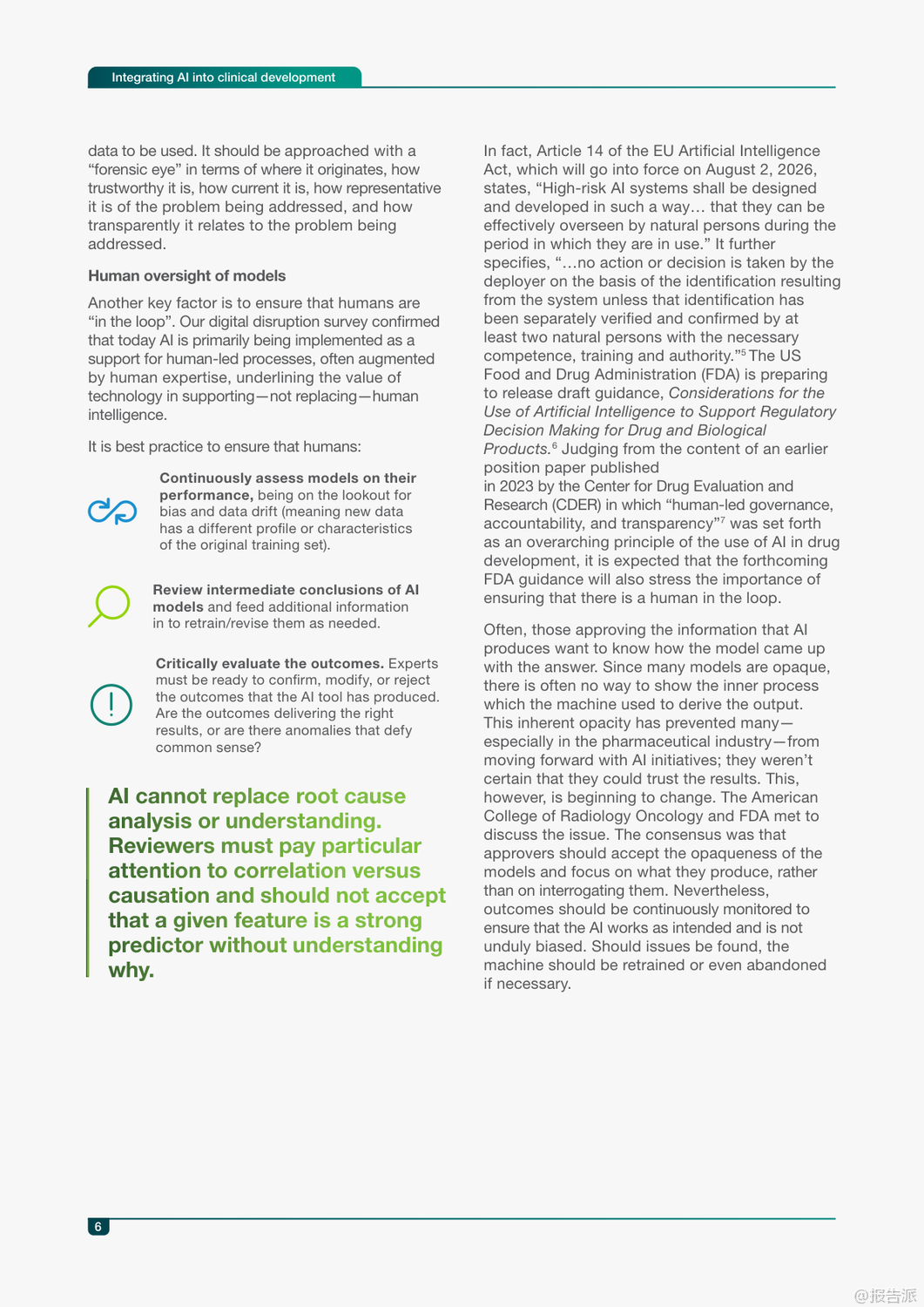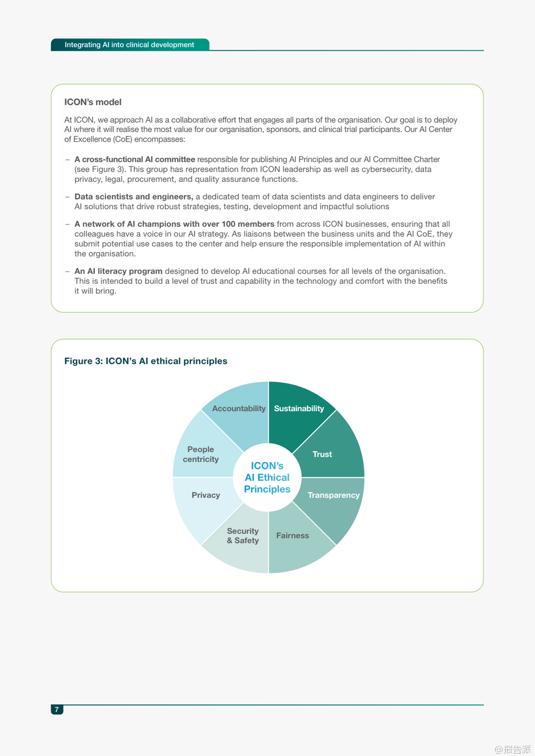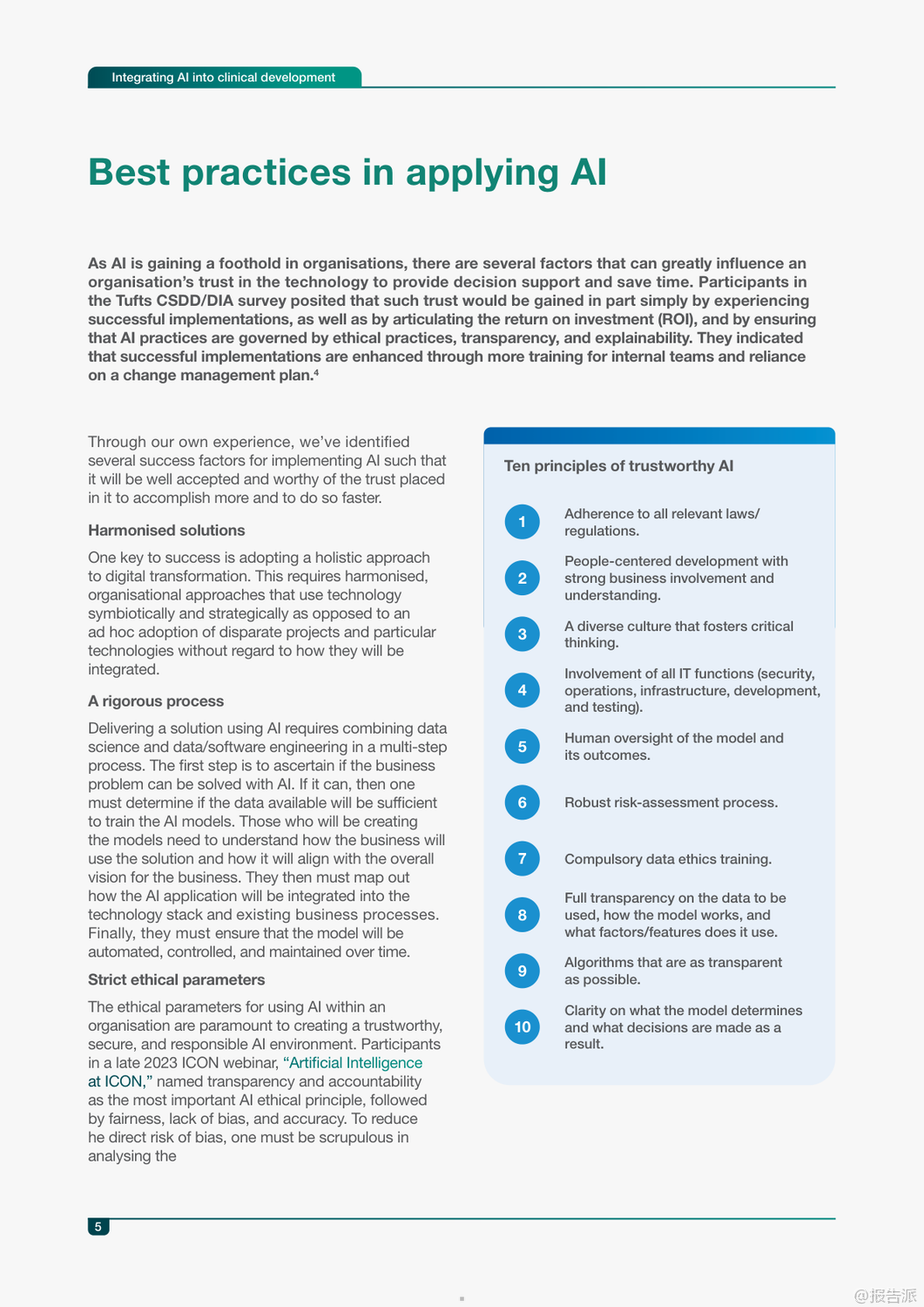 人工智能(AI)正以前所未有的速度重塑藥物研發(fā)與臨床試驗(yàn)的全生命周期。 根據(jù)ICON發(fā)布的《2025AI賦能臨床研發(fā)AI在藥物開發(fā)中的實(shí)戰(zhàn)應(yīng)用白皮書》,AI已從概念走向規(guī)?;涞?,在提升研發(fā)效率、優(yōu)化資源配置、加速審批進(jìn)程等方面展現(xiàn)出巨大潛力。 這份白皮書不僅揭示了當(dāng)前AI在醫(yī)藥行業(yè)的應(yīng)用現(xiàn)狀,也指出了未來發(fā)展的關(guān)鍵路徑與挑戰(zhàn)。 白皮書指出,盡管AI技術(shù)仍伴隨著一定的謹(jǐn)慎態(tài)度,但其采納率正在穩(wěn)步上升。 一項(xiàng)由Tufts CSDD與DIA于2024年開展的全球調(diào)查顯示,63%的受訪企業(yè)已開始實(shí)施AI/機(jī)器學(xué)習(xí)(ML)技術(shù)用于支持藥物開發(fā)。 然而,真正實(shí)現(xiàn)全面部署的企業(yè)僅占13%,說明大多數(shù)組織仍處于試點(diǎn)或局部應(yīng)用階段。 這反映出企業(yè)在推動(dòng)AI規(guī)?;^程中面臨的整合難題。 AI的核心價(jià)值在于增強(qiáng)人類決策能力而非替代。 它能快速處理海量復(fù)雜數(shù)據(jù),識別隱藏模式,并自動(dòng)化繁瑣流程。 例如,在醫(yī)學(xué)影像分析中,深度學(xué)習(xí)算法可將肝臟或MS病灶的手動(dòng)標(biāo)注時(shí)間從超過一小時(shí)縮短至十分鐘以內(nèi),極大提升了效率并減少人為誤差。 同時(shí),AI還能輔助協(xié)議設(shè)計(jì)、患者分層、終點(diǎn)預(yù)測等關(guān)鍵環(huán)節(jié),從而提高臨床試驗(yàn)的成功率。 ICON提出了AI成功落地的四大支柱:統(tǒng)一的數(shù)字化戰(zhàn)略、嚴(yán)謹(jǐn)?shù)募夹g(shù)開發(fā)流程、嚴(yán)格的倫理規(guī)范以及持續(xù)的人類監(jiān)督。 其中,“人在回路”(human-in-the-loop)被反復(fù)強(qiáng)調(diào)——AI輸出必須由專業(yè)人員審核、驗(yàn)證和調(diào)整,尤其是在高風(fēng)險(xiǎn)應(yīng)用場景下。 歐盟《人工智能法案》也明確規(guī)定,高風(fēng)險(xiǎn)AI系統(tǒng)需由至少兩名具備資質(zhì)的自然人獨(dú)立確認(rèn)結(jié)果后方可使用。 監(jiān)管環(huán)境正逐步完善。 2024年通過的歐盟AI法案是全球首個(gè)綜合性AI法規(guī),采用風(fēng)險(xiǎn)分級管理框架,對透明度、數(shù)據(jù)治理和偏見防控提出明確要求。 多數(shù)制藥企業(yè)期待此類指導(dǎo)性政策出臺,以降低創(chuàng)新不確定性。 事實(shí)上,超半數(shù)受訪者認(rèn)為缺乏監(jiān)管支持是阻礙AI應(yīng)用的主要障礙。 在實(shí)際應(yīng)用層面,ICON展示了多個(gè)自研AI工具的成果。 如One Search利用30年試驗(yàn)數(shù)據(jù)結(jié)合機(jī)器學(xué)習(xí)精準(zhǔn)推薦研究站點(diǎn),幫助某項(xiàng)目將非入組率從70%降至10%;Cassandra基于真實(shí)世界數(shù)據(jù)預(yù)測FDA或EMA是否可能要求上市后研究,準(zhǔn)確率達(dá)99%(美國)和97%(歐洲);MRT COA則通過智能抓取與分析6000余項(xiàng)臨床結(jié)局評估工具,優(yōu)化方案設(shè)計(jì)。 此外,生成式AI也在文檔撰寫、合同初稿生成、監(jiān)管文件歸檔等領(lǐng)域嶄露頭角。 但白皮書提醒,通用模型如ChatGPT不可直接用于臨床場景,必須經(jīng)過領(lǐng)域適配、提示工程優(yōu)化及嚴(yán)格的人工校驗(yàn)。 總體而言,AI正在成為臨床研發(fā)的“游戲規(guī)則改變者”。 要釋放其全部潛能,企業(yè)需構(gòu)建跨職能協(xié)作機(jī)制、建立可信可控的技術(shù)體系,并堅(jiān)持倫理先行、以人為本的發(fā)展原則。 正如白皮書所言:“這不是AI能否改變行業(yè)的問題,而是我們?nèi)绾呜?fù)責(zé)任地引導(dǎo)這場變革。 ” 出品方:ICON 發(fā)布時(shí)間:2025年 文檔頁數(shù):20頁 |