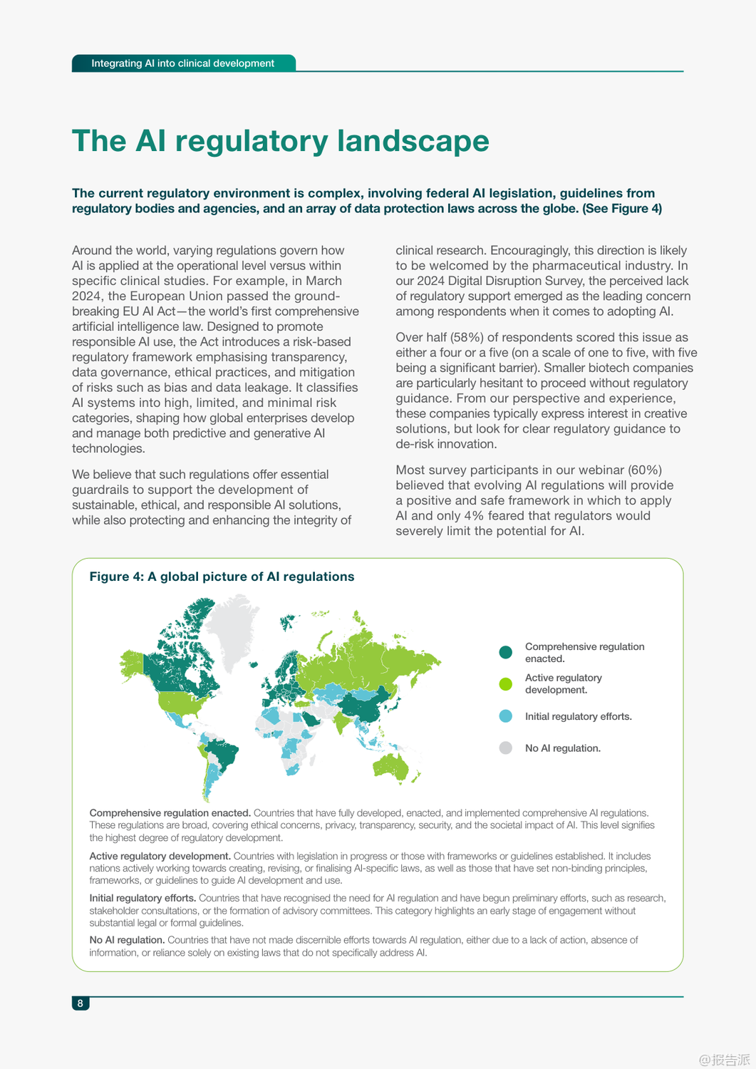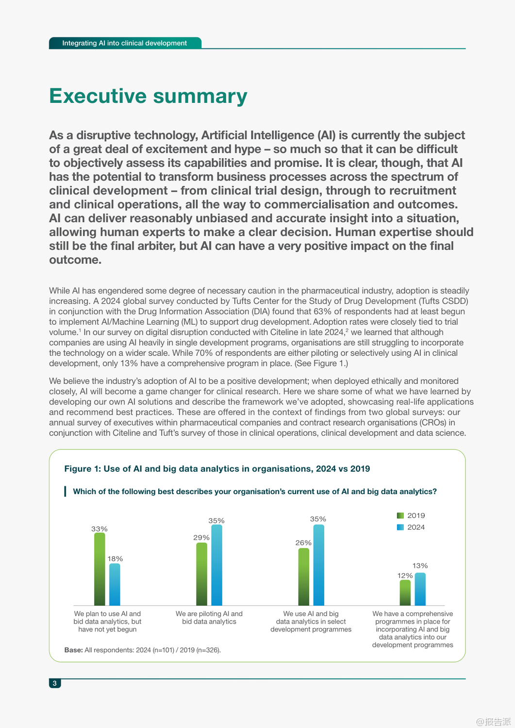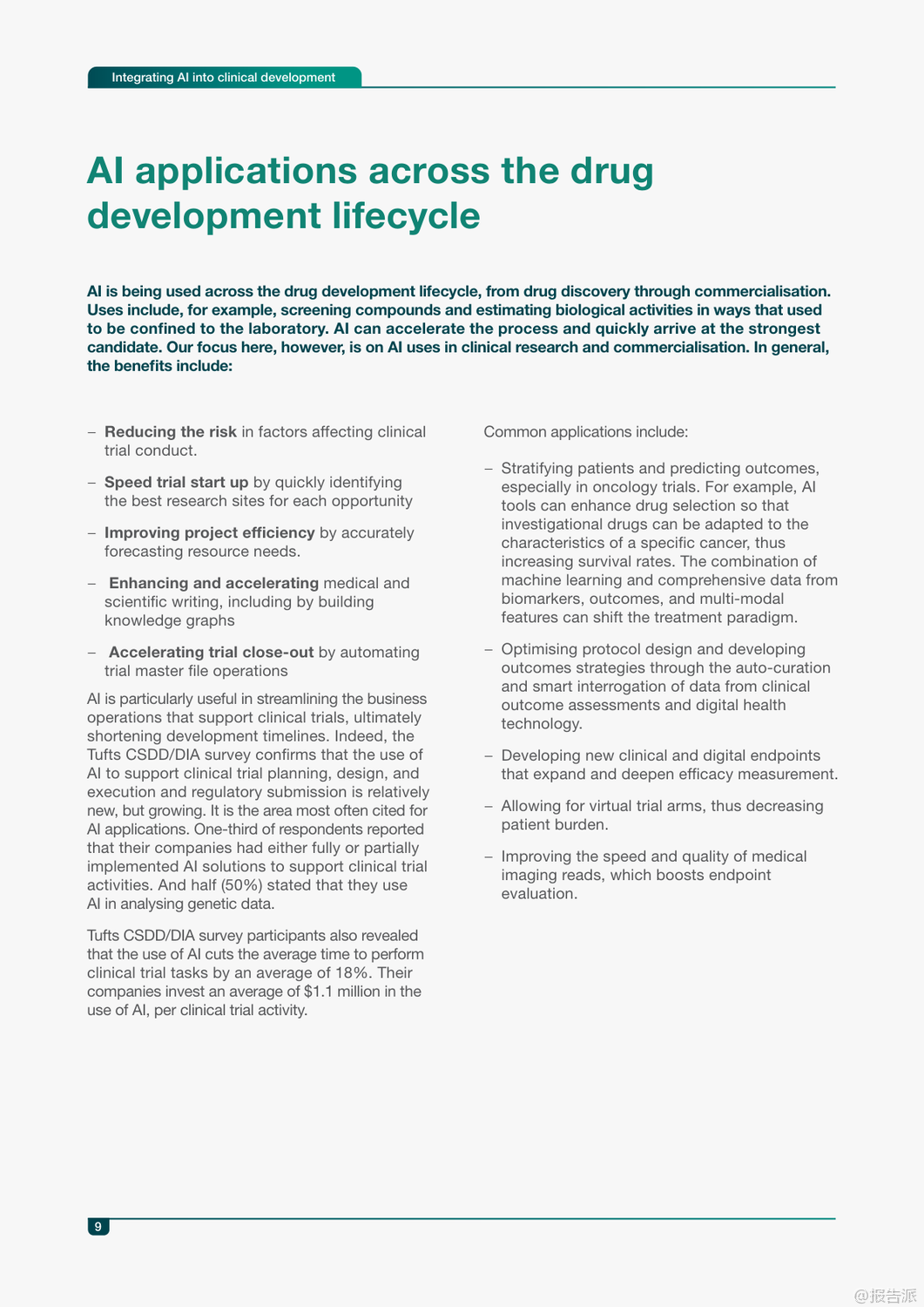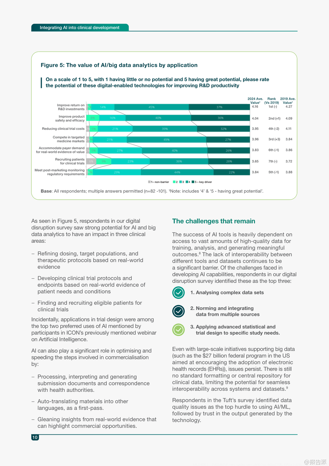人工智能(AI)正以前所未有的速度重塑藥物研發(fā)與臨床試驗(yàn)的全生命周期。 根據(jù)ICON發(fā)布的《2025AI賦能臨床研發(fā)AI在藥物開發(fā)中的實(shí)戰(zhàn)應(yīng)用白皮書》,AI已從概念走向規(guī)?;涞?,在提升研發(fā)效率、優(yōu)化資源配置、加速審批進(jìn)程等方面展現(xiàn)出巨大潛力。 這份白皮書不僅揭示了當(dāng)前AI在醫(yī)藥行業(yè)的應(yīng)用現(xiàn)狀,也指出了未來發(fā)展的關(guān)鍵路徑與挑戰(zhàn)。 白皮書指出,盡管AI技術(shù)仍伴隨著一定的謹(jǐn)慎態(tài)度,但其采納率正在穩(wěn)步上升。 一項(xiàng)由Tufts CSDD與DIA于2024年開展的全球調(diào)查顯示,63%的受訪企業(yè)已開始實(shí)施AI/機(jī)器學(xué)習(xí)(ML)技術(shù)用于支持藥物開發(fā)。 然而,真正實(shí)現(xiàn)全面部署的企業(yè)僅占13%,說明大多數(shù)組織仍處于試點(diǎn)或局部應(yīng)用階段。 這反映出企業(yè)在推動(dòng)AI規(guī)?;^程中面臨的整合難題。 AI的核心價(jià)值在于增強(qiáng)人類決策能力而非替代。 它能快速處理海量復(fù)雜數(shù)據(jù),識別隱藏模式,并自動(dòng)化繁瑣流程。 例如,在醫(yī)學(xué)影像分析中,深度學(xué)習(xí)算法可將肝臟或MS病灶的手動(dòng)標(biāo)注時(shí)間從超過一小時(shí)縮短至十分鐘以內(nèi),極大提升了效率并減少人為誤差。 同時(shí),AI還能輔助協(xié)議設(shè)計(jì)、患者分層、終點(diǎn)預(yù)測等關(guān)鍵環(huán)節(jié),從而提高臨床試驗(yàn)的成功率。 ICON提出了AI成功落地的四大支柱:統(tǒng)一的數(shù)字化戰(zhàn)略、嚴(yán)謹(jǐn)?shù)募夹g(shù)開發(fā)流程、嚴(yán)格的倫理規(guī)范以及持續(xù)的人類監(jiān)督。 其中,“人在回路”(human-in-the-loop)被反復(fù)強(qiáng)調(diào)——AI輸出必須由專業(yè)人員審核、驗(yàn)證和調(diào)整,尤其是在高風(fēng)險(xiǎn)應(yīng)用場景下。 歐盟《人工智能法案》也明確規(guī)定,高風(fēng)險(xiǎn)AI系統(tǒng)需由至少兩名具備資質(zhì)的自然人獨(dú)立確認(rèn)結(jié)果后方可使用。 監(jiān)管環(huán)境正逐步完善。 2024年通過的歐盟AI法案是全球首個(gè)綜合性AI法規(guī),采用風(fēng)險(xiǎn)分級管理框架,對透明度、數(shù)據(jù)治理和偏見防控提出明確要求。 多數(shù)制藥企業(yè)期待此類指導(dǎo)性政策出臺,以降低創(chuàng)新不確定性。 事實(shí)上,超半數(shù)受訪者認(rèn)為缺乏監(jiān)管支持是阻礙AI應(yīng)用的主要障礙。 在實(shí)際應(yīng)用層面,ICON展示了多個(gè)自研AI工具的成果。 如One Search利用30年試驗(yàn)數(shù)據(jù)結(jié)合機(jī)器學(xué)習(xí)精準(zhǔn)推薦研究站點(diǎn),幫助某項(xiàng)目將非入組率從70%降至10%;Cassandra基于真實(shí)世界數(shù)據(jù)預(yù)測FDA或EMA是否可能要求上市后研究,準(zhǔn)確率達(dá)99%(美國)和97%(歐洲);MRT COA則通過智能抓取與分析6000余項(xiàng)臨床結(jié)局評估工具,優(yōu)化方案設(shè)計(jì)。 此外,生成式AI也在文檔撰寫、合同初稿生成、監(jiān)管文件歸檔等領(lǐng)域嶄露頭角。 但白皮書提醒,通用模型如ChatGPT不可直接用于臨床場景,必須經(jīng)過領(lǐng)域適配、提示工程優(yōu)化及嚴(yán)格的人工校驗(yàn)。 總體而言,AI正在成為臨床研發(fā)的“游戲規(guī)則改變者”。 要釋放其全部潛能,企業(yè)需構(gòu)建跨職能協(xié)作機(jī)制、建立可信可控的技術(shù)體系,并堅(jiān)持倫理先行、以人為本的發(fā)展原則。 正如白皮書所言:“這不是AI能否改變行業(yè)的問題,而是我們?nèi)绾呜?fù)責(zé)任地引導(dǎo)這場變革。 ” 出品方:ICON 發(fā)布時(shí)間:2025年 文檔頁數(shù):20頁 |