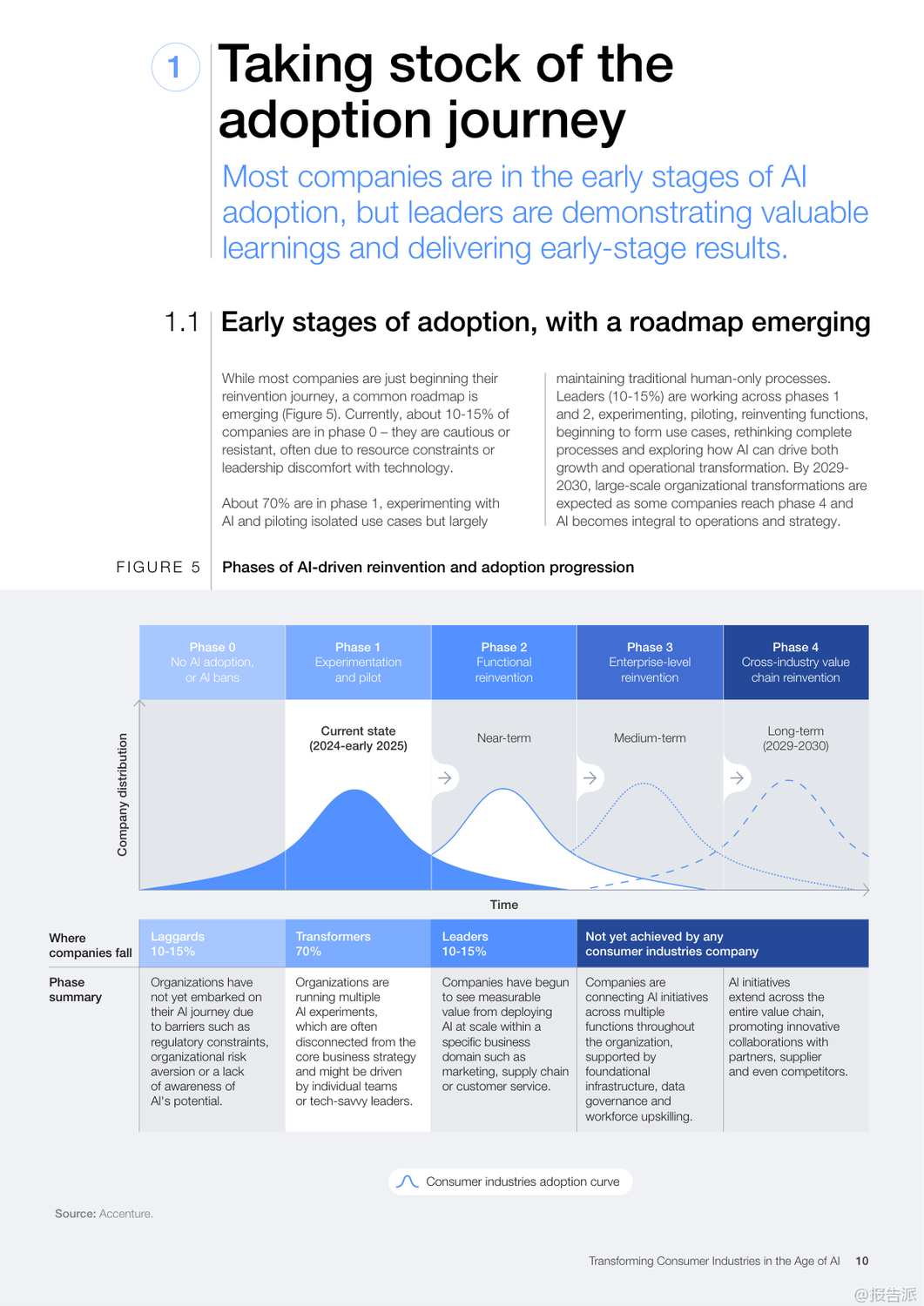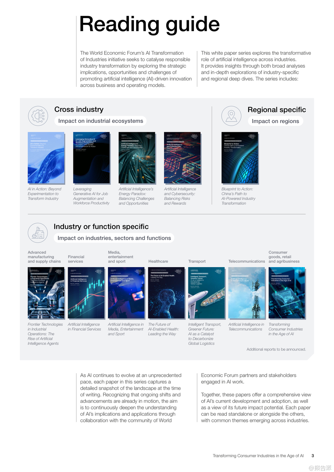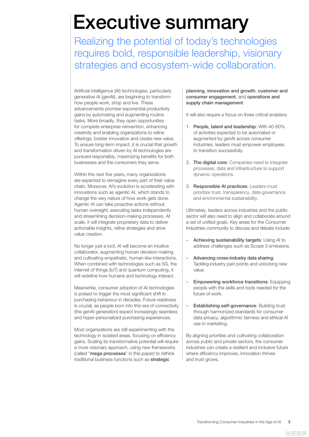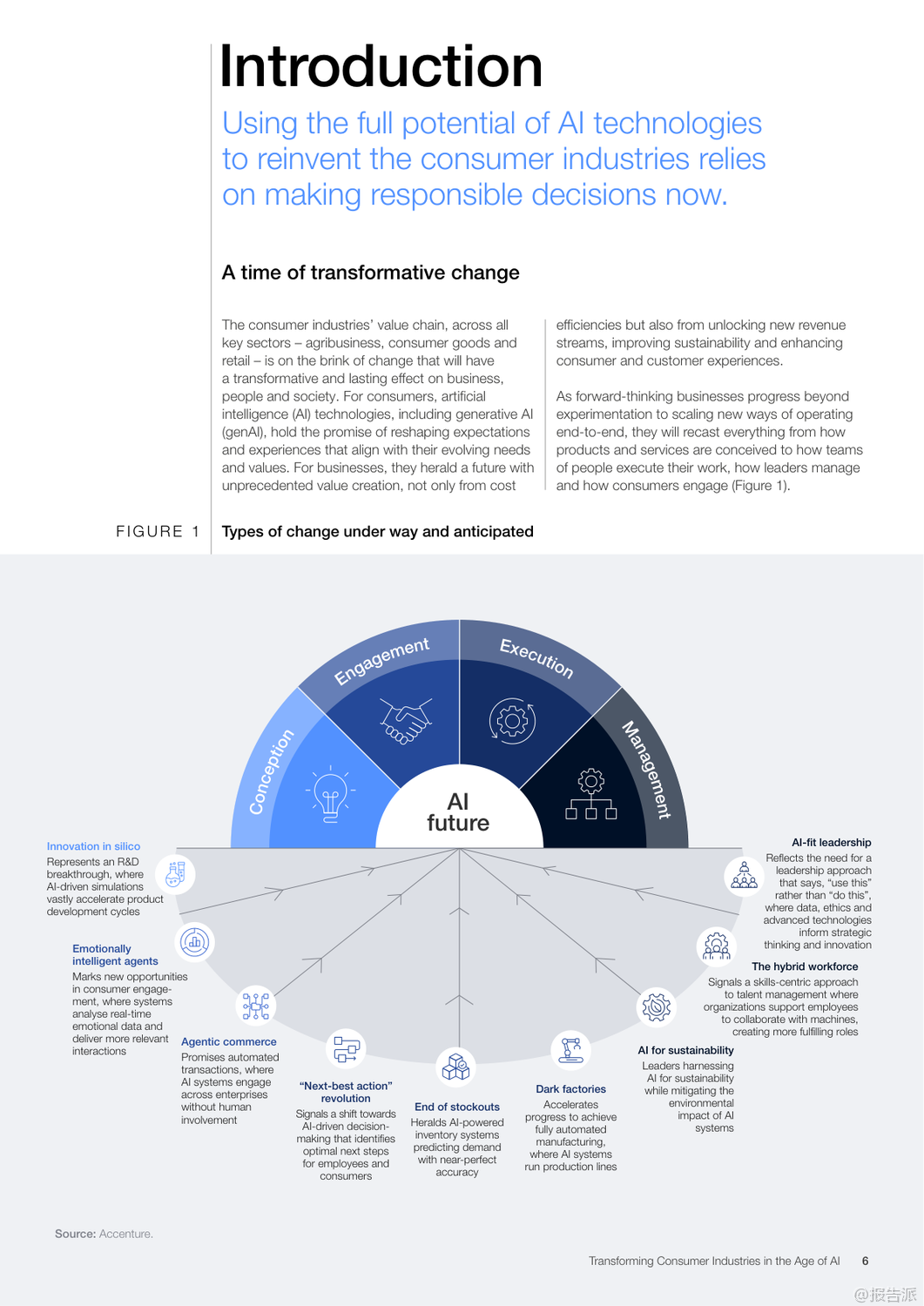 人工智能,尤其是生成式AI(genAI),正在深刻重塑消費(fèi)品行業(yè)的運(yùn)作模式。 這份由世界經(jīng)濟(jì)論壇與埃森哲合作發(fā)布的《AI時(shí)代的消費(fèi)品行業(yè)轉(zhuǎn)型白皮書(shū)》指出,我們正站在一個(gè)變革的臨界點(diǎn),AI不再僅僅是提升效率的工具,而是推動(dòng)企業(yè)全方位再創(chuàng)造的核心引擎。 當(dāng)前,大多數(shù)消費(fèi)品企業(yè)仍處于AI應(yīng)用的初級(jí)階段,約70%的公司停留在孤立的試點(diǎn)項(xiàng)目上。 然而,領(lǐng)先的10-15%的企業(yè)已開(kāi)始功能層面的重構(gòu),并取得了顯著成效。 數(shù)據(jù)顯示,AI成熟度高的企業(yè)自2019年以來(lái),收入增長(zhǎng)率高出同行18%,這清晰地表明了深度轉(zhuǎn)型的巨大回報(bào)。 展望未來(lái),負(fù)責(zé)任地采用生成式AI,有望在2038年前為七國(guó)消費(fèi)品行業(yè)額外貢獻(xiàn)1.2萬(wàn)億美元的經(jīng)濟(jì)價(jià)值。 白皮書(shū)預(yù)示,AI的發(fā)展已進(jìn)入第三波——“智能體AI”(Agentic AI)時(shí)代。 這種AI不僅能回答問(wèn)題,更能自主決策、采取行動(dòng),甚至與其他AI系統(tǒng)協(xié)作完成復(fù)雜任務(wù)。 想象一下,AI可以像個(gè)人廚師一樣,理解你的復(fù)雜需求,主動(dòng)規(guī)劃、采購(gòu)并安排送貨。 到2028年,預(yù)計(jì)三分之一的生成式AI交互將通過(guò)此類(lèi)自主智能體實(shí)現(xiàn)。 為了釋放AI的全部潛力,報(bào)告提出了“端到端轉(zhuǎn)型”的框架,強(qiáng)調(diào)需超越零散的試點(diǎn),利用“超級(jí)流程”(Mega Processes)對(duì)核心業(yè)務(wù)進(jìn)行系統(tǒng)性再造。 這四大超級(jí)流程包括:戰(zhàn)略與規(guī)劃、創(chuàng)新與增長(zhǎng)、客戶與消費(fèi)者互動(dòng)、運(yùn)營(yíng)與供應(yīng)鏈。 例如,在創(chuàng)新領(lǐng)域,聯(lián)合利華與微軟的合作將材料發(fā)現(xiàn)時(shí)間大幅縮短;在零售端,沃爾瑪利用其專(zhuān)有大模型Wallaby為每位顧客創(chuàng)建個(gè)性化的主頁(yè),實(shí)現(xiàn)真正的千人千面。 然而,成功轉(zhuǎn)型依賴(lài)于三大關(guān)鍵支柱。 首先是“人”:領(lǐng)導(dǎo)者必須從“命令”轉(zhuǎn)變?yōu)椤耙龑?dǎo)”,賦能員工與AI協(xié)作。 報(bào)告預(yù)測(cè),40%-60%的工作活動(dòng)將被AI增強(qiáng)或自動(dòng)化,因此,技能重塑和角色重新定義至關(guān)重要。 其次是“數(shù)字核心”:強(qiáng)大的數(shù)據(jù)基礎(chǔ)設(shè)施是AI規(guī)?;瘧?yīng)用的基礎(chǔ),但目前僅有13%的企業(yè)對(duì)此充滿信心。 最后是“負(fù)責(zé)任的AI”:必須將信任、透明度和可持續(xù)性置于核心。 只有35%的消費(fèi)者信任企業(yè)如何使用AI,因此建立行業(yè)統(tǒng)一的數(shù)據(jù)隱私和算法公平標(biāo)準(zhǔn)刻不容緩。 最終,白皮書(shū)呼吁產(chǎn)業(yè)界、政府和學(xué)術(shù)界展開(kāi)集體行動(dòng)。 通過(guò)共建共享物流平臺(tái)以降低碳排放、制定統(tǒng)一的數(shù)據(jù)交換框架、以及建立標(biāo)準(zhǔn)化的技能發(fā)展體系,整個(gè)消費(fèi)品行業(yè)才能共同駕馭AI浪潮,構(gòu)建一個(gè)更高效、更具創(chuàng)新性和更可持續(xù)的未來(lái)。 出品方:世界經(jīng)濟(jì)論壇 發(fā)布時(shí)間:2025年 文檔頁(yè)數(shù):35頁(yè) |