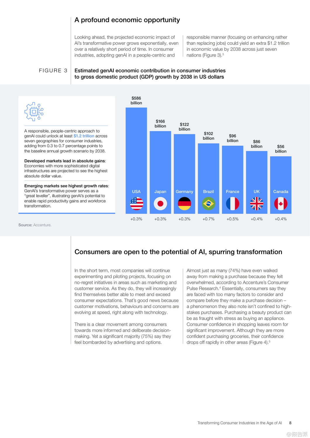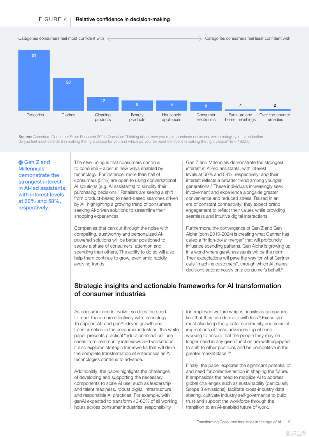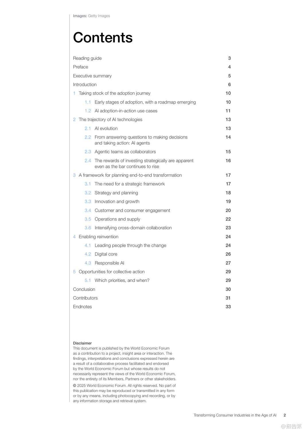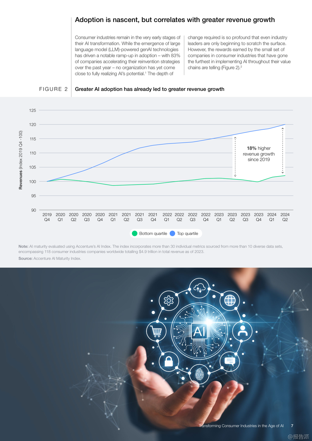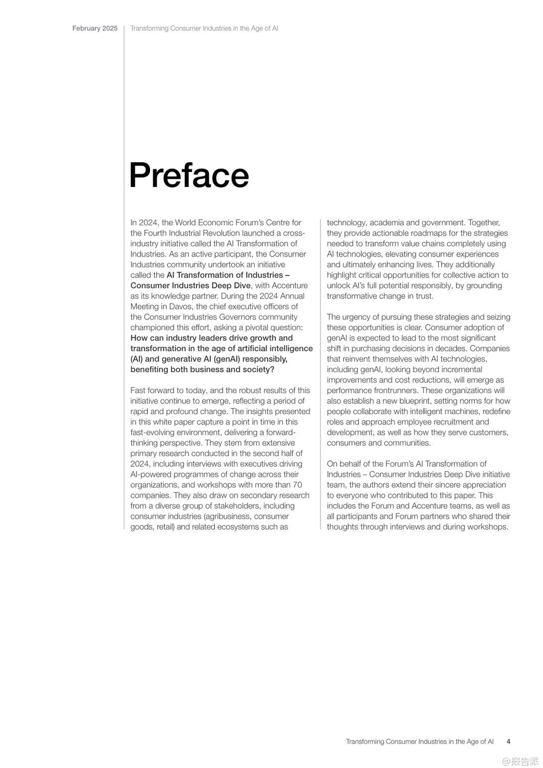 人工智能,尤其是生成式AI(genAI),正在深刻重塑消費(fèi)品行業(yè)的運(yùn)作模式。 這份由世界經(jīng)濟(jì)論壇與埃森哲合作發(fā)布的《AI時(shí)代的消費(fèi)品行業(yè)轉(zhuǎn)型白皮書(shū)》指出,我們正站在一個(gè)變革的臨界點(diǎn),AI不再僅僅是提升效率的工具,而是推動(dòng)企業(yè)全方位再創(chuàng)造的核心引擎。 當(dāng)前,大多數(shù)消費(fèi)品企業(yè)仍處于AI應(yīng)用的初級(jí)階段,約70%的公司停留在孤立的試點(diǎn)項(xiàng)目上。 然而,領(lǐng)先的10-15%的企業(yè)已開(kāi)始功能層面的重構(gòu),并取得了顯著成效。 數(shù)據(jù)顯示,AI成熟度高的企業(yè)自2019年以來(lái),收入增長(zhǎng)率高出同行18%,這清晰地表明了深度轉(zhuǎn)型的巨大回報(bào)。 展望未來(lái),負(fù)責(zé)任地采用生成式AI,有望在2038年前為七國(guó)消費(fèi)品行業(yè)額外貢獻(xiàn)1.2萬(wàn)億美元的經(jīng)濟(jì)價(jià)值。 白皮書(shū)預(yù)示,AI的發(fā)展已進(jìn)入第三波——“智能體AI”(Agentic AI)時(shí)代。 這種AI不僅能回答問(wèn)題,更能自主決策、采取行動(dòng),甚至與其他AI系統(tǒng)協(xié)作完成復(fù)雜任務(wù)。 想象一下,AI可以像個(gè)人廚師一樣,理解你的復(fù)雜需求,主動(dòng)規(guī)劃、采購(gòu)并安排送貨。 到2028年,預(yù)計(jì)三分之一的生成式AI交互將通過(guò)此類(lèi)自主智能體實(shí)現(xiàn)。 為了釋放AI的全部潛力,報(bào)告提出了“端到端轉(zhuǎn)型”的框架,強(qiáng)調(diào)需超越零散的試點(diǎn),利用“超級(jí)流程”(Mega Processes)對(duì)核心業(yè)務(wù)進(jìn)行系統(tǒng)性再造。 這四大超級(jí)流程包括:戰(zhàn)略與規(guī)劃、創(chuàng)新與增長(zhǎng)、客戶與消費(fèi)者互動(dòng)、運(yùn)營(yíng)與供應(yīng)鏈。 例如,在創(chuàng)新領(lǐng)域,聯(lián)合利華與微軟的合作將材料發(fā)現(xiàn)時(shí)間大幅縮短;在零售端,沃爾瑪利用其專(zhuān)有大模型Wallaby為每位顧客創(chuàng)建個(gè)性化的主頁(yè),實(shí)現(xiàn)真正的千人千面。 然而,成功轉(zhuǎn)型依賴(lài)于三大關(guān)鍵支柱。 首先是“人”:領(lǐng)導(dǎo)者必須從“命令”轉(zhuǎn)變?yōu)椤耙龑?dǎo)”,賦能員工與AI協(xié)作。 報(bào)告預(yù)測(cè),40%-60%的工作活動(dòng)將被AI增強(qiáng)或自動(dòng)化,因此,技能重塑和角色重新定義至關(guān)重要。 其次是“數(shù)字核心”:強(qiáng)大的數(shù)據(jù)基礎(chǔ)設(shè)施是AI規(guī)?;瘧?yīng)用的基礎(chǔ),但目前僅有13%的企業(yè)對(duì)此充滿信心。 最后是“負(fù)責(zé)任的AI”:必須將信任、透明度和可持續(xù)性置于核心。 只有35%的消費(fèi)者信任企業(yè)如何使用AI,因此建立行業(yè)統(tǒng)一的數(shù)據(jù)隱私和算法公平標(biāo)準(zhǔn)刻不容緩。 最終,白皮書(shū)呼吁產(chǎn)業(yè)界、政府和學(xué)術(shù)界展開(kāi)集體行動(dòng)。 通過(guò)共建共享物流平臺(tái)以降低碳排放、制定統(tǒng)一的數(shù)據(jù)交換框架、以及建立標(biāo)準(zhǔn)化的技能發(fā)展體系,整個(gè)消費(fèi)品行業(yè)才能共同駕馭AI浪潮,構(gòu)建一個(gè)更高效、更具創(chuàng)新性和更可持續(xù)的未來(lái)。 出品方:世界經(jīng)濟(jì)論壇 發(fā)布時(shí)間:2025年 文檔頁(yè)數(shù):35頁(yè) |