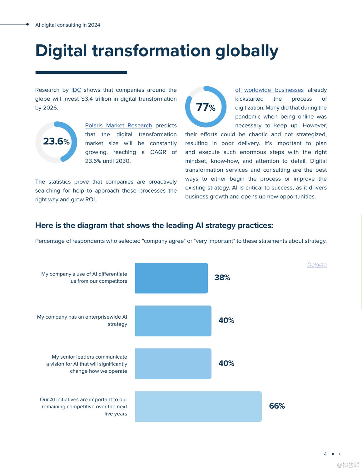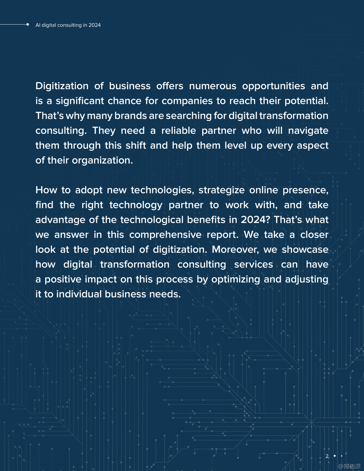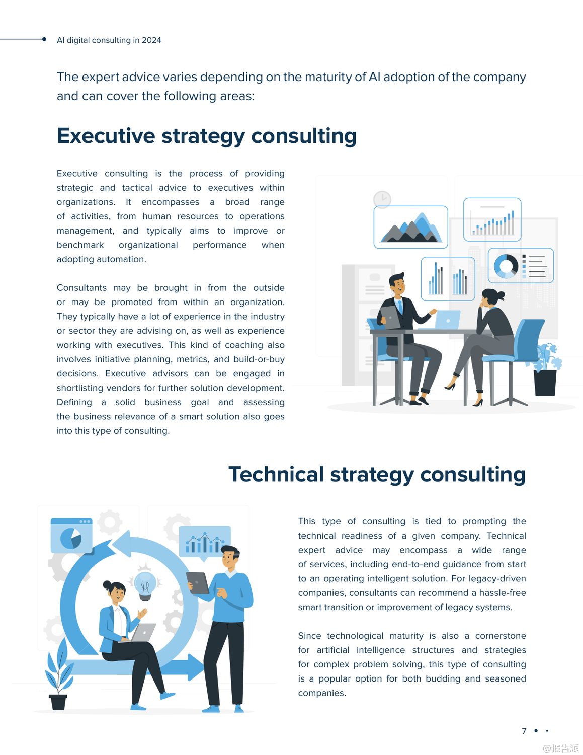 隨著全球企業(yè)加速邁向數(shù)字化時(shí)代,人工智能(AI)已成為推動(dòng)數(shù)字化轉(zhuǎn)型的核心驅(qū)動(dòng)力。 根據(jù)IDC預(yù)測(cè),到2026年,全球企業(yè)在數(shù)字化轉(zhuǎn)型上的投資將高達(dá)3.4萬(wàn)億美元,而目前已有77%的企業(yè)啟動(dòng)了相關(guān)進(jìn)程。 然而,許多企業(yè)的轉(zhuǎn)型仍缺乏系統(tǒng)性戰(zhàn)略,導(dǎo)致執(zhí)行效果不佳。 在此背景下,AI驅(qū)動(dòng)的數(shù)字化轉(zhuǎn)型咨詢服務(wù)正成為企業(yè)實(shí)現(xiàn)可持續(xù)增長(zhǎng)的關(guān)鍵助力。 本報(bào)告指出,真正的數(shù)字化轉(zhuǎn)型不僅僅是引入新技術(shù),而是涵蓋技術(shù)整合、流程優(yōu)化、數(shù)據(jù)決策、客戶中心化、組織文化變革及生態(tài)合作六大核心要素。 其中,AI作為關(guān)鍵引擎,正在重塑企業(yè)運(yùn)營(yíng)方式。 從自動(dòng)化客服、智能營(yíng)銷到個(gè)性化產(chǎn)品設(shè)計(jì),AI不僅大幅降低人力成本,還釋放員工創(chuàng)造力,提升整體效率與客戶體驗(yàn)。 特別是生成式AI如ChatGPT的應(yīng)用,已在內(nèi)容創(chuàng)作、客戶服務(wù)和內(nèi)部協(xié)作中展現(xiàn)出巨大價(jià)值。 值得注意的是,德勤調(diào)研顯示,66%的企業(yè)認(rèn)為AI對(duì)其未來(lái)五年保持競(jìng)爭(zhēng)力至關(guān)重要,但僅有40%擁有全企業(yè)級(jí)的AI戰(zhàn)略。 這表明,盡管認(rèn)知到位,落地能力仍有差距。 因此,專業(yè)咨詢機(jī)構(gòu)的作用愈發(fā)凸顯。 數(shù)字轉(zhuǎn)型顧問(wèn)通過(guò)評(píng)估企業(yè)現(xiàn)狀、制定定制化策略、推薦技術(shù)方案、指導(dǎo)實(shí)施并培訓(xùn)團(tuán)隊(duì),幫助企業(yè)打通從戰(zhàn)略到執(zhí)行的全鏈路。 報(bào)告特別強(qiáng)調(diào),選擇合適的AI合作伙伴是成功的關(guān)鍵。 遠(yuǎn)程AI團(tuán)隊(duì)因其成本優(yōu)勢(shì)、人才廣度和技術(shù)敏捷性,正成為越來(lái)越多企業(yè)的首選。 通過(guò)外包項(xiàng)目制合作,企業(yè)可靈活獲取頂尖AI能力,避免高昂的自建團(tuán)隊(duì)成本。 同時(shí),成功的AI項(xiàng)目需具備五大要素:明確目標(biāo)、合理組隊(duì)、高效溝通、工具支持以及科學(xué)、應(yīng)用與利益相關(guān)者的一致性。 展望2024年及以后,數(shù)字化轉(zhuǎn)型咨詢將更加聚焦客戶中心化、敏捷響應(yīng)、倫理可持續(xù)發(fā)展與持續(xù)創(chuàng)新。 企業(yè)需建立快速迭代機(jī)制,利用AI進(jìn)行市場(chǎng)趨勢(shì)預(yù)測(cè)與用戶行為分析,打造以客戶旅程為核心的動(dòng)態(tài)服務(wù)體系。 此外,網(wǎng)絡(luò)安全與數(shù)據(jù)隱私合規(guī)也將成為不可忽視的重點(diǎn)。 InData Labs作為自2014年起深耕AI與數(shù)據(jù)分析領(lǐng)域的科技伙伴,已為來(lái)自美國(guó)、英國(guó)、歐盟等超150家企業(yè)提供端到端的數(shù)字化轉(zhuǎn)型服務(wù),涵蓋咨詢、設(shè)計(jì)、實(shí)施與運(yùn)維全流程。 其在生成式AI、云計(jì)算和智能分析方面的專業(yè)能力,使其連續(xù)入選頂級(jí)數(shù)據(jù)科學(xué)與AI服務(wù)商榜單。 總體而言,數(shù)字化轉(zhuǎn)型已不再是“是否要做”的選擇題,而是“如何做對(duì)”的必答題。 借助專業(yè)的AI咨詢力量,企業(yè)不僅能規(guī)避試錯(cuò)風(fēng)險(xiǎn),更能精準(zhǔn)把握技術(shù)紅利,在激烈競(jìng)爭(zhēng)中構(gòu)建長(zhǎng)期壁壘。 未來(lái)屬于那些敢于擁抱AI、重構(gòu)業(yè)務(wù)邏輯并堅(jiān)持以客戶為中心的先行者。 出品方:InData Labs 發(fā)布時(shí)間:2025年 文檔頁(yè)數(shù):17頁(yè) |
