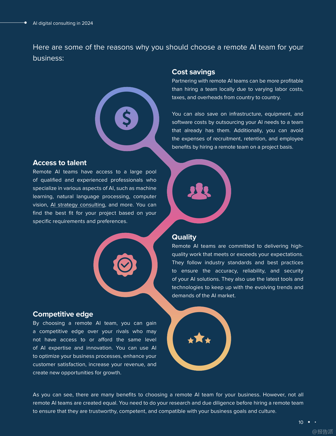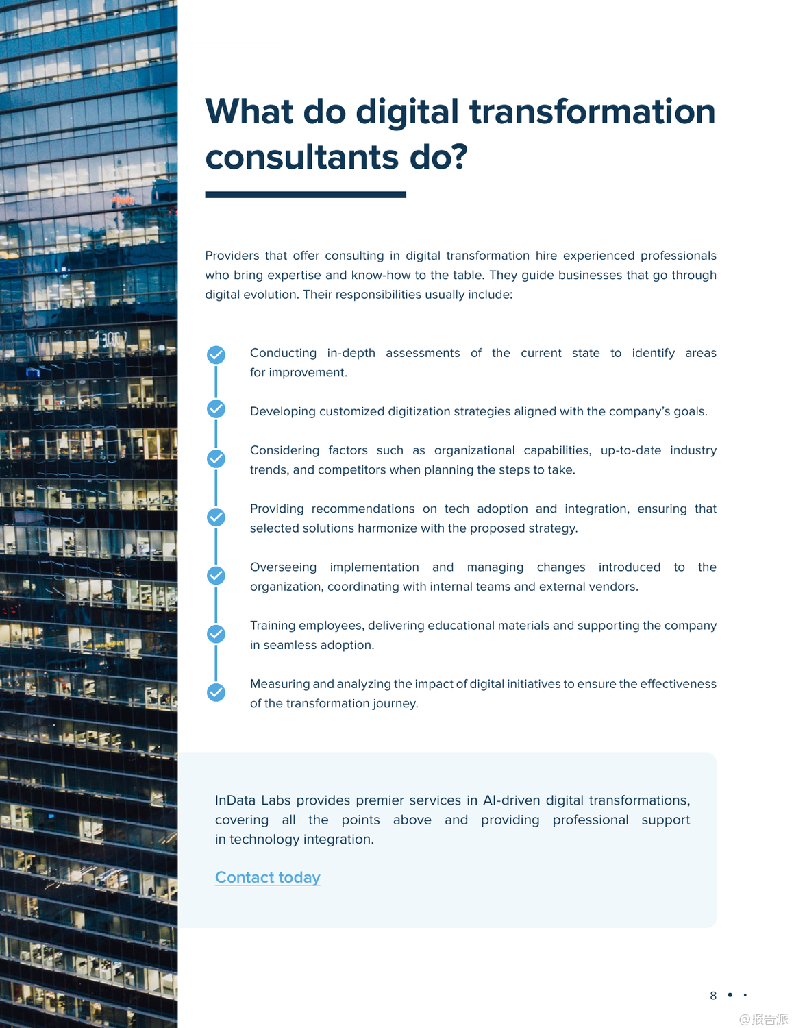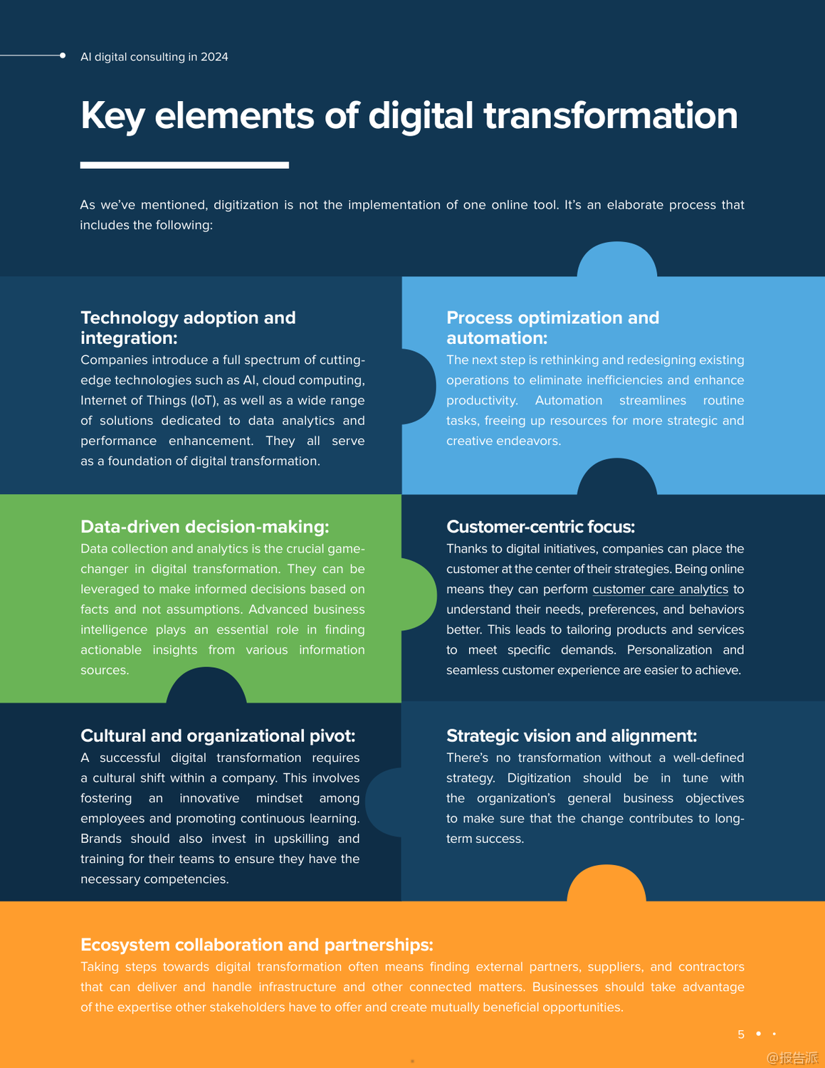 隨著全球企業(yè)加速邁向數(shù)字化時(shí)代,人工智能(AI)已成為推動(dòng)數(shù)字化轉(zhuǎn)型的核心驅(qū)動(dòng)力。 根據(jù)IDC預(yù)測(cè),到2026年,全球企業(yè)在數(shù)字化轉(zhuǎn)型上的投資將高達(dá)3.4萬(wàn)億美元,而目前已有77%的企業(yè)啟動(dòng)了相關(guān)進(jìn)程。 然而,許多企業(yè)的轉(zhuǎn)型仍缺乏系統(tǒng)性戰(zhàn)略,導(dǎo)致執(zhí)行效果不佳。 在此背景下,AI驅(qū)動(dòng)的數(shù)字化轉(zhuǎn)型咨詢服務(wù)正成為企業(yè)實(shí)現(xiàn)可持續(xù)增長(zhǎng)的關(guān)鍵助力。 本報(bào)告指出,真正的數(shù)字化轉(zhuǎn)型不僅僅是引入新技術(shù),而是涵蓋技術(shù)整合、流程優(yōu)化、數(shù)據(jù)決策、客戶中心化、組織文化變革及生態(tài)合作六大核心要素。 其中,AI作為關(guān)鍵引擎,正在重塑企業(yè)運(yùn)營(yíng)方式。 從自動(dòng)化客服、智能營(yíng)銷到個(gè)性化產(chǎn)品設(shè)計(jì),AI不僅大幅降低人力成本,還釋放員工創(chuàng)造力,提升整體效率與客戶體驗(yàn)。 特別是生成式AI如ChatGPT的應(yīng)用,已在內(nèi)容創(chuàng)作、客戶服務(wù)和內(nèi)部協(xié)作中展現(xiàn)出巨大價(jià)值。 值得注意的是,德勤調(diào)研顯示,66%的企業(yè)認(rèn)為AI對(duì)其未來(lái)五年保持競(jìng)爭(zhēng)力至關(guān)重要,但僅有40%擁有全企業(yè)級(jí)的AI戰(zhàn)略。 這表明,盡管認(rèn)知到位,落地能力仍有差距。 因此,專業(yè)咨詢機(jī)構(gòu)的作用愈發(fā)凸顯。 數(shù)字轉(zhuǎn)型顧問(wèn)通過(guò)評(píng)估企業(yè)現(xiàn)狀、制定定制化策略、推薦技術(shù)方案、指導(dǎo)實(shí)施并培訓(xùn)團(tuán)隊(duì),幫助企業(yè)打通從戰(zhàn)略到執(zhí)行的全鏈路。 報(bào)告特別強(qiáng)調(diào),選擇合適的AI合作伙伴是成功的關(guān)鍵。 遠(yuǎn)程AI團(tuán)隊(duì)因其成本優(yōu)勢(shì)、人才廣度和技術(shù)敏捷性,正成為越來(lái)越多企業(yè)的首選。 通過(guò)外包項(xiàng)目制合作,企業(yè)可靈活獲取頂尖AI能力,避免高昂的自建團(tuán)隊(duì)成本。 同時(shí),成功的AI項(xiàng)目需具備五大要素:明確目標(biāo)、合理組隊(duì)、高效溝通、工具支持以及科學(xué)、應(yīng)用與利益相關(guān)者的一致性。 展望2024年及以后,數(shù)字化轉(zhuǎn)型咨詢將更加聚焦客戶中心化、敏捷響應(yīng)、倫理可持續(xù)發(fā)展與持續(xù)創(chuàng)新。 企業(yè)需建立快速迭代機(jī)制,利用AI進(jìn)行市場(chǎng)趨勢(shì)預(yù)測(cè)與用戶行為分析,打造以客戶旅程為核心的動(dòng)態(tài)服務(wù)體系。 此外,網(wǎng)絡(luò)安全與數(shù)據(jù)隱私合規(guī)也將成為不可忽視的重點(diǎn)。 InData Labs作為自2014年起深耕AI與數(shù)據(jù)分析領(lǐng)域的科技伙伴,已為來(lái)自美國(guó)、英國(guó)、歐盟等超150家企業(yè)提供端到端的數(shù)字化轉(zhuǎn)型服務(wù),涵蓋咨詢、設(shè)計(jì)、實(shí)施與運(yùn)維全流程。 其在生成式AI、云計(jì)算和智能分析方面的專業(yè)能力,使其連續(xù)入選頂級(jí)數(shù)據(jù)科學(xué)與AI服務(wù)商榜單。 總體而言,數(shù)字化轉(zhuǎn)型已不再是“是否要做”的選擇題,而是“如何做對(duì)”的必答題。 借助專業(yè)的AI咨詢力量,企業(yè)不僅能規(guī)避試錯(cuò)風(fēng)險(xiǎn),更能精準(zhǔn)把握技術(shù)紅利,在激烈競(jìng)爭(zhēng)中構(gòu)建長(zhǎng)期壁壘。 未來(lái)屬于那些敢于擁抱AI、重構(gòu)業(yè)務(wù)邏輯并堅(jiān)持以客戶為中心的先行者。 出品方:InData Labs 發(fā)布時(shí)間:2025年 文檔頁(yè)數(shù):17頁(yè) |