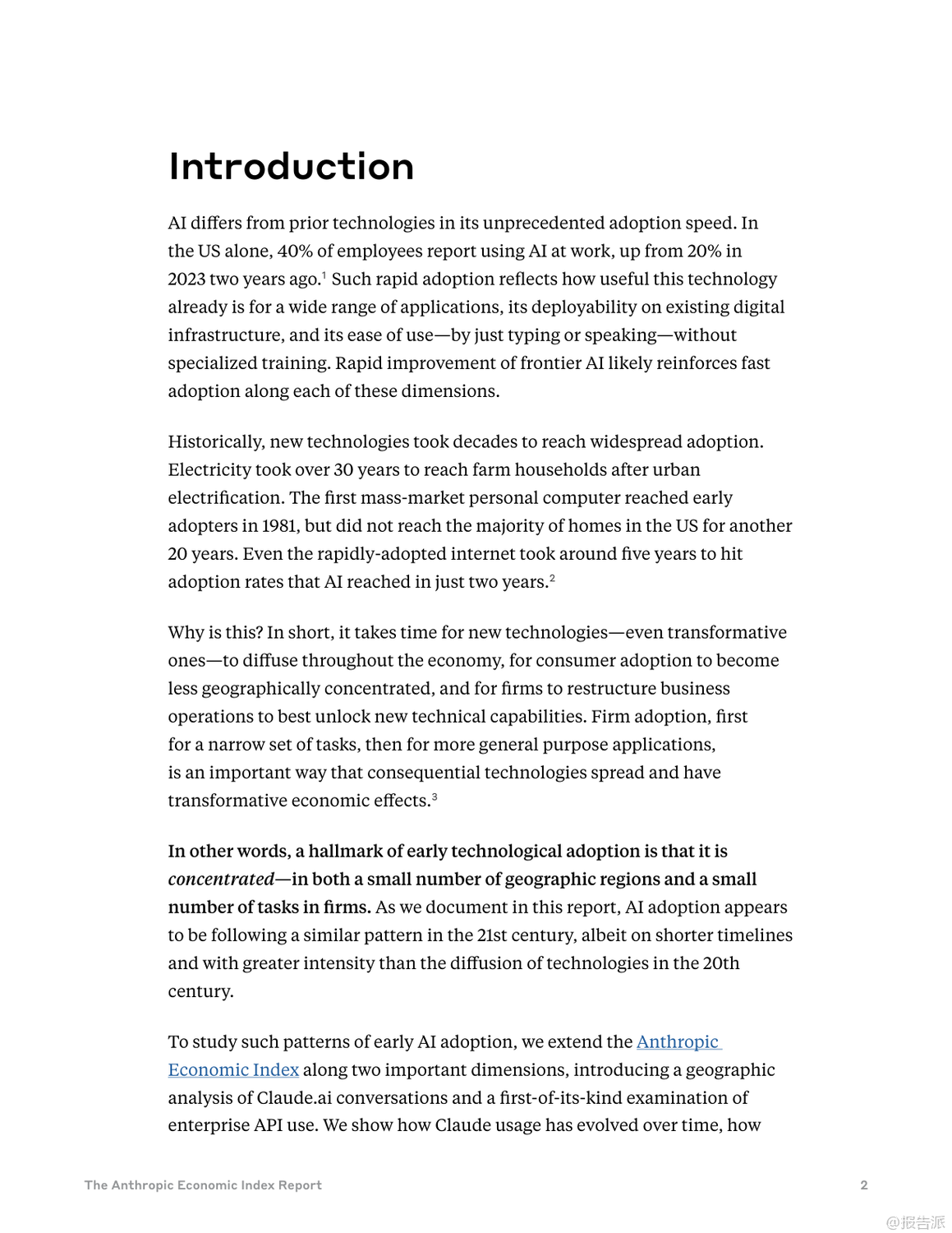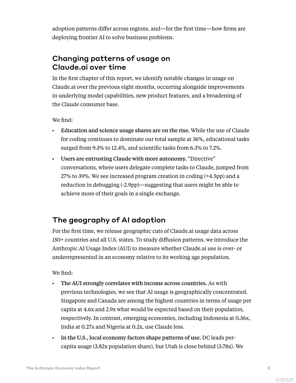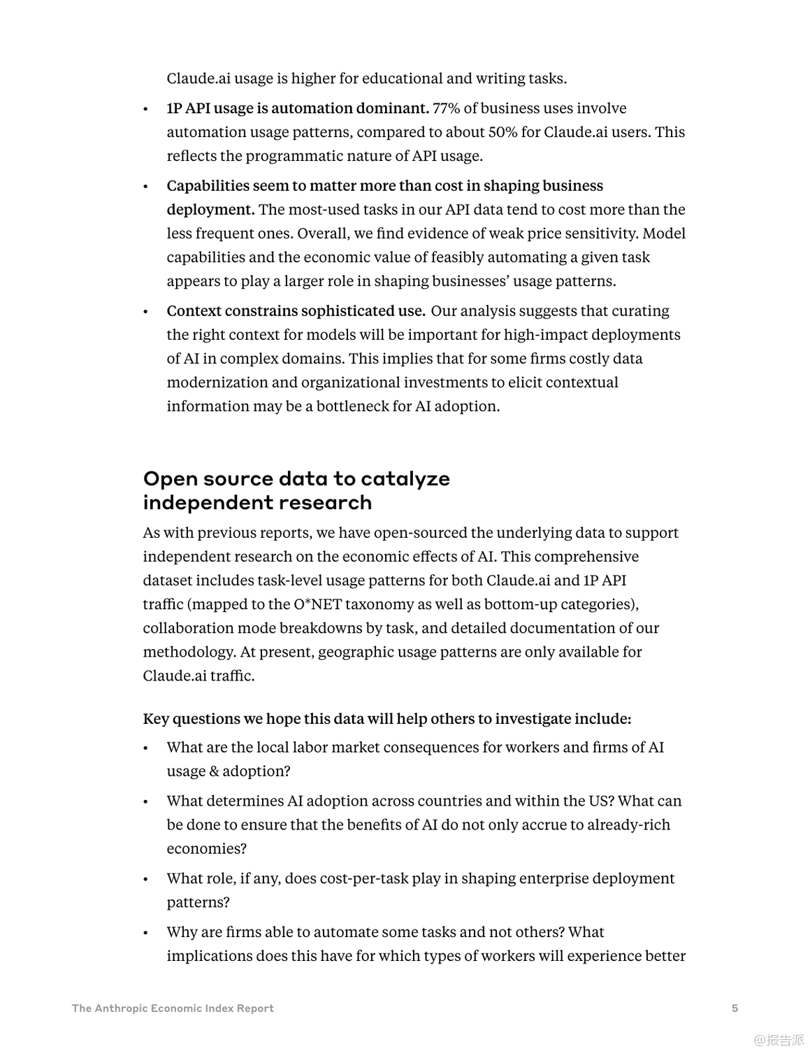 Anthropic最新發(fā)布的《類經(jīng)濟(jì)指數(shù)報(bào)告:不平衡的地理和企業(yè)人工智能采用》揭示了全球AI技術(shù)采納的深刻不平等現(xiàn)象。 報(bào)告指出,AI的普及速度遠(yuǎn)超以往任何技術(shù)——在美國(guó),已有40%的員工在工作中使用AI,而這一比例在兩年前僅為20%。 相比之下,電力、個(gè)人電腦和互聯(lián)網(wǎng)等歷史技術(shù)均需更長(zhǎng)時(shí)間才能達(dá)到類似滲透率。 然而,這種快速擴(kuò)散的背后是顯著的地域與應(yīng)用失衡。 研究引入“Anthropic AI使用指數(shù)(AUI)”,衡量各國(guó)人均AI使用情況。 數(shù)據(jù)顯示,高收入國(guó)家如新加坡(AUI達(dá)4.6)、加拿大(2.9)和以色列(7.0)遙遙領(lǐng)先,而印度(0.27)、印尼(0.36)和尼日利亞(0.2)等新興經(jīng)濟(jì)體則明顯落后。 AI使用與人均GDP呈強(qiáng)正相關(guān),暗示著AI可能加劇全球經(jīng)濟(jì)分化而非促進(jìn)收斂。 在美國(guó)內(nèi)部,AI使用也呈現(xiàn)區(qū)域集中。 華盛頓特區(qū)(AUI 3.82)和猶他州(3.78)的人均使用率超過加州(2.13),反映出地方經(jīng)濟(jì)結(jié)構(gòu)對(duì)AI采納的影響。 例如,DC集中于文檔編輯與職業(yè)發(fā)展支持,加州側(cè)重IT開發(fā),佛羅里達(dá)則聚焦金融服務(wù)。 使用模式上,高采納地區(qū)表現(xiàn)出更強(qiáng)的任務(wù)多樣性與協(xié)作性。 低AUI國(guó)家更多將AI用于編碼任務(wù)(如印度超50%),并傾向于“自動(dòng)化”——即完全委托任務(wù)給AI。 而高AUI國(guó)家則更多應(yīng)用于教育、科學(xué)和商業(yè)領(lǐng)域,并偏好“增強(qiáng)型”互動(dòng),強(qiáng)調(diào)人機(jī)協(xié)同迭代學(xué)習(xí),這可能意味著更深層次的技術(shù)融合能力。 企業(yè)層面,通過API接入的AI部署展現(xiàn)出更高程度的自動(dòng)化特征。 數(shù)據(jù)顯示,77%的企業(yè)應(yīng)用場(chǎng)景屬于自動(dòng)化模式,遠(yuǎn)高于消費(fèi)者端的約50%。 編碼與辦公行政任務(wù)占據(jù)主導(dǎo),教育與創(chuàng)意類任務(wù)占比下降。 值得注意的是,企業(yè)對(duì)成本敏感度較低——高成本任務(wù)反而使用更頻繁,說明決策核心在于技術(shù)適配性與經(jīng)濟(jì)價(jià)值,而非單價(jià)。 此外,復(fù)雜任務(wù)的成功部署高度依賴上下文信息的完整性。 分析發(fā)現(xiàn),輸出長(zhǎng)度較長(zhǎng)的任務(wù)通常需要更多輸入信息,但信息投入的邊際回報(bào)遞減(彈性為0.38)。 這意味著缺乏數(shù)據(jù)整合能力的企業(yè)將在高級(jí)AI應(yīng)用上面臨瓶頸,組織架構(gòu)與數(shù)據(jù)基礎(chǔ)設(shè)施成為關(guān)鍵制約因素。 總體而言,當(dāng)前AI采納仍處于早期階段,集中在少數(shù)高收入地區(qū)與特定任務(wù)領(lǐng)域。 若生產(chǎn)力提升持續(xù)向已發(fā)達(dá)區(qū)域傾斜,全球不平等風(fēng)險(xiǎn)或?qū)⑸仙?br> 未來政策需關(guān)注數(shù)字鴻溝、勞動(dòng)力轉(zhuǎn)型與中小企業(yè)賦能,確保AI紅利更具包容性。 Anthropic已開源全部數(shù)據(jù),鼓勵(lì)獨(dú)立研究推動(dòng)更深入的社會(huì)經(jīng)濟(jì)洞察。 出品方:Anthropic 發(fā)布時(shí)間:2025年 文檔頁數(shù):49頁 |